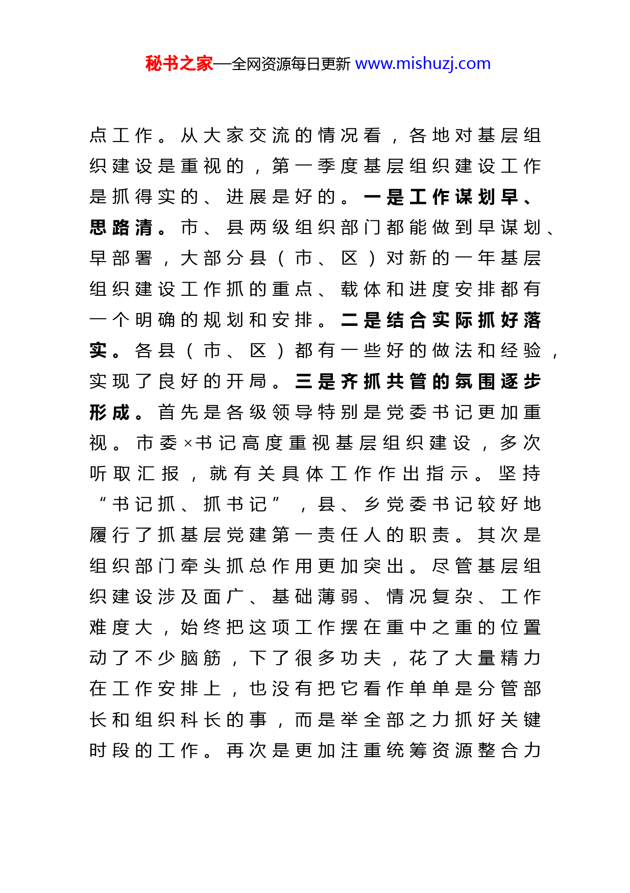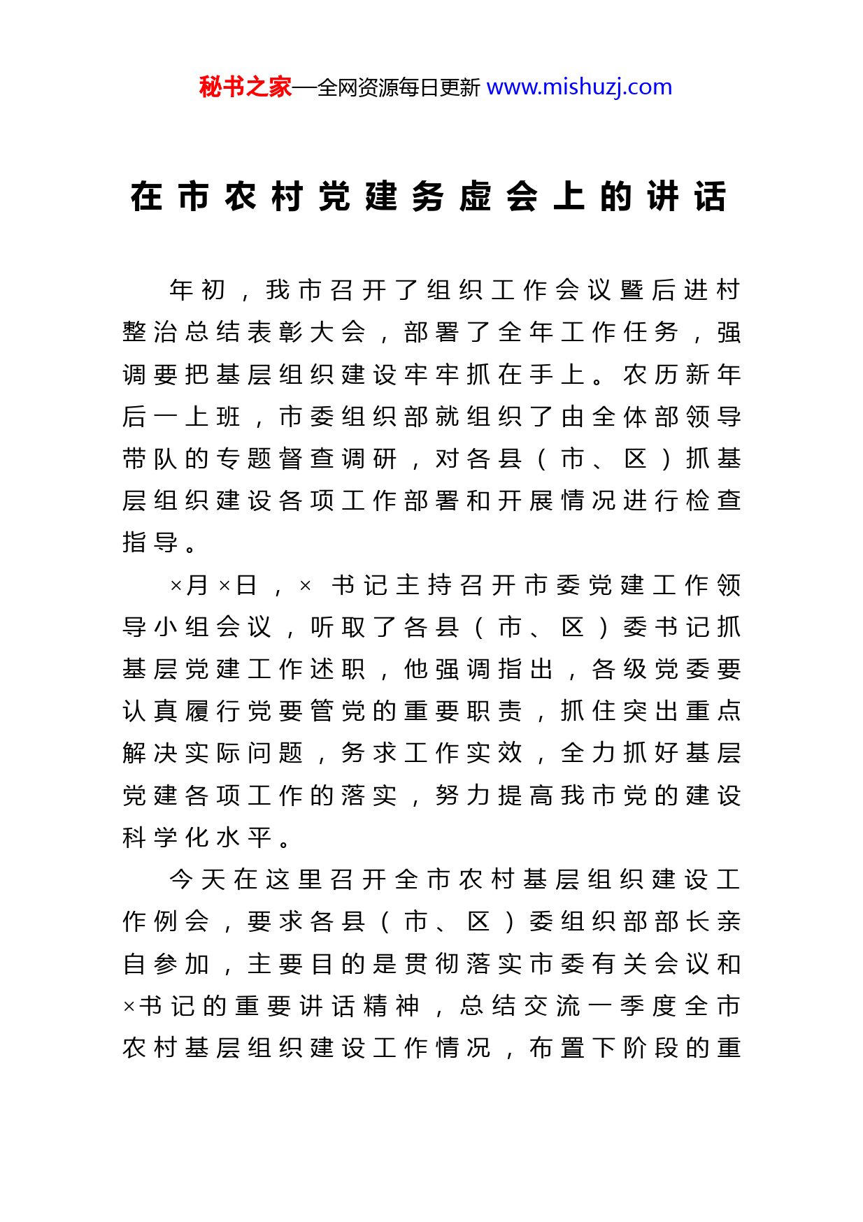 秘书之家—全网资源每日更新www.mishuzj.com在市农村党建务虚会上的讲话年初,我市召开了组织工作会议暨后进村整治总结表彰大会,部署了全年工作任务,强调要把基层组织建设牢牢抓在手上。农历新年后一上班,市委组织部就组织了由全体部领导带队的专题督查调研,对各县(市、区)抓基层组织建设各项工作部署和开展情况进行检查指导。×月×日,×书记主持召开市委党建工作领导小组会议,听取了各县(市、区)委书记抓基层党建工作述职,他强调指出,各级党委要认真履行党要管党的重要职责,抓住突出重点解决实际问题,务求工作实效,全力抓好基层党建各项工作的落实,努力提高我市党的建设科学化水平。今天在这里召开全市农村基层组织建设工作例会,要求各县(市、区)委组织部部长亲自参加,主要目的是贯彻落实市委有关会议和×书记的重要讲话精神,总结交流一季度全市农村基层组织建设工作情况,布置下阶段的重秘书之家—全网资源每日更新www.mishuzj.com点工作。从大家交流的情况看,各地对基层组织建设是重视的,第一季度基层组织建设工作是抓得实的、进展是好的。一是工作谋划早、思路清。市、县两级组织部门都能做到早谋划、早部署,大部分县(市、区)对新的一年基层组织建设工作抓的重点、载体和进度安排都有一个明确的规划和安排。二是结合实际抓好落实。各县(市、区)都有一些好的做法和经验,实现了良好的开局。三是齐抓共管的氛围逐步形成。首先是各级领导特别是党委书记更加重视。市委×书记高度重视基层组织建设,多次听取汇报,就有关具体工作作出指示。坚持“书记抓、抓书记”,县、乡党委书记较好地履行了抓基层党建第一责任人的职责。其次是组织部门牵头抓总作用更加突出。尽管基层组织建设涉及面广、基础薄弱、情况复杂、工作难度大,始终把这项工作摆在重中之重的位置动了不少脑筋,下了很多功夫,花了大量精力在工作安排上,也没有把它看作单单是分管部长和组织科长的事,而是举全部之力抓好关键时段的工作。再次是更加注重统筹资源整合力秘书之家—全网资源每日更新www.mishuzj.com量。通过联乡带村结对、挂钩帮扶、责任包干等形式,市县两级四套班子领导都参与到抓基层组织建设的具体工作中来,党建领导小组成员合力抓基层组织建设的意识有所增强,齐抓共管的氛围更加浓厚。借这个机会,我着重就整体推进工作落实提高基层组织建设科学化水平讲五点意见,供大家参考。一、进一步做到心中有数抓基层组织建设,不能仅停留在谈思想认识上,也不是简单谈责任的问题,而是一定要牢牢把它抓在手上。首先要对基层组织建设基本情况做到心中有数。要结合市情、县情,研究基层组织建设全局性的对策措施。××基层组织建设有自己实际的情况,每个县(市、区)基层组织建设存在的问题也不一样,比如发展党员问题,有的地方和单位入党标准失之于宽有的又存在入党难、发展党员很慢。所以大家对基层组织建设,尤其是村级组织建设的重点难点问题要认真思考和研究。其次要对下步工作抓什么、怎么抓做到心中有数。比如,我们秘书之家—全网资源每日更新www.mishuzj.com强调乡镇党委抓基层组织建设的重要责任,但全市各个乡镇情况也不尽相同,这就要求我们做到主动思考、分类指导,特别是对在区域经济社会发展中具有示范带动效应的强镇,基层组织建设要摆到更加突出的位置上。年初,我们对加强乡镇党委班子建设,推进乡镇干部重心下移等工作都作了部署,第一季度抓得怎么样,有没有具体措施,到底落实情况怎么样,要进行分析评估,做到心中有数,不能只是开个会、发个文件就应付过去。对于村级组织建设,我们的思路是抓两头带中间,对示范村创建的具体载体是什么、如何巩固后进村整治成果等这些问题一定要重视去研究。同时,对全年各项工作的月度安排、载体设置等,我们都要认真进行思考。二、进一步做到责任明确基层组织建设抓得好不好,主要责任在乡镇党委,尤其是乡镇党委书记,关键在于乡镇党委工作力度大不大、水平高不高。近年来,一些地方乡镇班子和主要领导对这项工作还存在怕去抓、不想抓的问题,特别是对基础薄弱秘书之家—全网资源每日更新www.mishuzj.com矛盾突出、问题较多的村,怕捅了“马蜂窝”出乱子,担心得不到支持影响成绩。所以,一定要提高乡镇党委抓基层组织建设的责任意识主体意识。只要乡镇党委书记真正把心思放进去、把精力投进去,村级组织建设肯定能上台阶,一些重点难点问题就会有办法得到解决。比如一些地方村党支部书记队伍人才缺乏的问题,其实解决办法很多,乡镇有那么多在职和退二线、退休的干部,还有那么多的结对部门都可以利用起来、发挥作用。如果责任真正落实了,乡镇党委就会主动去想办法,不用靠组织部门一个个村去研究。对此,各县(市、区)委组织部要加强督查指导,而且这种督导一定要有力度,提高组织化水平,突出针对性实效性。在工作作风上,要查乡镇党委领导班子是不是还存在消极应付、流于形式的情况;在工作方法上,要查有没有抓住工作重点及落实成效情况。要通过几年这样持续有效的督导提升乡镇党委抓基层组织建设的水平。同时,明确乡镇党委抓基层党建的主体责任,做到奖惩分明。市委×书记强调,明年村级组织换届,