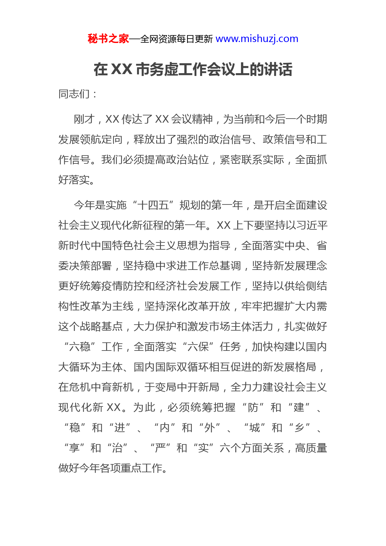 秘书之家—全网资源每日更新www.mishuzj.com在XX市务虚工作会议上的讲话同志们:刚才,XX传达了XX会议精神,为当前和今后一个时期发展领航定向,释放出了强烈的政治信号、政策信号和工作信号。我们必须提高政治站位,紧密联系实际,全面抓好落实。今年是实施“十四五”规划的第一年,是开启全面建设社会主义现代化新征程的第一年。XX上下要坚持以习近平新时代中国特色社会主义思想为指导,全面落实中央、省委决策部署,坚持稳中求进工作总基调,坚持新发展理念更好统筹疫情防控和经济社会发展工作,坚持以供给侧结构性改革为主线,坚持深化改革开放,牢牢把握扩大内需这个战略基点,大力保护和激发市场主体活力,扎实做好“六稳”工作,全面落实“六保”任务,加快构建以国内大循环为主体、国内国际双循环相互促进的新发展格局,在危机中育新机,于变局中开新局,全力力建设社会主义现代化新XX。为此,必须统筹把握“防”和“建”、“稳”和“进”、“内”和“外”、“城”和“乡”、“享”和“治”、“严”和“实”六个方面关系,高质量做好今年各项重点工作。秘书之家—全网资源每日更新www.mishuzj.com一、聚焦“防”和“建”,全力保障人民生命财产安全。面对当前复杂多变的疫情形势,针对近期防控工作暴露出的短板,既从操作层面解决当下的紧迫问题,也从制度层面谋划安排,健全体制机制。一方面,抓实常态化疫情防控。继续坚持“外防输入、内防反弹”总体防控策略,深化落实入境人员和国内中高风险地区人员跟踪监测,抓好冷链食品监管和风险防控,不断完善社区防控措施,进一步扩大核酸检测范围,守牢疫情防控第一道防线。秋冬季是呼吸道传染病的高发季节,要做好谋划部署,完善防控预案,强化医疗卫生物资储备,坚决防止疫情反弹。另一方面,构建强大公共卫生体系。坚持预防为主的卫生健康工作方针,改革完善疾病预防控制体系,建立稳定的公共卫生事业投入机制,健全疾控机构和城乡社区联动工作机制,创新医防协同机制,加快打造一支现代化疾控人才队伍。按照平战结合、长短结合、专兼结合要求,建立健全重大疫情救治机制,加快推进市人民医院新院区建设,完善综合医院传染病防治设施,切实增强应急医疗救治储备能力。丰富爱国卫生运动内涵,大力普及健康知识,推动从环境卫生治理向全面社会健康管理转变。当前,防汛正处在“七下八上”关键期,全市上下必须绷紧防汛救灾这根弦,树牢打持久仗思想,克服麻痹松懈心态,密切关注天气变化,精准研判汛情走势,夯实防汛备汛责任,消除秘书之家—全网资源每日更新www.mishuzj.com防汛安全隐患,继续做好预案准备、物资准备、队伍准备确保万无一失、河湖安澜。二、聚焦“稳”和“进”,持续巩固经济回升向好势头。习近平总书记强调,要在“稳”和“保”的基础上积极进取。去年我市经济之所以能够全面回暖,很重要的因素就是超前应对、未雨绸缪,落实好了“六稳”“六保”要求今年,我们必须持续巩固扩大成果,紧紧扭住“保”和“稳”的关键点、突破点,重点发力,精准用力,进一步保持“进”的良好态势。保护市场主体添活力。全面落实国家及省、市减税降费政策,深化减税、减费、减息、减租、减支“五减”行动,积极争取国家和省专项贷款,鼓励银行等金融机构合理让利,降低企业综合融资成本,引导各类要素流向制造业以及中小微企业。围绕“四上”企业,扎实推进以“三包三抓”为重点的“四送一服”专项行动,帮助企业打通人流、物流、资金流等“堵点”“断点”,保障企业正常生产经营。大力实施产业升级“个十百千”工程,推动重点企业做强核心主业、做大规模效益强化科技创新增动力。围绕产业链部署创新链、围绕创新链布局产业链,抢抓长三角区域协同创新机遇,统筹推进绿金科创大走廊和东部科教新城建设,积极推动和支持市高新区争创国家级高新区,巩固源创客获评国家级孵化器秘书之家—全网资源每日更新www.mishuzj.com成果,紧盯“四基一高一大”战新产业以及新一代信息技术、人工智能、新能源、新材料、生命健康等重点领域,培育创新型产业集群和高新技术产业基地,不断提升产业基础高级化、产业链现代化水平,增强产业链供应链稳定性和竞争力。构建以企业为主体、市场为导向、政府搭平台的科技创新体系,加速“政产学研用金”深度融合,加快科技成果转化利用,支持XX合作建设XX研究院,全力推动XX重点实验室,以钉钉子精神开展关键核心技术攻关,着力培育一批拥有市场主导权、代表X形象的科技型领军型企业,加快培育新的经济增长点增长极。持续深化改革挖潜力。统筹推进XX项国家级、XX项省级改革试点,以重点带动全局,力争形成更多X经验、X模式。推深做实围绕“六稳”“六保”的重点改革,持续深化供给侧结构性改革、国资国企、民营经济、财税金融、农业农村、生态文明等领域改革,不断释放更多改革红利。三、聚焦“内”和“外”,加快构建“双循环”新发展格局。应对逆全球化和疫情后错综复杂的国际形势,必须坚决按照中央政治局会议的最新部署要求,着力增强战略思维、系统思维,积极扩大内需、稳定外需,逐步贯通“优化环境—招商引智—调度项目—扩大投资—提升服务—培育消费—推动出口”的经济循环链条,推动