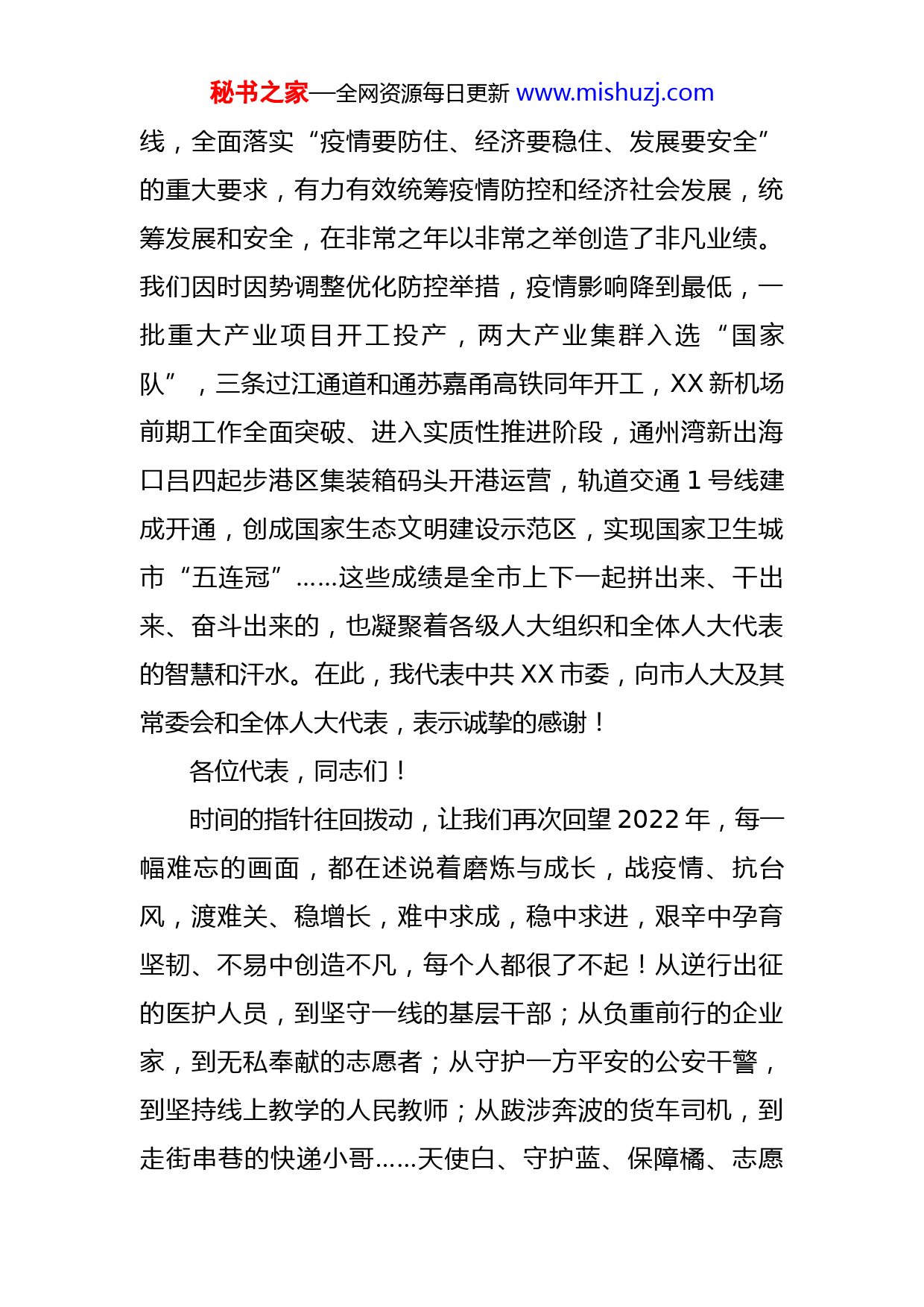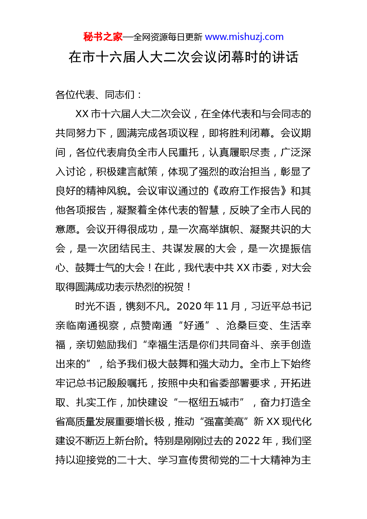 秘书之家—全网资源每日更新www.mishuzj.com在市十六届人大二次会议闭幕时的讲话各位代表、同志们:XX市十六届人大二次会议,在全体代表和与会同志的共同努力下,圆满完成各项议程,即将胜利闭幕。会议期间,各位代表肩负全市人民重托,认真履职尽责,广泛深入讨论,积极建言献策,体现了强烈的政治担当,彰显了良好的精神风貌。会议审议通过的《政府工作报告》和其他各项报告,凝聚着全体代表的智慧,反映了全市人民的意愿。会议开得很成功,是一次高举旗帜、凝聚共识的大会,是一次团结民主、共谋发展的大会,是一次提振信心、鼓舞士气的大会!在此,我代表中共XX市委,对大会取得圆满成功表示热烈的祝贺!时光不语,镌刻不凡。2020年11月,习近平总书记亲临南通视察,点赞南通“好通”、沧桑巨变、生活幸福,亲切勉励我们“幸福生活是你们共同奋斗、亲手创造出来的”,给予我们极大鼓舞和强大动力。全市上下始终牢记总书记殷殷嘱托,按照中央和省委部署要求,开拓进取、扎实工作,加快建设“一枢纽五城市”,奋力打造全省高质量发展重要增长极,推动“强富美高”新XX现代化建设不断迈上新台阶。特别是刚刚过去的2022年,我们坚持以迎接党的二十大、学习宣传贯彻党的二十大精神为主秘书之家—全网资源每日更新www.mishuzj.com线,全面落实“疫情要防住、经济要稳住、发展要安全”的重大要求,有力有效统筹疫情防控和经济社会发展,统筹发展和安全,在非常之年以非常之举创造了非凡业绩。我们因时因势调整优化防控举措,疫情影响降到最低,一批重大产业项目开工投产,两大产业集群入选“国家队”,三条过江通道和通苏嘉甬高铁同年开工,XX新机场前期工作全面突破、进入实质性推进阶段,通州湾新出海口吕四起步港区集装箱码头开港运营,轨道交通1号线建成开通,创成国家生态文明建设示范区,实现国家卫生城市“五连冠”……这些成绩是全市上下一起拼出来、干出来、奋斗出来的,也凝聚着各级人大组织和全体人大代表的智慧和汗水。在此,我代表中共XX市委,向市人大及其常委会和全体人大代表,表示诚挚的感谢!各位代表,同志们!时间的指针往回拨动,让我们再次回望2022年,每一幅难忘的画面,都在述说着磨炼与成长,战疫情、抗台风,渡难关、稳增长,难中求成,稳中求进,艰辛中孕育坚韧、不易中创造不凡,每个人都很了不起!从逆行出征的医护人员,到坚守一线的基层干部;从负重前行的企业家,到无私奉献的志愿者;从守护一方平安的公安干警,到坚持线上教学的人民教师;从跋涉奔波的货车司机,到走街串巷的快递小哥……天使白、守护蓝、保障橘、志愿秘书之家—全网资源每日更新www.mishuzj.com红,绘就了城市最靓丽的底色;党旗扬、干群亲、邻里暖、人心齐,凝成了城市最坚强的力量。770万江海儿女,在勇毅前行中成就了一个奋进的XX,在艰难承压中展现出一个坚韧的XX,在守望相助中托举起一个温暖的XX。我们用行动证明:上下同欲者胜,携手共进者强,同舟共济者赢!让我们向为XX这座城市努力打拼的每一位劳动者致敬!各位代表、同志们!历史画卷,总在团结拼搏中绘就;时代华章,必在接续奋斗中书写。党的二十大报告通篇贯穿着团结奋斗的时代要求,习近平总书记强调“团结奋斗是中国人民创造历史伟业的必由之路”,号召“为全面建设社会主义现代化国家、全面推进中华民族伟大复兴而团结奋斗”。全市上下要坚决响应习近平总书记的伟大号召,在党的旗帜下团结成“一块坚硬的钢铁”,心往一处想、劲往一处使,全面推进中国式现代化XX新实践,在江海大地奏响团结奋斗最强音。团结奋斗就要坚定政治信仰,紧跟核心走。万山磅礴看主峰,沧海茫茫望灯塔。进入新时代,党和国家事业取得历史性成就、发生历史性变革,最根本在于有习近平总书记作为党中央的核心、全党的核心掌舵领航,在于有习近平新时代中国特色社会主义思想科学指引。我们要深刻秘书之家—全网资源每日更新www.mishuzj.com领悟“两个确立”的决定性意义,深刻理解其历史逻辑、理论逻辑、实践逻辑,切实增进政治认同、思想认同、理论认同、情感认同,不断提高政治判断力、政治领悟力、政治执行力,矢志不渝忠诚核心、信赖核心、追随核心、维护核心,紧跟习近平总书记走好新的赶考之路。要坚持不懈用习近平新时代中国特色社会主义思想凝心铸魂,深刻领会其核心要义、丰富内涵、实践要求,切实把“学思用”连成一线、“知信行”融为一体,不断提高工作的科学性、预见性、主动性,以理论的清醒把握历史的主动,以思想的力量昂扬奋进的激情。坚持把学习宣传贯彻党的二十大精神作为首要政治任务,在全面学习、全面把握、全面落实上下功夫,切实用二十大精神统一思想、统一意志、统一行动,胸怀“两个大局”、牢记“国之大者”,更加自觉地把XX现代化建设放到党和国家事业全局中审视、放到区域重大战略中谋划、放到全省大局中推进,以实际行动和过硬成果推动党的二十大精神在江海大地落地生根、开花结果。团结奋斗就要保持战略定力,锚定目标干。最牢固的团结,是围绕明确目标形成的团结;最有力的奋斗,是依靠紧密团结进行的奋斗。这些年来,我们正是因为坚持不懈抓项目、强产业,调结构、促转型,持续筑牢经济发展“压舱石”,才能在疫情影响和经济下