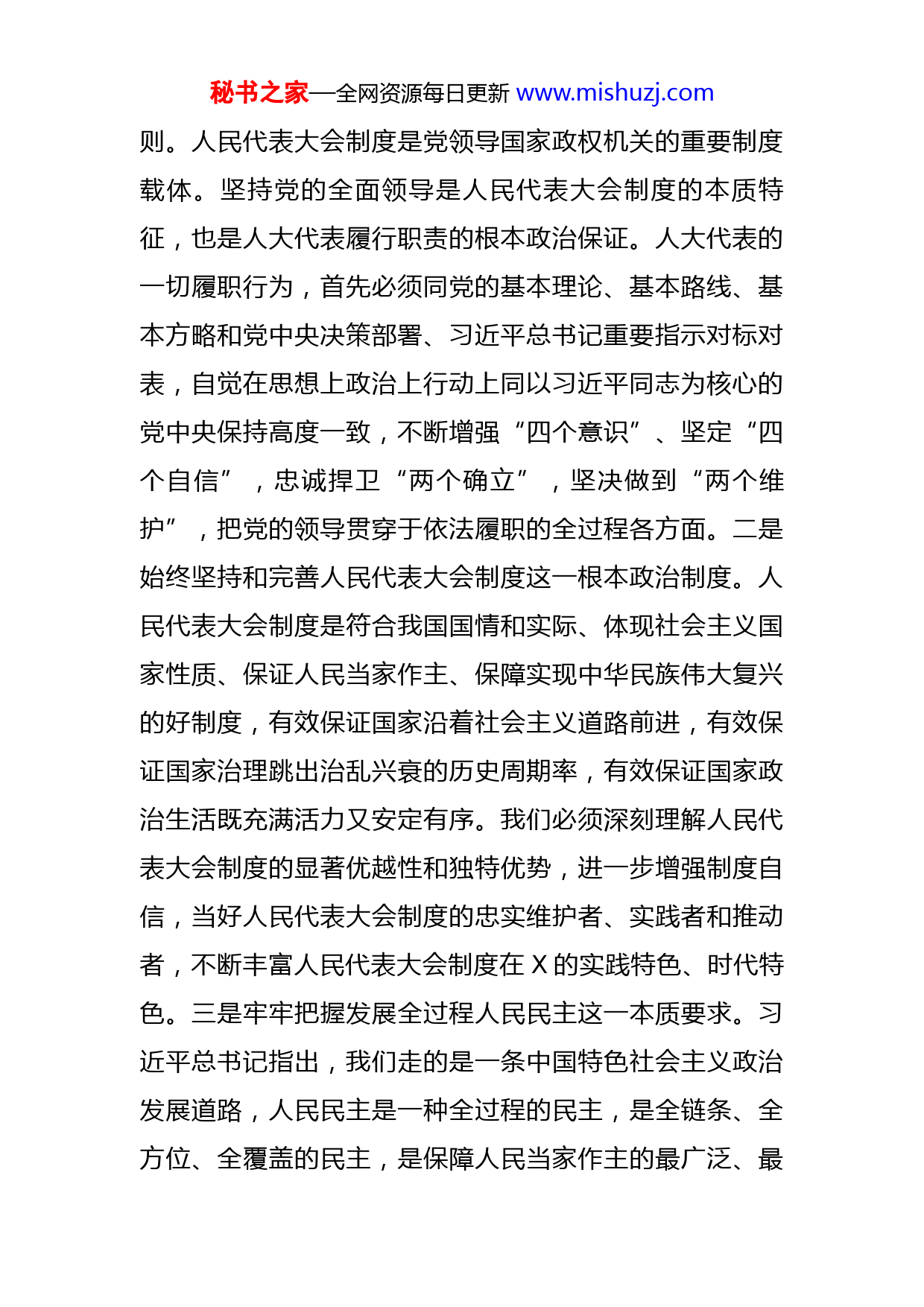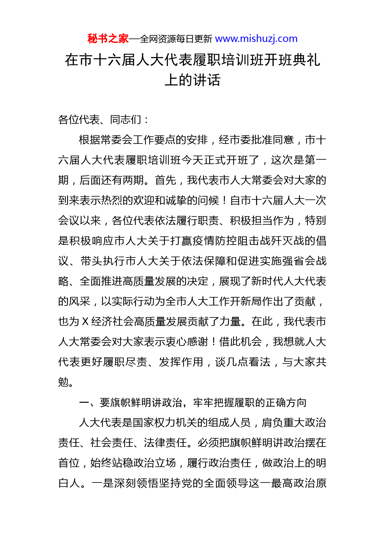 秘书之家—全网资源每日更新www.mishuzj.com在市十六届人大代表履职培训班开班典礼上的讲话各位代表、同志们:根据常委会工作要点的安排,经市委批准同意,市十六届人大代表履职培训班今天正式开班了,这次是第一期,后面还有两期。首先,我代表市人大常委会对大家的到来表示热烈的欢迎和诚挚的问候!自市十六届人大一次会议以来,各位代表依法履行职责、积极担当作为,特别是积极响应市人大关于打赢疫情防控阻击战歼灭战的倡议、带头执行市人大关于依法保障和促进实施强省会战略、全面推进高质量发展的决定,展现了新时代人大代表的风采,以实际行动为全市人大工作开新局作出了贡献,也为X经济社会高质量发展贡献了力量。在此,我代表市人大常委会对大家表示衷心感谢!借此机会,我想就人大代表更好履职尽责、发挥作用,谈几点看法,与大家共勉。一、要旗帜鲜明讲政治,牢牢把握履职的正确方向人大代表是国家权力机关的组成人员,肩负重大政治责任、社会责任、法律责任。必须把旗帜鲜明讲政治摆在首位,始终站稳政治立场,履行政治责任,做政治上的明白人。一是深刻领悟坚持党的全面领导这一最高政治原秘书之家—全网资源每日更新www.mishuzj.com则。人民代表大会制度是党领导国家政权机关的重要制度载体。坚持党的全面领导是人民代表大会制度的本质特征,也是人大代表履行职责的根本政治保证。人大代表的一切履职行为,首先必须同党的基本理论、基本路线、基本方略和党中央决策部署、习近平总书记重要指示对标对表,自觉在思想上政治上行动上同以习近平同志为核心的党中央保持高度一致,不断增强“四个意识”、坚定“四个自信”,忠诚捍卫“两个确立”,坚决做到“两个维护”,把党的领导贯穿于依法履职的全过程各方面。二是始终坚持和完善人民代表大会制度这一根本政治制度。人民代表大会制度是符合我国国情和实际、体现社会主义国家性质、保证人民当家作主、保障实现中华民族伟大复兴的好制度,有效保证国家沿着社会主义道路前进,有效保证国家治理跳出治乱兴衰的历史周期率,有效保证国家政治生活既充满活力又安定有序。我们必须深刻理解人民代表大会制度的显著优越性和独特优势,进一步增强制度自信,当好人民代表大会制度的忠实维护者、实践者和推动者,不断丰富人民代表大会制度在X的实践特色、时代特色。三是牢牢把握发展全过程人民民主这一本质要求。习近平总书记指出,我们走的是一条中国特色社会主义政治发展道路,人民民主是一种全过程的民主,是全链条、全方位、全覆盖的民主,是保障人民当家作主的最广泛、最秘书之家—全网资源每日更新www.mishuzj.com真实、最管用的社会主义民主。人民代表大会制度是实现我国全过程人民民主的重要制度载体,践行全过程人民民主是人大工作、人大代表履职的重要时代课题。要深刻把握习近平总书记关于发展全过程人民民主的重要要求,深入践行全过程人民民主重要理念,忠实代表人民利益和意志,依法参加行使国家权力,切实为人民用权、为人民履职、为人民服务。二、要深学笃行强本领,不断夯实履职的能力基础履行好代表职务、发挥出代表作用,履职能力是前提基础。本届504名代表中,有318名同志是新任代表,占代表总数的63%。因此,最首要的任务就是加强学习,提升履职本领。一要加强学习政治理论。理论是行动的先导,思想是前进的旗帜。要坚持以习近平新时代中国特色社会主义思想为指引,深入学习习近平法治思想、习近平总书记关于坚持和完善人民代表大会制度的重要思想、习近平总书记在中央人大工作会议上的讲话精神以及习近平总书记系列重要讲话重要指示批示精神,学习贯彻党的十九届六中全会、全国“两会”精神,深刻领悟党中央路线方针政策和省委、市委的重大决策部署,做到以理论清醒保证政治坚定、以思想自觉引领行动自觉。二要加强学习法律知识。熟练掌握法律法规、人民代表大会的议事规则和工作程序是人大代表必备的基本功,也是履行好宪法和法律秘书之家—全网资源每日更新www.mishuzj.com赋予各项职责的前提条件。要主动学法,熟练掌握宪法、地方组织法、选举法、代表法、监督法等基本法律和有关法律法规。要模范守法,尊崇法治、敬畏法律,严格依照法律行使自己享有的权利和履行自己应尽的义务。要善于用法,不断提高运用法治思维和法治方式深化改革、推动发展、化解矛盾、维护稳定的能力,自觉运用法律的武器维护人民群众的合法权利和利益。三要加强学习履职业务。要系统学习人大工作制度、程序,准确把握人大工作特点、要求和规律,明晰法定权限、熟知法定程序、善用法定权力,坚决不做门外汉、不说外行话、不干外行事。同时,人大工作涉及经济、政治、文化、社会、生态文明建设等方方面面,单凭代表固有的知识结构和过去的工作经验是不够的,必须广泛学习各方面知识,加快知识更新、优化知识结构、拓宽眼界和视野,全面提升履职能力和水平。三、要创新实干善作为,着力提升履职的实际效果人大代表是人民代表大会的主体。代表作用的发挥,关系到国家权力的有效行使,关系到人大的形象权威,关系到人民当家作主权利的实现与否。每一名人大代表都必须强化履职担当、抓住履