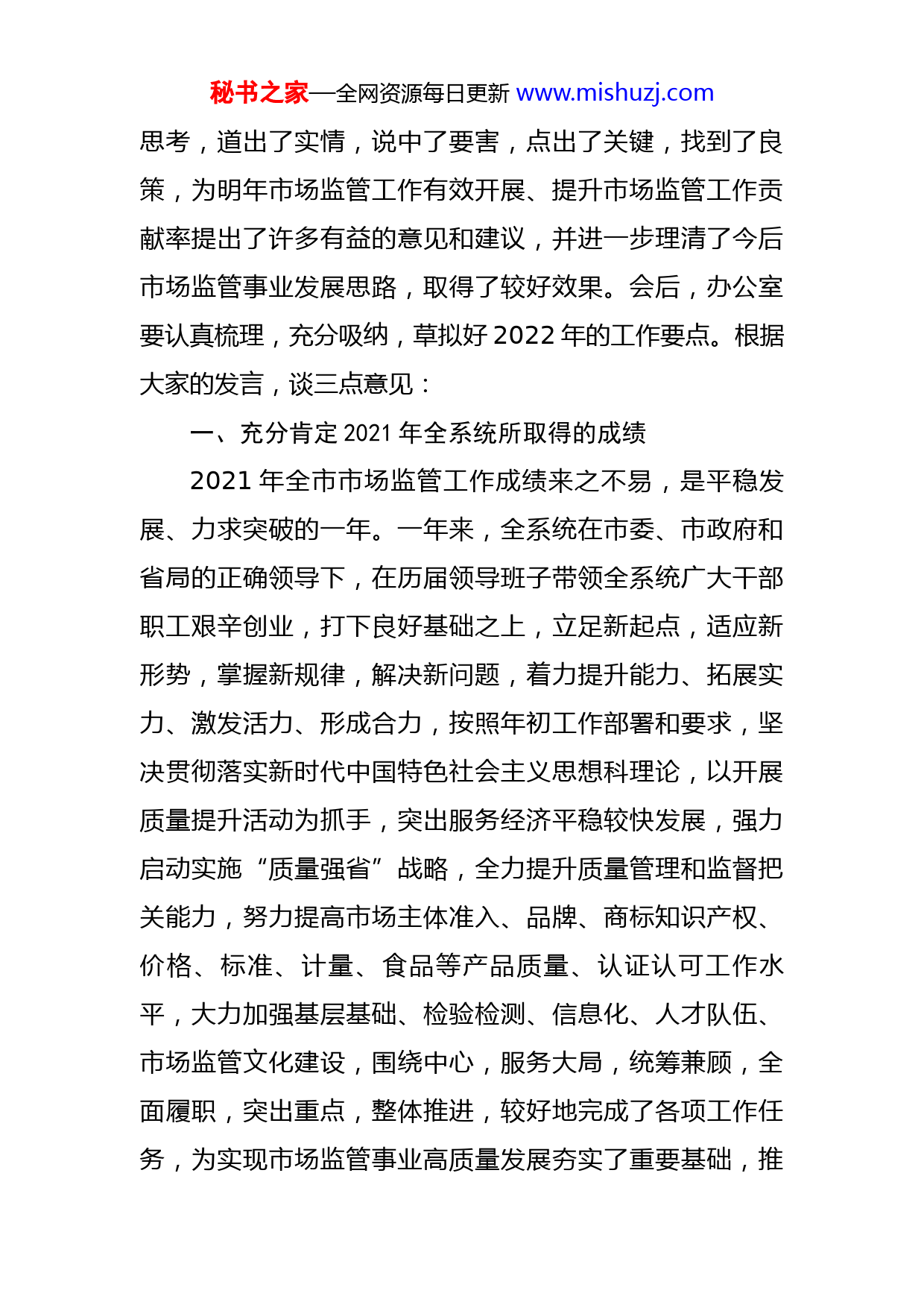 秘书之家—全网资源每日更新www.mishuzj.com在市场监管系统述职述责述廉暨工作务虚会议上的总结讲话今天召开全系统领导干部述职述廉暨工作务虚会,听取各县(市)局长和各直属事业单位主要负责人述职述廉,对2022年工作进行研讨,这是上级的要求,是推动工作的需要,是总结过去,谋划未来,促进发展的务实之举,会议很重要。通过大家的共同努力,会议达到了预期目的。概括起来有“新、实、好”三个特点。一是形式“新”。充分运用多媒体手段,使人耳目一新。两天的会议,与会同志听汇报,看成果,议亮点,评实绩,谈想法,找差距,提建议,讲规划、定方向,既突出了重点,又体现了亮点,形式新颖,效果明显。二是内容“实”。虚实结合,是马克思主义的思想方法和工作方法,也是我们市场监管系统的一贯做法。这次会议既务虚又务实,虚功实做。所谓“务虚”就是研究一些宏观层面的东西、理论层面的东西,有助于理清思路,把握方向;所谓“务实”就是研究具体工作如何落实、怎样推动,既围绕自身工作思考问题,又站在全局高度统筹考虑工作,为省局当参谋、出主意。三是效果“好”。大家认真参与,开动脑筋,思考问题。从发言中,可以看出各位都做了认真的准备,进行了长时间的秘书之家—全网资源每日更新www.mishuzj.com思考,道出了实情,说中了要害,点出了关键,找到了良策,为明年市场监管工作有效开展、提升市场监管工作贡献率提出了许多有益的意见和建议,并进一步理清了今后市场监管事业发展思路,取得了较好效果。会后,办公室要认真梳理,充分吸纳,草拟好2022年的工作要点。根据大家的发言,谈三点意见:一、充分肯定2021年全系统所取得的成绩2021年全市市场监管工作成绩来之不易,是平稳发展、力求突破的一年。一年来,全系统在市委、市政府和省局的正确领导下,在历届领导班子带领全系统广大干部职工艰辛创业,打下良好基础之上,立足新起点,适应新形势,掌握新规律,解决新问题,着力提升能力、拓展实力、激发活力、形成合力,按照年初工作部署和要求,坚决贯彻落实新时代中国特色社会主义思想科理论,以开展质量提升活动为抓手,突出服务经济平稳较快发展,强力启动实施“质量强省”战略,全力提升质量管理和监督把关能力,努力提高市场主体准入、品牌、商标知识产权、价格、标准、计量、食品等产品质量、认证认可工作水平,大力加强基层基础、检验检测、信息化、人才队伍、市场监管文化建设,围绕中心,服务大局,统筹兼顾,全面履职,突出重点,整体推进,较好地完成了各项工作任务,为实现市场监管事业高质量发展夯实了重要基础,推秘书之家—全网资源每日更新www.mishuzj.com动全市经济社会高质量发展做出了积极贡献,取得了五个方面的明显成效:着力探索市场监管工作发展规律,统一思想认识取得明显成效。大局为重、民生为本、质量为贵、安全为先、监管为要、服务为荣的“六为”工作理念,法制立局、科技兴局、素质强局、创新活局、和谐稳局的“五局”工作目标进一步确立,把握“三条线”、力求“三突破”、抓好“三落实”、实现“三提高”的工作重点得到较好贯彻。面对新形势、新任务、新要求,在广泛调研的基础上,积极探索,进一步明确了市场监管部门在促进经济社会高质量发展中应充分发挥质量把关、安全保障、标准引领、技术支撑、促进和谐作用的基本规律。经过全局上下的深入学习、讨论,大家进一步振奋了精神,明确了工作思路、重点和方向,激发了自觉性、主动性,增强了责任感和紧迫感。着力提高全社会质量意识,宏观质量管理取得明显成效。在市委、市政府的坚强领导下,举全系统之力,启动实施了质量强市战略,各县(市)的质量强县战略有序开展,质量振兴、以质取胜工作得到各级党委政府、广大企业和社会各界的关注和支持。加强质量宏观管理,建立宏观质量状况定期分析、报告制度,《省重要工业产品质量及特种设备安全监督管理情况报告》为各级政府宏观决策秘书之家—全网资源每日更新www.mishuzj.com提供了重要依据。积极投身抗旱救灾、保春耕工作,“依靠地方,联合部门,抓住企业,监管产品”的大质量工作机制和大质检文化建设取得了初步成效。强着力围绕中心、服务大局,质量提升活动取得明显成效。大力推进标准化发展战略,旅游、农业、环境等标准化工作取得突破性进展;积极推进名牌战略,质量强业、质量兴企、质量兴品工作正稳步推进;充分发挥生产许可、能源计量、认证认可等工作的基础保障作用,促进产业结构调整和转型升级;大力加强技术机构建设,全面实施《全市市场监管系统提升检验检测能力三年行动计划》,认真开展检测整顿活动,采取目标倒逼机制,确保X个国家质检中心年内获得验收;突出“质量提升服务进万企”、“市场监管邀您看企业”等重点活动,加强宣传培训,加大部门协作,强化企业主体作用,建立重点食品企业质量安全联络员制度,推动我省名牌企业和国有大中型企业发挥质量提升骨干和带头引领作用,“质量提升”活动的开展,进一步提升了市场监管服务发展水平、科学监管水平和基础保障水平。着力实施科学监管,安民生保稳定取得明显成效。全力坚守安全底线,不断强化食品安全监管的实效性,着力推动特种设备安全监察工作上水平,建立健全风险管理机制,围