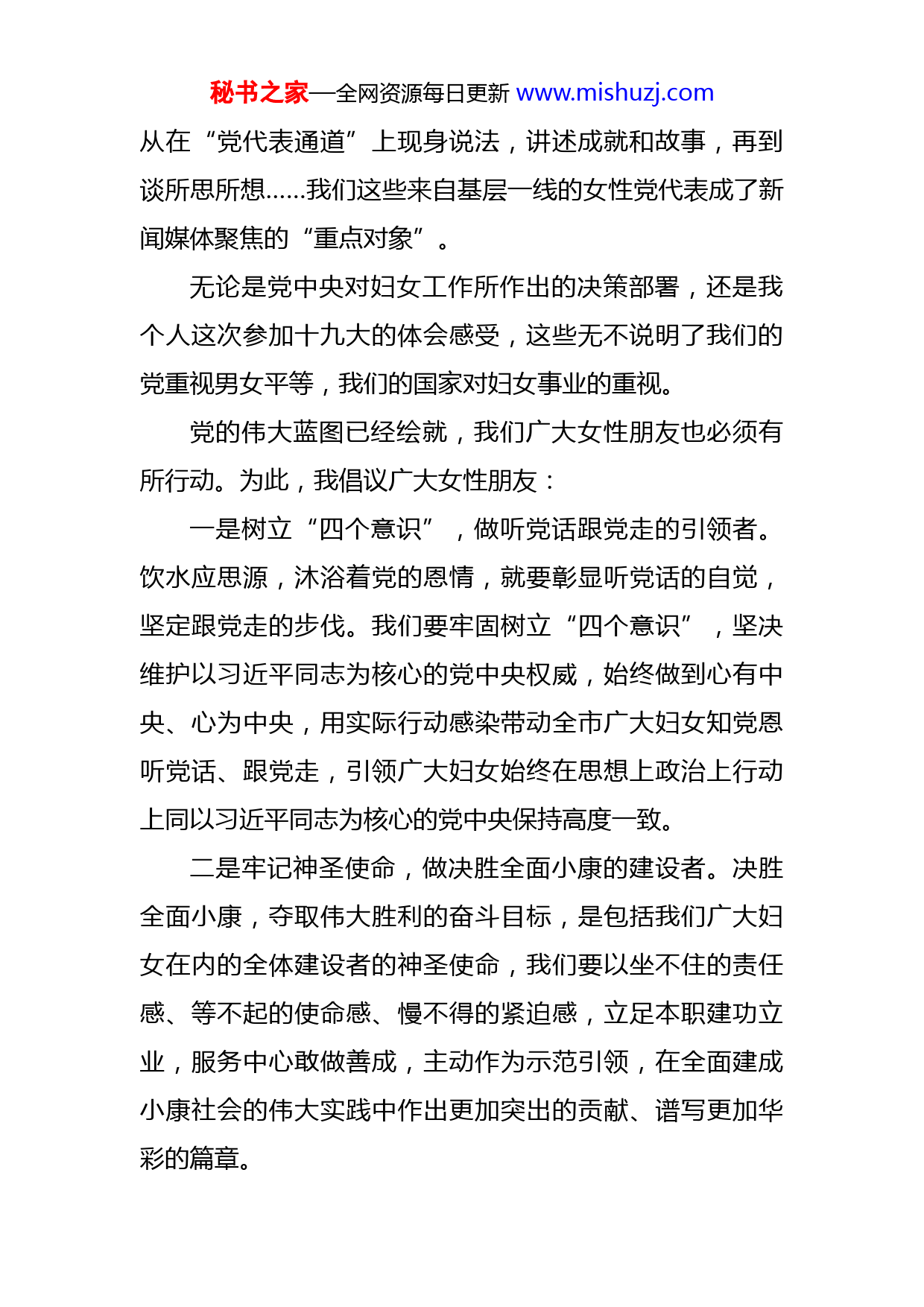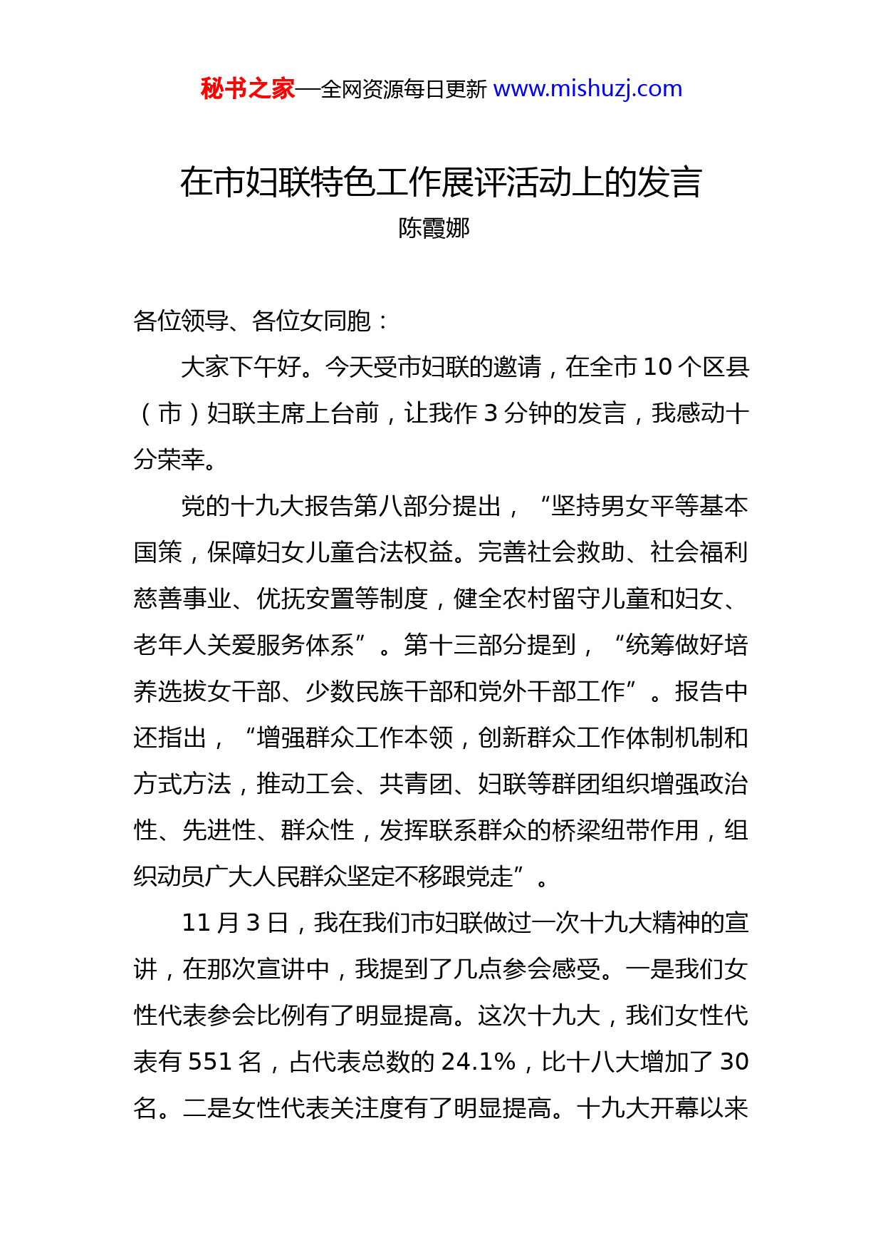 秘书之家—全网资源每日更新www.mishuzj.com在市妇联特色工作展评活动上的发言陈霞娜各位领导、各位女同胞:大家下午好。今天受市妇联的邀请,在全市10个区县(市)妇联主席上台前,让我作3分钟的发言,我感动十分荣幸。党的十九大报告第八部分提出,“坚持男女平等基本国策,保障妇女儿童合法权益。完善社会救助、社会福利慈善事业、优抚安置等制度,健全农村留守儿童和妇女、老年人关爱服务体系”。第十三部分提到,“统筹做好培养选拔女干部、少数民族干部和党外干部工作”。报告中还指出,“增强群众工作本领,创新群众工作体制机制和方式方法,推动工会、共青团、妇联等群团组织增强政治性、先进性、群众性,发挥联系群众的桥梁纽带作用,组织动员广大人民群众坚定不移跟党走”。11月3日,我在我们市妇联做过一次十九大精神的宣讲,在那次宣讲中,我提到了几点参会感受。一是我们女性代表参会比例有了明显提高。这次十九大,我们女性代表有551名,占代表总数的24.1%,比十八大增加了30名。二是女性代表关注度有了明显提高。十九大开幕以来秘书之家—全网资源每日更新www.mishuzj.com从在“党代表通道”上现身说法,讲述成就和故事,再到谈所思所想……我们这些来自基层一线的女性党代表成了新闻媒体聚焦的“重点对象”。无论是党中央对妇女工作所作出的决策部署,还是我个人这次参加十九大的体会感受,这些无不说明了我们的党重视男女平等,我们的国家对妇女事业的重视。党的伟大蓝图已经绘就,我们广大女性朋友也必须有所行动。为此,我倡议广大女性朋友:一是树立“四个意识”,做听党话跟党走的引领者。饮水应思源,沐浴着党的恩情,就要彰显听党话的自觉,坚定跟党走的步伐。我们要牢固树立“四个意识”,坚决维护以习近平同志为核心的党中央权威,始终做到心有中央、心为中央,用实际行动感染带动全市广大妇女知党恩听党话、跟党走,引领广大妇女始终在思想上政治上行动上同以习近平同志为核心的党中央保持高度一致。二是牢记神圣使命,做决胜全面小康的建设者。决胜全面小康,夺取伟大胜利的奋斗目标,是包括我们广大妇女在内的全体建设者的神圣使命,我们要以坐不住的责任感、等不起的使命感、慢不得的紧迫感,立足本职建功立业,服务中心敢做善成,主动作为示范引领,在全面建成小康社会的伟大实践中作出更加突出的贡献、谱写更加华彩的篇章。秘书之家—全网资源每日更新www.mishuzj.com三是发挥独特优势,做核心价值观的践行者。家庭是社会的细胞,家庭幸福则社会和谐。我们要提高自身素养搞好家庭小建设,担起家教好传承,涵养家风正能量,为孩子建好“人生第一所学校”,为家庭营造和美健康好环境,为社会撑起和谐清朗大气候,在潜移默化中培育和践行社会主义核心价值观。新时代、新使命、新思想、新征程、新女性,让我们牢固树立“四个意识”,更加坚定“四个自信”,唱响巾帼之歌,彰显巾帼之美,贡献巾帼之智,积极投身新时代中国特色社会主义伟大实践,奋力谱写中华民族伟大复兴中国梦的巾帼篇章!我的宣讲就到这里,谢谢大家!