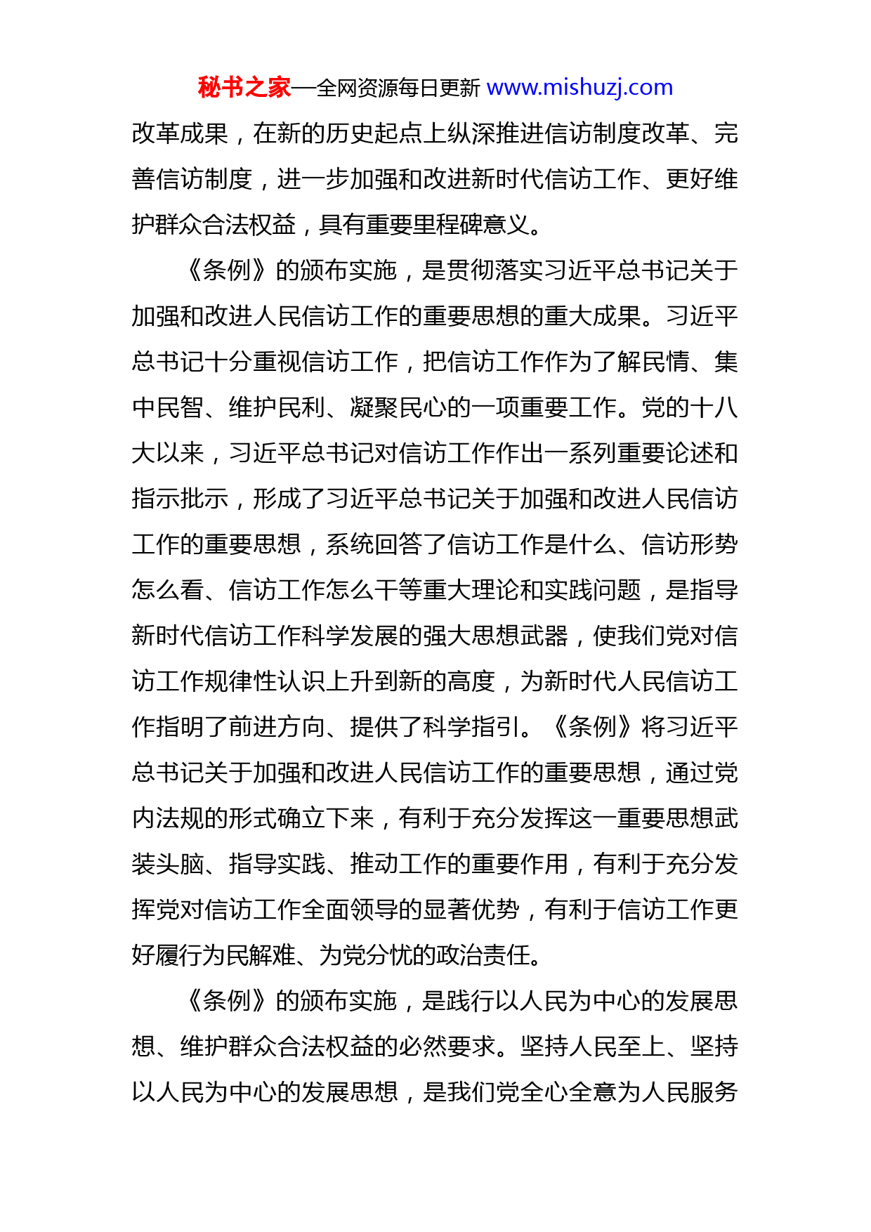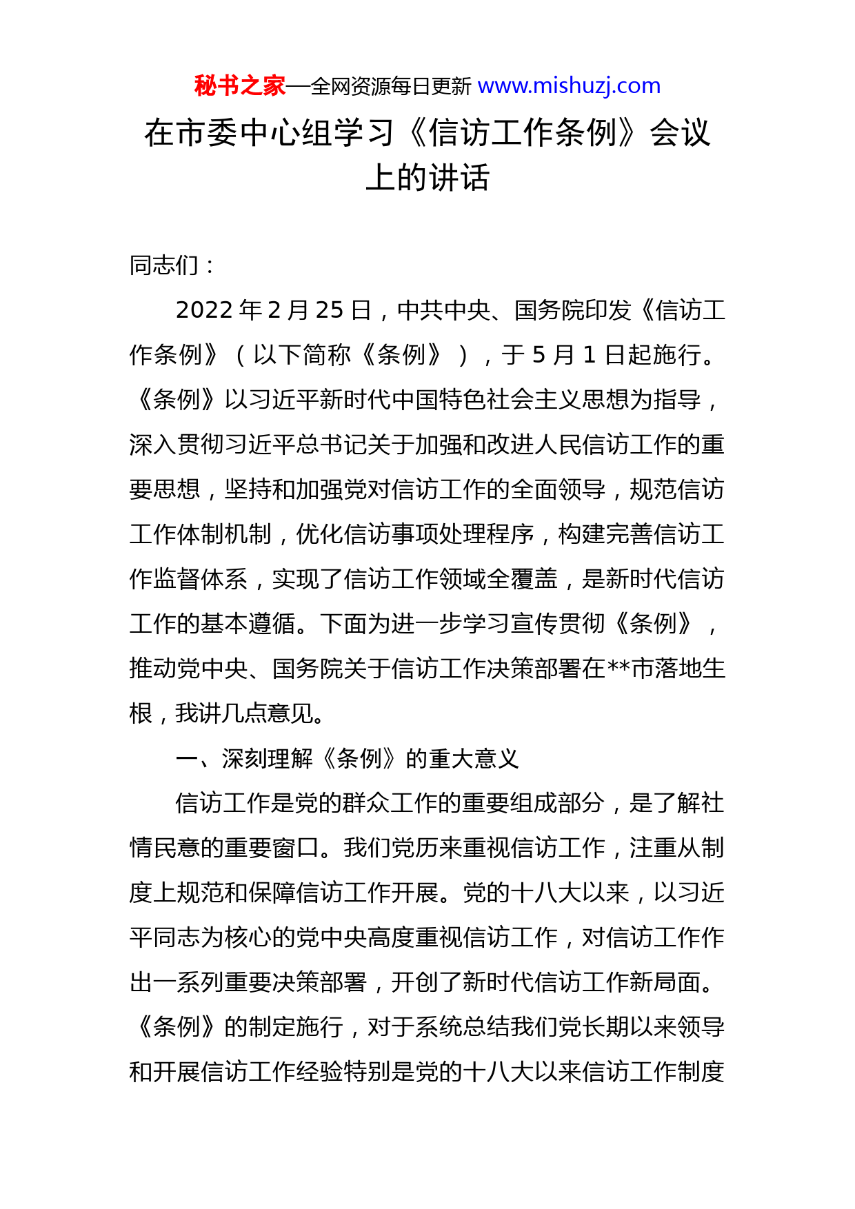 秘书之家—全网资源每日更新www.mishuzj.com在市委中心组学习《信访工作条例》会议上的讲话同志们:2022年2月25日,中共中央、国务院印发《信访工作条例》(以下简称《条例》),于5月1日起施行。《条例》以习近平新时代中国特色社会主义思想为指导,深入贯彻习近平总书记关于加强和改进人民信访工作的重要思想,坚持和加强党对信访工作的全面领导,规范信访工作体制机制,优化信访事项处理程序,构建完善信访工作监督体系,实现了信访工作领域全覆盖,是新时代信访工作的基本遵循。下面为进一步学习宣传贯彻《条例》,推动党中央、国务院关于信访工作决策部署在市落地生根,我讲几点意见。一、深刻理解《条例》的重大意义信访工作是党的群众工作的重要组成部分,是了解社情民意的重要窗口。我们党历来重视信访工作,注重从制度上规范和保障信访工作开展。党的十八大以来,以习近平同志为核心的党中央高度重视信访工作,对信访工作作出一系列重要决策部署,开创了新时代信访工作新局面。《条例》的制定施行,对于系统总结我们党长期以来领导和开展信访工作经验特别是党的十八大以来信访工作制度秘书之家—全网资源每日更新www.mishuzj.com改革成果,在新的历史起点上纵深推进信访制度改革、完善信访制度,进一步加强和改进新时代信访工作、更好维护群众合法权益,具有重要里程碑意义。《条例》的颁布实施,是贯彻落实习近平总书记关于加强和改进人民信访工作的重要思想的重大成果。习近平总书记十分重视信访工作,把信访工作作为了解民情、集中民智、维护民利、凝聚民心的一项重要工作。党的十八大以来,习近平总书记对信访工作作出一系列重要论述和指示批示,形成了习近平总书记关于加强和改进人民信访工作的重要思想,系统回答了信访工作是什么、信访形势怎么看、信访工作怎么干等重大理论和实践问题,是指导新时代信访工作科学发展的强大思想武器,使我们党对信访工作规律性认识上升到新的高度,为新时代人民信访工作指明了前进方向、提供了科学指引。《条例》将习近平总书记关于加强和改进人民信访工作的重要思想,通过党内法规的形式确立下来,有利于充分发挥这一重要思想武装头脑、指导实践、推动工作的重要作用,有利于充分发挥党对信访工作全面领导的显著优势,有利于信访工作更好履行为民解难、为党分忧的政治责任。《条例》的颁布实施,是践行以人民为中心的发展思想、维护群众合法权益的必然要求。坚持人民至上、坚持以人民为中心的发展思想,是我们党全心全意为人民服务秘书之家—全网资源每日更新www.mishuzj.com的根本宗旨在新时代的凝练和升华。习近平总书记指出,信访是送上门来的群众工作,要千方百计为群众排忧解难,要通过信访渠道摸清群众愿望和诉求,找到工作差距和不足,举一反三,加以改进,更好为群众服务。坚持以人民为中心,是信访工作人民性的鲜明体现。《条例》把保持党和政府同人民群众的密切联系,通过解决问题、化解矛盾,维护群众合法权益,作为信访工作的出发点和落脚点,在构建机制、完善程序等方面作出规定。特别是《条例》首次以党内法规的形式明确了信访工作服务党和国家工作大局、维护群众合法权益、化解信访突出问题、促进社会和谐稳定的职责使命,明确提出信访工作要坚守人民情怀,彰显了我们党的根本宗旨,指明了新时代信访工作的原则要求。《条例》的颁布实施,是加强和改进新时代信访工作、推动信访工作科学化、规范化发展的战略举措。党的十八大以来,信访制度改革稳步推进,各地区各有关部门认真贯彻落实中央决策部署,推动全国信访工作呈现出一系列积极可喜变化,信访总量和结构出现历史性转变。同时也要看到,随着我国社会主要矛盾发生历史性变化,当前经济社会面临许多新的风险挑战,很多矛盾和问题通过信访渠道反映出来,各类风险的跨界性、关联性、穿透性、放大性显著增强,制约信访工作科学发展的瓶颈问题秘书之家—全网资源每日更新www.mishuzj.com仍然存在,信访干部的法律政策运用能力、防控风险能力、群众工作能力还有待全面提升。习近平总书记指出,要切实依法及时就地解决群众合理诉求,注重源头预防,夯实基层基础,加强法治建设,健全化解机制,不断增强工作的前瞻性、系统性、针对性,真正把解决信访问题的过程作为践行党的群众路线、做好群众工作的过程。《条例》坚持问题导向和目标导向,对新时代党领导下的信访工作格局作出明确界定,在适用范围上实现对信访工作领域的全覆盖,构建起较为完整的信访工作监督体系。《条例》的颁布实施,必将积极推进信访工作质量变革和效率变革,全面提升信访工作能力和水平。《条例》的颁布实施,是推进国家治理体系和治理能力现代化的客观需要。信访工作是社会主义民主政治建设的一个重要方面,与政治文明建设密切相关。党的十九届四中全会对坚持和完善中国特色社会主义制度、推进国家治理体系和治理能力现代化作出战略部署。党的十九届五中全会把“完善信访制度”放到“统筹发展和安全,建设更高水平的平安中国”中作出安排部署。党的十九届六中全会把“坚持和发展新时代‘枫桥经验’,坚持系统治理、依法治理、综合治理、源头治理,完善