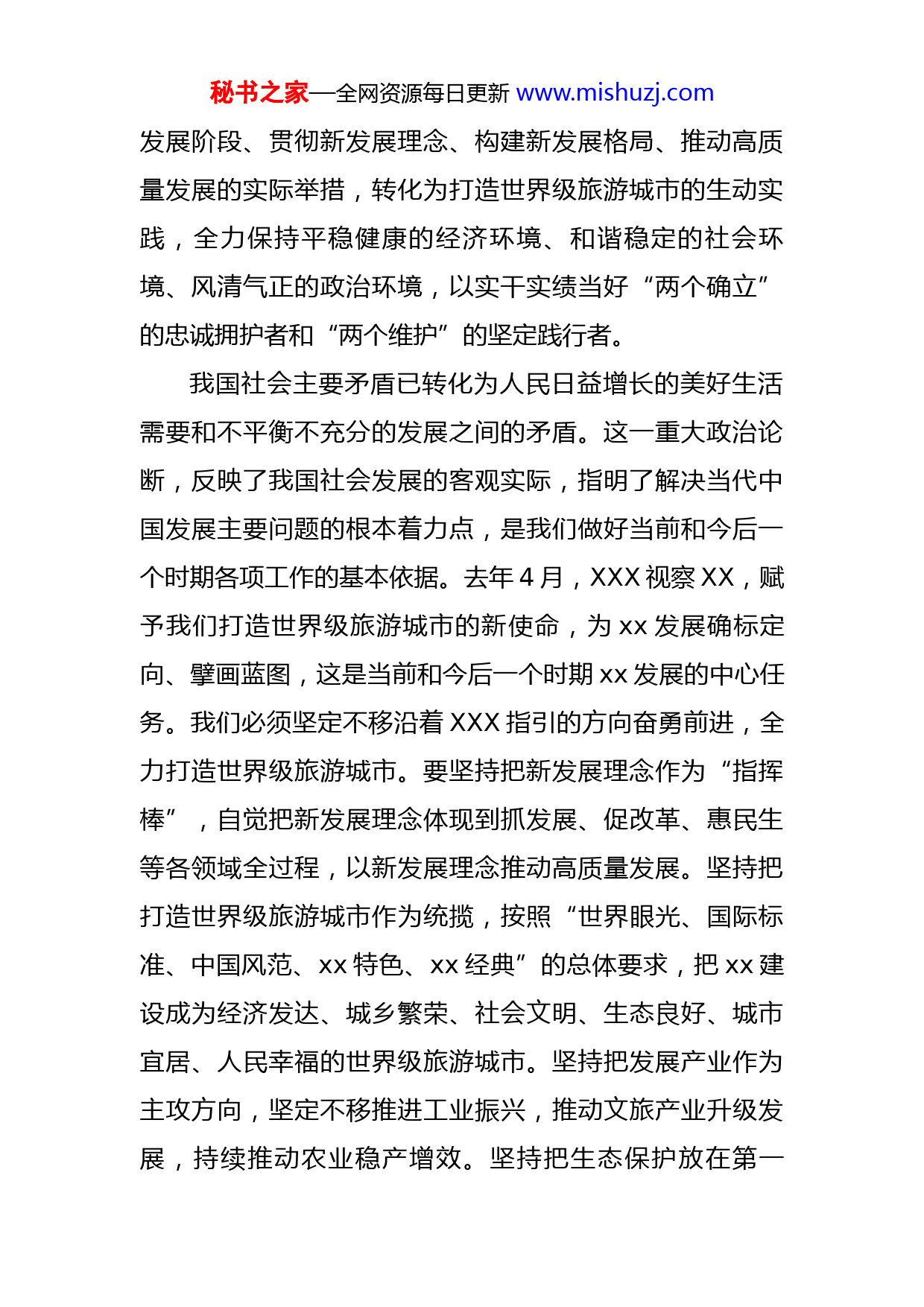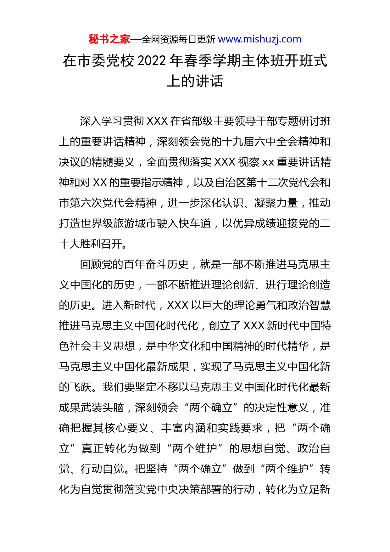 秘书之家—全网资源每日更新www.mishuzj.com在市委党校2022年春季学期主体班开班式上的讲话深入学习贯彻XXX在省部级主要领导干部专题研讨班上的重要讲话精神,深刻领会党的十九届六中全会精神和决议的精髓要义,全面贯彻落实XXX视察xx重要讲话精神和对XX的重要指示精神,以及自治区第十二次党代会和市第六次党代会精神,进一步深化认识、凝聚力量,推动打造世界级旅游城市驶入快车道,以优异成绩迎接党的二十大胜利召开。回顾党的百年奋斗历史,就是一部不断推进马克思主义中国化的历史,一部不断推进理论创新、进行理论创造的历史。进入新时代,XXX以巨大的理论勇气和政治智慧推进马克思主义中国化时代化,创立了XXX新时代中国特色社会主义思想,是中华文化和中国精神的时代精华,是马克思主义中国化最新成果,实现了马克思主义中国化新的飞跃。我们要坚定不移以马克思主义中国化时代化最新成果武装头脑,深刻领会“两个确立”的决定性意义,准确把握其核心要义、丰富内涵和实践要求,把“两个确立”真正转化为做到“两个维护”的思想自觉、政治自觉、行动自觉。把坚持“两个确立”做到“两个维护”转化为自觉贯彻落实党中央决策部署的行动,转化为立足新秘书之家—全网资源每日更新www.mishuzj.com发展阶段、贯彻新发展理念、构建新发展格局、推动高质量发展的实际举措,转化为打造世界级旅游城市的生动实践,全力保持平稳健康的经济环境、和谐稳定的社会环境、风清气正的政治环境,以实干实绩当好“两个确立”的忠诚拥护者和“两个维护”的坚定践行者。我国社会主要矛盾已转化为人民日益增长的美好生活需要和不平衡不充分的发展之间的矛盾。这一重大政治论断,反映了我国社会发展的客观实际,指明了解决当代中国发展主要问题的根本着力点,是我们做好当前和今后一个时期各项工作的基本依据。去年4月,XXX视察XX,赋予我们打造世界级旅游城市的新使命,为xx发展确标定向、擘画蓝图,这是当前和今后一个时期xx发展的中心任务。我们必须坚定不移沿着XXX指引的方向奋勇前进,全力打造世界级旅游城市。要坚持把新发展理念作为“指挥棒”,自觉把新发展理念体现到抓发展、促改革、惠民生等各领域全过程,以新发展理念推动高质量发展。坚持把打造世界级旅游城市作为统揽,按照“世界眼光、国际标准、中国风范、xx特色、xx经典”的总体要求,把xx建设成为经济发达、城乡繁荣、社会文明、生态良好、城市宜居、人民幸福的世界级旅游城市。坚持把发展产业作为主攻方向,坚定不移推进工业振兴,推动文旅产业升级发展,持续推动农业稳产增效。坚持把生态保护放在第一秘书之家—全网资源每日更新www.mishuzj.com位,推动绿色低碳发展,当好保护xx山水的“二郎神”。坚持把提高人民生活品质作为根本目的,让发展成果更多更公平地惠及群众,不断推动共同富裕取得实质性进展。当前,xx正在全力打造世界级旅游城市,自治区提出了“一城一都一地一中心”四大定位,市第六次党代会明确了“三步走”战略。我们必须准确把握战略和策略,既要登高望远、胸怀大局,又要落实落细、积微成著,使各项工作在战略上更加主动、策略上更加精准,推动打造世界级旅游城市驶入快车道。要善于观全局、察大势、谋长远,提升战略思维能力。要注重策略的灵活性、有效性,提升把握策略能力。抓落实要敢担当、有效率、见实效,提升执行落实能力。要深刻认识推进自我革命的重大意义,带头落实全面从严治党各项要求,共同营造风清气正的政治生态。要始终保持政治定力,把讲政治作为立身之本,锻造过硬的政治能力,始终保持政治信仰不变、政治立场不移、政治方向不偏。要切实增强斗争精神,发扬湘江战役中勇于胜利、勇于突破、勇于牺牲的斗争精神,坚决战胜前进道路上的一切艰难险阻。要守住拒腐防变防线,时刻自重自省,严守纪法规矩,不断净化社交圈、生活圈、朋友圈,永葆清正廉洁的政治本色。学好党史、用好党史,不是一阵子的事,而是每一名秘书之家—全网资源每日更新www.mishuzj.com党员干部的终身课题。要坚持以史为鉴、开创未来,推进党史学习教育常态化长效化,做到常学常新、常学常悟、常学常得,不断从党的光辉历史中汲取奋进力量。坚持把学思践悟融入日常,把党性锤炼抓在经常,把为民服务做在平常,把党史学习教育与群众日常需求联系起来,推动全市上下知史爱党、知史爱国,不断筑牢历史记忆、坚定历史自信,走好新时代赶考之路。广大年轻干部要牢记职责,勇当新时代的奋斗者、追梦人,努力在打造世界级旅游城市中,创造属于新时代的光辉业绩、属于自己的精彩人生。要筑牢理想信念根基,把坚定马克思主义信仰作为安身立命之本,把共产主义远大理想和中国特色社会主义共同理想融入灵魂和血脉,挺起精神脊梁,筑牢精神支柱,始终保持共产党人的政治本色。要树立正确的政绩观,把为老百姓做了多少好事实事作为检验政绩的重要标准。要练就过硬本领,努力在学习中增长知识、锤炼品格,在工作中增长才干、练就本领。要弘扬担当实干精神,把工作岗位作为实现人生价值的舞台,从基层群众最关心的事做起,以担当实干书写人生风采。