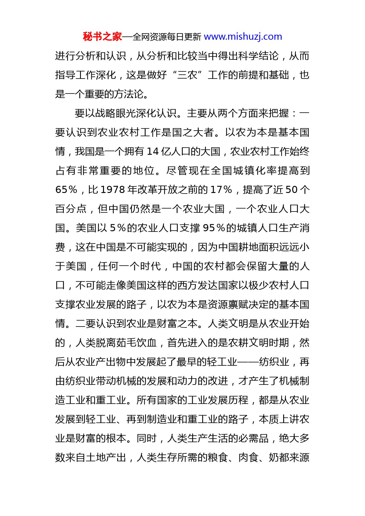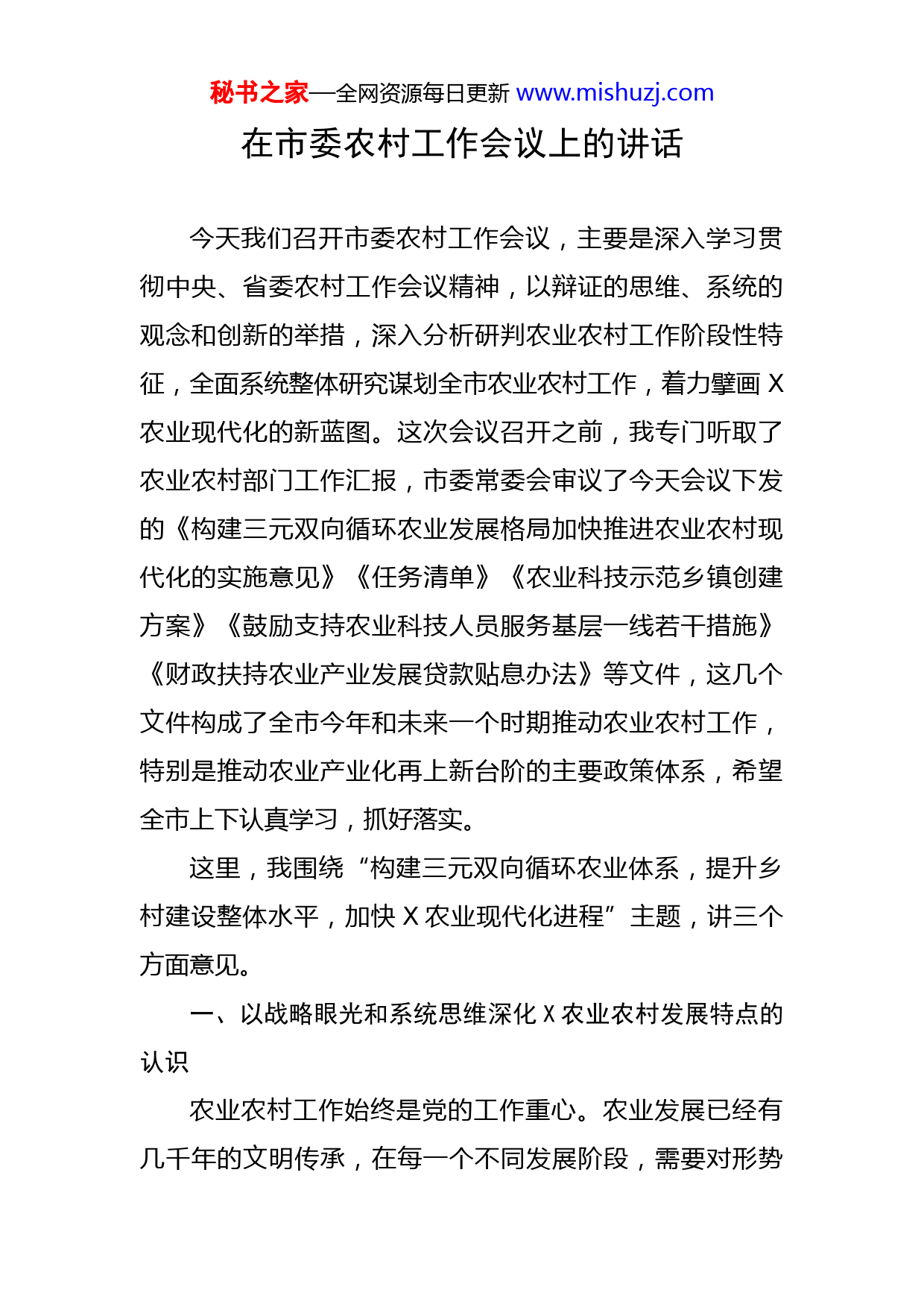 秘书之家—全网资源每日更新www.mishuzj.com在市委农村工作会议上的讲话今天我们召开市委农村工作会议,主要是深入学习贯彻中央、省委农村工作会议精神,以辩证的思维、系统的观念和创新的举措,深入分析研判农业农村工作阶段性特征,全面系统整体研究谋划全市农业农村工作,着力擘画X农业现代化的新蓝图。这次会议召开之前,我专门听取了农业农村部门工作汇报,市委常委会审议了今天会议下发的《构建三元双向循环农业发展格局加快推进农业农村现代化的实施意见》《任务清单》《农业科技示范乡镇创建方案》《鼓励支持农业科技人员服务基层一线若干措施》《财政扶持农业产业发展贷款贴息办法》等文件,这几个文件构成了全市今年和未来一个时期推动农业农村工作,特别是推动农业产业化再上新台阶的主要政策体系,希望全市上下认真学习,抓好落实。这里,我围绕“构建三元双向循环农业体系,提升乡村建设整体水平,加快X农业现代化进程”主题,讲三个方面意见。一、以战略眼光和系统思维深化X农业农村发展特点的认识农业农村工作始终是党的工作重心。农业发展已经有几千年的文明传承,在每一个不同发展阶段,需要对形势秘书之家—全网资源每日更新www.mishuzj.com进行分析和认识,从分析和比较当中得出科学结论,从而指导工作深化,这是做好“三农”工作的前提和基础,也是一个重要的方法论。要以战略眼光深化认识。主要从两个方面来把握:一要认识到农业农村工作是国之大者。以农为本是基本国情,我国是一个拥有14亿人口的大国,农业农村工作始终占有非常重要的地位。尽管现在全国城镇化率提高到65%,比1978年改革开放之前的17%,提高了近50个百分点,但中国仍然是一个农业大国,一个农业人口大国。美国以5%的农业人口支撑95%的城镇人口生产消费,这在中国是不可能实现的,因为中国耕地面积远远小于美国,任何一个时代,中国的农村都会保留大量的人口,不可能走像美国这样的西方发达国家以极少农村人口支撑农业发展的路子,以农为本是资源禀赋决定的基本国情。二要认识到农业是财富之本。人类文明是从农业开始的,人类脱离茹毛饮血,首先进入的是农耕文明时期,然后从农业产出物中发展起了最早的轻工业——纺织业,再由纺织业带动机械的发展和动力的改进,才产生了机械制造工业和重工业。所有国家的工业发展历程,都是从农业发展到轻工业、再到制造业和重工业的路子,本质上讲农业是财富的根本。同时,人类生产生活的必需品,绝大多数来自土地产出,人类生存所需的粮食、肉食、奶都来源秘书之家—全网资源每日更新www.mishuzj.com于农业,这就是农业的地位。因此,我们要有战略眼光,把农业作为全盘工作的重中之重,任何时候都不能动摇。要以系统思维深化认识。坚持系统观念是习近平经济思想的重要方法论。推动X农业农村工作高质量发展,必须运用系统思维,认识X农业发展的优势是什么,短板和不足是什么,现代农业发展的趋势是什么,只有认清优劣大局,把握发展大势,才能更好适应时代和产业发展趋势。用系统思维审视X的市情实际,X农业农村发展有以下5个特点:(一)农耕文明深厚但传统观念强固。X是农耕之源,从南佐遗址发现的稻菽稷等粮食遗存,到《诗经》豳风中的《七月流火》所描写的X农业农村生产生活场景中,都反映出X作为农耕之源是名副其实的。南佐遗址粮食遗存把我国种植业历史向前推进了数千年,表明这里在新石器时期就是中国农业最领先的地方;同时许多先周时期的历史传说,以及对先周农耕文化的考证,都证明X是名副其实的农耕之源。在看到悠久厚重农业文明的同时,我们也要看到农业领域的变化是非常缓慢的。工业已经从英国工业革命进化到当前的4.0阶段,但农业发展到今天最多也就是2.0阶段。中国最传统的“二牛抬杠”耕作技术,西汉时期就已经发明,但一直到本世纪初才彻底淘汰,至少秘书之家—全网资源每日更新www.mishuzj.com持续了2000多年历史。文明和农耕文化的传承也形成了一个副产品,就是传统观念的约束非常强。相比农业后发地区,我们受到的传统观念影响更多,使得农业进步速度更慢。传统观念的核心主要是两条:一是靠天吃饭,改善农业设施条件的动力不足。全市保灌农田面积很少,设施农业占比微乎其微,农民仍习惯于靠天吃饭,通过农业基础设施条件的改善来提高产量、增加农业产出的动力明显不足。发展设施农业是对农业基础条件的升级改造,比如建大棚就能增加保温保湿功能,延长植物生长期,延长无霜期,还能节约用水。全市农业整体条件很好,但产出率较低,是与设施农业发展不足有很大关系。二是路径依赖,应用新技术、推广新模式的水平偏低。X历来就有冬种小麦、春播玉米的传统耕种习惯,但把新技术应用到农业领域,通过新模式调整农业产业结构,在全省是比较慢的。去年到县区调研大豆玉米带状复合种植情况,因为气候比较干旱,发现有一块地庄稼长势明显不好,实地一看是没有覆膜,问起农民原因,竟然是嫌麻烦。农民宁可减产,也不应用已经推广多年、带来实际效益的全膜双垄沟播技术,这是X农民和河西农民的差距所在。许多农业新技术新模式探索进展迟缓,都与这种观念有关。我们要发展现代农业,必须首先要深刻认识到X既有农耕文明的深厚积淀,也有传统观