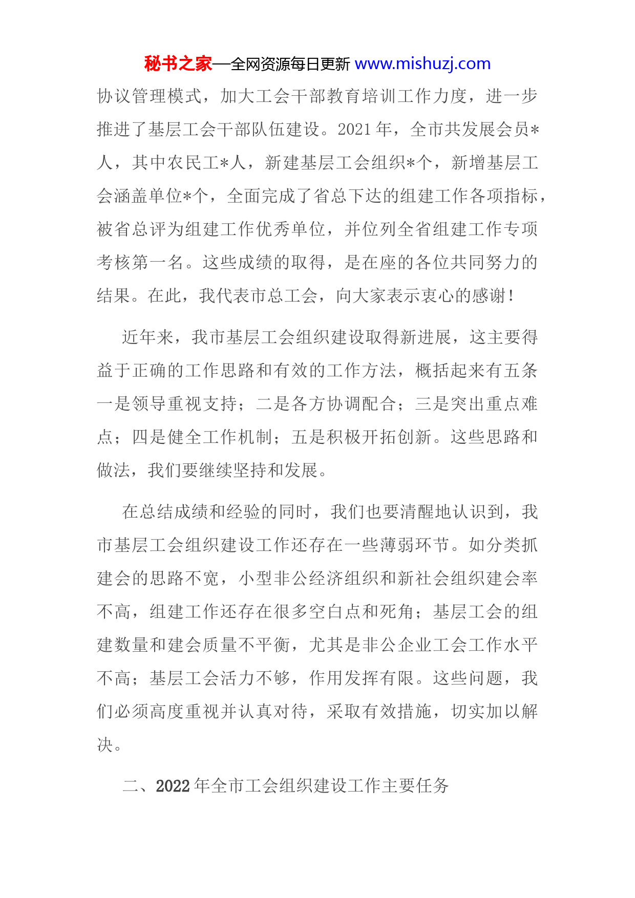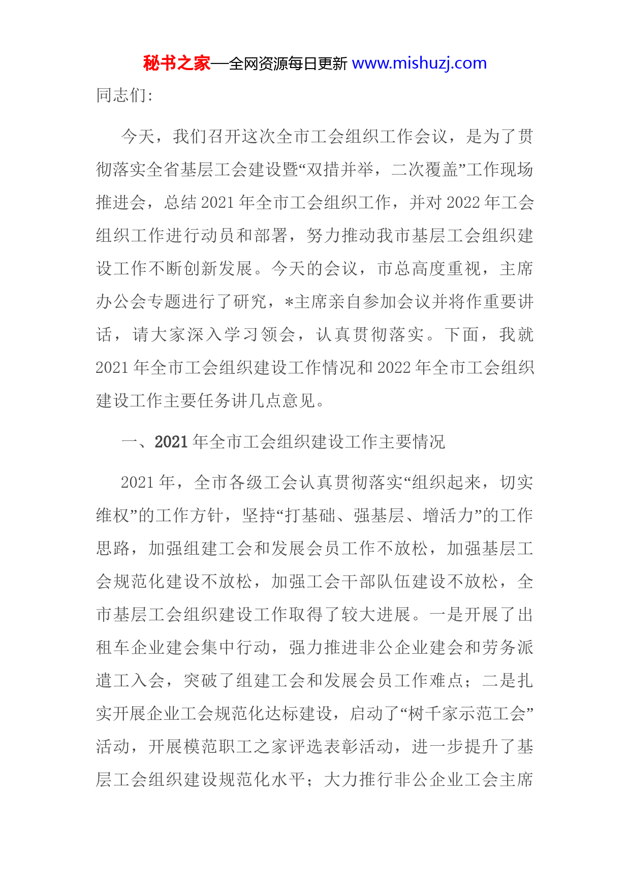 秘书之家—全网资源每日更新www.mishuzj.com同志们:今天,我们召开这次全市工会组织工作会议,是为了贯“”彻落实全省基层工会建设暨双措并举,二次覆盖工作现场推进会,总结2021年全市工会组织工作,并对2022年工会组织工作进行动员和部署,努力推动我市基层工会组织建设工作不断创新发展。今天的会议,市总高度重视,主席办公会专题进行了研究,主席亲自参加会议并将作重要讲话,请大家深入学习领会,认真贯彻落实。下面,我就2021年全市工会组织建设工作情况和2022年全市工会组织建设工作主要任务讲几点意见。一、2021年全市工会组织建设工作主要情况2021“年,全市各级工会认真贯彻落实组织起来,切实”“”维权的工作方针,坚持打基础、强基层、增活力的工作思路,加强组建工会和发展会员工作不放松,加强基层工会规范化建设不放松,加强工会干部队伍建设不放松,全市基层工会组织建设工作取得了较大进展。一是开展了出租车企业建会集中行动,强力推进非公企业建会和劳务派遣工入会,突破了组建工会和发展会员工作难点;二是扎“”实开展企业工会规范化达标建设,启动了树千家示范工会活动,开展模范职工之家评选表彰活动,进一步提升了基层工会组织建设规范化水平;大力推行非公企业工会主席秘书之家—全网资源每日更新www.mishuzj.com协议管理模式,加大工会干部教育培训工作力度,进一步推进了基层工会干部队伍建设。2021年,全市共发展会员人,其中农民工人,新建基层工会组织个,新增基层工会涵盖单位个,全面完成了省总下达的组建工作各项指标,被省总评为组建工作优秀单位,并位列全省组建工作专项考核第一名。这些成绩的取得,是在座的各位共同努力的结果。在此,我代表市总工会,向大家表示衷心的感谢!近年来,我市基层工会组织建设取得新进展,这主要得益于正确的工作思路和有效的工作方法,概括起来有五条一是领导重视支持;二是各方协调配合;三是突出重点难点;四是健全工作机制;五是积极开拓创新。这些思路和做法,我们要继续坚持和发展。在总结成绩和经验的同时,我们也要清醒地认识到,我市基层工会组织建设工作还存在一些薄弱环节。如分类抓建会的思路不宽,小型非公经济组织和新社会组织建会率不高,组建工作还存在很多空白点和死角;基层工会的组建数量和建会质量不平衡,尤其是非公企业工会工作水平不高;基层工会活力不够,作用发挥有限。这些问题,我们必须高度重视并认真对待,采取有效措施,切实加以解决。二、2022年全市工会组织建设工作主要任务秘书之家—全网资源每日更新www.mishuzj.com当前,随着经济和社会发展,我市基层工会组织建设工作面临着新的形势和任务。全市各级工会要正确认识和分析面临的新形势和新要求,抓住机遇,开拓创新,努力推动我市工会组建工作再上新台阶。(一)突出重点,推进工会组建工作持续发展一是重点推动非公经济组织和新社会组织的工会组建工作。近年来,我市工会组建工作一直保持快速发展态势,各地普遍感到任务多、难度大,未建会单位少,发展空间小。然而事实上,随着经济的发展,还有大量的新建企业和民办非企业单位没有建立工会组织,大量职工仍游离于工会组织之外。据省工会经费国税代收系统统计,我市已收取建会筹备金但未建会单位还大量存在。去年我们对全市新社会组织(即民办非企业单位、中介组织、社会团体)进行了调查。全市新社会组织家,已建工会仅家。可以说,我们的工会组建率还很低。因此,各县市区工会和市直各产业工会要尽快建立健全未建会单位台帐,特别是市直卫生、教育、司法、财政、民政等产业工会要对全市民营医院、民办学校、律师事务所、会计事务所及其他民办非企业单位进行调查摸底,有针对性地采取有力措施“在推动这些单位单独建会的同时,大力实施双措并举,二秘书之家—全网资源每日更新www.mishuzj.com”次覆盖,力争年内实现已收取工会筹备金但未建会的基层单位全部建会,并进一步提高新社会组织工会组建率。二是进一步巩固出租车企业建会成果,加强劳务派遣企业建会工作。各地工会要继续加大宣传、督促和指导力度,按照全总关于出租车企业建会的有关规定,针对出租车承包、挂靠、个体等不同运营方式和出租车从业人员不同用工形式,加强与交通、运管等有关主管部门的联系配合,积极探索创新出租车企业工会工作有效模式,发挥出租车企业工会作用,巩固建会成果。要督促劳务派遣企业建会吸纳劳务派遣工入会,指导劳务派遣企业规范劳务派遣工的管理,落实劳务派遣工的工资待遇、社会保险等权益,指导劳务派遣工会员在派遣期间参加用工单位组织的活动维护其在用工单位应享有的权益。三是继续抓好农民工入会和会籍管理工作。近几年,我市工会会员数有了较大幅度增长,达到了万人,其中农民工超过万人。据劳动部门统计,我市外出务工农民工近万人。由此可见,农民工是会员的重要增长点,也还有很大空间。因此,各地要依托村级工会和乡镇农民工维权服务站,坚持抓好农民工输出地源头入会工作。同时,要及时了解掌握本地区返乡农民工基本情况,做好农民工会员会籍接转工作,最大限度地防止会员流失。秘书之家—全网资源每日更新www.mishuzj.com四是进一步健全基层工会组织和会员信息台帐。各地工