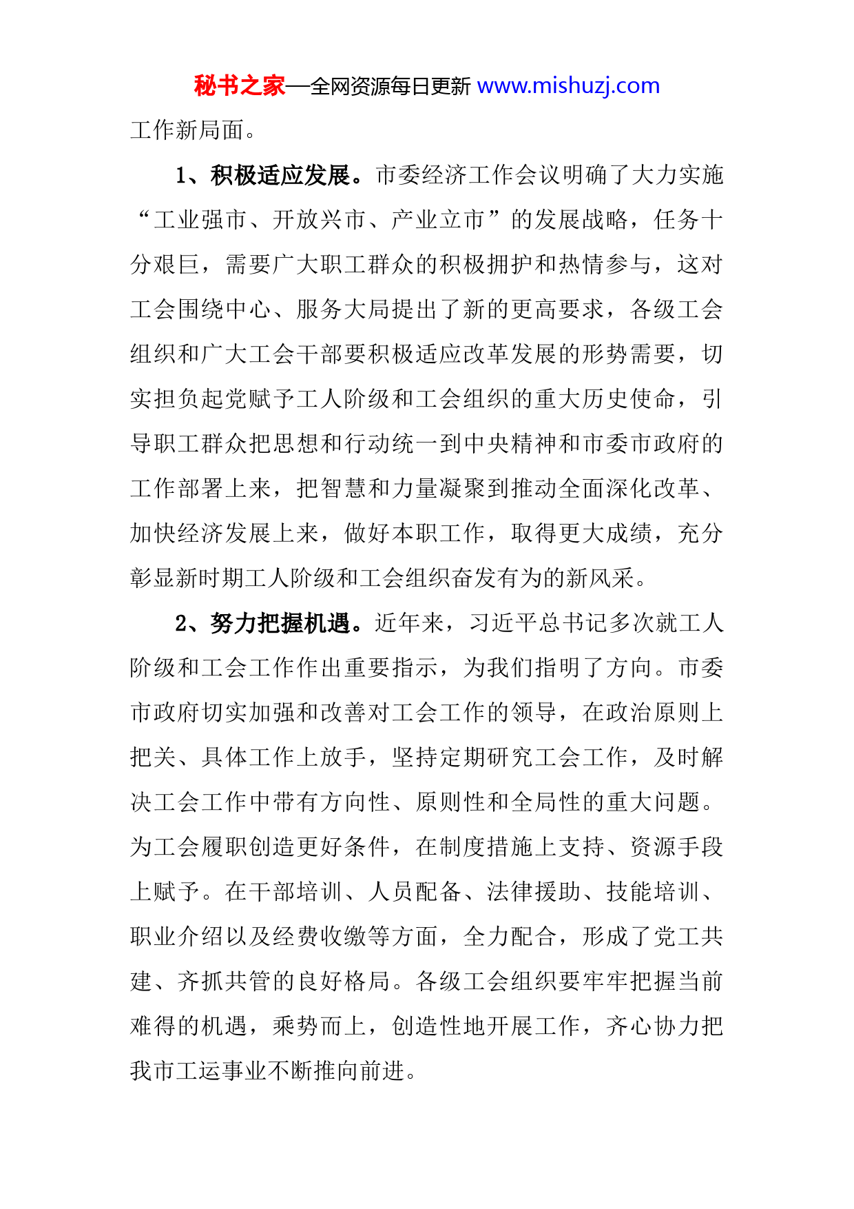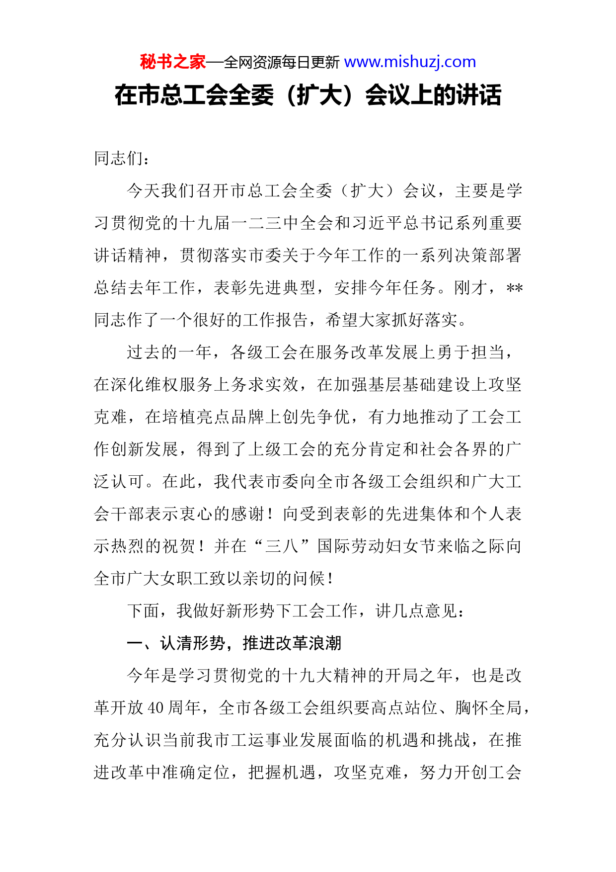 秘书之家—全网资源每日更新www.mishuzj.com在市总工会全委(扩大)会议上的讲话同志们:今天我们召开市总工会全委(扩大)会议,主要是学习贯彻党的十九届一二三中全会和习近平总书记系列重要讲话精神,贯彻落实市委关于今年工作的一系列决策部署总结去年工作,表彰先进典型,安排今年任务。刚才,同志作了一个很好的工作报告,希望大家抓好落实。过去的一年,各级工会在服务改革发展上勇于担当,在深化维权服务上务求实效,在加强基层基础建设上攻坚克难,在培植亮点品牌上创先争优,有力地推动了工会工作创新发展,得到了上级工会的充分肯定和社会各界的广泛认可。在此,我代表市委向全市各级工会组织和广大工会干部表示衷心的感谢!向受到表彰的先进集体和个人表示热烈的祝贺!并在“三八”国际劳动妇女节来临之际向全市广大女职工致以亲切的问候!下面,我做好新形势下工会工作,讲几点意见:一、认清形势,推进改革浪潮今年是学习贯彻党的十九大精神的开局之年,也是改革开放40周年,全市各级工会组织要高点站位、胸怀全局,充分认识当前我市工运事业发展面临的机遇和挑战,在推进改革中准确定位,把握机遇,攻坚克难,努力开创工会秘书之家—全网资源每日更新www.mishuzj.com工作新局面。1、积极适应发展。市委经济工作会议明确了大力实施“工业强市、开放兴市、产业立市”的发展战略,任务十分艰巨,需要广大职工群众的积极拥护和热情参与,这对工会围绕中心、服务大局提出了新的更高要求,各级工会组织和广大工会干部要积极适应改革发展的形势需要,切实担负起党赋予工人阶级和工会组织的重大历史使命,引导职工群众把思想和行动统一到中央精神和市委市政府的工作部署上来,把智慧和力量凝聚到推动全面深化改革、加快经济发展上来,做好本职工作,取得更大成绩,充分彰显新时期工人阶级和工会组织奋发有为的新风采。2、努力把握机遇。近年来,习近平总书记多次就工人阶级和工会工作作出重要指示,为我们指明了方向。市委市政府切实加强和改善对工会工作的领导,在政治原则上把关、具体工作上放手,坚持定期研究工会工作,及时解决工会工作中带有方向性、原则性和全局性的重大问题。为工会履职创造更好条件,在制度措施上支持、资源手段上赋予。在干部培训、人员配备、法律援助、技能培训、职业介绍以及经费收缴等方面,全力配合,形成了党工共建、齐抓共管的良好格局。各级工会组织要牢牢把握当前难得的机遇,乘势而上,创造性地开展工作,齐心协力把我市工运事业不断推向前进。秘书之家—全网资源每日更新www.mishuzj.com3、沉着应对挑战。当前我们面临许多挑战,特别是工作中还存在许多不适应、不符合形势任务要求的瓶颈制约问题,必须下气力解决。比如,工会组建方式、活动方式还不能完全适应经济社会发展的需要;工会组织的服务方式、服务水平还不能满足广大职工群众的新期待;工会工作的机制手段还不能完全适应全面深化改革、利益格局调整对维护职工合法权益带来的新挑战。部分乡镇办事处和市直单位在工会班子建设、人员配备、机构设置、工作水准等方面还存在一些薄弱环节,工会作用发挥不够,工会阵地建设特别是职工之家建设发展不均衡等等。对这些问题,各级工会要足够重视,认真加以解决。二、把握主题,加快经济建设为实现中华民族伟大复兴的中国梦而奋斗,是我国工人运动的时代主题。全市各级工会组织要始终唱响这一时代主题,团结动员广大职工积极投身到全面深化改革、建设美丽的主战场中,为推动全市经济社会持续健康发展建功立业。一是引导投身改革。职工群众是推动改革发展的生力军,要开展深化劳动竞赛、岗位练兵等活动,引导广大职工群众立足岗位争先创优,通过管理方式的改进,技术改造革新,释放职工的创造活力,推动企业加快发展,促进产业转型升级。秘书之家—全网资源每日更新www.mishuzj.com二是推动创新创业。要充分发挥工会“大学校”作用,着力提升广大职工的技能素质,加强创业就业观念的引导加大技能培训、创业指导、就业服务力度,加快建设知识型、技能型、创新型的职工队伍。要主动顺应转型升级、科学发展的要求,引导和鼓励职工群众带头创新创业。三是激发勇于争先。积极培育和践行社会主义核心价值观,以开展“中国梦·劳动美”主题教育活动为重要载体,突出爱国、敬业、诚信、友善、勤劳、节俭等内容,坚持典型引路,广泛宣传劳模和行业领军人物典型事迹,引导职工群众争当先进、争创优秀。要搭建服务平台,创造发展机遇,落实各项待遇,增强一线岗位的吸引力,让干得好的一线职工有高薪、有荣誉、有发展空间,实现体面、尊严劳动,进一步激发广大职工的创造潜能和劳动热情。三、依法维权,构建和谐劳动关系工会要赢得职工群众信赖和支持,必须做好维护职工群众切身利益工作,促进社会公平正义。全市各级工会组织要忠实履行维护职工群众合法权益的基本职责,让改革发展成果更多更公平地惠及广大职工,促进社会和谐稳定。一是突出重点群体、重点领域的维权。以一线职工、困难职工、农民工等为重点群体,以劳动就业、技能培训收入分配、社会保障、安全卫生等广大职工最关心最直接秘书之家—全网资源每日更新www.mishuzj.com