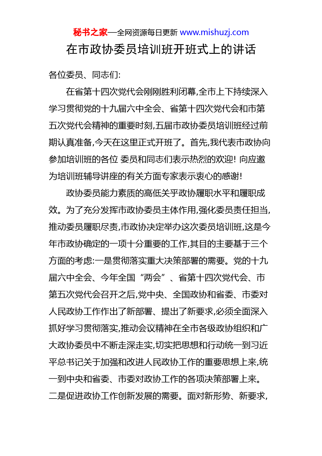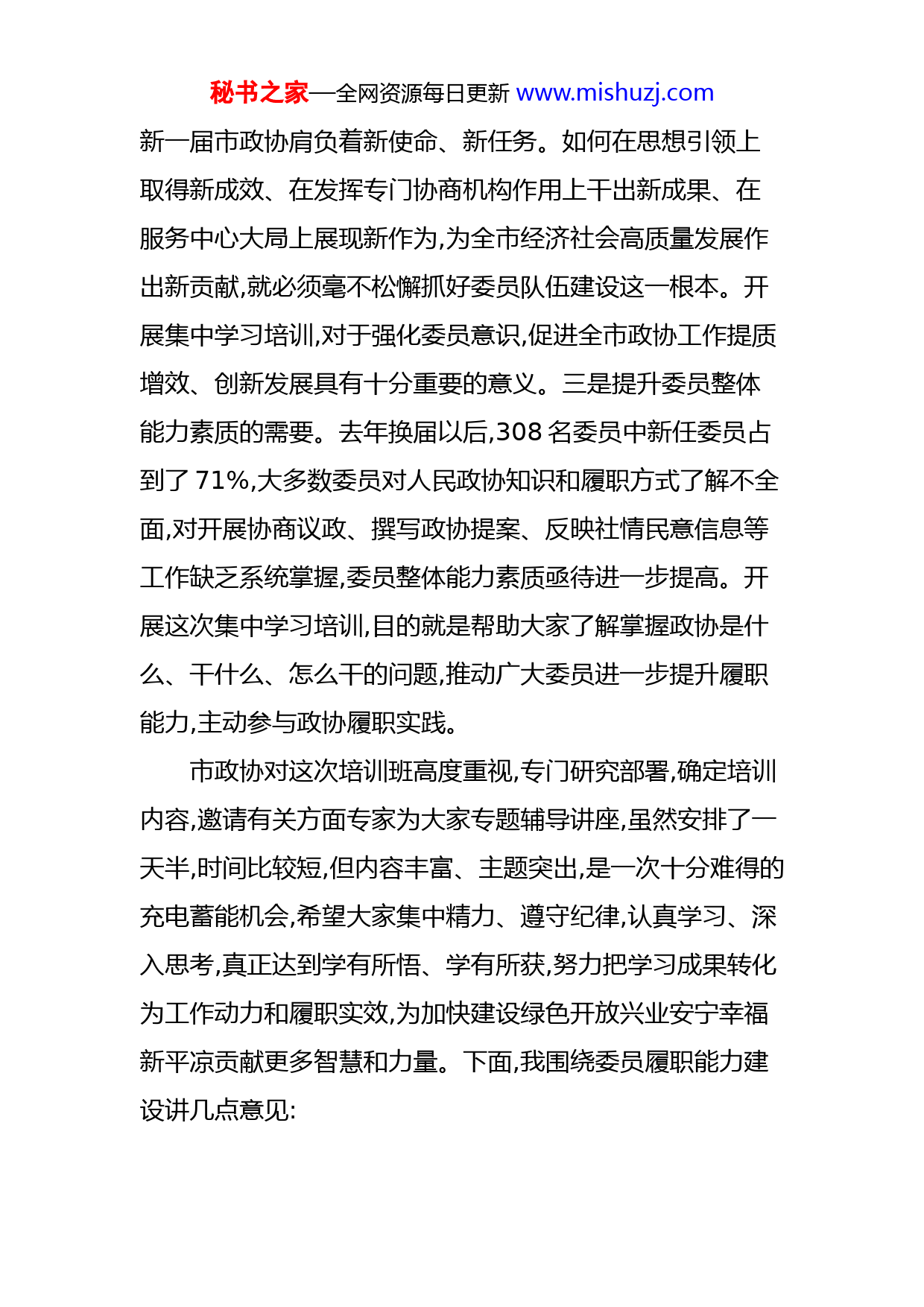 秘书之家—全网资源每日更新www.mishuzj.com在市政协委员培训班开班式上的讲话各位委员、同志们:在省第十四次党代会刚刚胜利闭幕,全市上下持续深入学习贯彻党的十九届六中全会、省第十四次党代会和市第五次党代会精神的重要时刻,五届市政协委员培训班经过前期认真准备,今天在这里正式开班了。首先,我代表市政协向参加培训班的各位委员和同志们表示热烈的欢迎!向应邀为培训班辅导讲座的有关方面专家表示衷心的感谢!政协委员能力素质的高低关乎政协履职水平和履职成效。为了充分发挥市政协委员主体作用,强化委员责任担当,推动委员履职尽责,市政协决定举办这次委员培训班,这是今年市政协确定的一项十分重要的工作,其目的主要基于三个方面的考虑:一是贯彻落实重大决策部署的需要。党的十九届六中全会、今年全国“两会”、省第十四次党代会、市第五次党代会召开之后,党中央、全国政协和省委、市委对人民政协工作作出了新部署、提出了新要求,必须全面深入抓好学习贯彻落实,推动会议精神在全市各级政协组织和广大政协委员中不断走深走实,切实把思想和行动统一到习近平总书记关于加强和改进人民政协工作的重要思想上来,统一到中央和省委、市委对政协工作的各项决策部署上来。二是促进政协工作创新发展的需要。面对新形势、新要求,秘书之家—全网资源每日更新www.mishuzj.com新一届市政协肩负着新使命、新任务。如何在思想引领上取得新成效、在发挥专门协商机构作用上干出新成果、在服务中心大局上展现新作为,为全市经济社会高质量发展作出新贡献,就必须毫不松懈抓好委员队伍建设这一根本。开展集中学习培训,对于强化委员意识,促进全市政协工作提质增效、创新发展具有十分重要的意义。三是提升委员整体能力素质的需要。去年换届以后,308名委员中新任委员占到了71%,大多数委员对人民政协知识和履职方式了解不全面,对开展协商议政、撰写政协提案、反映社情民意信息等工作缺乏系统掌握,委员整体能力素质亟待进一步提高。开展这次集中学习培训,目的就是帮助大家了解掌握政协是什么、干什么、怎么干的问题,推动广大委员进一步提升履职能力,主动参与政协履职实践。市政协对这次培训班高度重视,专门研究部署,确定培训内容,邀请有关方面专家为大家专题辅导讲座,虽然安排了一天半,时间比较短,但内容丰富、主题突出,是一次十分难得的充电蓄能机会,希望大家集中精力、遵守纪律,认真学习、深入思考,真正达到学有所悟、学有所获,努力把学习成果转化为工作动力和履职实效,为加快建设绿色开放兴业安宁幸福新平凉贡献更多智慧和力量。下面,我围绕委员履职能力建设讲几点意见:秘书之家—全网资源每日更新www.mishuzj.com一、切实提高政治把握能力,做好政治引领“明白人”。人民政协是政治组织,讲政治始终是第一位要求。政协委员代表各界群众参与国是、履行职责,肩负着政治使命,必须把政治建设摆在首位,着力提升政治判断力、政治领悟力、政治执行力。一要旗帜鲜明讲政治。始终把坚持中国共产党的领导作为最根本的政治原则,深入学习贯彻习近平新时代中国特色社会主义思想,持续深化党史学习教育,认真开展委员读书活动和“书香政协”建设,不断强化思想理论武装,充分汲取智慧和力量,始终做到拥护“两个确立”,牢固树立“四个意识”,坚定“四个自信”,坚决做到“两个维护”,始终保持政治立场不含糊、政治原则不动摇、政治方向不偏离,始终同以习近平同志为核心的党中央保持高度一致。二要服务大局善作为。认真落实中央和省委、市委的部署要求,紧紧围绕全市中心工作,积极服务发展大局,切实做到党委政府工作推进到哪里、政协工作就跟进到那里,人民群众关注哪里、委员履职就落脚到那里,始终与党委和政府想在一起、站在一起、干在一起,通过各级政协组织和广大委员的示范引领,切实把党委政府的决策部署,依靠政协民主协商程序转化为各党派团体和各族各界人士的自觉行动,筑牢团结奋斗的共同思想政治基础,充分彰显人民政协“重要阵地”作用。三要遵规守纪重品行。政协委员既是荣誉、更是责任。全体委员要正确行使委员权利,自觉履行委员义务,不断秘书之家—全网资源每日更新www.mishuzj.com加强自身道德修养,严格遵守各项纪律规定,切实维护好政协形象和委员形象。市政协委员委和各专门委员会要认真落实《市政协专门委员会通则》,充分发挥好职能作用,加强对各界别委员的联系联络和经常性教育指导,细化分解年度协商任务,严格实行委员履职平时考核、定期通报等制度办法,督促全体委员认真做好“委员作业”,交出合格“履职答卷”。对不参会、不写提案、不积极履职、不遵规守纪甚至违法乱纪的,要依章依规严肃处理,全力营造积极向上、风清气正的良好履职氛围。二、切实提高调查研究能力,做好协商议政“知情人”。开展专题调研是人民政协履职的基础环节,是保证政协履职质量的根本途径。离开了调查研究,参政议政、建言资政就是无源之水、无本之木,抓好调查研究就抓住了做好政协工作的“牛鼻子”。全体政协委员一定要牢固树立调查研究意识,在参与政协协商视察活动中不断增强调查研究能力,努力做到:一是调研选题力