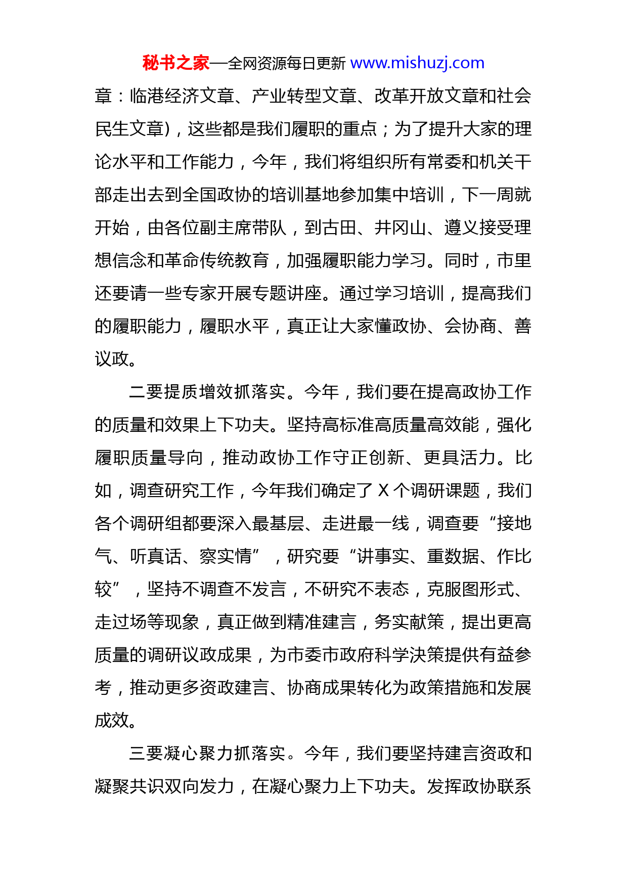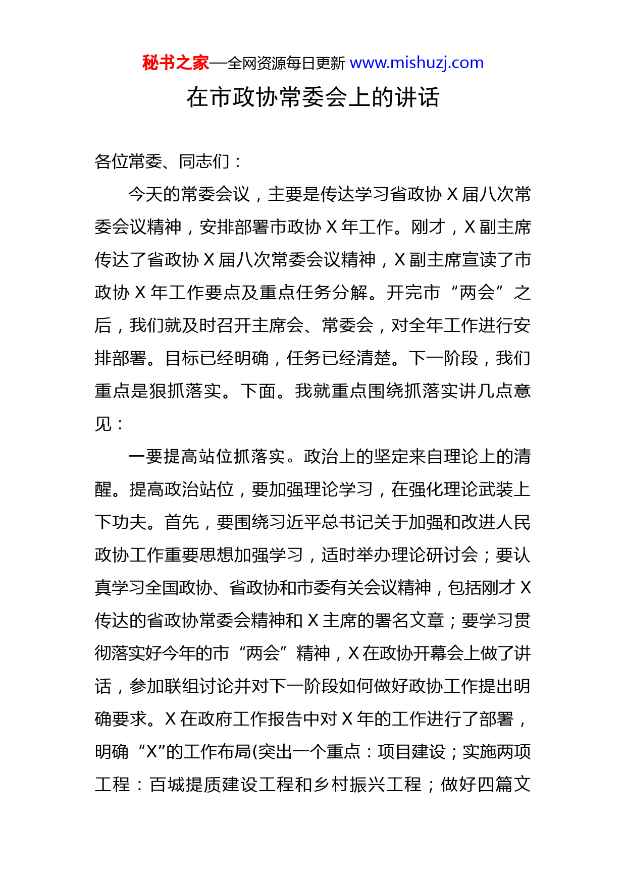 秘书之家—全网资源每日更新www.mishuzj.com在市政协常委会上的讲话各位常委、同志们:今天的常委会议,主要是传达学习省政协X届八次常委会议精神,安排部署市政协X年工作。刚才,X副主席传达了省政协X届八次常委会议精神,X副主席宣读了市政协X年工作要点及重点任务分解。开完市“两会”之后,我们就及时召开主席会、常委会,对全年工作进行安排部署。目标已经明确,任务已经清楚。下一阶段,我们重点是狠抓落实。下面。我就重点围绕抓落实讲几点意见:一要提高站位抓落实。政治上的坚定来自理论上的清醒。提高政治站位,要加强理论学习,在强化理论武装上下功夫。首先,要围绕习近平总书记关于加强和改进人民政协工作重要思想加强学习,适时举办理论研讨会;要认真学习全国政协、省政协和市委有关会议精神,包括刚才X传达的省政协常委会精神和X主席的署名文章;要学习贯彻落实好今年的市“两会”精神,X在政协开幕会上做了讲话,参加联组讨论并对下一阶段如何做好政协工作提出明确要求。X在政府工作报告中对X年的工作进行了部署,明确“X”的工作布局(突出一个重点:项目建设;实施两项工程:百城提质建设工程和乡村振兴工程;做好四篇文秘书之家—全网资源每日更新www.mishuzj.com章:临港经济文章、产业转型文章、改革开放文章和社会民生文章),这些都是我们履职的重点;为了提升大家的理论水平和工作能力,今年,我们将组织所有常委和机关干部走出去到全国政协的培训基地参加集中培训,下一周就开始,由各位副主席带队,到古田、井冈山、遵义接受理想信念和革命传统教育,加强履职能力学习。同时,市里还要请一些专家开展专题讲座。通过学习培训,提高我们的履职能力,履职水平,真正让大家懂政协、会协商、善议政。二要提质增效抓落实。今年,我们要在提高政协工作的质量和效果上下功夫。坚持高标准高质量高效能,强化履职质量导向,推动政协工作守正创新、更具活力。比如,调查研究工作,今年我们确定了X个调研课题,我们各个调研组都要深入最基层、走进最一线,调查要“接地气、听真话、察实情”,研究要“讲事实、重数据、作比较”,坚持不调查不发言,不研究不表态,克服图形式、走过场等现象,真正做到精准建言,务实献策,提出更高质量的调研议政成果,为市委市政府科学決策提供有益参考,推动更多资政建言、协商成果转化为政策措施和发展成效。三要凝心聚力抓落实。今年,我们要坚持建言资政和凝聚共识双向发力,在凝心聚力上下功夫。发挥政协联系秘书之家—全网资源每日更新www.mishuzj.com面广、代表性强的优势,注重吸纳各民主党派、工商联和各界人士参加政协活动,积极为他们在政协履职创造条件,最大限度地把方方面面的思想统一起来、力量团结起来、积极性主动性创造性都充分调动起来,凝聚共识心,汇聚团结力,上下同心,齐心协力,为实现X高质量跨越发展作出积极贡献。四要守正创新抓落实。创新是推动人民政协事业发展的活力源泉。去年,我们创新开展了“协商议政助发展”履职实践活动,这项活动起到了非常好的效果,继标书记和丁福浩市长作出重要批示,省委政研室派出专门调研组到我们这来召开座谈会,把这些工作在全省进行了推广,各大媒体对这项工作进行了报道。同时,自去年X月开展以来,这项活动得到了全市各级政协组织、政协各参加单位和广大政协委员的积极响应和热情参与。今年,我们将在原有的基础上,不断深化活动内容和活动成果。比如,结合今年正在开展的创卫,不断深化这项工作。同时,不断丰富协商形式,拓宽协商渠道和平台,从而使专门协商机构“专”出特色、“专”出质量、“专”出水平。今年,我们有创建国家卫生城市、非公经济高质量发展、中心城区基础教育大班额情况、农村人居环境整治四个协商专题,对这四个协商课题,我们要创新方式方法,不能仅仅坐而论道,除了把X的情况调查清楚,也可以到周边进秘书之家—全网资源每日更新www.mishuzj.com行学习,学习先进的经验,拿来为我们所用,提出一些更有价值的意见和建议来,不断扩大活动影响力,打造出符合X实际、突出政协特色的履职品牌。五是增强责任抓落实。在全国政协闭幕会上,汪洋主席讲到,新时代的人民政协要有新时代的样子,新时代的政协委员也要有新时代的形象。政协没有名誉委员,只有责任委员,政协委员不仅是一种荣誉,更是一种政治责任,所有委员都要围绕X经济社会发展和民生改善尽职尽责,用心用力。今年“两会”上,我们隆重表彰了一批优秀政协委员,起了良好的示范带动作用,充分说明我们加强委员履职管理是有效举措。今后,我们要继续严格执行委员履职管理办法,更加客观详实记录委员履职档案,引导委员始终心系X发展大局、情牵民生福祉,积极履行委员职责,以实际行动写好“委员作业”,答好履职考卷。六要争创一流抓落实。我们在所有工作中都要拉高标杆,争创一流,特别是在政协机关建设上,要以创建省级文明单位标兵为契机,持续推进学习型、创新型、和谐型、廉洁型“四型机关”建设。开展“找差距、转作风、抓落实”专项活动,加强政协机关“三个提升、四个之家”建设,以一流的标准规范政协机关工作,以一流的作风打造过硬的政协机关干部队伍,以一流的服务切实为委员履职提供可靠