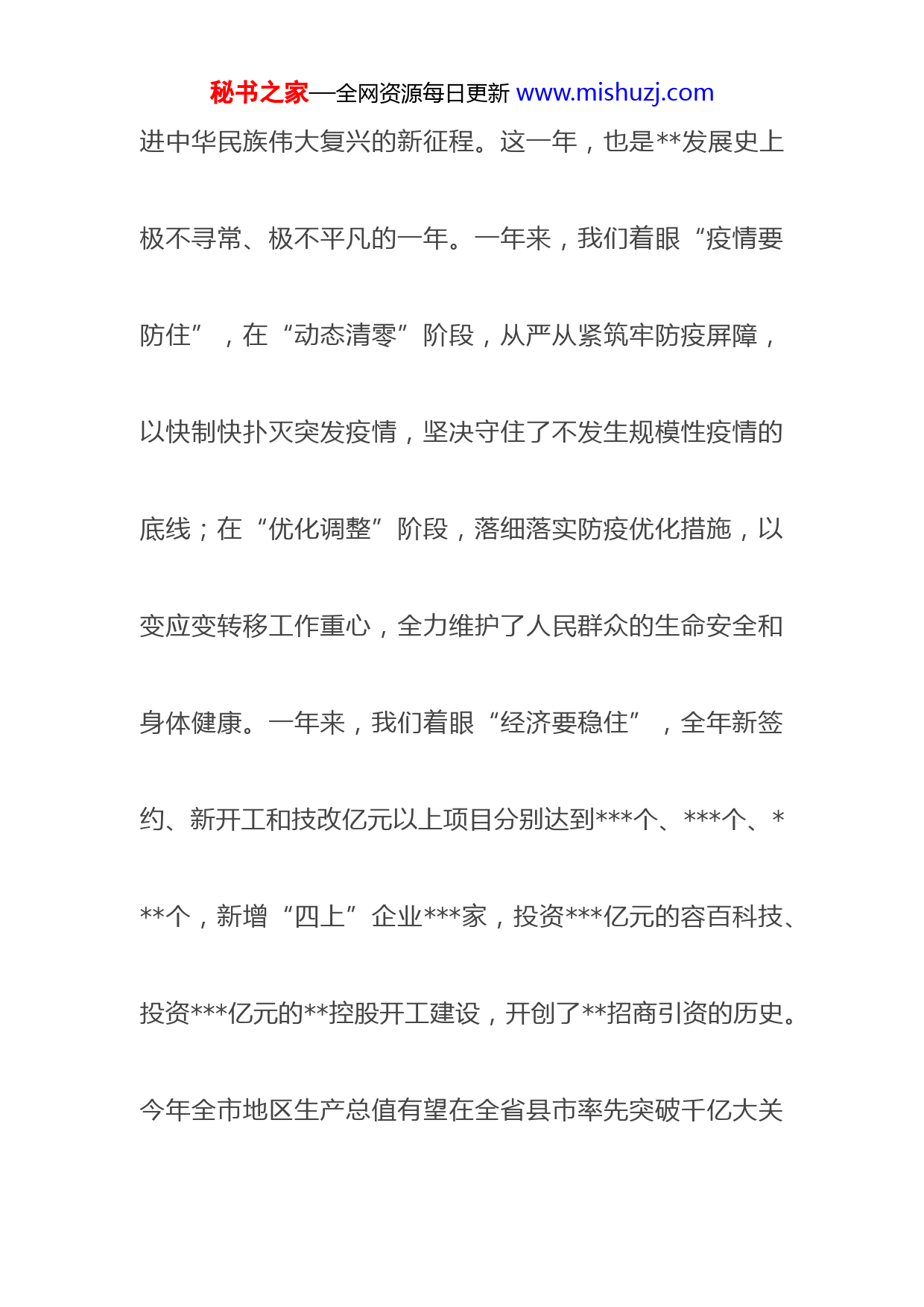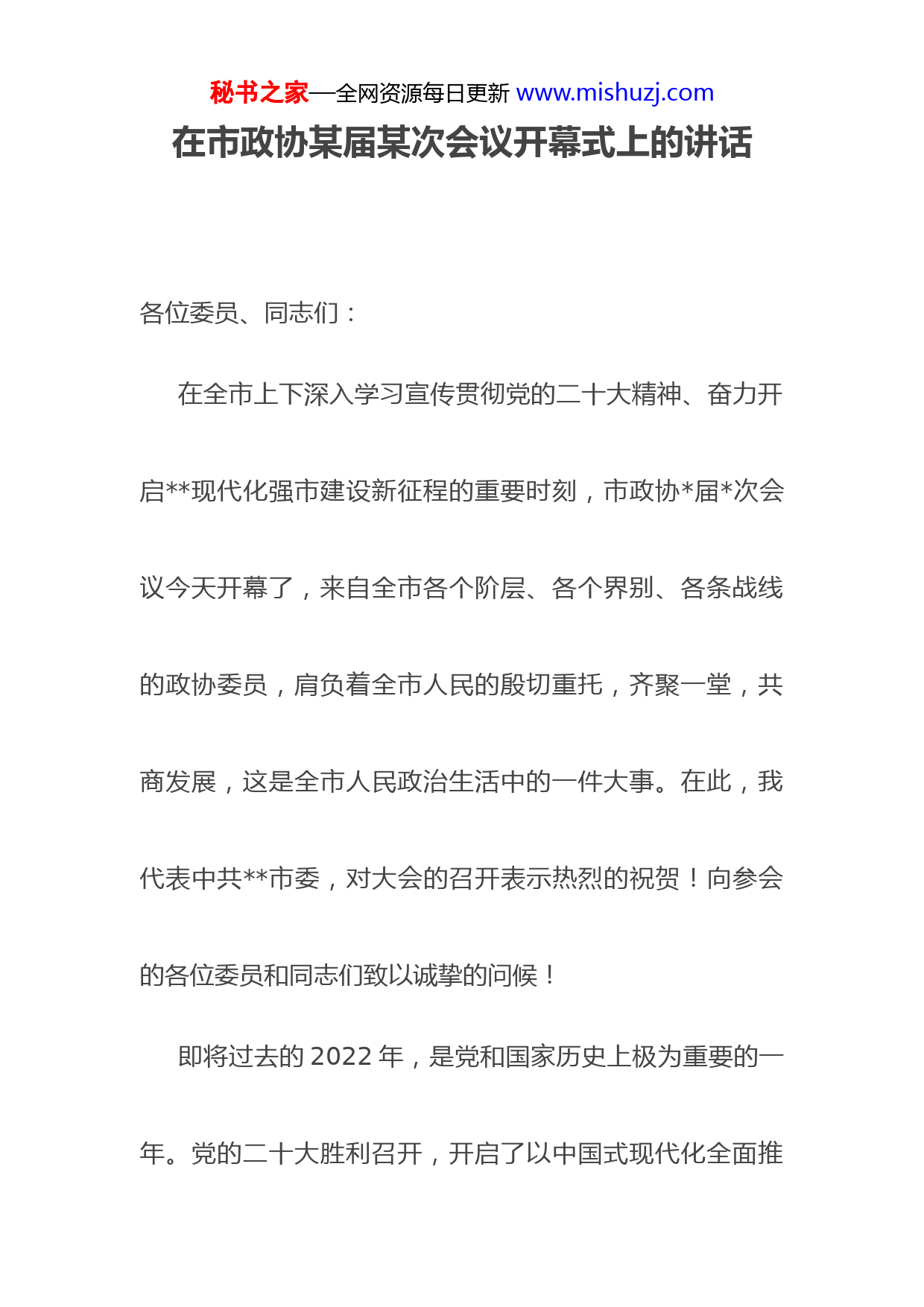 秘书之家—全网资源每日更新www.mishuzj.com在市政协某届某次会议开幕式上的讲话各位委员、同志们:在全市上下深入学习宣传贯彻党的二十大精神、奋力开启现代化强市建设新征程的重要时刻,市政协届次会议今天开幕了,来自全市各个阶层、各个界别、各条战线的政协委员,肩负着全市人民的殷切重托,齐聚一堂,共商发展,这是全市人民政治生活中的一件大事。在此,我代表中共市委,对大会的召开表示热烈的祝贺!向参会的各位委员和同志们致以诚挚的问候!即将过去的2022年,是党和国家历史上极为重要的一年。党的二十大胜利召开,开启了以中国式现代化全面推秘书之家—全网资源每日更新www.mishuzj.com进中华民族伟大复兴的新征程。这一年,也是发展史上极不寻常、极不平凡的一年。一年来,我们着眼“疫情要防住”,在“动态清零”阶段,从严从紧筑牢防疫屏障,以快制快扑灭突发疫情,坚决守住了不发生规模性疫情的底线;在“优化调整”阶段,落细落实防疫优化措施,以变应变转移工作重心,全力维护了人民群众的生命安全和身体健康。一年来,我们着眼“经济要稳住”,全年新签约、新开工和技改亿元以上项目分别达到个、个、个,新增“四上”企业家,投资亿元的容百科技、投资亿元的控股开工建设,开创了招商引资的历史。今年全市地区生产总值有望在全省县市率先突破千亿大关秘书之家—全网资源每日更新www.mishuzj.com在全国县域经济百强中再进位、位居第位,跻身中部前十,连续两年全省首位。一年来,我们着眼“发展要安全”,将治毒、治诈、治水作为本届市委市政府三件大事,反诈工作负向排名由全国第名退出全国前名,禁毒工作顺利摘帽,国务院联席办、国家禁毒委相继在全国推介反诈禁毒经验做法,总投资亿元的城市“水管家”项目启动实施,全年整治安全隐患万个,群众安全感测评在全省排名提升个位次,安全屏障更加牢固。成绩来自砥砺奋进,发展源于协力同心。这些成绩的取得,是省委省政府正确领导、关心支持的结果,是全市上下团结奋斗、努力拼搏的结果,也是各级政协组织和广大秘书之家—全网资源每日更新www.mishuzj.com政协委员同舟共济、勇毅前行的结果。一年来,全市各级政协组织和广大政协委员深入学习贯彻党的二十大精神和习近平总书记考察重要讲话精神,充分发挥专门协商机构独特作用,坚持发扬民主和增进团结相互贯通、建言资政和凝聚共识双向发力,紧扣高效统筹疫情防控和经济社会发展建言献策、履职尽责,为加快推动经济社会高质量发展贡献了不可或缺的智慧和力量。对政协的工作,市委是满意的,社会各界也是充分认可的。在此,我代表市委,向全市各级政协组织和广大政协委员,向各民主党派工商联、无党派人士和人民团体,表示衷心的感谢并致以崇高的敬意!秘书之家—全网资源每日更新www.mishuzj.com各位委员、同志们,2023年是学习贯彻党的二十大精神的开局之年,是实施“十四五”规划承上启下的关键一年,也是“挺进五十强、创成文明城、建设示范区”极为重要的一年。如期实现市委提出的奋斗目标,需要全市上下群策群力、团结奋斗,需要全市政协组织同心同德、同向同行,需要全体政协委员和衷共济、携手共进。希望全市各级政协组织和广大政协委员,自觉把思想和行动统一到党中央决策部署、省委工作要求上来,把力量和智慧凝聚到“百强进位、创城摘牌、示范见效”的目标任务上来咬定目标不放松,坚定信心不动摇,以“政协之能”服务秘书之家—全网资源每日更新www.mishuzj.com“发展之为”。借此机会,我代表市委对政协工作提四点希望。一、要同心同向、同频共振,在政治方向上更加坚定。政协之政首先是政治之“政”,必须旗帜鲜明讲政治、坚定不移跟党走。全市各级政协组织要把学习宣传贯彻党的二十大精神作为首要政治任务,在全面学习、全面掌握、全面落实上持续用功,深刻领悟“两个确立”的决定性意义,自觉增强“四个意识”、坚定“四个自信”、做到“两个维护”,始终在思想上政治上行动上同以习近平同志为核心的党中央保持高度一致。要坚定不移用习近平新时代中国特色社会主义思想凝心铸魂,不断增进对中国共秘书之家—全网资源每日更新www.mishuzj.com产党领导和中国特色社会主义的政治认同、思想认同、理论认同、情感认同,确保政协工作始终沿着正确政治方向前进。二、要聚焦中心、聚力发展,在服务大局上更敢担当。发展是党执政兴国的第一要务,也是人民政协履行职能的永恒主题。全市各级政协组织和广大政协委员要坚持向中心聚焦、为大局出力,紧扣市委“挺进五十强、创成文明城、建设示范区”的发展目标,聚焦武仙同城、四化同步乡村振兴、基层治理等重大课题,紧盯招商引资、项目建设、文明创建等中心工作,主动领题、聚智破题、精准答题,以高水平履职服务高质量发展。尤其是广大政协委员秘书之家—全网资源每日更新www.mishuzj.com中汇集一大批有担当、有情怀的优秀企业家,本身就是发展的主力军,在做大做强的同时,要充分发挥联系广泛、资源丰富的优势,主动牵线搭桥、联络衔接、推介,推动更多优秀人才、优质项目落户,为高质量发展贡献力量。三、要深入一线、深入群众,在建言献策上更有温度。人民政协来自人民,最能感受和了解人民群众的