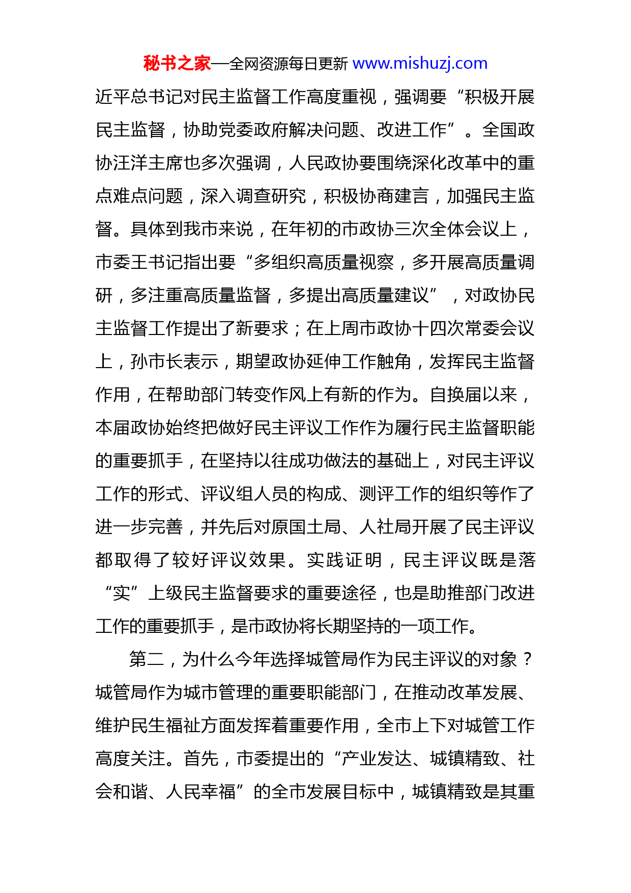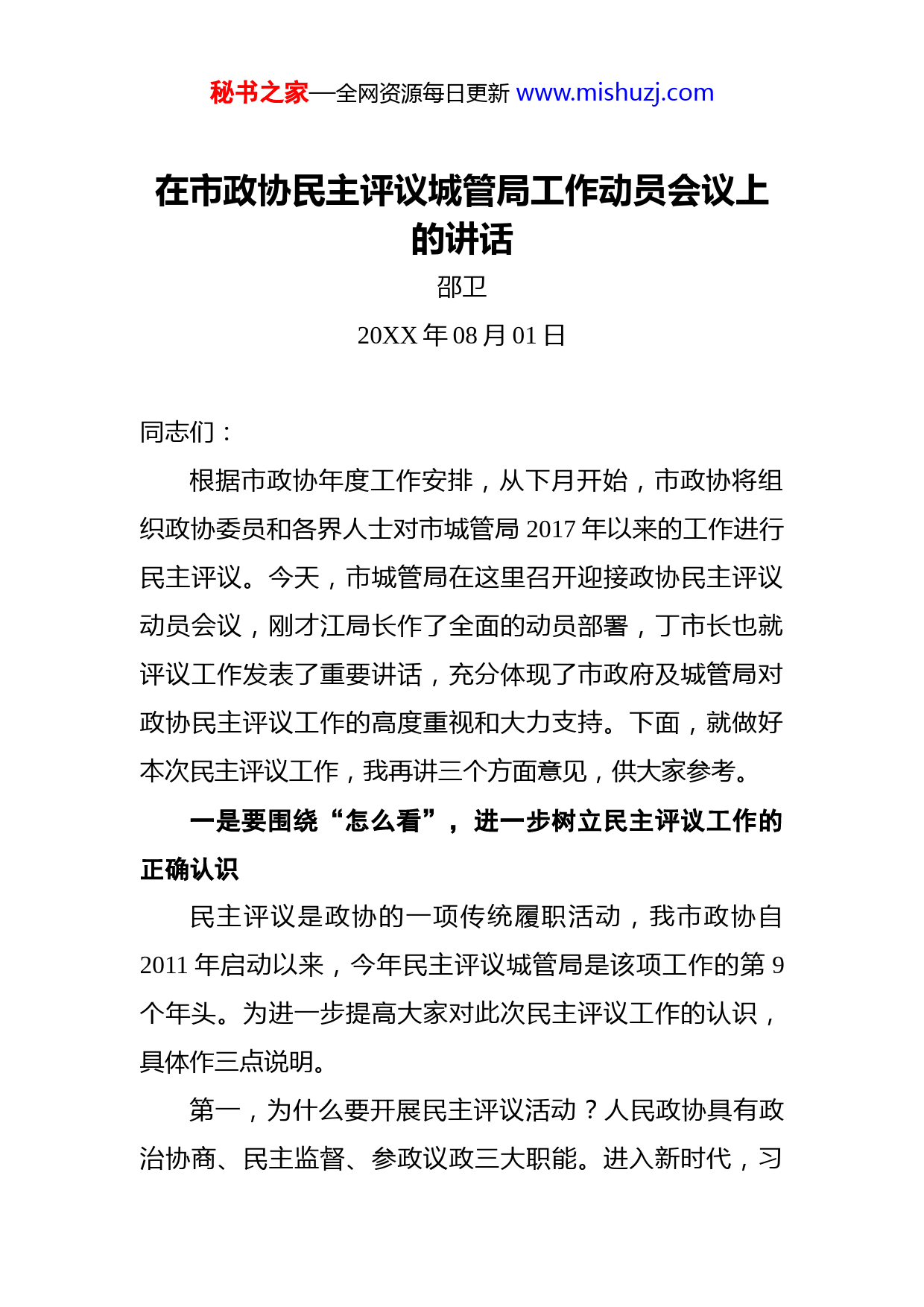 秘书之家—全网资源每日更新www.mishuzj.com在市政协民主评议城管局工作动员会议上的讲话邵卫20XX年08月01日同志们:根据市政协年度工作安排,从下月开始,市政协将组织政协委员和各界人士对市城管局2017年以来的工作进行民主评议。今天,市城管局在这里召开迎接政协民主评议动员会议,刚才江局长作了全面的动员部署,丁市长也就评议工作发表了重要讲话,充分体现了市政府及城管局对政协民主评议工作的高度重视和大力支持。下面,就做好本次民主评议工作,我再讲三个方面意见,供大家参考。一是要围绕“怎么看”,进一步树立民主评议工作的正确认识民主评议是政协的一项传统履职活动,我市政协自2011年启动以来,今年民主评议城管局是该项工作的第9个年头。为进一步提高大家对此次民主评议工作的认识,具体作三点说明。第一,为什么要开展民主评议活动?人民政协具有政治协商、民主监督、参政议政三大职能。进入新时代,习秘书之家—全网资源每日更新www.mishuzj.com近平总书记对民主监督工作高度重视,强调要“积极开展民主监督,协助党委政府解决问题、改进工作”。全国政协汪洋主席也多次强调,人民政协要围绕深化改革中的重点难点问题,深入调查研究,积极协商建言,加强民主监督。具体到我市来说,在年初的市政协三次全体会议上,市委王书记指出要“多组织高质量视察,多开展高质量调研,多注重高质量监督,多提出高质量建议”,对政协民主监督工作提出了新要求;在上周市政协十四次常委会议上,孙市长表示,期望政协延伸工作触角,发挥民主监督作用,在帮助部门转变作风上有新的作为。自换届以来,本届政协始终把做好民主评议工作作为履行民主监督职能的重要抓手,在坚持以往成功做法的基础上,对民主评议工作的形式、评议组人员的构成、测评工作的组织等作了进一步完善,并先后对原国土局、人社局开展了民主评议都取得了较好评议效果。实践证明,民主评议既是落“实”上级民主监督要求的重要途径,也是助推部门改进工作的重要抓手,是市政协将长期坚持的一项工作。第二,为什么今年选择城管局作为民主评议的对象?城管局作为城市管理的重要职能部门,在推动改革发展、维护民生福祉方面发挥着重要作用,全市上下对城管工作高度关注。首先,市委提出的“产业发达、城镇精致、社会和谐、人民幸福”的全市发展目标中,城镇精致是其重秘书之家—全网资源每日更新www.mishuzj.com要一个方面,为此市委市政府还将精致城建列入我市高质量发展十大工程,要求强化城市治理,提升城市形象。而现阶段,我市城镇建设存在品质不高、形象不佳等问题,群众对此意见比较突出,我们政协每年也收到不少这方面提案和社情民意。其次,在2021年我市将举办世园会的大背景下,当前市委市政府正在加速推进多城同创提升城市形象,而这其中,城管部门承担着大量的工作,某种程度上可以说,以何种面貌迎接盛会、以何种姿态展示城市形象,城管系统工作至关重要。再次,市委主要领导对城管工作高度重视、寄予厚望,年初,我们在确定全年协商议题过程中,将民主评议的备选部门呈报市委,王书记跳出我们的建议范围,亲自选定城管局作为评议对象,充分体现了市委对城管工作的殷切期望。第三,民主评议城管局的目的是什么?作为专门的协商机构,政协参政不行政、建议不强制、监督不决策。政协的民主评议不同于纪检监察部门的纪律监督、人大的法律监督、市委的巡查,既不是考核班子,也不是查案子,更不是找茬子、抓辫子,我们的初衷在于帮忙,不仅帮助部门发现不足,而且与部门共寻改进的办法,还注重充分发挥与群众联系紧密的优势,加大对部门工作的宣传,增进社会对部门工作的理解、信任和支持。因此,政协的民主评议是一种同志式提醒、朋友式帮助。希望城管局的同秘书之家—全网资源每日更新www.mishuzj.com志们能正确对待评议、放心接受评议,把民主评议工作作为提升城管系统工作的一次契机,与政协评议工作组一道在搞好民主评议的同时,提升城管系统各项工作水平。二是要围绕“怎么办”,牢牢把准民主评议工作的总体要求政协是政治组织,民主评议具有严肃性和郑重性,各项评议工作必须要坚持原则、把握尺度,确保方向不偏。一要坚持实事求是,突出客观公正。政协是讲真话的平台,民主评议的价值在于真监督,失去了真实性,也就失去了民主评议的意义。因此,在对城管局的评议中,我们要发挥位置超脱的优势,客观真实地反映城管局工作情况,对近年来城管工作取得的成绩不夸大,不缩小,实事求是的进行肯定;对城管工作存在的不足和问题不掩盖、不回避,辩证地、全面地进行分析和看待,既要看到主观原因,也要考虑客观因素;对各界群众和机关干部对城管工作的意见建议,经甄别后如实反映,确保民主评议的科学性和真实性。二要明确评议内容,突出评议重点。这次民主评议,是针对城管局近三年来的工作情况,评议内容包括履行职责、行政执法、作风效能、队伍建设等多个方面。但城管工作面广、量大,政协评议不是老中医,不能包治百病,必须集中力量、紧扣重点,有针对性的开展评议。在评议秘书之家—全网资源每日更新www.mishuzj.com过程中,工作组要结合城管局工作职能,重点了解城管系统在服务全市工作大局中,比如棚户区和城中