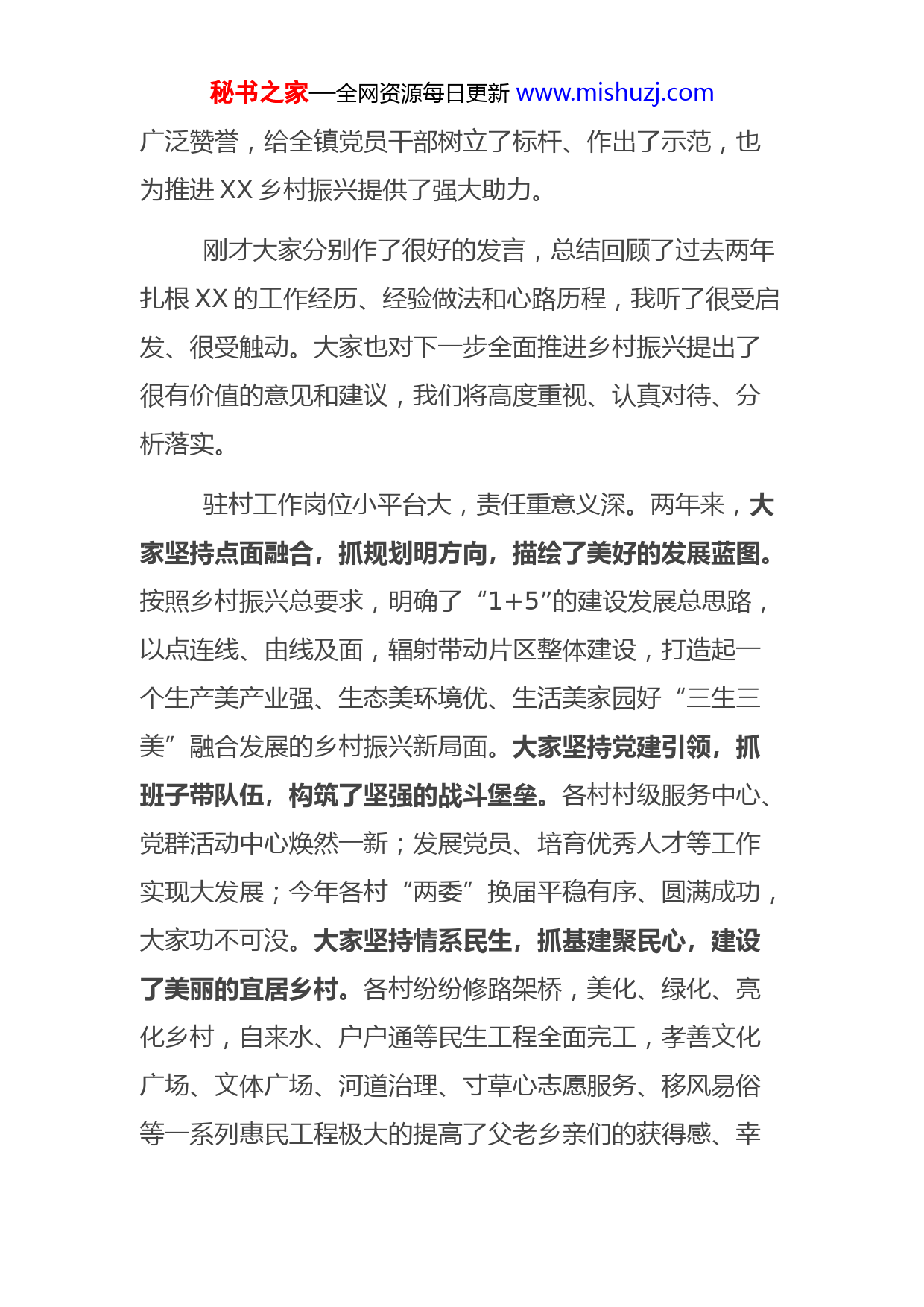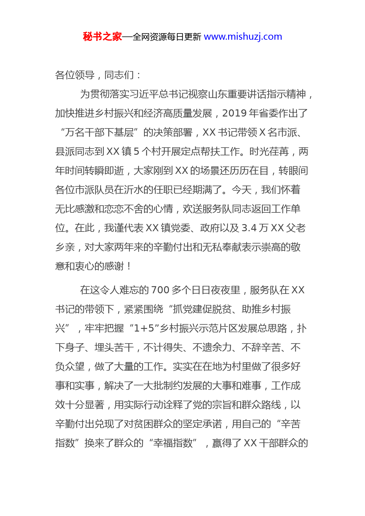 秘书之家—全网资源每日更新www.mishuzj.com各位领导,同志们:为贯彻落实习近平总书记视察山东重要讲话指示精神,加快推进乡村振兴和经济高质量发展,2019年省委作出了“万名干部下基层”的决策部署,XX书记带领X名市派、县派同志到XX镇5个村开展定点帮扶工作。时光荏苒,两年时间转瞬即逝,大家刚到XX的场景还历历在目,转眼间各位市派队员在沂水的任职已经期满了。今天,我们怀着无比感激和恋恋不舍的心情,欢送服务队同志返回工作单位。在此,我谨代表XX镇党委、政府以及3.4万XX父老乡亲,对大家两年来的辛勤付出和无私奉献表示崇高的敬意和衷心的感谢!在这令人难忘的700多个日日夜夜里,服务队在XX书记的带领下,紧紧围绕“抓党建促脱贫、助推乡村振兴”,牢牢把握“1+5”乡村振兴示范片区发展总思路,扑下身子、埋头苦干,不计得失、不遗余力、不辞辛苦、不负众望,做了大量的工作。实实在在地为村里做了很多好事和实事,解决了一大批制约发展的大事和难事,工作成效十分显著,用实际行动诠释了党的宗旨和群众路线,以辛勤付出兑现了对贫困群众的坚定承诺,用自己的“辛苦指数”换来了群众的“幸福指数”,赢得了XX干部群众的秘书之家—全网资源每日更新www.mishuzj.com广泛赞誉,给全镇党员干部树立了标杆、作出了示范,也为推进XX乡村振兴提供了强大助力。刚才大家分别作了很好的发言,总结回顾了过去两年扎根XX的工作经历、经验做法和心路历程,我听了很受启发、很受触动。大家也对下一步全面推进乡村振兴提出了很有价值的意见和建议,我们将高度重视、认真对待、分析落实。驻村工作岗位小平台大,责任重意义深。两年来,大家坚持点面融合,抓规划明方向,描绘了美好的发展蓝图。按照乡村振兴总要求,明确了“1+5”的建设发展总思路,以点连线、由线及面,辐射带动片区整体建设,打造起一个生产美产业强、生态美环境优、生活美家园好“三生三美”融合发展的乡村振兴新局面。大家坚持党建引领,抓班子带队伍,构筑了坚强的战斗堡垒。各村村级服务中心、党群活动中心焕然一新;发展党员、培育优秀人才等工作实现大发展;今年各村“两委”换届平稳有序、圆满成功,大家功不可没。大家坚持情系民生,抓基建聚民心,建设了美丽的宜居乡村。各村纷纷修路架桥,美化、绿化、亮化乡村,自来水、户户通等民生工程全面完工,孝善文化广场、文体广场、河道治理、寸草心志愿服务、移风易俗等一系列惠民工程极大的提高了父老乡亲们的获得感、幸秘书之家—全网资源每日更新www.mishuzj.com福感和满意度。大家坚持项目带动,抓项目促产业,提供了广阔的致富门路。空中草莓温室大棚、温室葡萄种植大棚、XX旅游综合服务中心、精品民宿、穿越丛林户外体验项目等等,为XX经济社会发展和村级增收注入了新动能。还有很多成绩,群众都看在眼里、记在心里,我就不一一列举了。俗话说,“前人栽树,后人乘凉”“吃水不忘挖井人”,你们的功劳印记在XX的一山一水、一街一巷、一桥一路、一草一木,也必将永远铭刻在XX的功劳碑上。一段驻村路、一次沂蒙行、一生XX情。俗话说“天下没有不散的筵席”,此刻的分别,是为了日后更美好的相遇。服务队有撤离的一天,但在我们服务队帮扶下建强的党组织、培养的带头人,将是一支永远“不走的服务队”,将继续带领群众向着更加美好的明天奋勇前进。诗在XX,何必远方;无论来自何方,XX就是故乡。将来,希望大家无论走到哪里、身处何方,都要继续时刻牵挂XX、关注XX、支持XX,把XX作为“第二故乡”,持续支持乡村振兴工作;当好“专家顾问”,继续支持基层的发展和建设,多提宝贵意见和建议;当好“沟通桥梁”,继续发挥在各领域各部门的政策优势、资源优势和人脉关系,积极给予XX资源倾斜和政策支持;当好“宣传大使”,积极向外界推介大美XX,吸引更多的人到XX来秘书之家—全网资源每日更新www.mishuzj.com旅游、投资;也衷心期盼各位以后多回来指导工作,常回家看看。最后,再次向在座的各位市派队员表示衷心感谢!希望大家回去后,在各自的工作岗位上创造新的业绩,实现新的作为!祝愿大家工作顺利、身体健康、阖家幸福、万事如意!谢谢大家!
