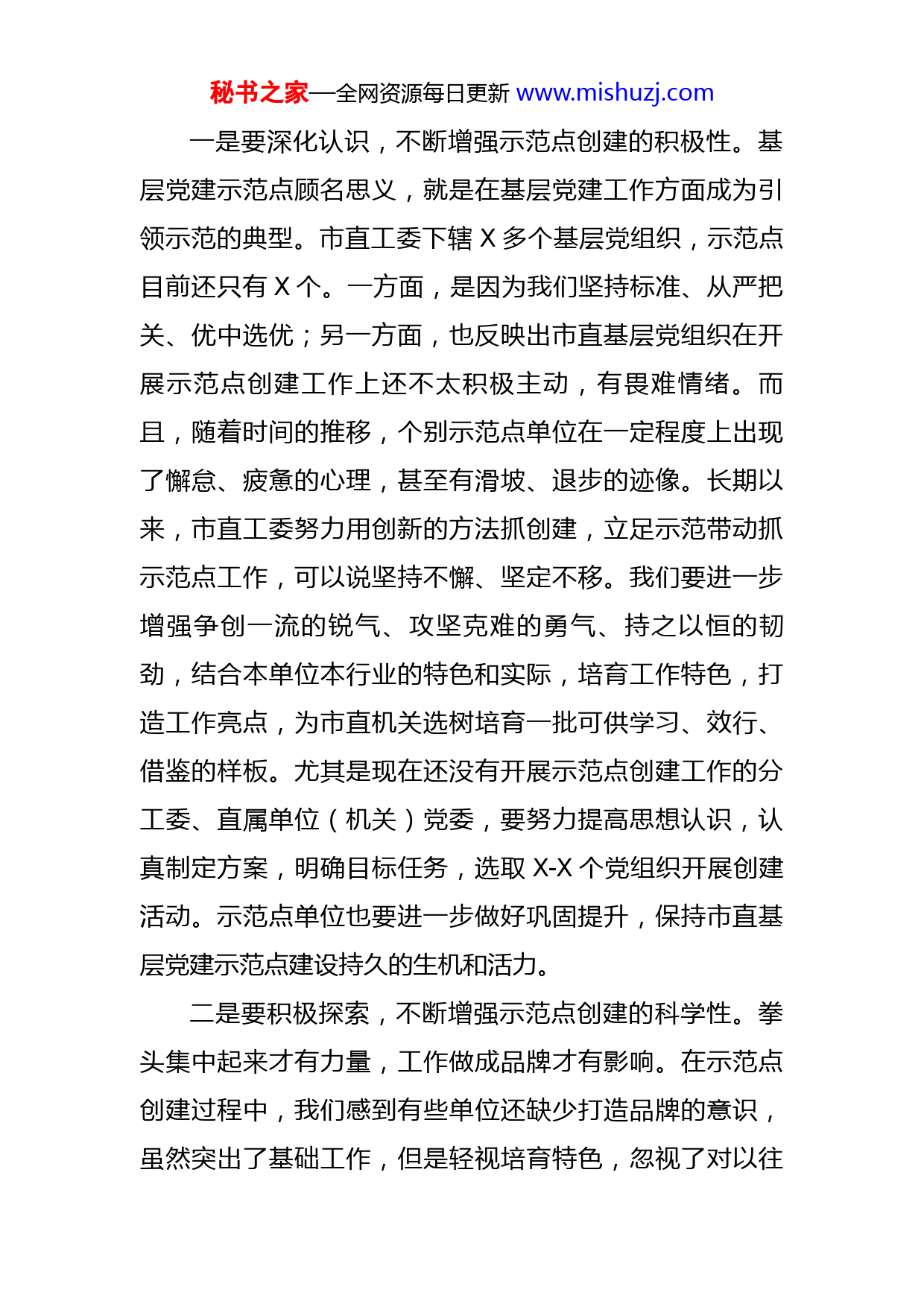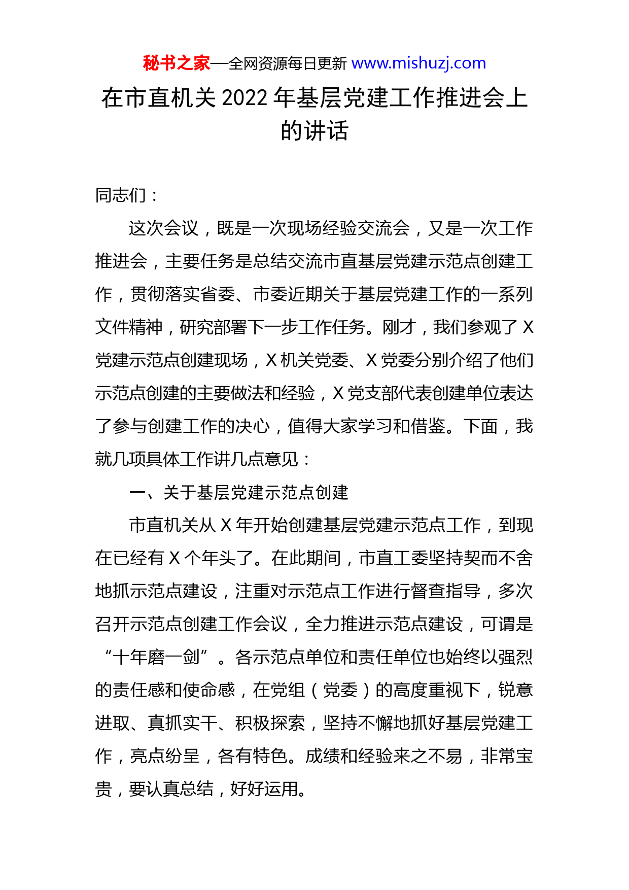 秘书之家—全网资源每日更新www.mishuzj.com在市直机关2022年基层党建工作推进会上的讲话同志们:这次会议,既是一次现场经验交流会,又是一次工作推进会,主要任务是总结交流市直基层党建示范点创建工作,贯彻落实省委、市委近期关于基层党建工作的一系列文件精神,研究部署下一步工作任务。刚才,我们参观了X党建示范点创建现场,X机关党委、X党委分别介绍了他们示范点创建的主要做法和经验,X党支部代表创建单位表达了参与创建工作的决心,值得大家学习和借鉴。下面,我就几项具体工作讲几点意见:一、关于基层党建示范点创建市直机关从X年开始创建基层党建示范点工作,到现在已经有X个年头了。在此期间,市直工委坚持契而不舍地抓示范点建设,注重对示范点工作进行督查指导,多次召开示范点创建工作会议,全力推进示范点建设,可谓是“十年磨一剑”。各示范点单位和责任单位也始终以强烈的责任感和使命感,在党组(党委)的高度重视下,锐意进取、真抓实干、积极探索,坚持不懈地抓好基层党建工作,亮点纷呈,各有特色。成绩和经验来之不易,非常宝贵,要认真总结,好好运用。秘书之家—全网资源每日更新www.mishuzj.com一是要深化认识,不断增强示范点创建的积极性。基层党建示范点顾名思义,就是在基层党建工作方面成为引领示范的典型。市直工委下辖X多个基层党组织,示范点目前还只有X个。一方面,是因为我们坚持标准、从严把关、优中选优;另一方面,也反映出市直基层党组织在开展示范点创建工作上还不太积极主动,有畏难情绪。而且,随着时间的推移,个别示范点单位在一定程度上出现了懈怠、疲惫的心理,甚至有滑坡、退步的迹像。长期以来,市直工委努力用创新的方法抓创建,立足示范带动抓示范点工作,可以说坚持不懈、坚定不移。我们要进一步增强争创一流的锐气、攻坚克难的勇气、持之以恒的韧劲,结合本单位本行业的特色和实际,培育工作特色,打造工作亮点,为市直机关选树培育一批可供学习、效行、借鉴的样板。尤其是现在还没有开展示范点创建工作的分工委、直属单位(机关)党委,要努力提高思想认识,认真制定方案,明确目标任务,选取X-X个党组织开展创建活动。示范点单位也要进一步做好巩固提升,保持市直基层党建示范点建设持久的生机和活力。二是要积极探索,不断增强示范点创建的科学性。拳头集中起来才有力量,工作做成品牌才有影响。在示范点创建过程中,我们感到有些单位还缺少打造品牌的意识,虽然突出了基础工作,但是轻视培育特色,忽视了对以往秘书之家—全网资源每日更新www.mishuzj.com做法的总结和提炼。有的单位搞示范点建设投入了不少人力、物力和财力,但能给人留下深刻印象的突出成绩和工作亮点并不多,缺少真正能给人看、让人学的东西。所以说我们必须改变“均匀用力”的工作方法,不仅要整体工作推得开、有成效,更要在一、两项重点工作上求突破、有亮点。同时,我们鼓励创新抓示范点建设,并不是要求大家经常换频道,每年都搞新花样。创新不是简单的全盘否定、推倒重来,有破有立是创新,继承发展也是创新;做到“人无我有”是创新,做到“人有我优”也是创新。示范点建设要取得创新成果,要对其他单位形成示范效应,就必须善于从原始的工作资料和具体的创新举措中捕捉亮点、发现特色、总结经验、探索规律,并归纳形成系统的、完整的、在面上具有普遍指导意义和推广价值的创新成果。过来我们示范点工作已经积累了许多宝贵的经验,比如市规划局确立了“三个示范齐创共建”的目标定位跟进法;市人防办的“三个三人防大讲台”党员学习模式;市地税局的“党建工作例会制、党建目标考核制、活动载体特色制”推进法等等。下一步要对这些好的经验做法作进一步提炼和升华,使之系统化、规范化、科学化,使其他单位有借鉴、有启发、有促进。三是要着力带动,不断增强示范点创建的辐射性。创建基层党建示范点的目的,就是通过规范化建设,培育一秘书之家—全网资源每日更新www.mishuzj.com批基层党组织的样板,运用典型示范带动作用,推动面上整体党建工作水平的提升。不仅要“独善其身”,更要“兼济天下”,这是示范点的责任所在、使命所系。各示范点单位必须树立开明开放的观念,破除狭隘保守的思想,主动把自己的好经验、好做法贡献出来,让大家分享、共同受益。示范点单位与工委、示范点单位相互之间要加强沟通和交流,要鼓励示范点与其他基层党组织“结对结亲”,实现示范点创建成果的多重利用和资源共享,注重示范成果的推广运用,在本行业系统甚至更广的范围形成强有力的辐射,做到墙内开花墙内墙外都飘香,带动本系统本行业基层党组织普遍提高、晋位升级,真正在市直机关形成“抓创建促党建、以示范带全盘”的良好工作局面。二、关于民主评议党员近年来,我们虽然在民主评议党员方面做了一些工作,但是,仍还存在着走过场、搞应付的现象,处置不合格党员工作还存在失之于宽、失之于松、失之于软的现象,致使一些不合格党员仍然滞留在党内,损害了党员队伍的形象,削弱了党组织的战斗力。在工作中,大家还要坚持做到“四个结合”:1、要坚持党内评议与群众参与相结合。如果仅靠党员评议,处置不合格党员工作就难免带来一定的局限性,同秘书