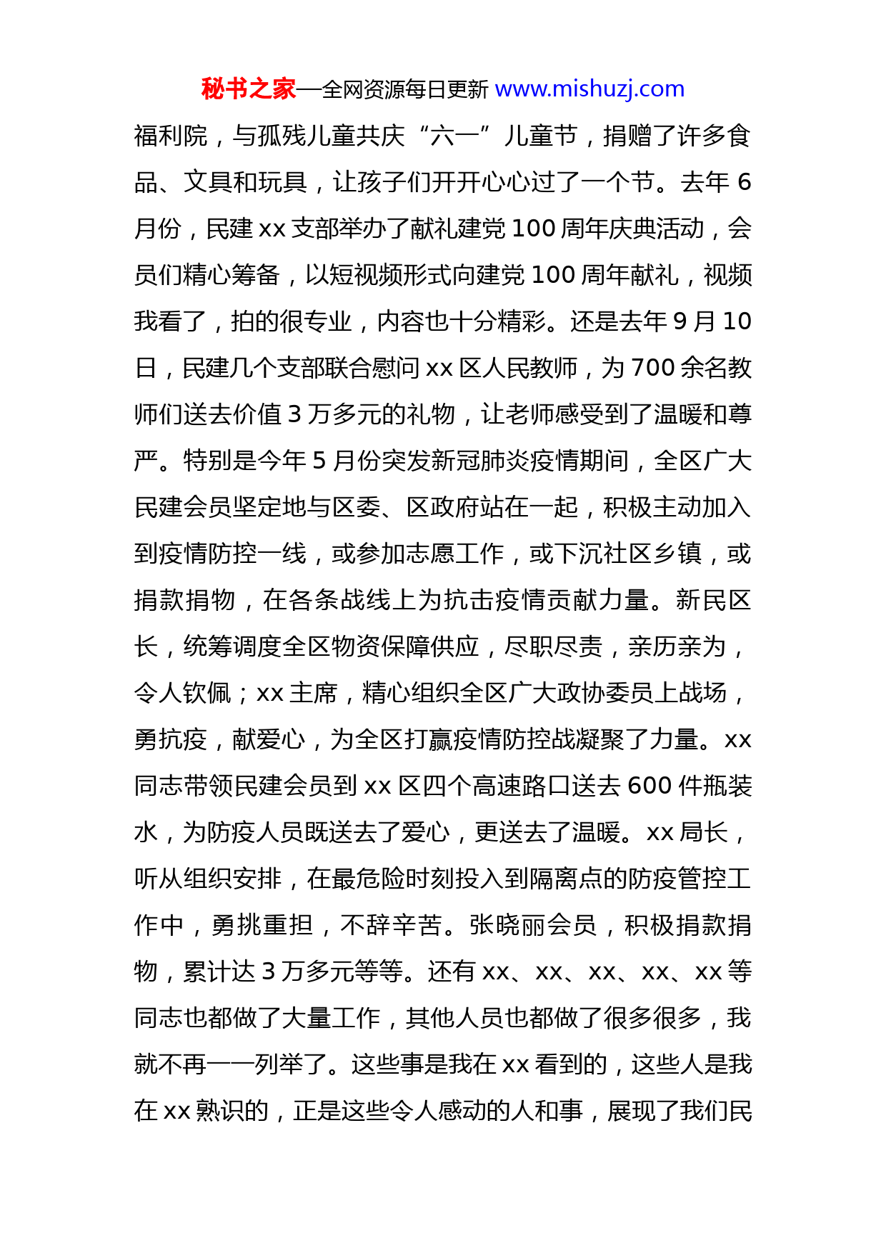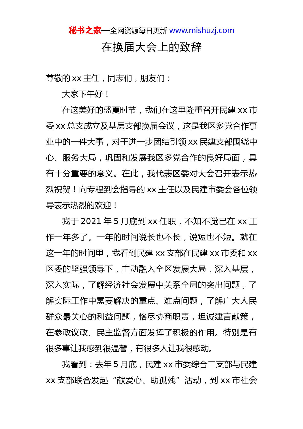 秘书之家—全网资源每日更新www.mishuzj.com在换届大会上的致辞尊敬的xx主任,同志们,朋友们:大家下午好!在这美好的盛夏时节,我们在这里隆重召开民建xx市委xx总支成立及基层支部换届会议,这是我区多党合作事业中的一件大事,对于进一步团结引领xx民建支部围绕中心、服务大局,巩固和发展我区多党合作的良好局面,具有十分重要的意义。在此,我代表区委对大会召开表示热烈祝贺!向专程到会指导的xx主任以及民建市委会各位领导表示热烈的欢迎!我于2021年5月底到xx任职,不知不觉已在xx工作一年多了。一年的时间说长也不长,说短也不短。就在这一年的时间里,我看到民建xx支部在民建xx市委和xx区委的坚强领导下,主动融入全区发展大局,深入基层,深入实际,了解经济社会发展中关系全局的突出问题,了解实际工作中需要解决的重点、难点问题,了解广大人民群众最关心的利益问题,恪尽协商职责,坦诚建言献策,在参政议政、民主监督方面发挥了积极的作用。特别是有很多事让我感到很温馨,有很多人让我很感动。我看到:去年5月底,民建xx市委综合二支部与民建xx支部联合发起“献爱心、助孤残”活动,到xx市社会秘书之家—全网资源每日更新www.mishuzj.com福利院,与孤残儿童共庆“六一”儿童节,捐赠了许多食品、文具和玩具,让孩子们开开心心过了一个节。去年6月份,民建xx支部举办了献礼建党100周年庆典活动,会员们精心筹备,以短视频形式向建党100周年献礼,视频我看了,拍的很专业,内容也十分精彩。还是去年9月10日,民建几个支部联合慰问xx区人民教师,为700余名教师们送去价值3万多元的礼物,让老师感受到了温暖和尊严。特别是今年5月份突发新冠肺炎疫情期间,全区广大民建会员坚定地与区委、区政府站在一起,积极主动加入到疫情防控一线,或参加志愿工作,或下沉社区乡镇,或捐款捐物,在各条战线上为抗击疫情贡献力量。新民区长,统筹调度全区物资保障供应,尽职尽责,亲历亲为,令人钦佩;xx主席,精心组织全区广大政协委员上战场,勇抗疫,献爱心,为全区打赢疫情防控战凝聚了力量。xx同志带领民建会员到xx区四个高速路口送去600件瓶装水,为防疫人员既送去了爱心,更送去了温暖。xx局长,听从组织安排,在最危险时刻投入到隔离点的防疫管控工作中,勇挑重担,不辞辛苦。张晓丽会员,积极捐款捐物,累计达3万多元等等。还有xx、xx、xx、xx、xx等同志也都做了大量工作,其他人员也都做了很多很多,我就不再一一列举了。这些事是我在xx看到的,这些人是我在xx熟识的,正是这些令人感动的人和事,展现了我们民秘书之家—全网资源每日更新www.mishuzj.com建xx广大会员的良好精神风貌,展现了大家围绕中心、服务大局的政治站位,展现了民建作为参政党的良好形象,也赢得了社会各界的广泛赞誉。借此机会,我代表区委和区委统战部,向长期以来关心我区发展的民建市委会领导和为我区经济社会发展做出突出贡献的民建广大会员,表示衷心的感谢并致以崇高的敬意!今天是民建xx市委xx总支成立及基层支部换届的大日子,借此机会,向大家提三点希望:一是深化政治交接。思想政治建设是参政党自身建设的核心和灵魂。大家要把迎接党的二十大作为贯穿各项工作的主线,深入学习贯彻习近平新时代中国特色社会主义思想,牢固树立“四个意识”,坚定“四个自信”,做到“两个维护”,不断提高履职能力和水平。要把践行“同心”思想自觉融入推进自身工作实践中,坚持与中共xx区委在思想上同心同德、目标上同心同向、行动上同心同行,务实奋进,主动作为,切实巩固多党合作的政治基础,全力营造健康和谐的政治生态。二是紧扣发展第一要务。xx要实现高质量发展,单靠区委、区政府“千里走单骑”是不行的,必须最大限度凝聚大家的共识、人心、智慧与力量。大家要充分发挥党派参政议政的职能作用,切实把服务xx发展作为第一要务。今年,我们围绕全区中心工作,组织开展了“四个一”行秘书之家—全网资源每日更新www.mishuzj.com动,大家一定要抓好落实,在力所能及范围内,多建睿智之言,多献务实之策,多进发展之力,为加快建设经济强区、美丽xx作出新的更大贡献。三是积极促进社会和谐。xx作为首都的政治护城河,大家要把维护稳定、促进和谐作为一项重要政治任务,协助区委、政府多做沟通思想、凝聚人心的工作,注意把握與情民意,及时反映群众诉求,多进和谐之言、多做和谐之事、多谋和谐之策,积极参与社会管理创新,着力化解社会矛盾,促进一批难点热点问题的协调解决,以实际行动迎接中共二十大胜利召开。万里云天万里路,展翅凌云正当时。最后,祝民建xx市委xx总支及基层支部在新的起点上,实现更大作为。祝在座各位领导、各位朋友,身体健康,工作顺利,万事顺意!谢谢大家!