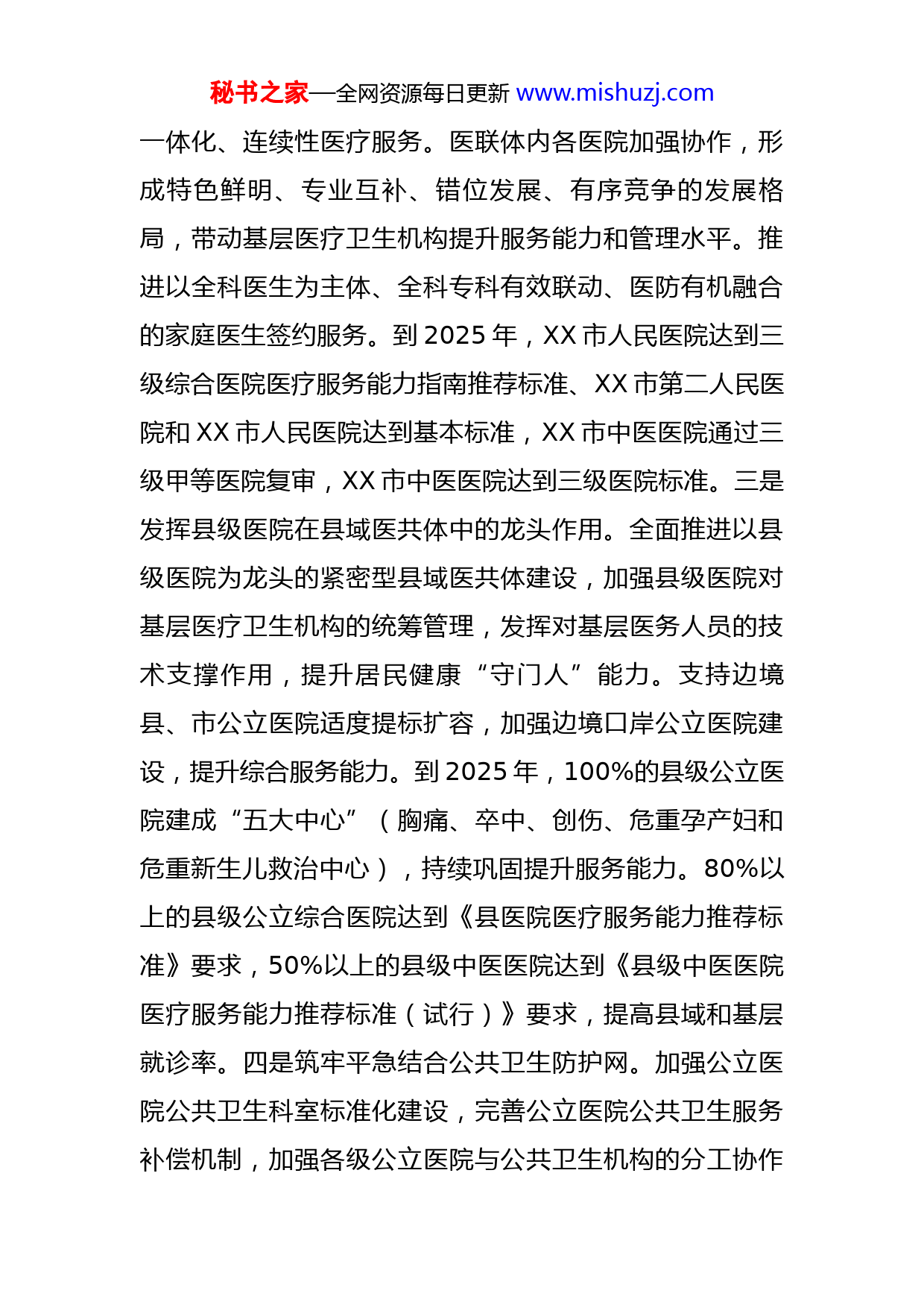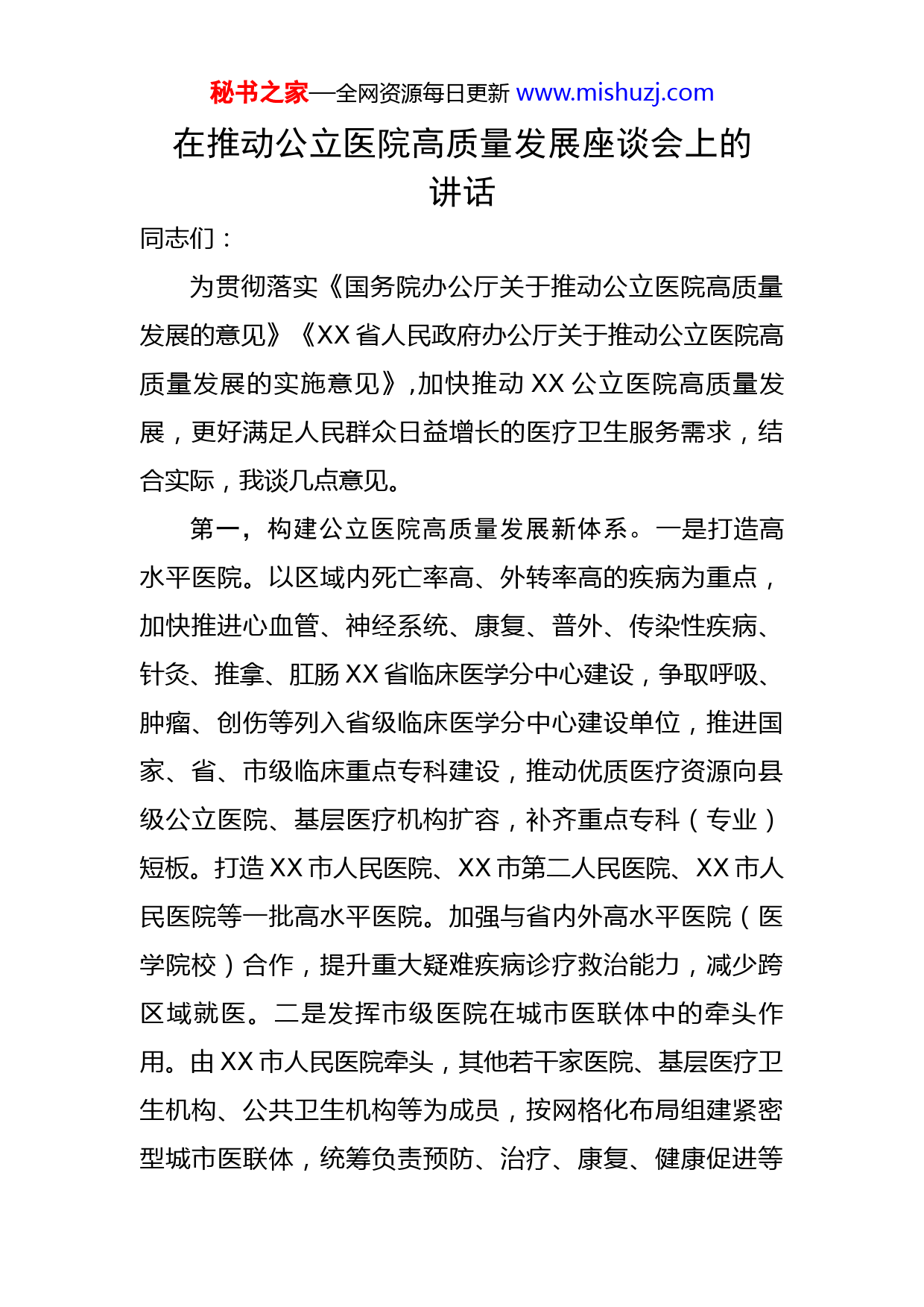 秘书之家—全网资源每日更新www.mishuzj.com在推动公立医院高质量发展座谈会上的讲话同志们:为贯彻落实《国务院办公厅关于推动公立医院高质量发展的意见》《XX省人民政府办公厅关于推动公立医院高质量发展的实施意见》,加快推动XX公立医院高质量发展,更好满足人民群众日益增长的医疗卫生服务需求,结合实际,我谈几点意见。第一,构建公立医院高质量发展新体系。一是打造高水平医院。以区域内死亡率高、外转率高的疾病为重点,加快推进心血管、神经系统、康复、普外、传染性疾病、针灸、推拿、肛肠XX省临床医学分中心建设,争取呼吸、肿瘤、创伤等列入省级临床医学分中心建设单位,推进国家、省、市级临床重点专科建设,推动优质医疗资源向县级公立医院、基层医疗机构扩容,补齐重点专科(专业)短板。打造XX市人民医院、XX市第二人民医院、XX市人民医院等一批高水平医院。加强与省内外高水平医院(医学院校)合作,提升重大疑难疾病诊疗救治能力,减少跨区域就医。二是发挥市级医院在城市医联体中的牵头作用。由XX市人民医院牵头,其他若干家医院、基层医疗卫生机构、公共卫生机构等为成员,按网格化布局组建紧密型城市医联体,统筹负责预防、治疗、康复、健康促进等秘书之家—全网资源每日更新www.mishuzj.com一体化、连续性医疗服务。医联体内各医院加强协作,形成特色鲜明、专业互补、错位发展、有序竞争的发展格局,带动基层医疗卫生机构提升服务能力和管理水平。推进以全科医生为主体、全科专科有效联动、医防有机融合的家庭医生签约服务。到2025年,XX市人民医院达到三级综合医院医疗服务能力指南推荐标准、XX市第二人民医院和XX市人民医院达到基本标准,XX市中医医院通过三级甲等医院复审,XX市中医医院达到三级医院标准。三是发挥县级医院在县域医共体中的龙头作用。全面推进以县级医院为龙头的紧密型县域医共体建设,加强县级医院对基层医疗卫生机构的统筹管理,发挥对基层医务人员的技术支撑作用,提升居民健康“守门人”能力。支持边境县、市公立医院适度提标扩容,加强边境口岸公立医院建设,提升综合服务能力。到2025年,100%的县级公立医院建成“五大中心”(胸痛、卒中、创伤、危重孕产妇和危重新生儿救治中心),持续巩固提升服务能力。80%以上的县级公立综合医院达到《县医院医疗服务能力推荐标准》要求,50%以上的县级中医医院达到《县级中医医院医疗服务能力推荐标准(试行)》要求,提高县域和基层就诊率。四是筑牢平急结合公共卫生防护网。加强公立医院公共卫生科室标准化建设,完善公立医院公共卫生服务补偿机制,加强各级公立医院与公共卫生机构的分工协作秘书之家—全网资源每日更新www.mishuzj.com和业务融合。持续强化医院感染防控管理。健全分级、分层、分流、中西医协同的重大疫情救治体系。建设XX市人民医院、XX市人民医院等重大疫情救治基地,承担危重症患者集中救治和应急物资集中储备任务。推进中医疫病防治基地建设,提高中医药应急救治能力。市级和XX市完成传染病医院建设,县级公立综合医院完成相对独立的传染病区建设。支持边境地区公立医院储备一定规模可迅速转换的传染病房、重症病房、医疗物资和人力资源。创新医防协同机制,建立人员通、信息通、资源通和监督监管相互制约的机制。第二、引领公立医院高质量发展新趋势。一是加强临床专科建设。针对严重影响XX健康水平的主要疾病,提升各级公立医院心脑血管、呼吸、肿瘤、消化、重症、急诊、感染等核心专科能力,夯实麻醉、影像、病理和检验等支撑专科基础。加强县级公立综合医院口腔、康复、精神、眼科、老年病科专科能力提升,落实好政府惠民实事。做优做强骨伤、肛肠、针灸、妇科、儿科等中医传统优势专科。加强急救中心(急救站)院前急救服务能力,提升医院急诊急救医疗服务能力,降低意外伤害住院外转率、致残率和致死率。加大老年医学科建设力度,提高老年疾病诊疗水平,满足老年人就医需求,提高服务供给和社会资源投入,发展安宁疗护建设,完善医养结合终末生秘书之家—全网资源每日更新www.mishuzj.com命医疗环节。有计划地加强临床重点专科分层分类建设,以专科发展带动诊疗能力提升,提高医疗服务同质化水平。二是提高医学技术创新能力。提升高水平临床医疗水平,加强医学应用基础研究和临床研究,鼓励开展新技术、新产品、中医先进设备、中药新药创制研究,促进新技术进入临床使用。推动科技成果转化,所获收益主要用于奖励作出重要贡献的人员。三是不断拓展创新医疗服务模式。优化服务流程,推行分时段预约诊疗和检查检验集中预约服务,开展诊间(床旁)结算、检验检查结果互认等服务。开设多学科诊疗门诊,建立多学科联合诊疗和查房制度。逐步扩大日间手术范围,提高日间手术占择期手术的比例。二级及以上公立医院实现优质护理服务全覆盖,实施责任制整体护理,鼓励开展延续护理服务。开设合理用药咨询或药物治疗管理门诊,引导优质药学服务向基层延伸。完善院前急救网络,探索院前急救机构与“五大中心”信息实时交换,提升急救效率与能力。推广中医综合诊疗模式、多专业一体化诊疗模式、全链条服务模式,实施重大疑难疾病中西医协作