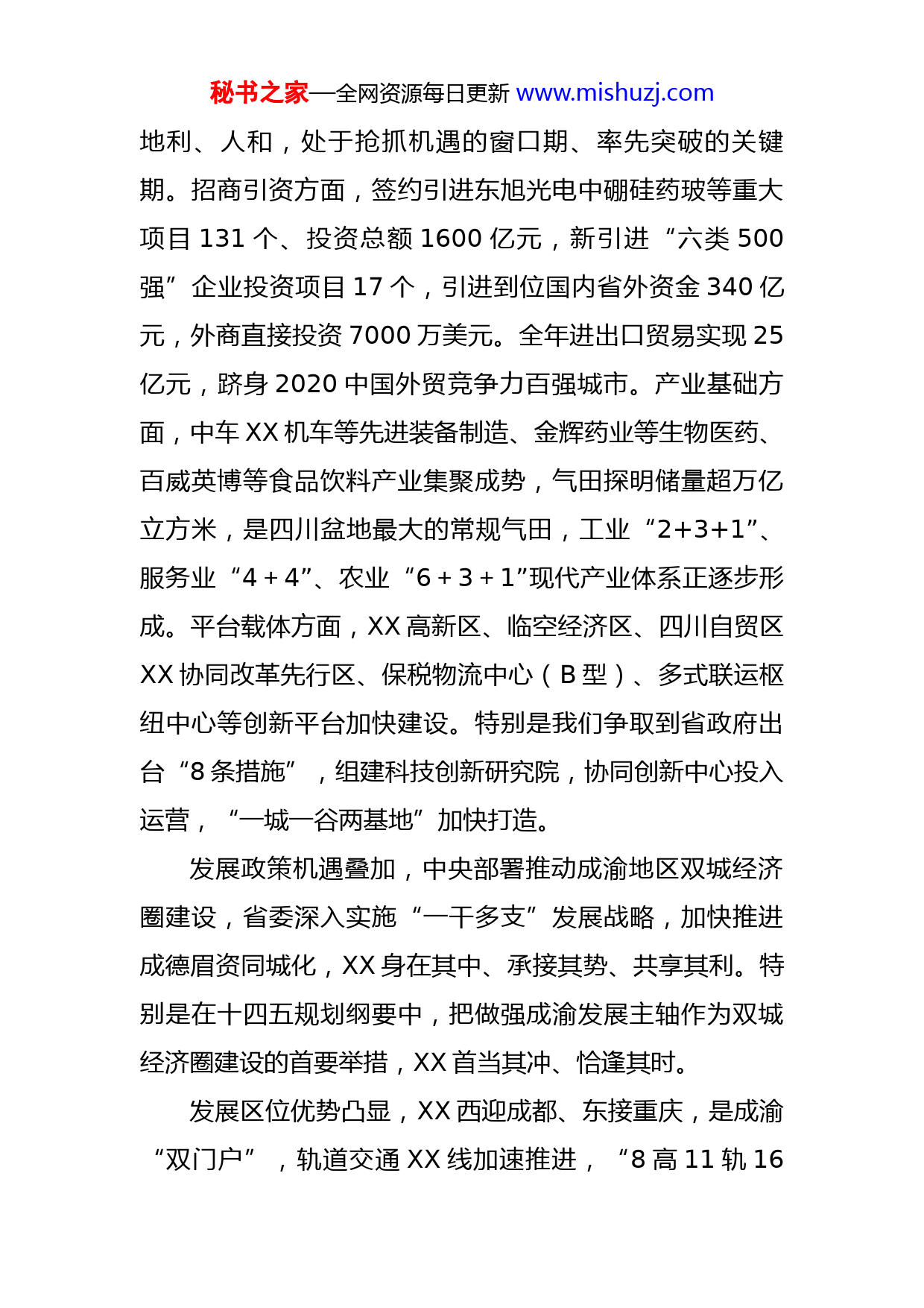 秘书之家—全网资源每日更新www.mishuzj.com在政协分组讨论上的讲话各位委员,同志们:非常高兴参加政协委员第八小组(群团、科协、驻资部队、社会福利界别和各民主党派、宗教)讨论,与委员们一道共话XX发展大计。刚才,听了各位委员的发言,我很受启发,也深受鼓舞。一直以来,市政协和各位委员对政府工作给予有力支持和充分理解,尤其是对一些专项工作提出了很好地建议和推动!这里,我代表市政府,对市政协及各位委员表示衷心的感谢!下面,我谈几点体会。一、XX发展令人振奋过去半年,市委市政府团结带领全市干部群众,锐意进取、攻坚克难,面对宏观经济下行、新冠疫情等困难和挑战,积极应对、有针对性地实施了一系列政策措施,经受了增速换挡、转型提质的考验,保持了“总体平稳、稳中有进”的发展态势,各项事业取得了新进展。可以说,成绩令我们倍感鼓舞和振奋。我们身在其中、干在其中、感受在其中。发展态势强劲,在市委市政府坚强领导下,全市上下克难攻坚、励精图治,今年预计GDP900亿,增长9%,成资同城化加速突破,融入成渝双城经济圈开局起势,全市上下人心思齐、人心思进、人心思干。XX当前可谓天时、秘书之家—全网资源每日更新www.mishuzj.com地利、人和,处于抢抓机遇的窗口期、率先突破的关键期。招商引资方面,签约引进东旭光电中硼硅药玻等重大项目131个、投资总额1600亿元,新引进“六类500强”企业投资项目17个,引进到位国内省外资金340亿元,外商直接投资7000万美元。全年进出口贸易实现25亿元,跻身2020中国外贸竞争力百强城市。产业基础方面,中车XX机车等先进装备制造、金辉药业等生物医药、百威英博等食品饮料产业集聚成势,气田探明储量超万亿立方米,是四川盆地最大的常规气田,工业“2+3+1”、服务业“4+4”、农业“6+3+1”现代产业体系正逐步形成。平台载体方面,XX高新区、临空经济区、四川自贸区XX协同改革先行区、保税物流中心(B型)、多式联运枢纽中心等创新平台加快建设。特别是我们争取到省政府出台“8条措施”,组建科技创新研究院,协同创新中心投入运营,“一城一谷两基地”加快打造。发展政策机遇叠加,中央部署推动成渝地区双城经济圈建设,省委深入实施“一干多支”发展战略,加快推进成德眉资同城化,XX身在其中、承接其势、共享其利。特别是在十四五规划纲要中,把做强成渝发展主轴作为双城经济圈建设的首要举措,XX首当其冲、恰逢其时。发展区位优势凸显,XX西迎成都、东接重庆,是成渝“双门户”,轨道交通XX线加速推进,“8高11轨16秘书之家—全网资源每日更新www.mishuzj.com快”综合交通体系加快构建,已经实现“县县三高速”,即将实现“县县双高铁”,是四川综合交通网络最密、离天府国际机场最近、通达地铁最早、同享成渝双核辐射最多的地级市。随着天府国际机场建成投运和成都东部新区的建设推进,成资同城化发展必将加快进程,XX也将迎来“借机起飞”的临空时代。二、勇担使命追赶跨越政府报告指出,未来五年,我们要围绕建设“成渝门户枢纽、临空新兴城市”总体定位,坚决贯彻“首位战略”,以实现“五个提升”为目标,以打造“五个城市”为支撑,以“五个聚焦”为抓手,勇担使命、追赶跨越,全力推动XX高质量发展。追赶跨越是干出来、拼出来、快出来的。XX要实现追赶跨越,就是要干字当头、实字为要、快字为先。推动XX发展没有旁观者、没有局外人,我们各位委员也责无旁贷、义不容辞。要立足本职干。追赶跨越,各级各部门、各行业都是主战场,人人都是参与者、责任人,大家要坚定当好开拓者、主攻手、实干家。我们要切实把思想和行动统一到大会确定的发展思路上来,把智慧和力量凝聚到追赶跨越的具体行动中去,瞄准目标要求,对照职能职责、对照工作部署、对照任务标准,把部门的职责一样一样尽到、把手头的工作一件一件完成、把落下的进度一点一点赶上,以秘书之家—全网资源每日更新www.mishuzj.com高度负责的精神、高度尽责的担当为XX发展添砖加瓦。要盯着落实抓。一分部署,九分落实。不抓落实,再好的“蓝图”也只是一纸空文。天宝书记提出了追赶跨越要聚焦的“8个重点”,大家要盯紧重点关键,主动认领、主动担当、主动推进,对涉及本部门的工作任务,要逐项梳理、逐项研究、逐项细化,逐一落实到具体项目上、落实到具体工作上、落实到具体人头上,该牵头的牵头,该配合的配合,形成狠抓落实、大抓落实、快抓落实的强大合力,真正把目标变为行动、把蓝图变为现实。要奔着结果去。我经常说,抓落实的关键是看结果,这个结果就是实绩、就是效果、就是变化。市级部门要奔着结果去,就是要用数据的对比说话、用位次的上升说话、用项目的形象说话、用投资的增幅说话、用产业的增量说话、用面貌的改变说话、用群众的感受说话,推动XX发展总量更大、结构更优、质量更高、效益更好。三、凝心聚力助推发展和大家的感受一样,我觉得政府工作报告是一个统揽全局、目标明确、路径清晰的好报告,是一个统一思想、凝心聚力、斗志昂扬的好报告。与时代要求相契合、与XX人民期待相吻合、与XX实际相符合,是XX当前和今后一个时期的科学指南和行动总纲。只要我们不折腾、不偏移、不懈怠,全市上下一盘棋、一条心、一股劲,XX人民秘书之家—全网