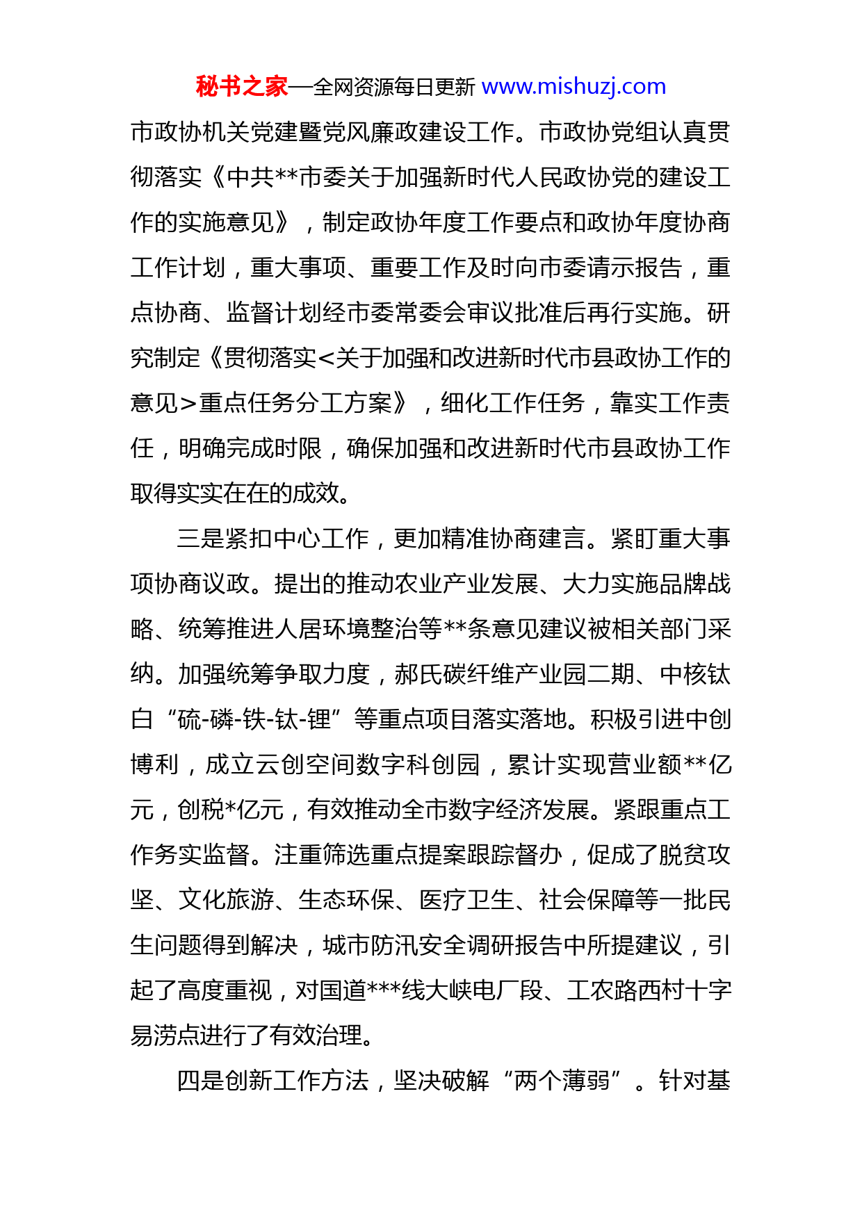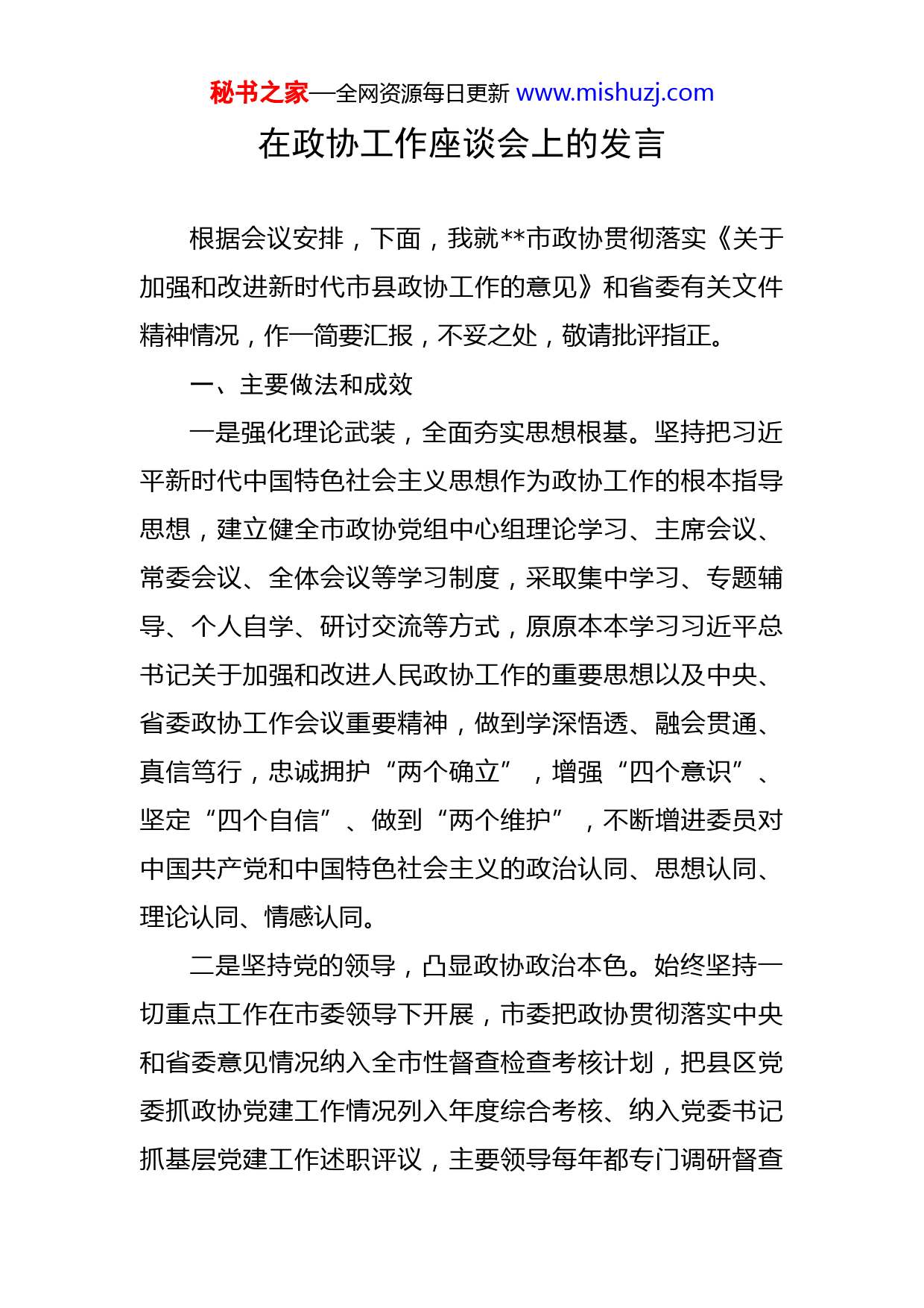 秘书之家—全网资源每日更新www.mishuzj.com在政协工作座谈会上的发言根据会议安排,下面,我就市政协贯彻落实《关于加强和改进新时代市县政协工作的意见》和省委有关文件精神情况,作一简要汇报,不妥之处,敬请批评指正。一、主要做法和成效一是强化理论武装,全面夯实思想根基。坚持把习近平新时代中国特色社会主义思想作为政协工作的根本指导思想,建立健全市政协党组中心组理论学习、主席会议、常委会议、全体会议等学习制度,采取集中学习、专题辅导、个人自学、研讨交流等方式,原原本本学习习近平总书记关于加强和改进人民政协工作的重要思想以及中央、省委政协工作会议重要精神,做到学深悟透、融会贯通、真信笃行,忠诚拥护“两个确立”,增强“四个意识”、坚定“四个自信”、做到“两个维护”,不断增进委员对中国共产党和中国特色社会主义的政治认同、思想认同、理论认同、情感认同。二是坚持党的领导,凸显政协政治本色。始终坚持一切重点工作在市委领导下开展,市委把政协贯彻落实中央和省委意见情况纳入全市性督查检查考核计划,把县区党委抓政协党建工作情况列入年度综合考核、纳入党委书记抓基层党建工作述职评议,主要领导每年都专门调研督查秘书之家—全网资源每日更新www.mishuzj.com市政协机关党建暨党风廉政建设工作。市政协党组认真贯彻落实《中共市委关于加强新时代人民政协党的建设工作的实施意见》,制定政协年度工作要点和政协年度协商工作计划,重大事项、重要工作及时向市委请示报告,重点协商、监督计划经市委常委会审议批准后再行实施。研究制定《贯彻落实<关于加强和改进新时代市县政协工作的意见>重点任务分工方案》,细化工作任务,靠实工作责任,明确完成时限,确保加强和改进新时代市县政协工作取得实实在在的成效。三是紧扣中心工作,更加精准协商建言。紧盯重大事项协商议政。提出的推动农业产业发展、大力实施品牌战略、统筹推进人居环境整治等条意见建议被相关部门采纳。加强统筹争取力度,郝氏碳纤维产业园二期、中核钛白“硫-磷-铁-钛-锂”等重点项目落实落地。积极引进中创博利,成立云创空间数字科创园,累计实现营业额亿元,创税亿元,有效推动全市数字经济发展。紧跟重点工作务实监督。注重筛选重点提案跟踪督办,促成了脱贫攻坚、文化旅游、生态环保、医疗卫生、社会保障等一批民生问题得到解决,城市防汛安全调研报告中所提建议,引起了高度重视,对国道线大峡电厂段、工农路西村十字易涝点进行了有效治理。四是创新工作方法,坚决破解“两个薄弱”。针对基秘书之家—全网资源每日更新www.mishuzj.com础工作薄弱实际,设立“委员工作站”“协商议事会”“协商议事室”等载体平台,通过线上交流、线下学习等形式,积极开展书香政协、委员读书活动,推进政协协商向基层延伸。市县政协每年在全体会议、专题议政性常委会会议以外,至少安排次专题协商活动,有效调动政协委员各协商议政积极性。针对人员力量薄弱实际,从党政部门特别是经济部门选任工作阅历丰富、学有专长的同志担任市政协专委会主任,增设市政协委员工作委员会、农业和农村委员会,职能配备更加合理、更加科学;增加政协机关事业机构个和编制个,先后成立事业机构研究室、网络信息中心、文史资料中心,充实增强政协机关工作力量。二、典型经验创新提出“强培训、搭平台、建制度、亮风采”工作思路,有效发挥了委员主体作用,持续推动高质量履职尽责。一是加强培训,提升履职能力。通过高校办班、党校培训、视频会议、考察学习等多种形式,先后举办政协委员履职能力提升培训班期,邀请专家学者专题辅导次,累计培训余人次,实现了七届政协委员培训全覆盖。开发手机终端等学习平台,让委员随时随地开展学习交流。组织委员到红军会宁会师旧址等红色教育基地重温革秘书之家—全网资源每日更新www.mishuzj.com命历史,扎实推进党史学习教育活动。推荐委员担任司法系统等部门的特邀监督员,让委员在履职实践中,不断提升履职本领。二是搭建平台,拓宽履职渠道。建立“智慧政协云”平台系统,让更多委员通过“云平台”发表意见建议、收集社情民意。组织委员开展重点课题调研考察,搭建“三位一体”协商平台,名住银全国、省和市政协委员全部下沉到各乡镇(街道)委员工作站,编入乡镇(街道)协商议事会,协助基层开展协商活动多次,协商解决矛盾问题余件。三是健全制度,规范履职行为。研究出台《委员履职工作规则》《委员视察考察工作简则》《反映社情民意信息工作实施细则(试行)》《委员履职服务管理办法》等制度机制,全方位搭建委员履职管理、评价考核的“四梁八柱”,规范委员履职行为。四是展示风采,激发履职热情。对履职成绩突出的委员进行表彰推优、培树典型,并在《日报》、电视台开辟专栏宣传,刊发委员履职报道期,有效激发了委员为国履职、为民尽责的工作热情。三、存在的问题及下一步打算尽管我们做了大量工作,取得了一定成绩,但是依然存在一些问题和不足,主要表现在:建言资政和凝聚共识秘书之家—全网资源每日更新www.mishuzj.com双向发力还需进一步加强,专门协商机构作用平台发挥的还不够充分,市县政协“两个薄弱”问