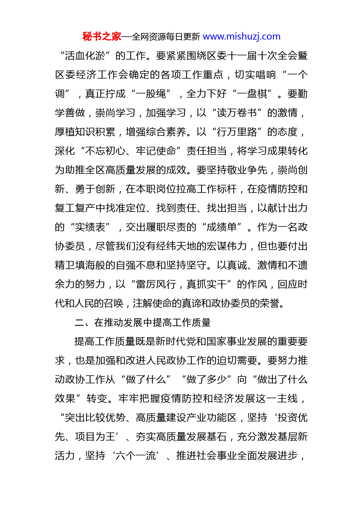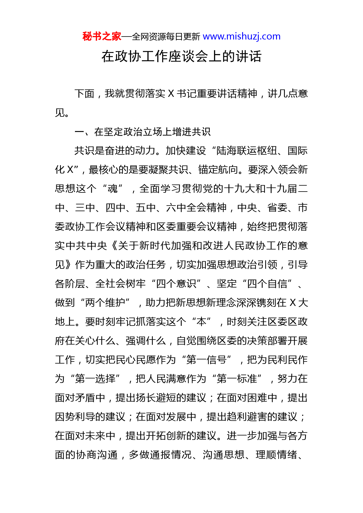 秘书之家—全网资源每日更新www.mishuzj.com在政协工作座谈会上的讲话下面,我就贯彻落实X书记重要讲话精神,讲几点意见。一、在坚定政治立场上增进共识共识是奋进的动力。加快建设“陆海联运枢纽、国际化X”,最核心的是要凝聚共识、锚定航向。要深入领会新思想这个“魂”,全面学习贯彻党的十九大和十九届二中、三中、四中、五中、六中全会精神,中央、省委、市委政协工作会议精神和区委重要会议精神,始终把贯彻落实中共中央《关于新时代加强和改进人民政协工作的意见》作为重大的政治任务,切实加强思想政治引领,引导各阶层、全社会树牢“四个意识”、坚定“四个自信”、做到“两个维护”,助力把新思想新理念深深镌刻在X大地上。要时刻牢记抓落实这个“本”,时刻关注区委区政府在关心什么、强调什么,自觉围绕区委的决策部署开展工作,切实把民心民愿作为“第一信号”,把为民利民作为“第一选择”,把人民满意作为“第一标准”,努力在面对矛盾中,提出扬长避短的建议;在面对困难中,提出因势利导的建议;在面对发展中,提出趋利避害的建议;在面对未来中,提出开拓创新的建议。进一步加强与各方面的协商沟通,多做通报情况、沟通思想、理顺情绪、秘书之家—全网资源每日更新www.mishuzj.com“活血化淤”的工作。要紧紧围绕区委十一届十次全会暨区委经济工作会确定的各项工作重点,切实唱响“一个调”,真正拧成“一股绳”,全力下好“一盘棋”。要勤学善做,崇尚学习,加强学习,以“读万卷书”的激情,厚植知识积累,增强综合素养。以“行万里路”的态度,深化“不忘初心、牢记使命”责任担当,将学习成果转化为助推全区高质量发展的成效。要坚持敬业争先,崇尚创新、勇于创新,在本职岗位拉高工作标杆,在疫情防控和复工复产中找准定位、找到责任、找出担当,以献计出力的“实绩表”,交出履职尽责的“成绩单”。作为一名政协委员,尽管我们没有经纬天地的宏谋伟力,但也要付出精卫填海般的自强不息和坚持坚守。以真诚、激情和不遗余力的努力,以“雷厉风行,真抓实干”的作风,回应时代和人民的召唤,注解使命的真谛和政协委员的荣誉。二、在推动发展中提高工作质量提高工作质量既是新时代党和国家事业发展的重要要求,也是加强和改进人民政协工作的迫切需要。要努力推动政协工作从“做了什么”“做了多少”向“做出了什么效果”转变。牢牢把握疫情防控和经济发展这一主线,“突出比较优势、高质量建设产业功能区,坚持‘投资优先、项目为王’、夯实高质量发展基石,充分激发基层新活力,坚持‘六个一流’、推进社会事业全面发展进步,秘书之家—全网资源每日更新www.mishuzj.com推进城乡基层治理制度创新和能力建设”等,真诚协商、务实监督、深入议政,坚持立改革之论、献发展之策、建维稳之言,想区委所想、帮政府所干、呼群众所盼,在各项事业发展中留下鲜明的政协“印记”。要攻难点,围绕以供给侧改革为主线,抓住疫情过后需求反弹的回补机遇和经济结构的调整机遇,在提升品质、扩大服务,改造提升传统产业,创新经营模式,发展规模经济,加快新旧动能转换,以及培育壮大新兴产业,围绕“聚集一批集产、学、研、用为一体的重点项目,发展主导产业的新技术、新业态、新模式、新要素、新材料”,以及“落地聚集一批知名供应链企业、国际贸易中介机构以及智能家电、高端装备制造、保税加工”等课题开展深度研究,加强与党派团体、专家学者和有关部门联合调研,提出中肯可行的良策,用真知灼见助力我区构建现代化产业体系,增强发展的韧劲和活力。要议大事,围绕疫情形势变化,不仅要在着眼全局上看局部,也要立足当前放眼长远,注重策略上机动灵活,善于把握主要矛盾和矛盾的主要方面,切实在履职中抓住关键、找准靶心、打准十环。围绕做好“六稳”工作、落实“六保”任务,加快成渝地区双城经济圈、成都国际铁路港经开区、成德眉资同城化、产业功能区、综保区、国际班列、国际化营商环境等重点领域、重点工作协商议政、建言献策、献计出力,助推党和国家重秘书之家—全网资源每日更新www.mishuzj.com大方针政策和区委、区政府重要工作部署得到贯彻落实。切实发挥政协智库作用,打造参政议政升级版。要抓关键,围绕如何用活用足疫情防控下财政政策和金融服务手段,激发“四区一枢纽”战略叠加优势与活力,扩大民间投资,优化服务,调结构、提质量、补短板、防风险,保障各类市场主体依法平等使用各类生产要素和依法平等享受支持政策等击鼓助力。要通过联谊交往、宣传推介使外界的目光聚焦X,通过牵线搭桥让国内外优秀的人才、技术、项目、资本汇集X。要重长远,围绕这次疫情暴露出来的短板和不足,理性思考、总结提高,帮助区委、区政府不断完善重大疫情防控体制机制和公共卫生应急管理体系。努力在优化医疗卫生资源投入结构,提升农村、社区防控能力,健全医务人员扎根基层激励保障机制等方面,开展调研,精准建言,助力进一步完善我区城市治理体系和城乡基层治理体系。作为政协委员,理性发声,睿智建言是我们的应有之责。很多时候,即便我们没有金石之言,但也不能固执偏颇、信口雌黄、虚言妄论。不用激烈的言辞表达肤浅的认知,不以激动的情绪
