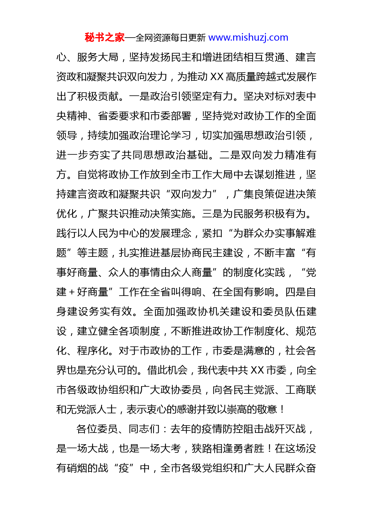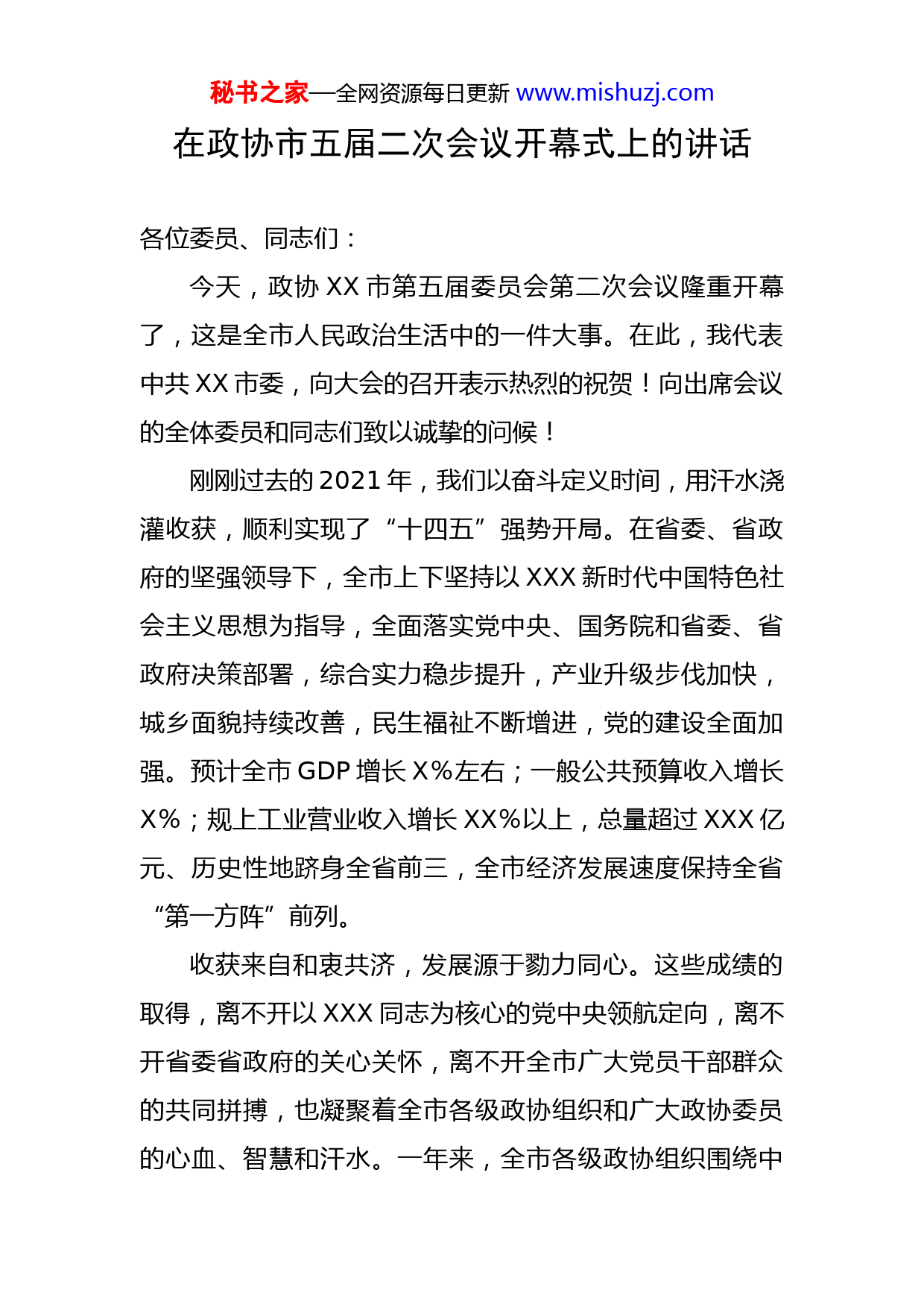 秘书之家—全网资源每日更新www.mishuzj.com在政协市五届二次会议开幕式上的讲话各位委员、同志们:今天,政协XX市第五届委员会第二次会议隆重开幕了,这是全市人民政治生活中的一件大事。在此,我代表中共XX市委,向大会的召开表示热烈的祝贺!向出席会议的全体委员和同志们致以诚挚的问候!刚刚过去的2021年,我们以奋斗定义时间,用汗水浇灌收获,顺利实现了“十四五”强势开局。在省委、省政府的坚强领导下,全市上下坚持以XXX新时代中国特色社会主义思想为指导,全面落实党中央、国务院和省委、省政府决策部署,综合实力稳步提升,产业升级步伐加快,城乡面貌持续改善,民生福祉不断增进,党的建设全面加强。预计全市GDP增长X%左右;一般公共预算收入增长X%;规上工业营业收入增长XX%以上,总量超过XXX亿元、历史性地跻身全省前三,全市经济发展速度保持全省“第一方阵”前列。收获来自和衷共济,发展源于勠力同心。这些成绩的取得,离不开以XXX同志为核心的党中央领航定向,离不开省委省政府的关心关怀,离不开全市广大党员干部群众的共同拼搏,也凝聚着全市各级政协组织和广大政协委员的心血、智慧和汗水。一年来,全市各级政协组织围绕中秘书之家—全网资源每日更新www.mishuzj.com心、服务大局,坚持发扬民主和增进团结相互贯通、建言资政和凝聚共识双向发力,为推动XX高质量跨越式发展作出了积极贡献。一是政治引领坚定有力。坚决对标对表中央精神、省委要求和市委部署,坚持党对政协工作的全面领导,持续加强政治理论学习,切实加强思想政治引领,进一步夯实了共同思想政治基础。二是双向发力精准有方。自觉将政协工作放到全市工作大局中去谋划推进,坚持建言资政和凝聚共识“双向发力”,广集良策促进决策优化,广聚共识推动决策实施。三是为民服务积极有为。践行以人民为中心的发展理念,紧扣“为群众办实事解难题”等主题,扎实推进基层协商民主建设,不断丰富“有事好商量、众人的事情由众人商量”的制度化实践,“党建+好商量”工作在全省叫得响、在全国有影响。四是自身建设务实有效。全面加强政协机关建设和委员队伍建设,建立健全各项制度,不断推进政协工作制度化、规范化、程序化。对于市政协的工作,市委是满意的,社会各界也是充分认可的。借此机会,我代表中共XX市委,向全市各级政协组织和广大政协委员,向各民主党派、工商联和无党派人士,表示衷心的感谢并致以崇高的敬意!各位委员、同志们:去年的疫情防控阻击战歼灭战,是一场大战,也是一场大考,狭路相逢勇者胜!在这场没有硝烟的战“疫”中,全市各级党组织和广大人民群众奋秘书之家—全网资源每日更新www.mishuzj.com不顾身、奋勇向前,心手相连、守望相助,迅速凝聚起“一座城一条心”的蓬勃力量,夺取了处置突发疫情重大考验的全面胜利。经过疫情防控、防汛抗洪、脱贫攻坚等一系列大战大考,XX儿女的自信心和自豪感空前高涨,凝聚力和向心力极大增强。站在新的历史起点上,我们要继续弘扬“一座城一条心”精神,同心同德、同心同向、同心同行,不断迈出“建设区域性中心城市、打造现代化大美XX”的坚实步伐。一座城一条心,必须紧跟核心,始终爱党爱国。身逢伟大时代,肩负光荣使命,全市各级政协组织和广大政协委员要胸怀“两个大局”、心系“国之大者”,始终做到旗帜鲜明讲政治。要注重思想政治引领。坚持把学习贯彻XXX新时代中国特色社会主义思想作为首要的、长期的政治任务,持续推动党的创新理论最新成果“飞入寻常百姓家”,从灵魂深处捍卫“两个确立”、做到“两个维护”,更加坚定自觉地拥护中国共产党领导,更加坚定不移走中国特色社会主义道路。要把牢政协性质定位。进一步把准新时代人民政协工作的新方位新使命,充分发挥专门协商机构作用,自觉把党中央的精神和省委、市委的部署要求贯彻落实到政协工作全过程,努力把市委的主张转化为广大委员的共同意志,转化为各界群众的自觉行动,做到党的工作推进到哪里,政协工作就跟进到哪里,政协秘书之家—全网资源每日更新www.mishuzj.com作用就发挥到哪里。要强化政协党的建设。把坚持党的领导作为最根本的政治原则,不断增强政协党组把方向、管大局、保落实的能力,把党对政协工作的领导落实到履行职责的各方面全过程,推进党的组织对党员委员的全覆盖、党的工作对政协委员的全覆盖,以党的建设新成效推进人民政协事业新发展。一座城一条心,必须紧扣中心,加快发展步伐。政协界别众多、联系广泛,人才荟萃、智力密集,要更加积极主动地围绕中心、融入中心,更好地体现政协担当、展现政协风采。要善建睿智之言。聚焦建设区域中心、打造现代化大美XX,融入长三角、中部走前列,扎实推动共同富裕,全面推进乡村振兴,统筹发展和安全等事关全局、影响长远的重大课题,深入专题调研,积极协商议政,开展民主监督,努力做到参政参到要点上,议政议在关键处。要多行服务之举。积极响应市委号召,充分发挥政协独特优势,广泛参与到“工业挂帅、项目为王”中来,参与到“打造城市品牌、扩大城市影响”中来,参与到“优化营商环境、深化创新驱动”中来,多做牵线搭桥、穿针引线、宣传推介的工作,更好服务全市改革发展大局。要广聚奋进之力。密切联