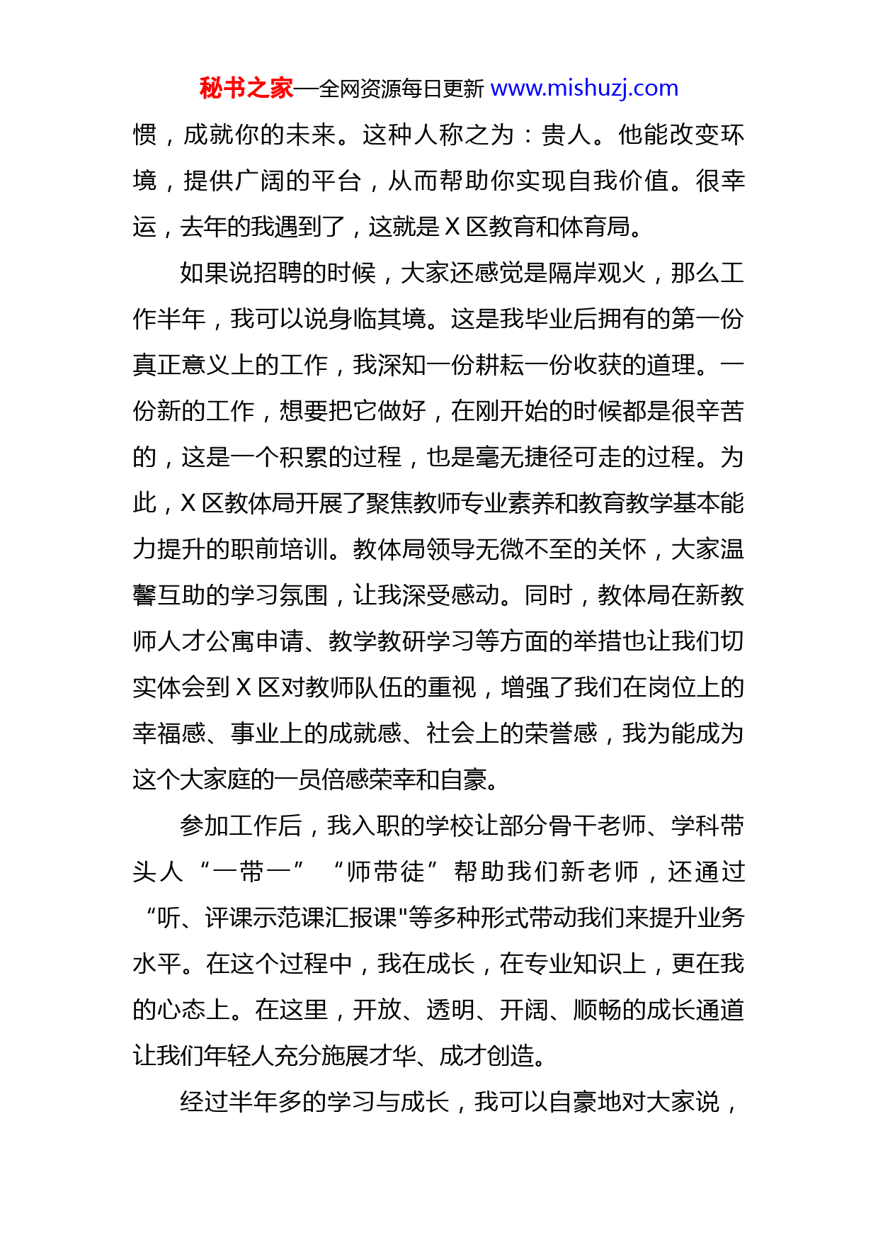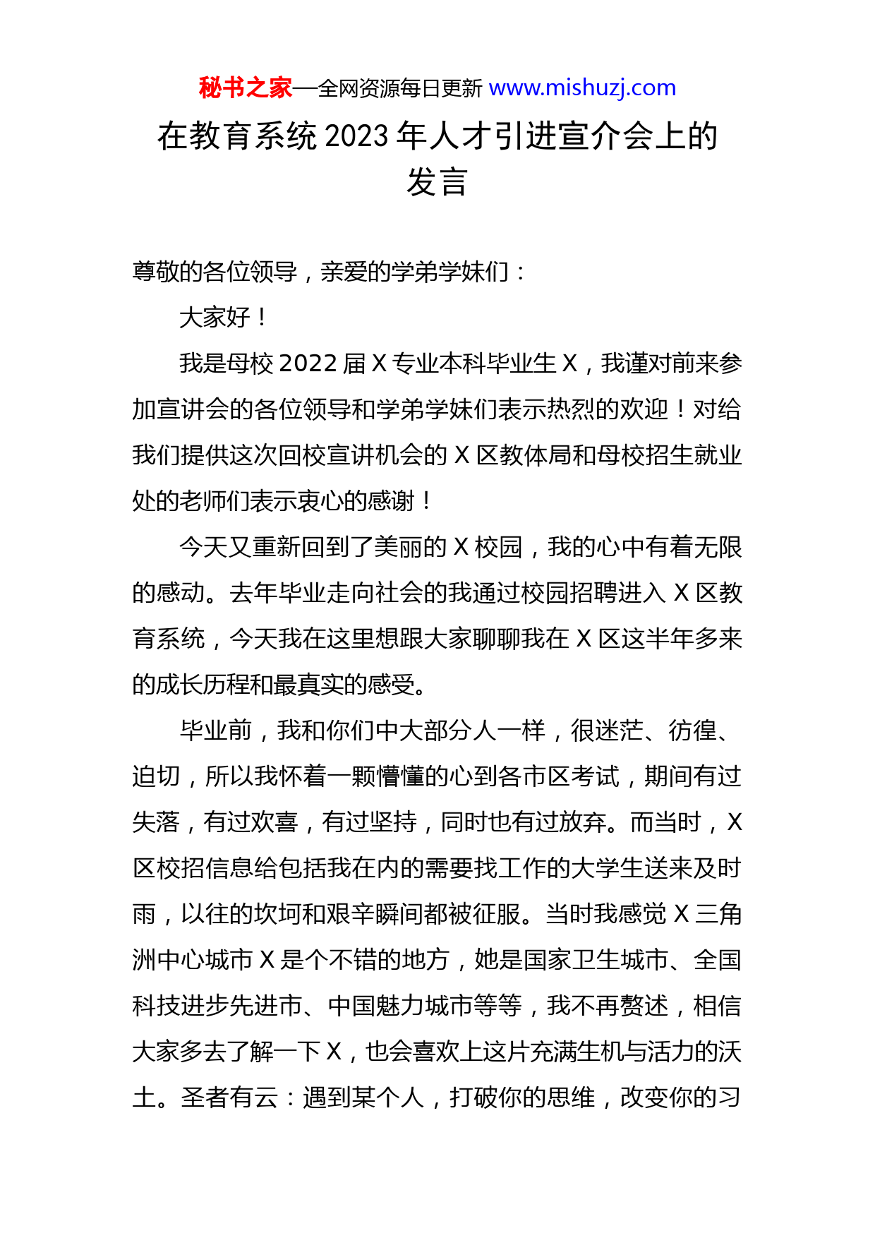 秘书之家—全网资源每日更新www.mishuzj.com在教育系统2023年人才引进宣介会上的发言尊敬的各位领导,亲爱的学弟学妹们:大家好!我是母校2022届X专业本科毕业生X,我谨对前来参加宣讲会的各位领导和学弟学妹们表示热烈的欢迎!对给我们提供这次回校宣讲机会的X区教体局和母校招生就业处的老师们表示衷心的感谢!今天又重新回到了美丽的X校园,我的心中有着无限的感动。去年毕业走向社会的我通过校园招聘进入X区教育系统,今天我在这里想跟大家聊聊我在X区这半年多来的成长历程和最真实的感受。毕业前,我和你们中大部分人一样,很迷茫、彷徨、迫切,所以我怀着一颗懵懂的心到各市区考试,期间有过失落,有过欢喜,有过坚持,同时也有过放弃。而当时,X区校招信息给包括我在内的需要找工作的大学生送来及时雨,以往的坎坷和艰辛瞬间都被征服。当时我感觉X三角洲中心城市X是个不错的地方,她是国家卫生城市、全国科技进步先进市、中国魅力城市等等,我不再赘述,相信大家多去了解一下X,也会喜欢上这片充满生机与活力的沃土。圣者有云:遇到某个人,打破你的思维,改变你的习秘书之家—全网资源每日更新www.mishuzj.com惯,成就你的未来。这种人称之为:贵人。他能改变环境,提供广阔的平台,从而帮助你实现自我价值。很幸运,去年的我遇到了,这就是X区教育和体育局。如果说招聘的时候,大家还感觉是隔岸观火,那么工作半年,我可以说身临其境。这是我毕业后拥有的第一份真正意义上的工作,我深知一份耕耘一份收获的道理。一份新的工作,想要把它做好,在刚开始的时候都是很辛苦的,这是一个积累的过程,也是毫无捷径可走的过程。为此,X区教体局开展了聚焦教师专业素养和教育教学基本能力提升的职前培训。教体局领导无微不至的关怀,大家温馨互助的学习氛围,让我深受感动。同时,教体局在新教师人才公寓申请、教学教研学习等方面的举措也让我们切实体会到X区对教师队伍的重视,增强了我们在岗位上的幸福感、事业上的成就感、社会上的荣誉感,我为能成为这个大家庭的一员倍感荣幸和自豪。参加工作后,我入职的学校让部分骨干老师、学科带头人“一带一”“师带徒”帮助我们新老师,还通过“听、评课示范课汇报课"等多种形式带动我们来提升业务水平。在这个过程中,我在成长,在专业知识上,更在我的心态上。在这里,开放、透明、开阔、顺畅的成长通道让我们年轻人充分施展才华、成才创造。经过半年多的学习与成长,我可以自豪地对大家说,秘书之家—全网资源每日更新www.mishuzj.com在X区教育系统,领导在关怀着、同事在关心着、师傅在搀扶着,我是幸运的,更是幸福的。在这个竞争一年比一年激烈的求职年代,找到一份心仪并且有发展潜力的工作很难。如果你跟我有着同样的目标,同样热爱教育事业,欢迎你加入X区教育,加入这个大家庭,我们一起成长!我相信你会感谢你的选择!