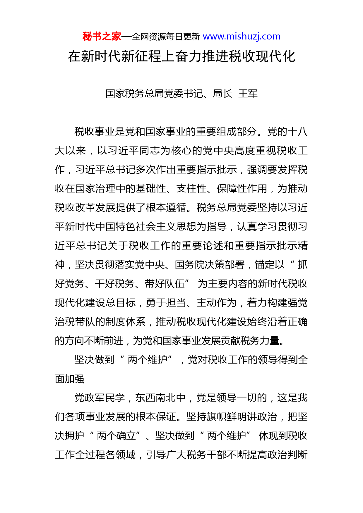 秘书之家—全网资源每日更新www.mishuzj.com在新时代新征程上奋力推进税收现代化国家税务总局党委书记、局长王军税收事业是党和国家事业的重要组成部分。党的十八大以来,以习近平同志为核心的党中央高度重视税收工作,习近平总书记多次作出重要指示批示,强调要发挥税收在国家治理中的基础性、支柱性、保障性作用,为推动税收改革发展提供了根本遵循。税务总局党委坚持以习近平新时代中国特色社会主义思想为指导,认真学习贯彻习近平总书记关于税收工作的重要论述和重要指示批示精神,坚决贯彻落实党中央、国务院决策部署,锚定以“抓好党务、干好税务、带好队伍”为主要内容的新时代税收现代化建设总目标,勇于担当、主动作为,着力构建强党治税带队的制度体系,推动税收现代化建设始终沿着正确的方向不断前进,为党和国家事业发展贡献税务力量。坚决做到“两个维护”,党对税收工作的领导得到全面加强党政军民学,东西南北中,党是领导一切的,这是我们各项事业发展的根本保证。坚持旗帜鲜明讲政治,把坚决拥护“两个确立”、坚决做到“两个维护”体现到税收工作全过程各领域,引导广大税务干部不断提高政治判断秘书之家—全网资源每日更新www.mishuzj.com力、政治领悟力、政治执行力,从根本上保证党的税收事业持续健康发展。持续深入推进党的政治建设。始终牢记税务机关首先是政治机关,反复强调不仅税务总局是政治机关,而且省局、市局、县局、税务分局(所)都是政治机关,都要把党的政治建设摆在首位。对习近平总书记在中央和国家机关党的建设工作会议上的重要讲话精神开展多轮次研学和落实情况“回头看”,研究制定深入推进税务党建高质量发展两年行动方案,持续联动推进税务总局机关和税务系统政治机关建设。建立和实施总局党委统一领导,省、市两级税务局党委分级负责的“一级巡视、两级巡察”工作体制,推动税务巡视巡察在聚焦政治监督中深入开展。坚持以自我革命精神推进全面从严治党,持续构建完善“政治建设一体深化、两个责任一体发力、综合监督一体集成、党建业务一体融合、约束激励一体抓实、组织体系一体贯通”的“六位一体”税务系统全面从严治党新格局,推动各级税务机关扛牢压实管党治党政治责任。深刻领悟党的创新理论真理伟力。坚持把学习贯彻习近平新时代中国特色社会主义思想作为首要政治任务,建立和落实党委会“第一议题”制度,每次党委会都首先传达学习习近平总书记近期重要讲话、重要指示批示精神,结合实际深入研究贯彻落实措施,并对各级税务局党委提秘书之家—全网资源每日更新www.mishuzj.com出相应要求,在全系统形成制度性安排。无论是党委理论学习中心组学习、“三会一课”,还是各类干部教育培训等,都把学习习近平新时代中国特色社会主义思想作为必设内容。中央历次全会召开后,都举办全系统司局级主要领导干部专题研讨班,深入开展学习研讨。在努力全面准确深刻理解的基础上着力于行动,坚持闻讯闻令主动做,坚持结合实际创造性地做,坚持建立健全制度机制去做,坚持系统观念、事事关联去做,坚持持续做、长效做,确保落地生根、落实见效。实践证明,习近平新时代中国特色社会主义思想是引领党的各项事业发展的前进航标,新时代税收工作在这一科学理论指引下不断向前迈进提升。让党的光辉旗帜在税收改革发展前沿高高飘扬。近年来,税收改革发展大事要事叠加,面临的风险挑战严峻复杂。我们坚持以党的建设引领税收改革发展,注重从制度上探索创新,接续推出130余项党建制度规范。特别是按照税务部门双重领导管理体制要求,探索构建并持续完善具有税务特色的“纵合横通强党建”制度体系,不断推动税务党建高质量发展。各级税务局党委积极推动党建和业务深度融合,从税制改革到税收征管体制改革,从落实减税降费到服务高质量发展,从助力脱贫攻坚到抗疫情防汛情,全系统5万多个基层党组织、50多万名党员干部充分发挥战斗堡垒和先锋模范作用,让党的光辉旗帜始终在税秘书之家—全网资源每日更新www.mishuzj.com收改革发展最前沿和第一线高高飘扬。在砥砺奋进中持续锻造党的税务铁军。税务干部约占全国公务员队伍的1/11,把这支队伍管好带好是税务总局党委义不容辞的责任。特别是在顺利完成党中央部署的国税地税机构合并任务后,结合公务员职务与职级并行,想方设法解决领导干部超职数配备等一系列遗留问题,畅通年轻干部成长通道,深入推进干部队伍事合、人合、力合、心合。与此同时,不断构建完善“带好队伍”制度体系,每年升级完善提升,建成“横向到边、纵向到底、任务到岗、责任到人”的绩效管理体系,为政府机关推行绩效管理探索新路;数字人事制度实现从“线条勾勒”到“素描成像”的蜕变,为加强公务员日常考核工作提供经验;大力实施人才兴税战略,培养各类人才6万余人,其中分7批选拔税务领军人才847名,选派103名国际化人才到我驻外使领馆、国际组织、国外高校等工作学习,税务人才示范效应不断显现;持续推出为基层减负系列举措,有效激发干事创业精气神、汇聚担当作为正能量。切实履行职能责任,税收服务国家治理更加有力有效随着经济社会发展,税收日益深度融入国家治理,发挥着越来越重