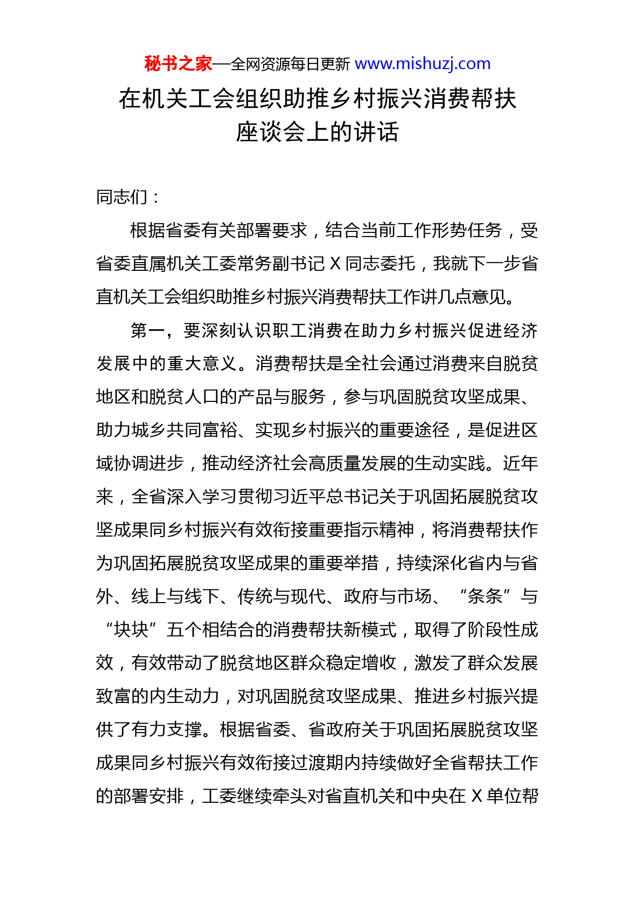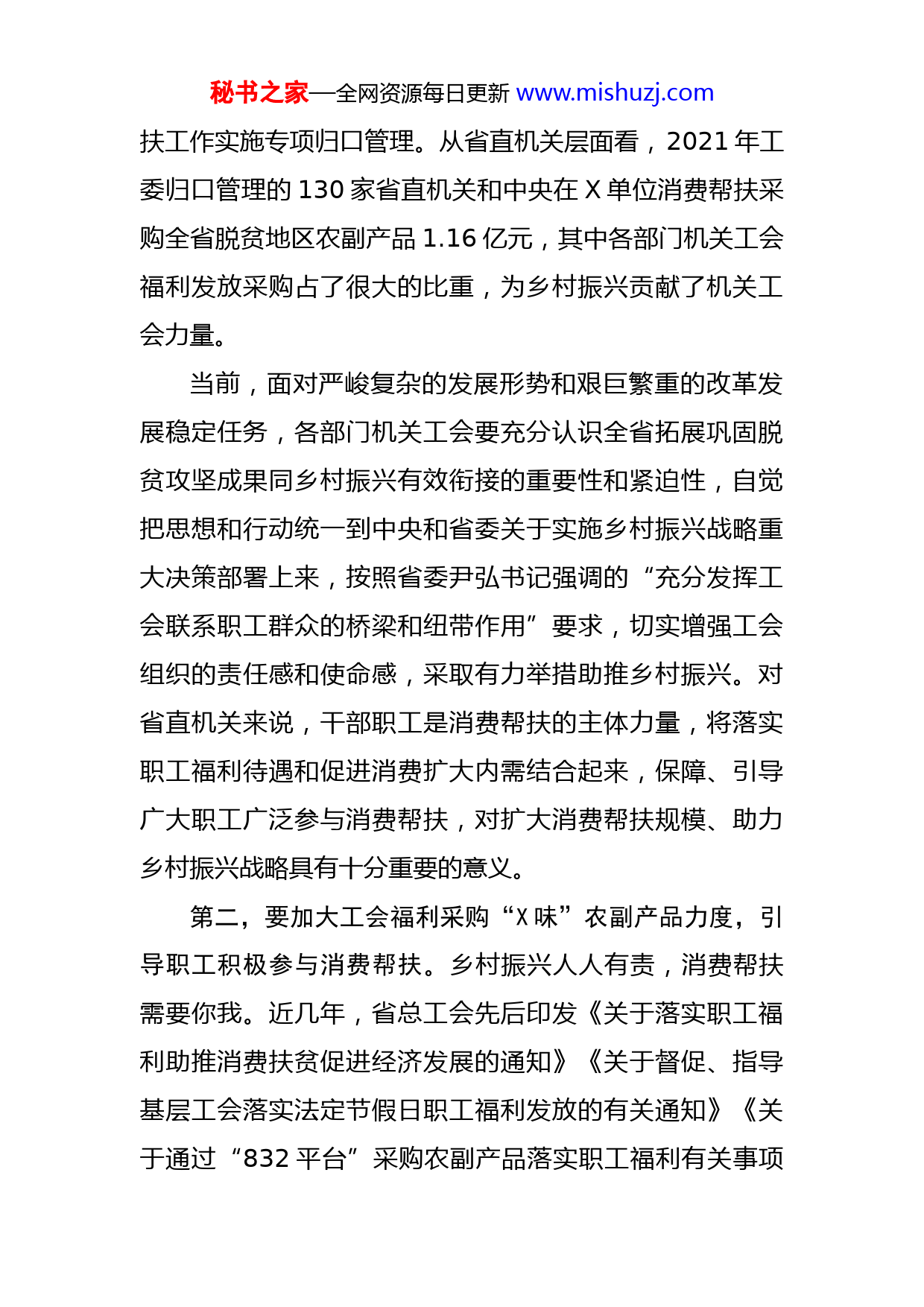 秘书之家—全网资源每日更新www.mishuzj.com在机关工会组织助推乡村振兴消费帮扶座谈会上的讲话同志们:根据省委有关部署要求,结合当前工作形势任务,受省委直属机关工委常务副书记X同志委托,我就下一步省直机关工会组织助推乡村振兴消费帮扶工作讲几点意见。第一,要深刻认识职工消费在助力乡村振兴促进经济发展中的重大意义。消费帮扶是全社会通过消费来自脱贫地区和脱贫人口的产品与服务,参与巩固脱贫攻坚成果、助力城乡共同富裕、实现乡村振兴的重要途径,是促进区域协调进步,推动经济社会高质量发展的生动实践。近年来,全省深入学习贯彻习近平总书记关于巩固拓展脱贫攻坚成果同乡村振兴有效衔接重要指示精神,将消费帮扶作为巩固拓展脱贫攻坚成果的重要举措,持续深化省内与省外、线上与线下、传统与现代、政府与市场、“条条”与“块块”五个相结合的消费帮扶新模式,取得了阶段性成效,有效带动了脱贫地区群众稳定增收,激发了群众发展致富的内生动力,对巩固脱贫攻坚成果、推进乡村振兴提供了有力支撑。根据省委、省政府关于巩固拓展脱贫攻坚成果同乡村振兴有效衔接过渡期内持续做好全省帮扶工作的部署安排,工委继续牵头对省直机关和中央在X单位帮秘书之家—全网资源每日更新www.mishuzj.com扶工作实施专项归口管理。从省直机关层面看,2021年工委归口管理的130家省直机关和中央在X单位消费帮扶采购全省脱贫地区农副产品1.16亿元,其中各部门机关工会福利发放采购占了很大的比重,为乡村振兴贡献了机关工会力量。当前,面对严峻复杂的发展形势和艰巨繁重的改革发展稳定任务,各部门机关工会要充分认识全省拓展巩固脱贫攻坚成果同乡村振兴有效衔接的重要性和紧迫性,自觉把思想和行动统一到中央和省委关于实施乡村振兴战略重大决策部署上来,按照省委尹弘书记强调的“充分发挥工会联系职工群众的桥梁和纽带作用”要求,切实增强工会组织的责任感和使命感,采取有力举措助推乡村振兴。对省直机关来说,干部职工是消费帮扶的主体力量,将落实职工福利待遇和促进消费扩大内需结合起来,保障、引导广大职工广泛参与消费帮扶,对扩大消费帮扶规模、助力乡村振兴战略具有十分重要的意义。第二,要加大工会福利采购“X味”农副产品力度,引导职工积极参与消费帮扶。乡村振兴人人有责,消费帮扶需要你我。近几年,省总工会先后印发《关于落实职工福利助推消费扶贫促进经济发展的通知》《关于督促、指导基层工会落实法定节假日职工福利发放的有关通知》《关于通过“832平台”采购农副产品落实职工福利有关事项秘书之家—全网资源每日更新www.mishuzj.com的通知》等文件,对工会组织助推乡村振兴明确要求、作出部署,我们要对照新任务新要求,认真抓好贯彻落实。要严格执行《X肃省基层工会经费收支管理实施细则(暂行)》,在法定节假日按年度上限向职工发放节日慰问品。全年节日慰问品中,用于采购“X味”农副产品经费一般不低于500元。要积极宣传推介全省脱贫地区文化景点、旅游景点、美丽乡村、精品旅游线路、特色产品等,鼓励职工前往旅游、度假、观光、消费。要依托工会渠道积极协调联系,帮助本单位帮扶的县乡在大型商场、集市、超市直销农特产品。在组织职工开展主题实践活动、疗休养、拓展训练、文化体育等活动时,要优先安排在我省脱贫地区符合条件的场所。机关、企事业单位采购劳保用品、职工食堂食材、职工文体活动用品、节假日慰问品和其他慰问品时,要优先在符合条件的脱贫地区企业、专业合作社、帮扶车间购买农特产品。在这里,需要强调的是,机关工会要联系畅通渠道,引导职工购买帮扶产品,但不得强制职工购买某个指定产品;要把好质量安全关,集体购买、向职工推介的农产品要符合国家食品安全标准。机关工会可根据本单位职工需求,优先通过本地各类消费帮扶专馆、专区、专柜等平台集体订购,也可发放指定平台消费券、由职工自行选购,但不得发放现金。第三,要强化组织领导,推动省直机关形成齐抓共管秘书之家—全网资源每日更新www.mishuzj.com的消费帮扶工作局面。为群众办实事,永远在路上。今年,工委聚焦省委赋予的省直牵头单位督促推动责任、聚焦归口单位到村帮扶责任落实、聚焦省直机关和中央在X单位各级党组织作用发挥,对归口管理单位帮扶工作作出全面部署安排,在消费帮扶工作方面,持续深入开展特色农产品进机关活动,督促推动各部门单位通过采取签约消费、单位组织购买、工会发放福利购买、党员干部职工个人购买等方式深化消费帮扶。上半年,从机关工会系统看,绝大部分机关工会积极响应以购代捐、以买代帮倡议,职工消费在省直机关成为常态,形成了消费帮扶的浓厚氛围,促进了脱贫地区产业可持续发展。从消费实践看,购买优质农副产品为职工发放节日福利,既增强了干部职工消费帮扶理念,也帮助广大干部职工购买到绿色、特色、放心的农副产品,更帮助农村企业和群众解决了农产品产销信息不畅、农产品销售难等实际困难,进一步畅通了消费帮扶渠道,支持了“X味”农副产品产业长效发展。同时,也要清醒认识到还存在一些问题和不足,一方面,有的单位在乡村振兴帮扶工作中还有不够到位的地方,个别机关工会组