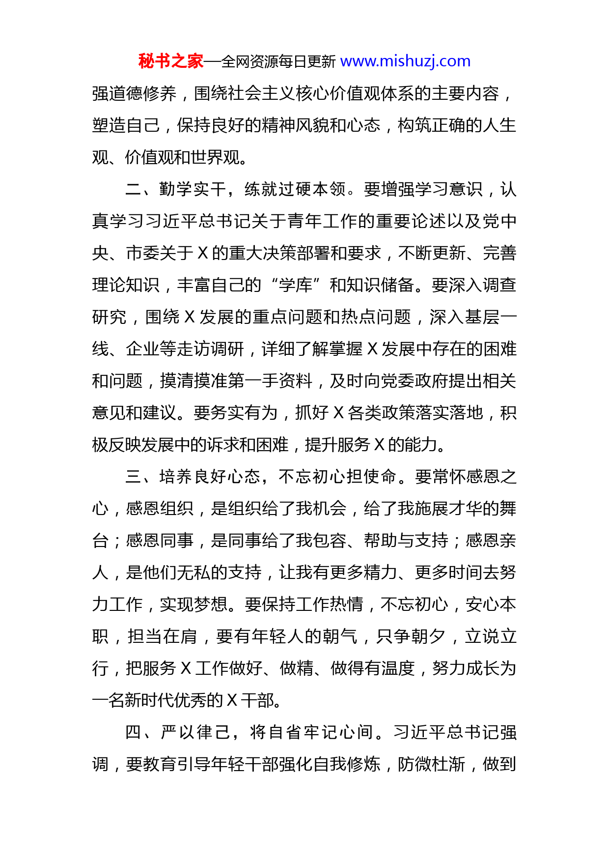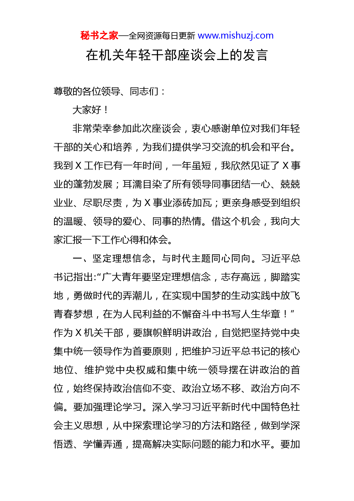 秘书之家—全网资源每日更新www.mishuzj.com在机关年轻干部座谈会上的发言尊敬的各位领导、同志们:大家好!非常荣幸参加此次座谈会,衷心感谢单位对我们年轻干部的关心和培养,为我们提供学习交流的机会和平台。我到X工作已有一年时间,一年虽短,我欣然见证了X事业的蓬勃发展;耳濡目染了所有领导同事团结一心、兢兢业业、尽职尽责,为X事业添砖加瓦;更亲身感受到组织的温暖、领导的爱心、同事的热情。借这个机会,我向大家汇报一下工作心得和体会。一、坚定理想信念,与时代主题同心同向。习近平总书记指出:“广大青年要坚定理想信念,志存高远,脚踏实地,勇做时代的弄潮儿,在实现中国梦的生动实践中放飞青春梦想,在为人民利益的不懈奋斗中书写人生华章!”作为X机关干部,要旗帜鲜明讲政治,自觉把坚持党中央集中统一领导作为首要原则,把维护习近平总书记的核心地位、维护党中央权威和集中统一领导摆在讲政治的首位,始终保持政治信仰不变、政治立场不移、政治方向不偏。要加强理论学习。深入学习习近平新时代中国特色社会主义思想,从中探索理论学习的方法和路径,做到学深悟透、学懂弄通,提高解决实际问题的能力和水平。要加秘书之家—全网资源每日更新www.mishuzj.com强道德修养,围绕社会主义核心价值观体系的主要内容,塑造自己,保持良好的精神风貌和心态,构筑正确的人生观、价值观和世界观。二、勤学实干,练就过硬本领。要增强学习意识,认真学习习近平总书记关于青年工作的重要论述以及党中央、市委关于X的重大决策部署和要求,不断更新、完善理论知识,丰富自己的“学库”和知识储备。要深入调查研究,围绕X发展的重点问题和热点问题,深入基层一线、企业等走访调研,详细了解掌握X发展中存在的困难和问题,摸清摸准第一手资料,及时向党委政府提出相关意见和建议。要务实有为,抓好X各类政策落实落地,积极反映发展中的诉求和困难,提升服务X的能力。三、培养良好心态,不忘初心担使命。要常怀感恩之心,感恩组织,是组织给了我机会,给了我施展才华的舞台;感恩同事,是同事给了我包容、帮助与支持;感恩亲人,是他们无私的支持,让我有更多精力、更多时间去努力工作,实现梦想。要保持工作热情,不忘初心,安心本职,担当在肩,要有年轻人的朝气,只争朝夕,立说立行,把服务X工作做好、做精、做得有温度,努力成长为一名新时代优秀的X干部。四、严以律己,将自省牢记心间。习近平总书记强调,要教育引导年轻干部强化自我修炼,防微杜渐,做到秘书之家—全网资源每日更新www.mishuzj.com有原则、有底线、有规矩。作为年轻干部,要知敬畏,敬畏规章制度、敬畏党纪国法、敬畏道德规范,做到守身如玉当慎初,不越雷池一步,行应当所行。要常修身,坚持经常性自我反思,在工作中、生活中严于律己、待人真诚、处事坦诚,做真诚的人、正直的人。要守廉洁,严守党纪红线,筑牢廉洁防线,夯实道德底线,自觉加强党性修养和作风养成,以平和之心对待“名”,以淡泊之心对待“位”,以知足之心对待“利”,堂堂正正做人,老老实实做事。作为一名年轻干部,我将不忘初心、砥砺奋进,在工作中坚持以知促行,以行求知,为促进X作出自己的努力!