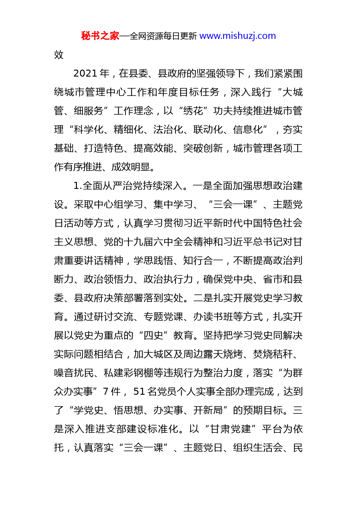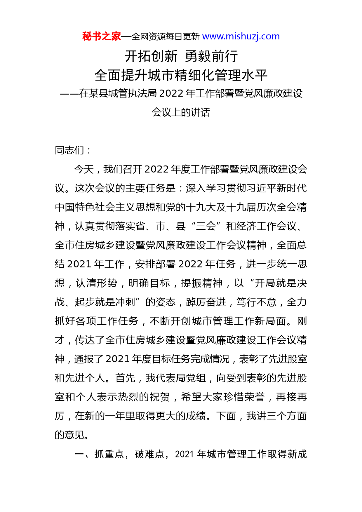秘书之家—全网资源每日更新www.mishuzj.com开拓创新勇毅前行全面提升城市精细化管理水平——在某县城管执法局2022年工作部署暨党风廉政建设会议上的讲话同志们:今天,我们召开2022年度工作部署暨党风廉政建设会议。这次会议的主要任务是:深入学习贯彻习近平新时代中国特色社会主义思想和党的十九大及十九届历次全会精神,认真贯彻落实省、市、县“三会”和经济工作会议、全市住房城乡建设暨党风廉政建设工作会议精神,全面总结2021年工作,安排部署2022年任务,进一步统一思想,认清形势,明确目标,提振精神,以“开局就是决战、起步就是冲刺”的姿态,踔厉奋进,笃行不怠,全力抓好各项工作任务,不断开创城市管理工作新局面。刚才,传达了全市住房城乡建设暨党风廉政建设工作会议精神,通报了2021年度目标任务完成情况,表彰了先进股室和先进个人。首先,我代表局党组,向受到表彰的先进股室和个人表示热烈的祝贺,希望大家珍惜荣誉,再接再厉,在新的一年里取得更大的成绩。下面,我讲三个方面的意见。一、抓重点,破难点,2021年城市管理工作取得新成秘书之家—全网资源每日更新www.mishuzj.com效2021年,在县委、县政府的坚强领导下,我们紧紧围绕城市管理中心工作和年度目标任务,深入践行“大城管、细服务”工作理念,以“绣花”功夫持续推进城市管理“科学化、精细化、法治化、联动化、信息化”,夯实基础、打造特色、提高效能、突破创新,城市管理各项工作有序推进、成效明显。1.全面从严治党持续深入。一是全面加强思想政治建设。采取中心组学习、集中学习、“三会一课”、主题党日活动等方式,认真学习贯彻习近平新时代中国特色社会主义思想、党的十九届六中全会精神和习近平总书记对甘肃重要讲话精神,学思践悟、知行合一,不断提高政治判断力、政治领悟力、政治执行力,确保党中央、省市和县委、县政府决策部署落到实处。二是扎实开展党史学习教育。通过研讨交流、专题党课、办读书班等方式,扎实开展以党史为重点的“四史”教育。坚持把学习党史同解决实际问题相结合,加大城区及周边露天烧烤、焚烧秸秆、噪音扰民、私建彩钢棚等违规行为整治力度,落实“为群众办实事”7件,51名党员个人实事全部办理完成,达到了“学党史、悟思想、办实事、开新局”的预期目标。三是深入推进支部建设标准化。以“甘肃党建”平台为依托,认真落实“三会一课”、主题党日、组织生活会、民秘书之家—全网资源每日更新www.mishuzj.com主评议党员等党建工作制度,继续深化“构建和谐城管,营造山丹优美城市环境”党建品牌创建活动,着力激发党支部工作活力,不断增强党员干部赓续精神伟力、笃定实干前行的使命担当。四是不断完善党风廉政防控体系。采取廉政承诺、廉政谈话、廉政教育等形式,教育引导党员干部知敬畏、存戒惧、守底线。严格落实中央八项规定精神,全面加强城市管理执法、行政审批事项、财经纪律落实等重点环节和班子成员日常监督,综合运用执纪监督“四种形态”,持续加强作风建设,健全完善干部考核、财务管理、请销假等制度,以严明的纪律保障城管执法工作顺利开展。2.服务保障大局坚强有力。一是全力打好疫情防控阻击战。坚决服从服务于全县疫情防控大局,全力配合开展卡口值守、车辆排查、流调溯源、防疫宣传等志愿服务工作。强制关停城区内所有临时便民市场经营点和流动商贩销售点,严格管控主次干道、公共场地、人群聚集背街小巷等重点区域,以“管好一片区域、守护一方平安”的政治责任,逆势而上,主动作为,为打赢疫情防控阻击战贡献了城管力量,彰显了城管担当。二是深入实施城市更新十大专项行动。建立多部门联动执法工作机制,持续开展交通秩序、“门前六包”、城市污染和违建、烟花爆竹燃放治理四大联合执法大会战,市容市貌明显改善,城市形秘书之家—全网资源每日更新www.mishuzj.com象品位大幅提升。三是积极推进环境卫生整治专项行动。充分发挥城管部门牵头抓总的职能作用,结合创建国家卫生县城,过细工作安排,明确部门职责,强化联动配合,成立8个排查整治小组,以环境卫生、市容市貌、交通秩序、道路设施、违法建筑为重点,扎实开展环境问题排查整治,城区街道整洁靓丽,环境卫生长效机制初步建立,人民群众环保意识明显增强。3.城市日常管理更加精细。一是狠抓市容市貌整治。严格落实“门前六包”责任制和“周五月末”环境卫生集中整治制度,实行集中排查、错时执勤、巡查值守和无缝隙监管相结合的方式,对流动摊点、店外经营、占道经营、临时性商业活动等城市管理“顽疾”进行集中治理。签订“门前六包”责任书3000多份,清理店外和占道经营1720余处。二是规范市场经营秩序。按照“因地制宜、方便群众、疏堵结合”的要求,在城区规划设置9处便民市场和2处早晚市,设置6处临时性年货市场,引导各类摊点入市规范经营,有效解决了长期困扰的“马路市场”和“流动摊贩”两大难题。三是实施违建广告清理。以“零容忍”的态度,严查城市规划区内违建行为,加大户外广告、户外匾牌清理整治力度,清除视觉污染,打造靓丽城市。排查整治违建行为36起,拆除广告牌957块,清理乱贴乱画800余处。四是深化环境污染整治。加大露天烧秘书之家