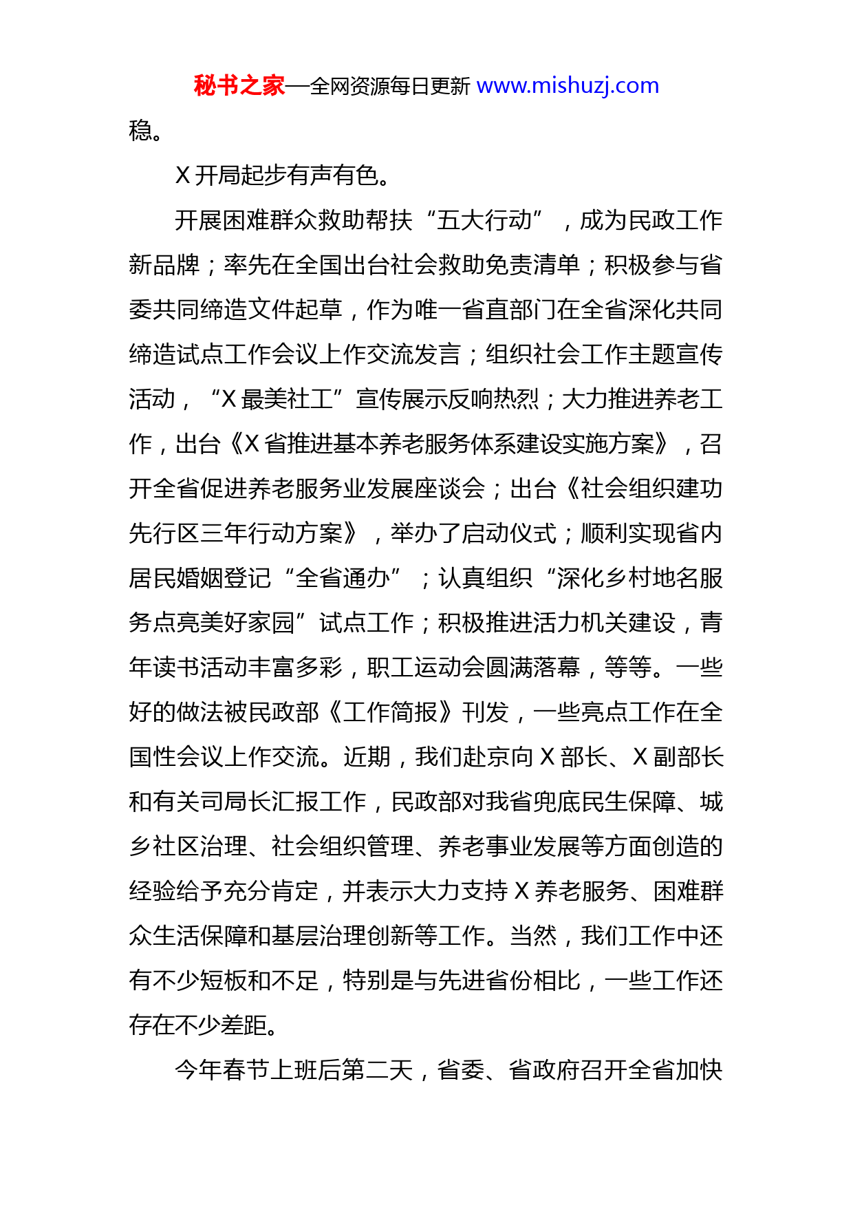 秘书之家—全网资源每日更新www.mishuzj.com在民政厅2023年一季度工作点评会上的讲话今天,我们召开2023年一季度工作点评会,主要任务是盘点开年以来重点工作推进情况,动员全厅上下拉高标杆、争先创优,奋战“二季度”,确保“双过半”,为实现全年目标奠定坚实基础。刚才,X个处室(单位)作了发言。各位厅领导作了很好的点评,讲了很好的意见,请大家认真落实。总的来看,一季度工作开局良好,各项工作稳步推进,呈现三个方面的特点:X谋划部署有章有法。X省长专门对民政工作作出批示,X副省长调研民政工作并到民政厅召开座谈会,对今年民政工作提出明确要求。我们及时召开全省民政工作会议、厅直系统党建和党风廉政建设工作会议等,提出“健全七大体系、抓好三项重点工作”的总体思路,列出重点工作清单。各处室(单位)对标对表,明确任务落实的时间表、路线图,目标明确、思路清晰。X疫情防控有力有效。扎实做好新冠“乙类乙管”后养老、儿童福利和殡葬服务机构应对疫情工作,守住了安全底线,确保了总体平秘书之家—全网资源每日更新www.mishuzj.com稳。X开局起步有声有色。开展困难群众救助帮扶“五大行动”,成为民政工作新品牌;率先在全国出台社会救助免责清单;积极参与省委共同缔造文件起草,作为唯一省直部门在全省深化共同缔造试点工作会议上作交流发言;组织社会工作主题宣传活动,“X最美社工”宣传展示反响热烈;大力推进养老工作,出台《X省推进基本养老服务体系建设实施方案》,召开全省促进养老服务业发展座谈会;出台《社会组织建功先行区三年行动方案》,举办了启动仪式;顺利实现省内居民婚姻登记“全省通办”;认真组织“深化乡村地名服务点亮美好家园”试点工作;积极推进活力机关建设,青年读书活动丰富多彩,职工运动会圆满落幕,等等。一些好的做法被民政部《工作简报》刊发,一些亮点工作在全国性会议上作交流。近期,我们赴京向X部长、X副部长和有关司局长汇报工作,民政部对我省兜底民生保障、城乡社区治理、社会组织管理、养老事业发展等方面创造的经验给予充分肯定,并表示大力支持X养老服务、困难群众生活保障和基层治理创新等工作。当然,我们工作中还有不少短板和不足,特别是与先进省份相比,一些工作还存在不少差距。今年春节上班后第二天,省委、省政府召开全省加快秘书之家—全网资源每日更新www.mishuzj.com建设全国构建新发展格局先行区会议,要求各地各部门锚定先行区建设,找准定位、奋发有为。近期省委召开全省深化共同缔造试点工作会议,要求民政部门勇担重任、积极作为。我们民政部门和民政干部要认真思考如何准确把握全省发展大势和省委、省政府工作要求,全力以赴做好二季度及下一阶段工作,在全省发展大局中争先进位、展现作为。这里,与大家交流三个方面的问题。一、建设全国构建新发展格局先行区给民政带来什么,民政工作怎么做?建设全国构建新发展格局先行区,是省委、省政府全面贯彻党的二十大精神,准确把握新发展阶段X历史方位和形势任务,积极服务大局,融入国家战略,抢抓发展机遇,加快推进X高质量发展的重大抉择。先行区建设是全方位的,不仅包括经济建设,也包括政治、社会、文化、生态建设等方方面面。民政作为社会建设兜底性、基础性工作,先行区建设给我们提出哪些新要求?至少有这么三个方面:一是目标定位更高。建设先行区,要求各项工作都要走在全国前列,而不仅仅在中部争一流。当前我省民政工作与发达省份还有不小差距,少数指标低于全国平均水平,我们必须抓紧补短板、强弱项,尽快提升在全国的位次。秘书之家—全网资源每日更新www.mishuzj.com二是职责任务更重。省第十二次党代会部署的X大重点任务,涉及民政的有X项。我们民政部门要勇挑重担、主动作为,全面完成省委、省政府交办的任务。三是发展动力更足。建设先行区,对民政部门来说,要持续推进民生兜底保障全面提质、基层社会治理全面提效、基本社会服务全面提档、民政安全发展全面提能,这既是压力更是动力。建设先行区,民政如何积极作为?关键是我们要围绕省委、省政府重大战略部署,谋划、实施好民政重大项目、重点工作,以民政一域服务全省大局。这里,我强调三项重点工作:一是高水平推进养老服务体系建设。养老服务既是重大民生工程,也是重大发展工程,在先行区建设中举足轻重。中央和省委、省政府高度重视养老服务。今年中央经济工作会议把养老服务作为扩大内需的三大重点之一,前不久李强总理在X调研社区居家养老工作并提出明确要求。X部长要求X加快发展养老服务,在中部作出示范,为全国创造经验。省委、省政府部署强县工程,把养老作为构建三大统筹县、乡、村三级服务体系之一。最近省委、省政府正在谋划深化社区居家养老服务体系建设试点工作。我们要抢抓机遇,加大工作力度,秘书之家—全网资源每日更新www.mishuzj.com推动我省养老服务高质量发展。二是高质量实施“社会组织建功先行区三年行动”。社会组织是先行区建设的重要力量。去年省委常委会、省政府常务会议在听取社会组织工作汇报时,省委省政府主要领导强调社会组织要在服务全省发展大局中展示作为。最近,厅党组已部署在全省社会组织中大力实施社会组织助力科技