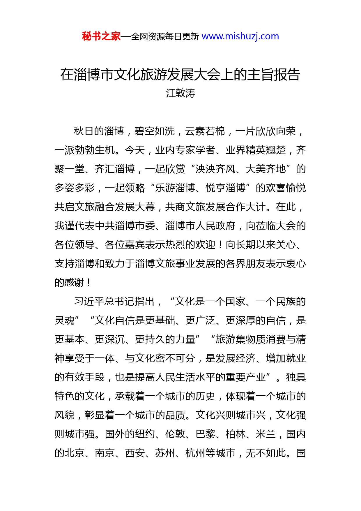 秘书之家—全网资源每日更新www.mishuzj.com在淄博市文化旅游发展大会上的主旨报告江敦涛秋日的淄博,碧空如洗,云素若棉,一片欣欣向荣,一派勃勃生机。今天,业内专家学者、业界精英翘楚,齐聚一堂、齐汇淄博,一起欣赏“泱泱齐风、大美齐地”的多姿多彩,一起领略“乐游淄博、悦享淄博”的欢喜愉悦共启文旅融合发展大幕,共商文旅发展合作大计。在此,我谨代表中共淄博市委、淄博市人民政府,向莅临大会的各位领导、各位嘉宾表示热烈的欢迎!向长期以来关心、支持淄博和致力于淄博文旅事业发展的各界朋友表示衷心的感谢!习近平总书记指出,“文化是一个国家、一个民族的灵魂”“文化自信是更基础、更广泛、更深厚的自信,是更基本、更深沉、更持久的力量”“旅游集物质消费与精神享受于一体、与文化密不可分,是发展经济、增加就业的有效手段,也是提高人民生活水平的重要产业”。独具特色的文化,承载着一个城市的历史,体现着一个城市的风貌,彰显着一个城市的品质。文化兴则城市兴,文化强则城市强。国外的纽约、伦敦、巴黎、柏林、米兰,国内的北京、南京、西安、苏州、杭州等城市,无不如此。国秘书之家—全网资源每日更新www.mishuzj.com际国内城市发展的实践证明,新兴的、后起的城市,可以“跨越”经济增长阶段,但无法“跨越”人文精神的培育和塑造。从某种意义上讲,未来城市发展将“以文化论输赢、凭文明定高低”。淄博要转型升级,向高端发展,建设务实开放、品质活力、生态和谐的现代化组群式大城市,关键在文化软实力。我们深入贯彻落实习近平总书记关于文化旅游融合发展的重要指示精神,提出要全面实施文化赋能行动,努力推动淄博文化“活”起来、淄博旅游“火”起来。女士们、先生们、朋友们!淄博素有“央居齐鲁、襟连海岱”之美誉,是独具特色的组群式城市,文化底蕴深、自然颜值高、民风品质美这里是齐文化发祥地,三千年泱泱齐风,八百载海内名都传承着革故鼎新的基因,为这座城市铸就了改革、创新、开放、务实、包容和重工厚商、尊贤尚功的文化特质,齐文化已成为风采别样、气质独特的“超级文化IP”。——泱泱齐风、大美齐地,淄博是一方文脉悠长的厚土。齐国故都浩浩荡荡,演绎了“春秋五霸”之首、“战国七雄”之冠的繁荣盛况,孕育了齐桓公、管仲、晏婴等贤主名相,留下了当时“张袂成阴、挥汗成雨、比肩继踵”的精彩故事。这里有世界上第一所官办高等学府“稷下学宫”,与古希腊的柏拉图学园堪称世界东西方文明的秘书之家—全网资源每日更新www.mishuzj.com“双璧”。这里有世界足球的起源蹴鞠,《战国策》和《史记》记载,2300多年前蹴鞠活动已经流行于齐国故都临淄。这里有中国古代杰出的短篇小说家、“世界短篇小说之王”蒲松龄,创作了传世流芳的《聊斋志异》。这里有始建于春秋时期、完成于战国时期的齐长城遗址,穿越千年宛若昨天,刻记着昔日齐国“地广而兵强”的强势雄风。悠长的文脉,让淄博历史文化和现代生活融为一体,扬扬洒洒着旺盛的生命力。——泱泱齐风、大美齐地,淄博是一方山水秀丽的净土。淄博钟灵毓秀,物华天宝,有着与众不同的自然风光和旅游特色。境内的齐山、鲁山、原山,山脉绵延百里,峰高俊秀、怪石嶙峋、嵯峨奇异;如梦如幻的梓潼山,因一代谋圣鬼谷子在此修炼讲学,培养造就了孙膑、庞涓等众多谋略大才而闻名于世。境内的马踏湖,因齐桓公大会诸侯、重兵列阵、马踏成湖的传说而得名,芦苇荡、荷花塘一望无垠,素有“北国江南”之美称。祖国的母亲河黄河在淄博形成了优美的最后一道湾——安澜湾,孕育的天鹅湖国际温泉慢城,是一个休闲康养的绝佳去处。开元溶洞、樵岭前溶洞、沂源溶洞等溶洞群绵延数十里,展演着山与水最美妙的合奏。好山好水好风景,淄博处处浸透着让您来了还想再来的独特韵味。——泱泱齐风、大美齐地,淄博是一方流淌着泥与火秘书之家—全网资源每日更新www.mishuzj.com的艺术热土。陶韵悠悠,流光溢彩。早在新石器时代,在淄博这片土地上,我们的先民们“抟土制器、掘地筑窑、焚柴而陶”,开启了中国乃至世界陶瓷生产的序幕。岁月之托、国之瑰宝,千年炉火、生生不熄,一代又一代淄博人匠心独运、淬火成瓷。斗转星移万余载,淄博陶瓷更加熠熠生辉。高技术陶瓷、日用陶瓷、艺术陶瓷、艺术琉璃建筑陶瓷蜚声海内外。淄博陶瓷、当代国窑,让我们这座城市始终洋溢着火一般的激情和热情。——泱泱齐风、大美齐地,淄博是一方薪火相传的圣土。红色文化基因铸就了城市精神脊梁。这里是,中共一大代表王尽美、邓恩铭播下革命火种的地方,成立了山东省第一个煤矿工人组织,领导工人开展了诸多革命运动。这里是,县委书记榜样——焦裕禄的故乡,我们弘扬焦裕禄精神,建设了焦裕禄干部教育学院和焦裕禄纪念馆。这里是,一个孕育先模、英雄辈出的城市,涌现了著名抗日英烈马耀南、“人民楷模”国家荣誉获得者朱彦夫、全国林业英雄孙建博等一大批英雄先模人物,这是淄博城市的荣耀,也是激励淄博人民奋勇前行的宝贵精神财富,更是宝贵的红色旅游资源。——泱泱齐风、大美齐地,淄博是一方活力宜业的乐土。淄博是一个有情感、有温度的地方,也是一个宜居宜业的好地方。去年以来,我们聚