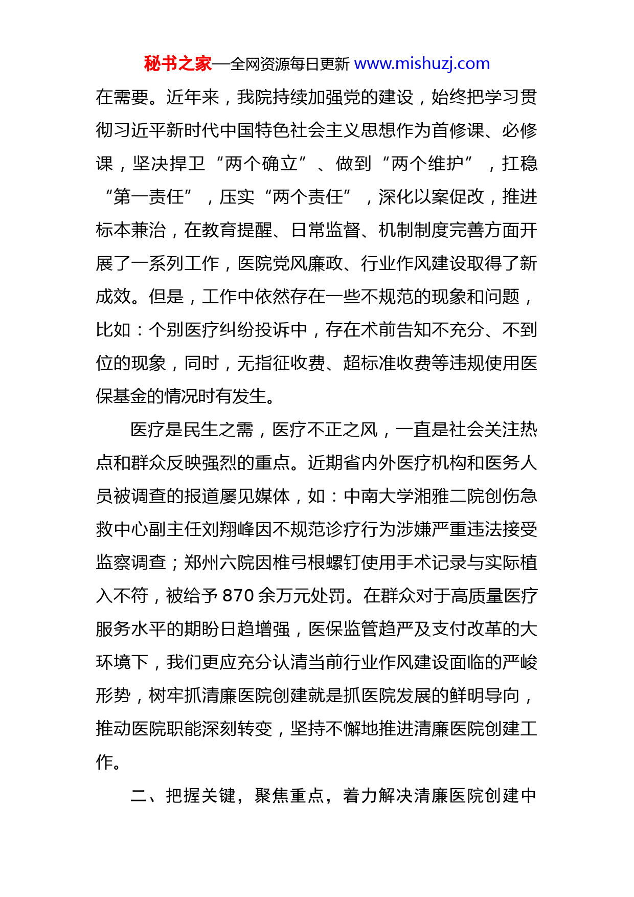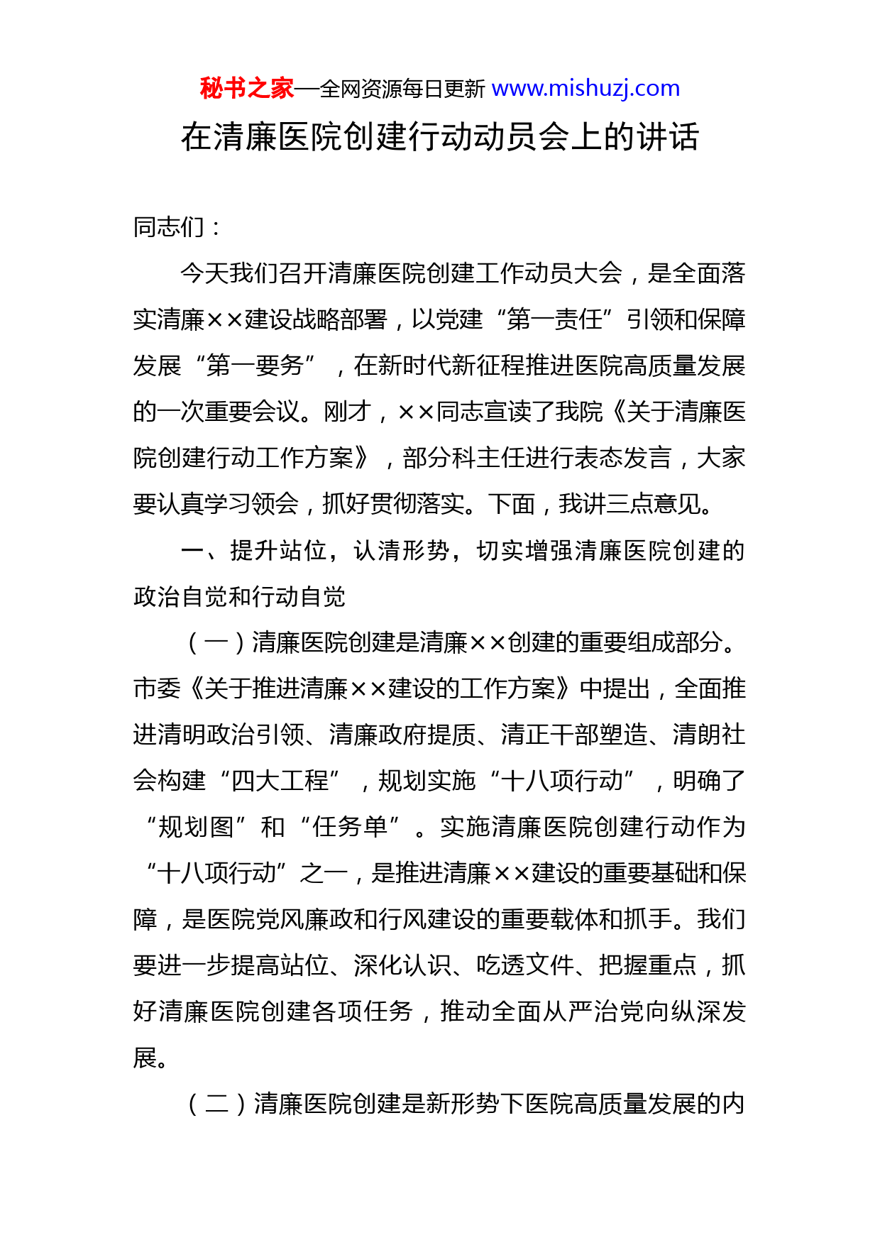 秘书之家—全网资源每日更新www.mishuzj.com在清廉医院创建行动动员会上的讲话同志们:今天我们召开清廉医院创建工作动员大会,是全面落实清廉××建设战略部署,以党建“第一责任”引领和保障发展“第一要务”,在新时代新征程推进医院高质量发展的一次重要会议。刚才,××同志宣读了我院《关于清廉医院创建行动工作方案》,部分科主任进行表态发言,大家要认真学习领会,抓好贯彻落实。下面,我讲三点意见。一、提升站位,认清形势,切实增强清廉医院创建的政治自觉和行动自觉(一)清廉医院创建是清廉××创建的重要组成部分。市委《关于推进清廉××建设的工作方案》中提出,全面推进清明政治引领、清廉政府提质、清正干部塑造、清朗社会构建“四大工程”,规划实施“十八项行动”,明确了“规划图”和“任务单”。实施清廉医院创建行动作为“十八项行动”之一,是推进清廉××建设的重要基础和保障,是医院党风廉政和行风建设的重要载体和抓手。我们要进一步提高站位、深化认识、吃透文件、把握重点,抓好清廉医院创建各项任务,推动全面从严治党向纵深发展。(二)清廉医院创建是新形势下医院高质量发展的内秘书之家—全网资源每日更新www.mishuzj.com在需要。近年来,我院持续加强党的建设,始终把学习贯彻习近平新时代中国特色社会主义思想作为首修课、必修课,坚决捍卫“两个确立”、做到“两个维护”,扛稳“第一责任”,压实“两个责任”,深化以案促改,推进标本兼治,在教育提醒、日常监督、机制制度完善方面开展了一系列工作,医院党风廉政、行业作风建设取得了新成效。但是,工作中依然存在一些不规范的现象和问题,比如:个别医疗纠纷投诉中,存在术前告知不充分、不到位的现象,同时,无指征收费、超标准收费等违规使用医保基金的情况时有发生。医疗是民生之需,医疗不正之风,一直是社会关注热点和群众反映强烈的重点。近期省内外医疗机构和医务人员被调查的报道屡见媒体,如:中南大学湘雅二院创伤急救中心副主任刘翔峰因不规范诊疗行为涉嫌严重违法接受监察调查;郑州六院因椎弓根螺钉使用手术记录与实际植入不符,被给予870余万元处罚。在群众对于高质量医疗服务水平的期盼日趋增强,医保监管趋严及支付改革的大环境下,我们更应充分认清当前行业作风建设面临的严峻形势,树牢抓清廉医院创建就是抓医院发展的鲜明导向,推动医院职能深刻转变,坚持不懈地推进清廉医院创建工作。二、把握关键,聚焦重点,着力解决清廉医院创建中秘书之家—全网资源每日更新www.mishuzj.com的突出问题离开问题抓清廉医院创建,效果必然大打折扣。清廉医院建设要抓住主要矛盾的主要方面,重点聚焦突出问题,准确把脉、精准施治。(一)始终把“人”作为关键性、根本性问题来抓。成事之要,关键在人。一要加强干部队伍和人才建设。要坚持党管干部、党管人才原则,严把选人用人政治关、品行关、能力关、作风关、廉洁关。二要持续深化作风建设。要以“能力作风建设年”活动为契机,持续深入实施《全国医疗机构及其工作人员廉洁从业行动计划(2021—2024年)》,严格落实廉洁从业九项准则,强化宗旨意识,查摆收红包、吃回扣、欺诈骗保、过度检查、不合理收费及用药等突出问题,切实解决庸、懒、散、慢、拖、瞒等现象。三要紧盯“关键少数”,抓好重点岗位管理,明确重点岗位范围、轮岗期限、廉洁教育、廉洁风险排查和防控等具体要求,降低岗位廉政风险。四要加强医德医风建设。要强化医务人员医德考评体系效用,切实将医德考评结果与医务人员的晋职晋级、岗位聘用、薪酬待遇等直接挂钩,增强考评的激励和约束作用。(二)充分发挥专项行动效能效用。要深入开展纠治医疗领域腐败和作风问题专项行动,进一步整顿和规范医疗秩序。近期,我们在全院范围重点……专项行动,以专项秘书之家—全网资源每日更新www.mishuzj.com行动为抓手,一是加强医疗质量监管,规范医疗服务行为,持续改进服务流程、服务措施,切实改善人民群众就医体验。二是加强合理用药管理、耗材管理、检验检查管理,落实处方点评制度,建立药品、耗材的跟踪监控和超常使用预警制度,严格控制医疗费用的不合理增长。三是紧盯医疗保险、医药购销、建设项目等重点领域、关键环节,落实关口前移、抓早抓小措施。(三)抓紧制度“笼子”促进长效长治。梳理排查职能职责范围内现行的决策制度、管理制度、监督制度,查缺补漏,尽快健全制度体系。一要严格落实党委会、院长办公会议事制度,聚焦重大事项决策、医药购销、基建工程等“三重一大”事项和权力运行关键环节,实施预防式、全程式监督。二要推进权力运行公开透明。要全面加强医院各类信息公开工作,细化公开内容、公开范围、公开形式,涉及“三重一大”以及医院职工、人民群众切身利益等信息,积极运用信息化手段,搭建信息公开平台,保障干部职工的知情权、参与权、监督权。三要把建立健全工作制度、管理制度、考核制度和督促检查制度作为创建重要内容,聚焦医药购销和医疗服务中侵害群众利益的问题,聚焦医务人员收受红包回扣以及采购环节的顽瘴痼疾,不断总结经验做法、完善制度机制、补齐短板漏洞。要强化制度执行,划出“红线”,标出“雷区”,架起秘书