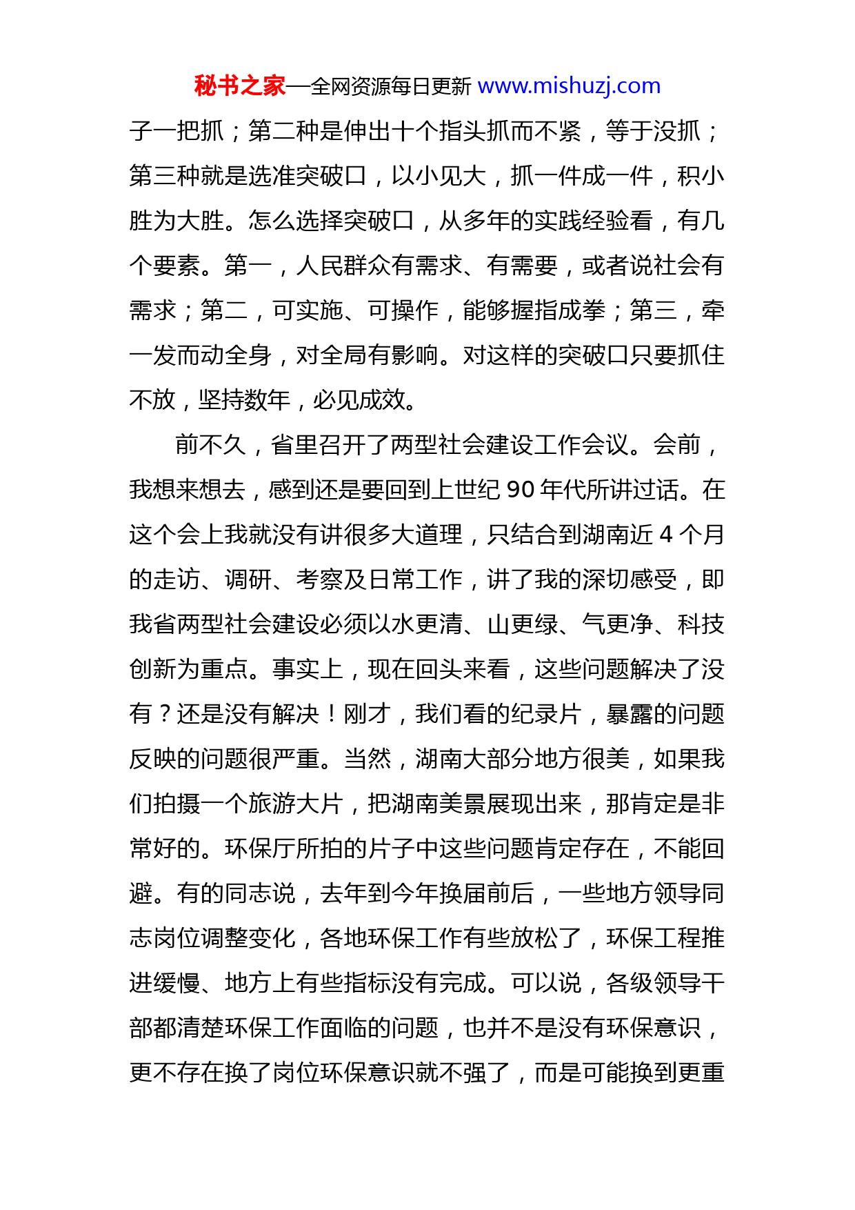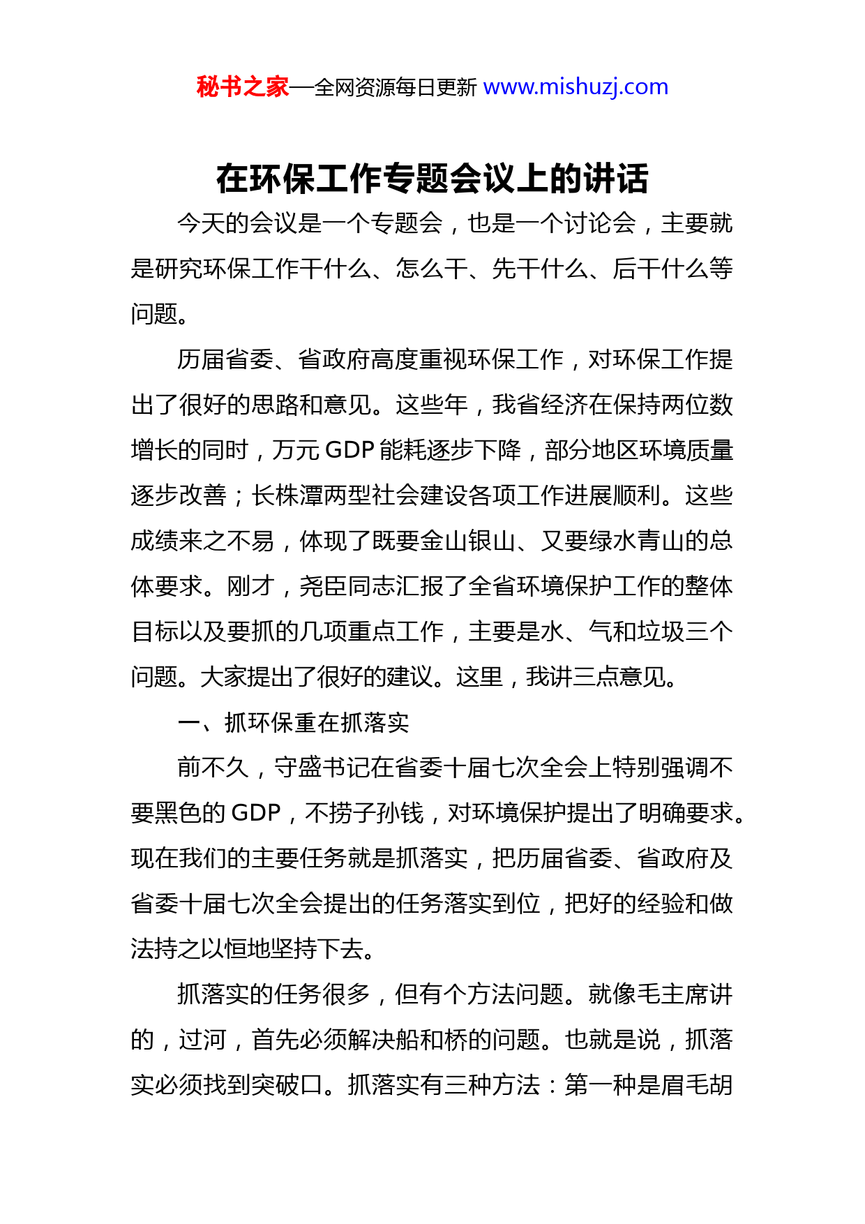 秘书之家—全网资源每日更新www.mishuzj.com在环保工作专题会议上的讲话今天的会议是一个专题会,也是一个讨论会,主要就是研究环保工作干什么、怎么干、先干什么、后干什么等问题。历届省委、省政府高度重视环保工作,对环保工作提出了很好的思路和意见。这些年,我省经济在保持两位数增长的同时,万元GDP能耗逐步下降,部分地区环境质量逐步改善;长株潭两型社会建设各项工作进展顺利。这些成绩来之不易,体现了既要金山银山、又要绿水青山的总体要求。刚才,尧臣同志汇报了全省环境保护工作的整体目标以及要抓的几项重点工作,主要是水、气和垃圾三个问题。大家提出了很好的建议。这里,我讲三点意见。一、抓环保重在抓落实前不久,守盛书记在省委十届七次全会上特别强调不要黑色的GDP,不捞子孙钱,对环境保护提出了明确要求。现在我们的主要任务就是抓落实,把历届省委、省政府及省委十届七次全会提出的任务落实到位,把好的经验和做法持之以恒地坚持下去。抓落实的任务很多,但有个方法问题。就像毛主席讲的,过河,首先必须解决船和桥的问题。也就是说,抓落实必须找到突破口。抓落实有三种方法:第一种是眉毛胡秘书之家—全网资源每日更新www.mishuzj.com子一把抓;第二种是伸出十个指头抓而不紧,等于没抓;第三种就是选准突破口,以小见大,抓一件成一件,积小胜为大胜。怎么选择突破口,从多年的实践经验看,有几个要素。第一,人民群众有需求、有需要,或者说社会有需求;第二,可实施、可操作,能够握指成拳;第三,牵一发而动全身,对全局有影响。对这样的突破口只要抓住不放,坚持数年,必见成效。前不久,省里召开了两型社会建设工作会议。会前,我想来想去,感到还是要回到上世纪90年代所讲过话。在这个会上我就没有讲很多大道理,只结合到湖南近4个月的走访、调研、考察及日常工作,讲了我的深切感受,即我省两型社会建设必须以水更清、山更绿、气更净、科技创新为重点。事实上,现在回头来看,这些问题解决了没有?还是没有解决!刚才,我们看的纪录片,暴露的问题反映的问题很严重。当然,湖南大部分地方很美,如果我们拍摄一个旅游大片,把湖南美景展现出来,那肯定是非常好的。环保厅所拍的片子中这些问题肯定存在,不能回避。有的同志说,去年到今年换届前后,一些地方领导同志岗位调整变化,各地环保工作有些放松了,环保工程推进缓慢、地方上有些指标没有完成。可以说,各级领导干部都清楚环保工作面临的问题,也并不是没有环保意识,更不存在换了岗位环保意识就不强了,而是可能换到更重秘书之家—全网资源每日更新www.mishuzj.com要的岗位,政绩观发生了变化,有GDP增速考核等方面的压力。也就是说,在加强环保工作方面,不是再要去说更多的大道理,关键是要明确怎么干。环保工作千头万绪,责任重、压力大,人民群众反应强烈,许多问题由来已久,原因错综复杂。我们既要提高认识、坚持不懈、持之以恒、紧抓不放,又要从一件一件看得见、摸得着、能见效,人民群众感受得到的具体事情抓起,力争一年一个变化,一年向前迈进一步,逐步把中央和省委提出的生态文明建设的目标和要求,变为一个一个实际行动,把中央提出的“美丽中国”、省委提出的“绿色湖南”建设目标落到实处。二、抓环保要明白抓什么抓环保要干的事情很多。比如,大气污染、雾霾、农村环境、污水、垃圾治理,以及企业排放问题,等等。这些账是多年欠下的,不是一下就能治理好的。“十二五”过去快三年了,到“十二五”末的这两年多时间,到底抓什么?我们就要明确一点、实在一点,这样开会才能统一思想,才能开出实际效果。通过认真分析、仔细思考,我建议抓好“五个一”。一是叫响一个口号。“资源节约型、环境友好型”这个口号非常好,党的十六大就已提出。我们到底抓什么,简单地概括,就是“既要金山银山,又要绿水青山;若毁秘书之家—全网资源每日更新www.mishuzj.com绿水青山,宁弃金山银山”。这个口号符合我省实际,必须始终强调。全省上下有没有这个决心,还可以听听各方面意见,结合实际逐步完善。二是坚持一个原则。就是“新账不能再欠、老账努力去还”的原则,再也不能走先污染后治理的老路。这个原则在各项工作中都要坚持。三是确定一个“一号工程”。现在,国家已为湘江流域重金属污染治理搞了一个国家级规划。去年8月,我省以湘江流域重金属污染治理工程为首的十大环保工程已经正式启动,环保部立了项。我们就是要以湘江保护与治理为突破口,以一带十,以一促十,来推动整个环保工作。如果十大工程继续推进,就要确定一个“一号工程”,然后确定各个阶段的目标措施,见到实实在在的效果。这个“一号工程”也不是轻而易举就能干的,要迎难而上,兑现向老百姓作出的承诺。四是实行“一票否决”。这个问题还要认真研究,不是所有的情况都“一票否决”。要出台具体的实施办法,明确出现什么样的情况就“一票否决”。五是做到“一支笔审批”。行政审批从政府的职能讲,要做到该下放的坚决下放,下放的要下放彻底,该严的要严到底,这就是“一支笔审批”。在哪些问题上实行“一支笔审批”,要具有可操作性。在省级层面,项目的环评秘书之家—全网资源每日更新www.mishuzj.com审批,“这支笔”就交给肇