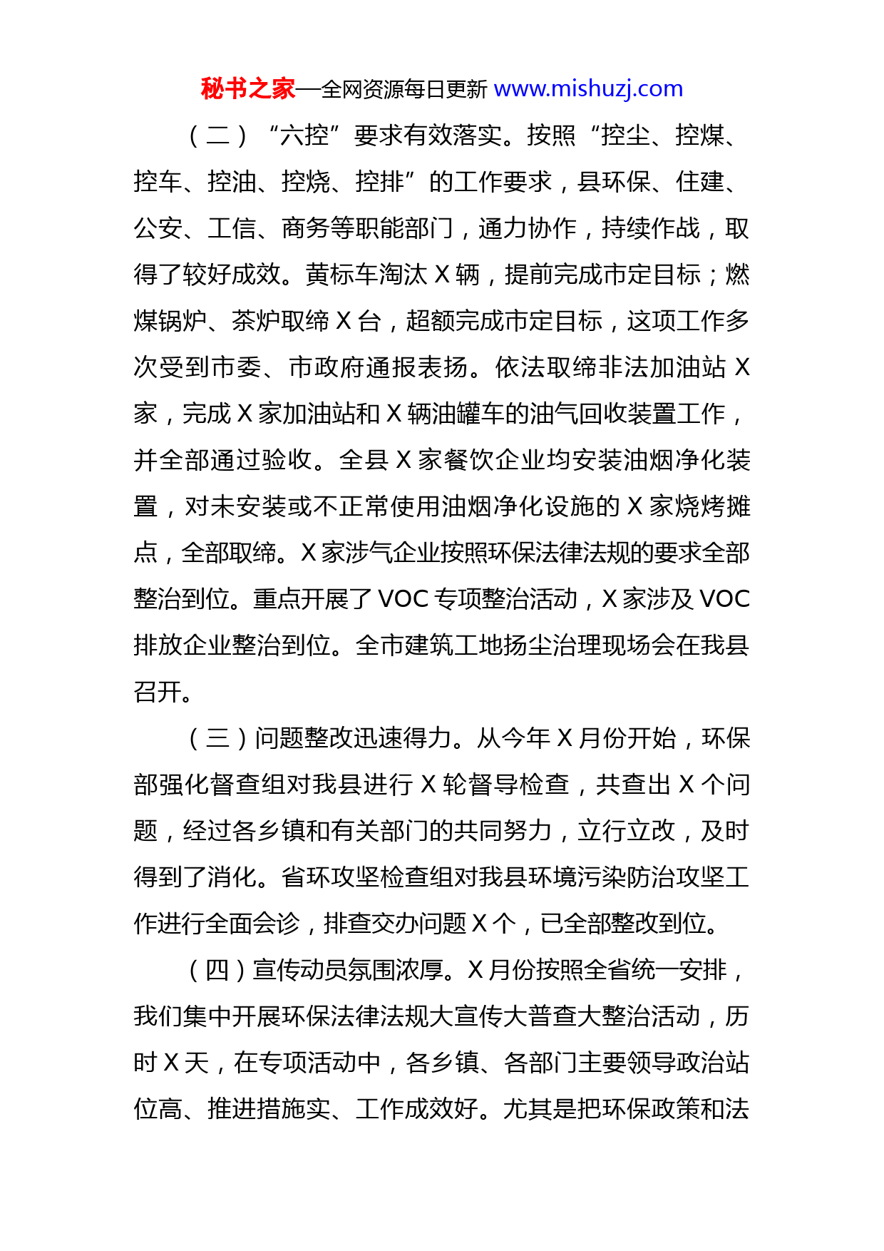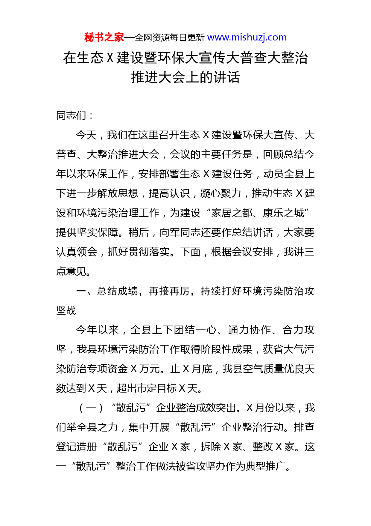 秘书之家—全网资源每日更新www.mishuzj.com在生态X建设暨环保大宣传大普查大整治推进大会上的讲话同志们:今天,我们在这里召开生态X建设暨环保大宣传、大普查、大整治推进大会,会议的主要任务是,回顾总结今年以来环保工作,安排部署生态X建设任务,动员全县上下进一步解放思想,提高认识,凝心聚力,推动生态X建设和环境污染治理工作,为建设“家居之都、康乐之城”提供坚实保障。稍后,向军同志还要作总结讲话,大家要认真领会,抓好贯彻落实。下面,根据会议安排,我讲三点意见。一、总结成绩,再接再厉,持续打好环境污染防治攻坚战今年以来,全县上下团结一心、通力协作、合力攻坚,我县环境污染防治工作取得阶段性成果,获省大气污染防治专项资金X万元。止X月底,我县空气质量优良天数达到X天,超出市定目标X天。(一)“散乱污”企业整治成效突出。X月份以来,我们举全县之力,集中开展“散乱污”企业整治行动。排查登记造册“散乱污”企业X家,拆除X家、整改X家。这一“散乱污”整治工作做法被省攻坚办作为典型推广。秘书之家—全网资源每日更新www.mishuzj.com(二)“六控”要求有效落实。按照“控尘、控煤、控车、控油、控烧、控排”的工作要求,县环保、住建、公安、工信、商务等职能部门,通力协作,持续作战,取得了较好成效。黄标车淘汰X辆,提前完成市定目标;燃煤锅炉、茶炉取缔X台,超额完成市定目标,这项工作多次受到市委、市政府通报表扬。依法取缔非法加油站X家,完成X家加油站和X辆油罐车的油气回收装置工作,并全部通过验收。全县X家餐饮企业均安装油烟净化装置,对未安装或不正常使用油烟净化设施的X家烧烤摊点,全部取缔。X家涉气企业按照环保法律法规的要求全部整治到位。重点开展了VOC专项整治活动,X家涉及VOC排放企业整治到位。全市建筑工地扬尘治理现场会在我县召开。(三)问题整改迅速得力。从今年X月份开始,环保部强化督查组对我县进行X轮督导检查,共查出X个问题,经过各乡镇和有关部门的共同努力,立行立改,及时得到了消化。省环攻坚检查组对我县环境污染防治攻坚工作进行全面会诊,排查交办问题X个,已全部整改到位。(四)宣传动员氛围浓厚。X月份按照全省统一安排,我们集中开展环保法律法规大宣传大普查大整治活动,历时X天,在专项活动中,各乡镇、各部门主要领导政治站位高、推进措施实、工作成效好。尤其是把环保政策和法秘书之家—全网资源每日更新www.mishuzj.com律法规编排成传统快板和豫剧小品进行巡回演出,动员群众防污治污,这一做法得到了省市领导高度评价。我县被评为全省先进单位,向军同志在全省总结表彰大会上作了典型发言。在今年严峻的环保形势下取得这样的成绩,弥足珍贵,这是在座各位辛勤付出和共同努力的结果。在肯定成绩的同时,我们也要清醒的认识到,我县的环境污染防治工作仍然存在很多不足和短板。如,扬尘污染源监管不够到位、“散乱污”企业整治取缔还存在漏洞、水污染攻坚重点项目进展缓慢、企业环保治理有待提高等等。对此,我们要高度重视,在下一步工作中着力改进。二、围绕目标,真抓实干,着力做好生态X建设各项工作建设生态X,是县委、县政府贯彻落实中央、省、市生态文明战略部署作出的一项决策,是改善城乡环境、建设富裕文明和谐美丽新X的重要载体和抓手。大家要进一步统一思想,明确目标,真抓实干,全面加快生态X建设进程。(一)要提高认识。习近平总书记强调:要把生态环境保护放在更加突出位置,环境就是民生,青山就是美丽,蓝天也是幸福。要着力推动生态环境保护,像保护眼睛一样保护环境,像对待生命一样对待生态环境。生态环秘书之家—全网资源每日更新www.mishuzj.com境是一个地方对外展示形象的窗口,事关X科学发展、长远发展,事关群众切身利益。县委、县政府推进生态X建设,不是简单地提一个口号,而是根据我县的实际情况,审时度势作出的一项重要决策。一是上级有要求。今年以来,中央、省、市高度重视环境污染治理工作,多次召开会议,派督导组、巡查组督导检查,可以说,每天都有迎检任务。对照中央、省、市要求,目前我们还存在环保设施不完善、“散乱污”企业拆除不到位等问题。为此,我们要把生态X建设放到重要位置,切实抓紧、抓好、抓出成效。二是群众有期盼。随着经济社会快速发展,群众收入不断提高,广大老百姓对改善生产生活环境的要求越来越迫切,特别是盼整洁、盼卫生、盼发展的愿望越来越强烈。开展生态X建设,就是要改善城乡环境面貌,为广大群众提供安居乐业的环境,这是顺应民心民意、符合群众期盼的重要举措。三是我们有基础。近年来,我们通过“六区”建设,中心城区提质扩容和美丽乡村建设扎实有效,打造了一批亮点,积累了成功经验,为生态X建设打下坚实基础。(二)要明确任务。生态X建设是一项长期而艰巨的任务,必须把握方向,突出重点,科学推进。生态X建设的工作目标是:牢固树立“创新、协调、绿色、开放、共享”的发展理念,坚持党建统领,以生态秘书之家—全网资源每日更新www.mishuzj.com理念为引领,以“六区建设”为重点,以“八大创建”活动为载体,着力推动“生态产业、生态城市、生态农村、生态人文、生态治理”等五大体系建设,力争用X—X年时间实现城乡全域生态化,把X打
