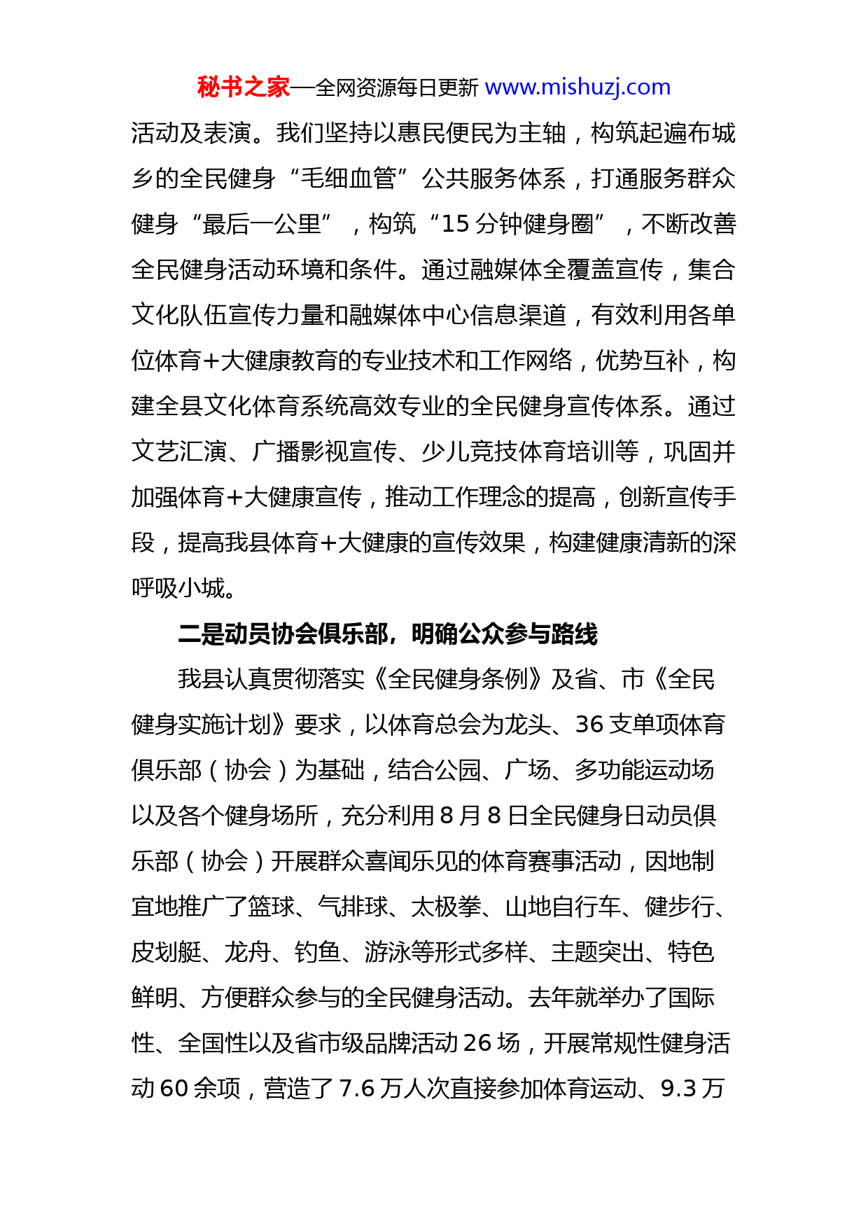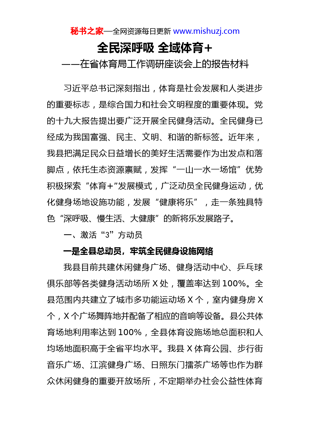 秘书之家—全网资源每日更新www.mishuzj.com全民深呼吸全域体育+——在省体育局工作调研座谈会上的报告材料习近平总书记深刻指出,体育是社会发展和人类进步的重要标志,是综合国力和社会文明程度的重要体现。党的十九大报告提出要广泛开展全民健身活动。全民健身已经成为我国富强、民主、文明、和谐的新标签。近年来,我县把满足民众日益增长的美好生活需要作为出发点和落脚点,依托生态资源禀赋,发挥“一山一水一场馆”优势积极探索“体育+”发展模式,广泛动员全民健身运动,优化健身场地设施功能,发展“健康将乐”,走一条独具特色“深呼吸、慢生活、大健康”的新将乐发展路子。一、激活“3”方动员一是全县总动员,牢筑全民健身设施网络我县目前共建休闲健身广场、健身活动中心、乒乓球俱乐部等各类健身活动场所X处,覆盖率达到100%。全县范围内共建立了城市多功能运动场X个,室内健身房X个,X个广场舞阵地并配备了相应的音响等设备。县公共体育场地利用率达到100%,全县体育设施场地总面积和人均场地面积高于全省平均水平。我县X体育公园、步行街音乐广场、江滨健身广场、日照东门擂茶广场等也作为群众休闲健身的重要开放场所,不定期举办社会公益性体育秘书之家—全网资源每日更新www.mishuzj.com活动及表演。我们坚持以惠民便民为主轴,构筑起遍布城乡的全民健身“毛细血管”公共服务体系,打通服务群众健身“最后一公里”,构筑“15分钟健身圈”,不断改善全民健身活动环境和条件。通过融媒体全覆盖宣传,集合文化队伍宣传力量和融媒体中心信息渠道,有效利用各单位体育+大健康教育的专业技术和工作网络,优势互补,构建全县文化体育系统高效专业的全民健身宣传体系。通过文艺汇演、广播影视宣传、少儿竞技体育培训等,巩固并加强体育+大健康宣传,推动工作理念的提高,创新宣传手段,提高我县体育+大健康的宣传效果,构建健康清新的深呼吸小城。二是动员协会俱乐部,明确公众参与路线我县认真贯彻落实《全民健身条例》及省、市《全民健身实施计划》要求,以体育总会为龙头、36支单项体育俱乐部(协会)为基础,结合公园、广场、多功能运动场以及各个健身场所,充分利用8月8日全民健身日动员俱乐部(协会)开展群众喜闻乐见的体育赛事活动,因地制宜地推广了篮球、气排球、太极拳、山地自行车、健步行、皮划艇、龙舟、钓鱼、游泳等形式多样、主题突出、特色鲜明、方便群众参与的全民健身活动。去年就举办了国际性、全国性以及省市级品牌活动26场,开展常规性健身活动60余项,营造了7.6万人次直接参加体育运动、9.3万秘书之家—全网资源每日更新www.mishuzj.com人次观摩体育赛事活动的全民健身氛围。截至目前,今年已举办了26场国际国内品牌赛事活动。形成了覆盖单项体育协会、行业体育协会和人群体育协会等全民健身的横向组织网络。引导市民掌握科学的锻炼方法并坚持参加体育锻炼,提高了体育人口比例和市民身体素质。三是动员基层组织,构建体育+大健康体系全县13个乡镇、6个社区设立农体协、老体协,社区设立老年体育辅导站,健全了县、乡镇、村(社区)三级全民健身纵向组织网络。通过组织社会体育指导员为群众开办体育与健康培训讲座,利用县体育中心的全民体质监测中心为市民提供体制监测及健康状况测评,配合县医院制定个性化运动处方和训练计划,同步加强了体医融合和非医疗健康干预。结合县健跑运动协会、自行车协会、太极拳俱乐部、健身气功俱乐部等,合力在全县范围内推行工间操制度,督促其自主举办各项休闲健康运动赛事,促进老年人等重点人群参与到体育锻炼中来,丰富市民锻炼形式,加快了广播体操推广工作,为提升将乐全民体质提供有力的组织保障。目前,全县有各级社会体育指导员共计X名,我县每年负责培训三级社会体育指导员,并开展全县范围内的社体指导员评先表彰活动,全县每万人拥有社会体育指导员已达到30人以上。今年,计划对各级社会体育指导员进行组织再培训,增加一级、二级社会体育指秘书之家—全网资源每日更新www.mishuzj.com导员数量,加强乡镇、村等基层群众体育活动指导工作,努力开展乡村体育锻炼,落实好工间广播体操的推广,发展“健康将乐”。二、延伸“3”个优势一是发挥山地资源优势,创建深呼吸宜居县城我县围绕休闲体育+大健康产业发展,坚持以特色山地优势资源开发为基础,增加休闲体育产品的文化特色和内涵,提高体育水平与健康指标。以“深呼吸”为特色品牌坚持“生态、养生、休闲”导向,努力营造全民健身氛围。通过打造XX公里步行道,将全县的精华景点作为越野及环城跑的各个节点进行串联,全面展示城市风貌和旅游精髓助力将X“杜鹃花海”越野拉练赛、山地自行车骑游活动、中国·X50、100国际越野挑战赛、2020中国将乐国际露营大会(将乐站)、2020全国老年人健步走大联动等大型山地户外项目顺利开展。二是挖掘水生态资源优势,锻造体育+深呼吸品牌我县依托“X省体育产业特色基地暨特色体育小镇”的荣誉称号,挖掘贯穿全县的金溪河流域资源,斥资2亿元建成积善水上训练基地、省船艇运动协会将乐船艇运动基地等两个水上运动基地、四个水上运动训练场和五个水上活动中心,吸引了北华大学龙舟队、山东省