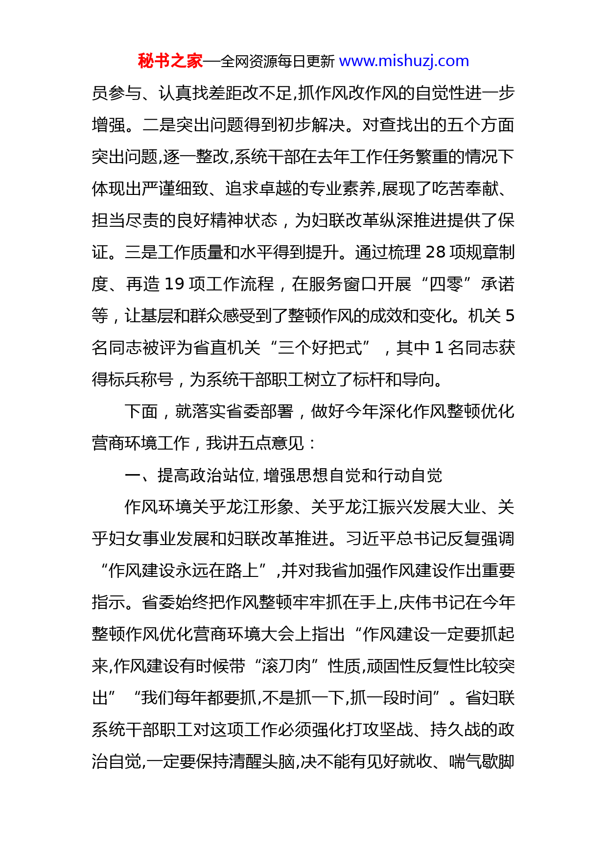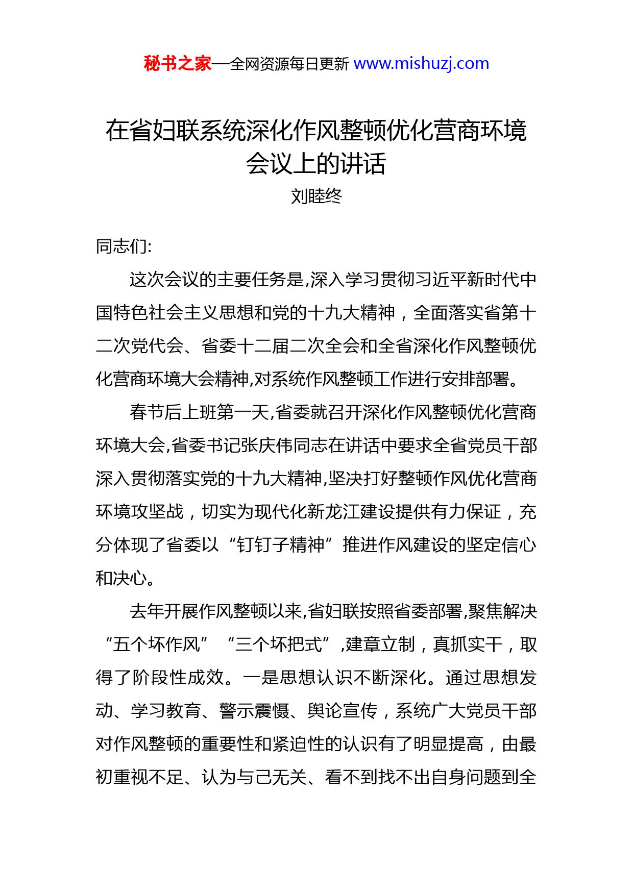 秘书之家—全网资源每日更新www.mishuzj.com在省妇联系统深化作风整顿优化营商环境会议上的讲话刘睦终同志们:这次会议的主要任务是,深入学习贯彻习近平新时代中国特色社会主义思想和党的十九大精神,全面落实省第十二次党代会、省委十二届二次全会和全省深化作风整顿优化营商环境大会精神,对系统作风整顿工作进行安排部署。春节后上班第一天,省委就召开深化作风整顿优化营商环境大会,省委书记张庆伟同志在讲话中要求全省党员干部深入贯彻落实党的十九大精神,坚决打好整顿作风优化营商环境攻坚战,切实为现代化新龙江建设提供有力保证,充分体现了省委以“钉钉子精神”推进作风建设的坚定信心和决心。去年开展作风整顿以来,省妇联按照省委部署,聚焦解决“五个坏作风”“三个坏把式”,建章立制,真抓实干,取得了阶段性成效。一是思想认识不断深化。通过思想发动、学习教育、警示震慑、舆论宣传,系统广大党员干部对作风整顿的重要性和紧迫性的认识有了明显提高,由最初重视不足、认为与己无关、看不到找不出自身问题到全秘书之家—全网资源每日更新www.mishuzj.com员参与、认真找差距改不足,抓作风改作风的自觉性进一步增强。二是突出问题得到初步解决。对查找出的五个方面突出问题,逐一整改,系统干部在去年工作任务繁重的情况下体现出严谨细致、追求卓越的专业素养,展现了吃苦奉献、担当尽责的良好精神状态,为妇联改革纵深推进提供了保证。三是工作质量和水平得到提升。通过梳理28项规章制度、再造19项工作流程,在服务窗口开展“四零”承诺等,让基层和群众感受到了整顿作风的成效和变化。机关5名同志被评为省直机关“三个好把式”,其中1名同志获得标兵称号,为系统干部职工树立了标杆和导向。下面,就落实省委部署,做好今年深化作风整顿优化营商环境工作,我讲五点意见:一、提高政治站位,增强思想自觉和行动自觉作风环境关乎龙江形象、关乎龙江振兴发展大业、关乎妇女事业发展和妇联改革推进。习近平总书记反复强调“作风建设永远在路上”,并对我省加强作风建设作出重要指示。省委始终把作风整顿牢牢抓在手上,庆伟书记在今年整顿作风优化营商环境大会上指出“作风建设一定要抓起来,作风建设有时候带“滚刀肉”性质,顽固性反复性比较突出”“我们每年都要抓,不是抓一下,抓一段时间”。省妇联系统干部职工对这项工作必须强化打攻坚战、持久战的政治自觉,一定要保持清醒头脑,决不能有见好就收、喘气歇脚秘书之家—全网资源每日更新www.mishuzj.com的想法,切实把思想和行动统一到中央和省委部署要求上来,发扬“钉钉子精神”,保持钻劲和韧劲,自觉把改进作风作为一项重要政治任务,以更高的标准、更严的要求抓好作风整顿。牢固树立“整顿作风人人有责、人人参与”“人人、事事、处处是环境”的理念,下大气力集中解决思想保守、创新意识不强,流程不优、职责不清,形式主义、官僚主义新表现,工作不细不实、服务妇女不精准,群众工作本领不强、能力不足五个方面突出问题,明确攻坚目标,鼓足攻坚气势,细化攻坚措施,切实管出习惯、抓出成效、化风成俗,推动整顿作风取得实质性突破。同时,扭住解放思想这个“总开关”,围绕中心,服务大局,进一步增强市场意识、法治意识、服务意识,为女企业家、女创业者、巾帼现代农业示范基地、巾帼合作组织等市场主体提供切实服务,助推她们发展壮大、能力提升,促进营商环境优化、龙江振兴发展。二、坚持精准发力,重点整治“三低”问题勇于自我革命是整顿作风顽疾的前提和保证。我们坚持刀刃向内、开门查摆,这次制定的实施方案,广泛征求了机关各部室、各事业单位意见,经党组(扩大)会议研究,提出整治精细化程度低、工作效率低,联系妇女频率低问题,提出“三整治三争当三展示”活动载体,体现了妇联特色,符合妇联实际。在抓精细化上,系统干部要树立秘书之家—全网资源每日更新www.mishuzj.com精细化工作态度,认真落实习近平总书记提出的“掌握情况要细,分析问题要细,制定方案要细,配套措施要细,工作落实要细”的要求,让“五个要细”成为全体干部的工作准则和行为规范。要采取有效措施引导干部加强学习实践,掌握科学方法,熟知与妇联工作密切相关的法规政策、程序规范,全面提升能力素质,争当妇联“工匠”,多出“工作精品”,善于在精细中出彩,于细微处见精神、见境界、见水平,在解决工作“跑粗”上取得明显成效;在抓工作效率上,大力倡导在保证质量前提下的提高效率,系统干部要通过创新工作方式方法,提高工作效率,狠抓工作落实,争当实干模范,多出“创新案例”,推进妇联“强基层、转方式、改作风”,确保中央和省委有关群团改革的决策落地生根,确保妇联改革任务如期完成;在抓联系群众上,系统干部牢牢要把握联系和服务群众的生命线,进一步落实双月下基层工作周、妇女需求调研月、省妇联常(执)委联系制度、领导干部接访制度,推动“下基层、访妇情、办实事”常态化。创新联系服务妇女群众方法手段,用好基层联系点、社区服务点、信访窗口、姐妹网群等平台,更多运用新媒体手段,增强与妇女群众的联系频次和黏性,畅通联系妇女“最后一公里”,当好贴心“娘家”人,增强妇女群众对妇