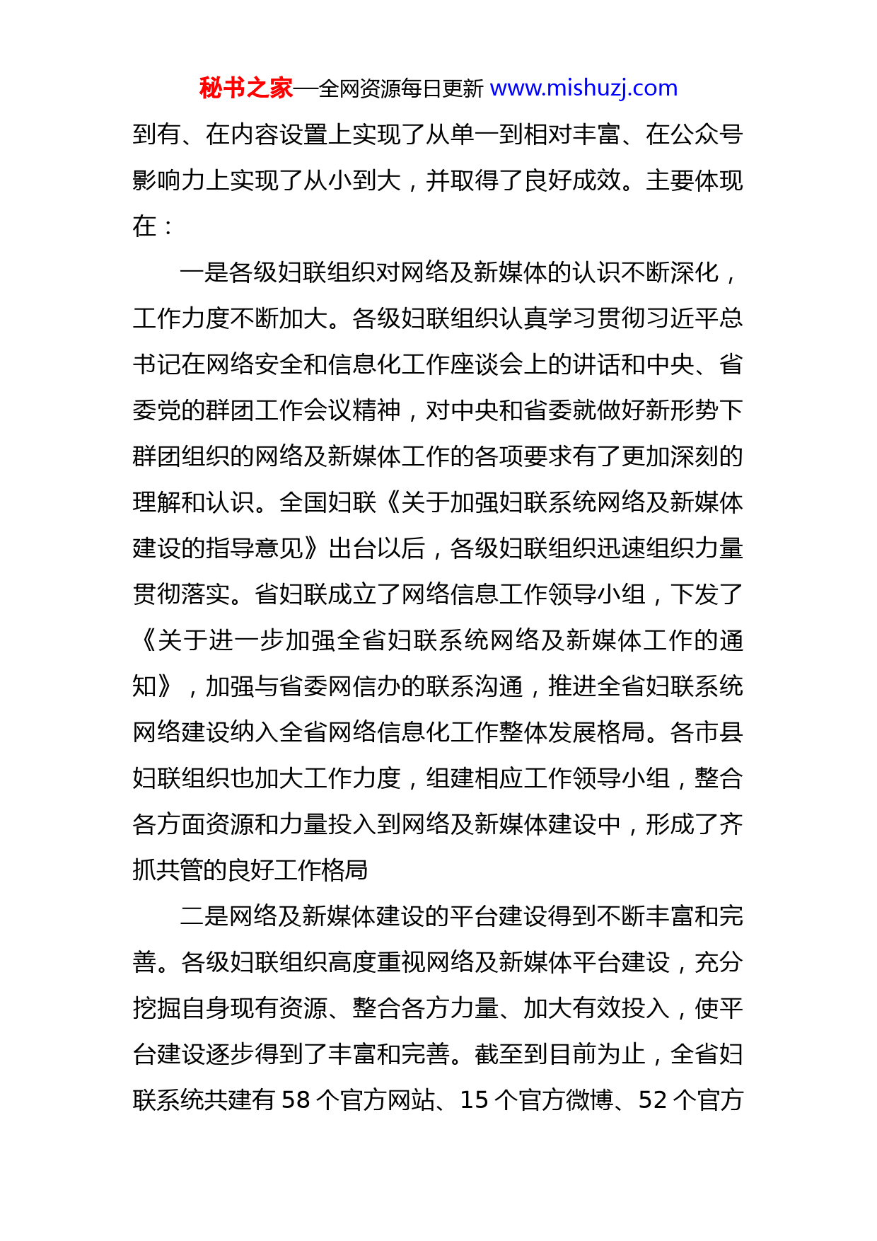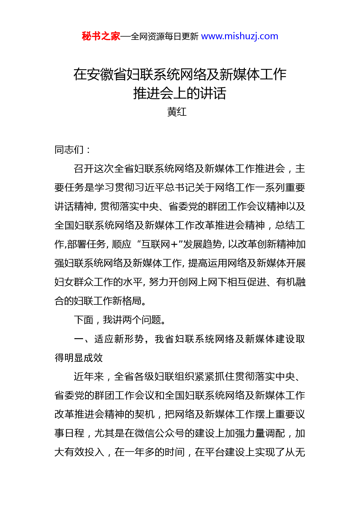 秘书之家—全网资源每日更新www.mishuzj.com在安徽省妇联系统网络及新媒体工作推进会上的讲话黄红同志们:召开这次全省妇联系统网络及新媒体工作推进会,主要任务是学习贯彻习近平总书记关于网络工作一系列重要讲话精神,贯彻落实中央、省委党的群团工作会议精神以及全国妇联系统网络及新媒体工作改革推进会精神,总结工作,部署任务,顺应“互联网+”发展趋势,以改革创新精神加强妇联系统网络及新媒体工作,提高运用网络及新媒体开展妇女群众工作的水平,努力开创网上网下相互促进、有机融合的妇联工作新格局。下面,我讲两个问题。一、适应新形势,我省妇联系统网络及新媒体建设取得明显成效近年来,全省各级妇联组织紧紧抓住贯彻落实中央、省委党的群团工作会议和全国妇联系统网络及新媒体工作改革推进会精神的契机,把网络及新媒体工作摆上重要议事日程,尤其是在微信公众号的建设上加强力量调配,加大有效投入,在一年多的时间,在平台建设上实现了从无秘书之家—全网资源每日更新www.mishuzj.com到有、在内容设置上实现了从单一到相对丰富、在公众号影响力上实现了从小到大,并取得了良好成效。主要体现在:一是各级妇联组织对网络及新媒体的认识不断深化,工作力度不断加大。各级妇联组织认真学习贯彻习近平总书记在网络安全和信息化工作座谈会上的讲话和中央、省委党的群团工作会议精神,对中央和省委就做好新形势下群团组织的网络及新媒体工作的各项要求有了更加深刻的理解和认识。全国妇联《关于加强妇联系统网络及新媒体建设的指导意见》出台以后,各级妇联组织迅速组织力量贯彻落实。省妇联成立了网络信息工作领导小组,下发了《关于进一步加强全省妇联系统网络及新媒体工作的通知》,加强与省委网信办的联系沟通,推进全省妇联系统网络建设纳入全省网络信息化工作整体发展格局。各市县妇联组织也加大工作力度,组建相应工作领导小组,整合各方面资源和力量投入到网络及新媒体建设中,形成了齐抓共管的良好工作格局二是网络及新媒体建设的平台建设得到不断丰富和完善。各级妇联组织高度重视网络及新媒体平台建设,充分挖掘自身现有资源、整合各方力量、加大有效投入,使平台建设逐步得到了丰富和完善。截至到目前为止,全省妇联系统共建有58个官方网站、15个官方微博、52个官方秘书之家—全网资源每日更新www.mishuzj.com微信公众号。特别是在妇联组织的官方微信公众号建设方面,工作力度有了明显加强,与去年底相比,官方微信公众号的数量增加了一倍多。其中16个省辖市全部开通了官方微信公众号,105个县(市、区)中有35个开通了官方微信公众号(安庆、黄山、铜陵和阜阳基本做到了县区全覆盖,合肥各县区也将在今年底全部开通微信公众号),还有部分县区正在试运营中,也即将开通,微信公众号平台建设的势头发展良好。三是网络及新媒体建设的运营质量不断提高。经过一段时间的经验积累与运营发展,各地的官方微信公众号注重实效性、突出原创性、加强可读性、关注实用性,牢固树立内容为王的思想,重点打造重大时政新闻、妇女民生家庭教育、爱情婚姻、女性创业、巾帼维权等互动和服务功能,同时注重推送创业故事、“微视频”法律讲堂,“实用”生活小窍门,“健康”养生等栏目,为阅读群体提供更广的信息服务,订阅数和关注度逐步增加,在一定程度提升了我省妇女工作的影响力。省妇联“安徽徽姑娘”官方微信公众号上线一年多来,得到各地的大力支持和配合,目前用户数达3万余人,今年以来多次进入全国省级妇联微信公众号传播指数排行榜前十位,在安徽省政务微信排名中也始终位居前列。合肥、马鞍山、铜陵、淮北、蚌埠等地的微信公众号也多次进入全国市级妇联系统秘书之家—全网资源每日更新www.mishuzj.com微信公众号的前50强,六安的微信公众号还有过因评选第一届“十大女杰”冲击全国地市级榜单第一的优异成绩。四是全省妇联系统的网络及新媒体影响力不断扩大。伴随着对新媒体的不断认识和深化,各级妇联组织对运用新媒体开展妇女工作更加得心应手,妇联工作在网络领域的影响力也不断扩大。如合肥在“合肥女性”微信公众号组织的“最美女护士”“最美女村官”投票评议时投票人数达30万人,马鞍山在"诗城女性"上策划的“指尖上的美丽”——魅力女性主题艺术展、“城市的记忆·秀秀我家的老物件”、"王子要找灰姑娘,我们要找徽姑娘"等“微活动”,吸引了众多粉丝参与,其中“指尖上的美丽”线上共吸引45万人次参观,累计投票10万余张。芜湖、安庆、黄山、六安等地充分运用微信公众号广泛宣传在抗洪抢险斗争中涌现出来的女英雄、女干部,广泛动员全社会参与到抗洪抢险各项工作中,赢得了党政领导和广大群众的赞誉。省妇联“徽姑娘”微信公众号抓住重大热点事件,策划了“总理飞赴安徽,直击抗洪第一线”、“安徽挺住!多地遭遇暴雨,16市县发布暴雨红色预警”、“徽姑娘”电子商务创业创新大赛投票、“全国最美家庭”事迹展播等多个活动,每次活动的参与人数都达到万人以上。10月17日,我们与相关部门联合举办的安徽省2016年“最美家庭”“最美家庭成员”颁奖典礼,首次采取网易直播方秘书之家—全网资源每日更新www.mishuzj.com式,