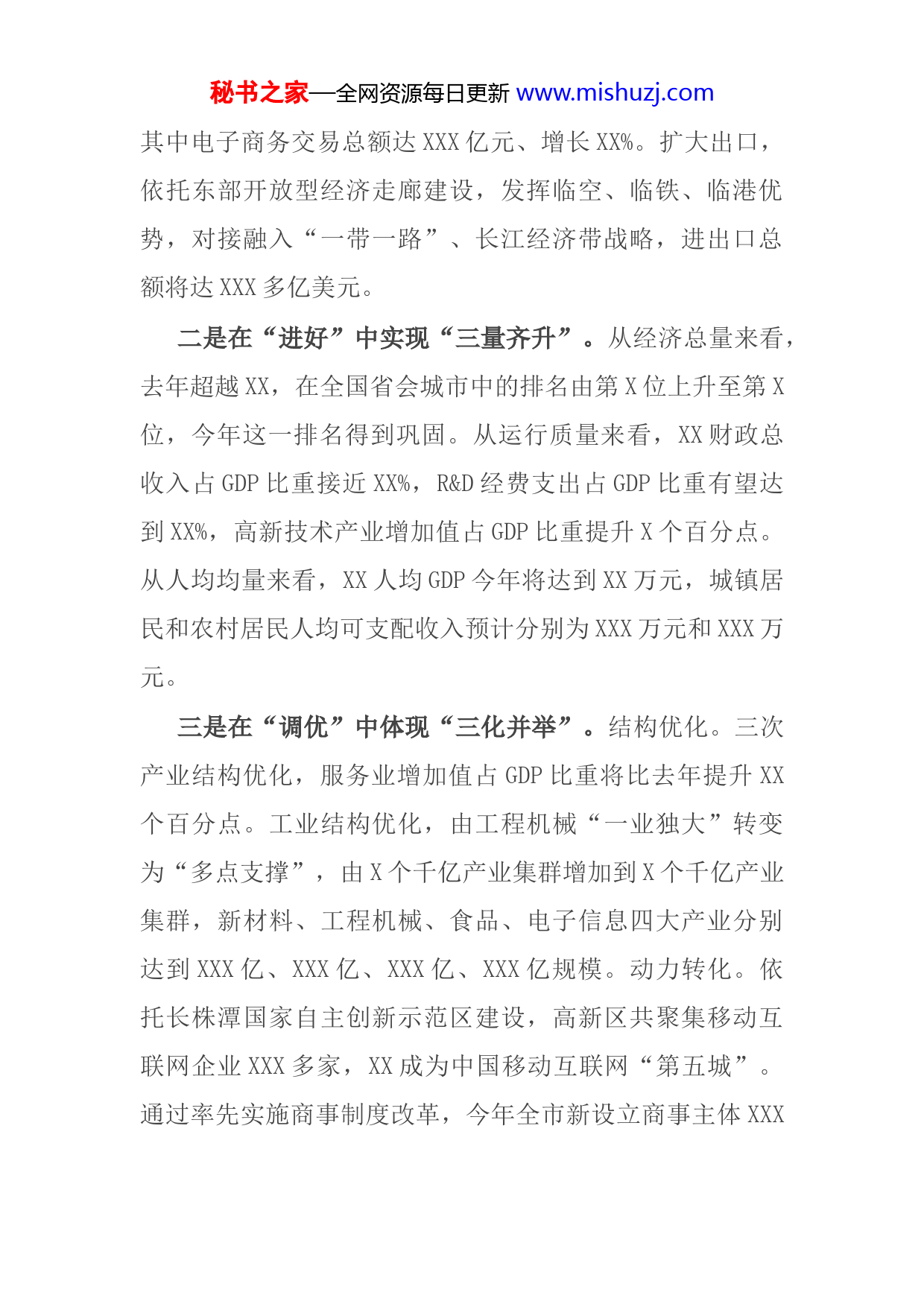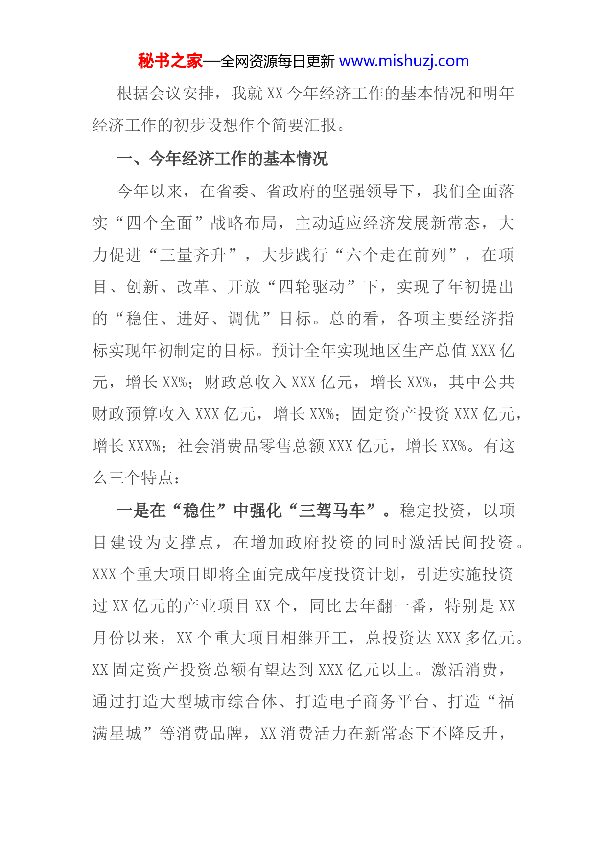 秘书之家—全网资源每日更新www.mishuzj.com根据会议安排,我就XX今年经济工作的基本情况和明年经济工作的初步设想作个简要汇报。一、今年经济工作的基本情况今年以来,在省委、省政府的坚强领导下,我们全面落实“四个全面”战略布局,主动适应经济发展新常态,大力促进“三量齐升”,大步践行“六个走在前列”,在项目、创新、改革、开放“四轮驱动”下,实现了年初提出的“稳住、进好、调优”目标。总的看,各项主要经济指标实现年初制定的目标。预计全年实现地区生产总值XXX亿元,增长XX%;财政总收入XXX亿元,增长XX%,其中公共财政预算收入XXX亿元,增长XX%;固定资产投资XXX亿元,增长XXX%;社会消费品零售总额XXX亿元,增长XX%。有这么三个特点:一是在“稳住”中强化“三驾马车”。稳定投资,以项目建设为支撑点,在增加政府投资的同时激活民间投资。XXX个重大项目即将全面完成年度投资计划,引进实施投资过XX亿元的产业项目XX个,同比去年翻一番,特别是XX月份以来,XX个重大项目相继开工,总投资达XXX多亿元。XX固定资产投资总额有望达到XXX亿元以上。激活消费,通过打造大型城市综合体、打造电子商务平台、打造“福满星城”等消费品牌,XX消费活力在新常态下不降反升,秘书之家—全网资源每日更新www.mishuzj.com其中电子商务交易总额达XXX亿元、增长XX%。扩大出口,依托东部开放型经济走廊建设,发挥临空、临铁、临港优势,对接融入“一带一路”、长江经济带战略,进出口总额将达XXX多亿美元。二是在“进好”中实现“三量齐升”。从经济总量来看,去年超越XX,在全国省会城市中的排名由第X位上升至第X位,今年这一排名得到巩固。从运行质量来看,XX财政总收入占GDP比重接近XX%,R&D经费支出占GDP比重有望达到XX%,高新技术产业增加值占GDP比重提升X个百分点。从人均均量来看,XX人均GDP今年将达到XX万元,城镇居民和农村居民人均可支配收入预计分别为XXX万元和XXX万元。三是在“调优”中体现“三化并举”。结构优化。三次产业结构优化,服务业增加值占GDP比重将比去年提升XX个百分点。工业结构优化,由工程机械“一业独大”转变为“多点支撑”,由X个千亿产业集群增加到X个千亿产业集群,新材料、工程机械、食品、电子信息四大产业分别达到XXX亿、XXX亿、XXX亿、XXX亿规模。动力转化。依托长株潭国家自主创新示范区建设,高新区共聚集移动互联网企业XXX多家,XX成为中国移动互联网“第五城”。通过率先实施商事制度改革,今年全市新设立商事主体XXX秘书之家—全网资源每日更新www.mishuzj.com万户,增长XX%,市场主体总量达到XX万,平均每XX人有X人创业。支撑强化。X个国家级园区和X个省级园区成为XX转型创新发展的主战场、主阵地、主力军,工业增加值占到全市的XX%左右,全市百亿级企业增加到XX家,上市公司增加到XX家。二、明年经济工作的初步设想明年是XX的开局之年,我们初步分析经济下行的压力仍然很大,但发展的动力增多、增强,特别是改革开放、创新创业等效益将得到释放。作为XX来讲,三大战略平台明年将全面发力,创新、改革、开放的推动力将持续增强,一批大项目、新项目将释放产能,实现X%以上的增长目标是可能的。存在的困难是产业发展的动力转换仍然存在阵痛,房地产的库存有待进一步消化,开放型经济、现代服务业等发展短板短期内难以补上。明年经济工作的初步设想是:围绕“一个中心”,即以提高质量和效益为中心推进经济发展;打造“两大引擎”加快发展XX新区和东部开放型经济走廊,实行东西互动、双核共进;激活“三大动力”,在创新、改革、开放上全面发力,培育新的增长点和爆发点;聚焦“四个目标”,就是让XX发展的能量更大、实力更强、城乡更美、民生更秘书之家—全网资源每日更新www.mishuzj.com爽;落实“五大理念”,把创新、协调、绿色、开放、共享发展贯穿始终。将重点抓好以下工作:1、以创新加快产业升级。一是做实创新平台。依托长株潭国家自主创新示范区建设,在全市“五区九园”实施全面创新计划,组建一批重点实验室、研究院,打造一批新型孵化器、示范性众创空间,做强一批特色化、专业化园区。二是做强创新主体。实施智能制造、新材料等三年行动计划和“自主创新33条”,实施“互联网+”行动,以及鼓励发展众创空间的实施意见,在“机器联网”、“工厂联网”上实现新突破,培育“顶天立地”的创新型骨干企业和“铺天盖地”的创新型中小企业。三是做活创新机制。支持众创、众包、众扶、众筹等加快发展。完善高校科研院所、研发机构与企业、产业园区的科研成果衔接机制,构建有利于创新的投融资体制,促进科技成果资本化产业化。鼓励支持创新主体采取共同研发、技术平台整合等多种创新模式,在开放式创新、协同性创新上迈出更大步伐。2、以改革激发更大活力。按照习近平总书记“两个聚焦”和“十六字”改革要求,XX将聚焦率先建成全面小康加快实现基本现代化谋改革、抓改革,保持定力,精准发力,持续用力,更大限度地释放改革新红利。在总体部署秘书之家—全网资源每日更新www.mishuzj.com上,突出“三个着眼于”,即着眼于解决实际问题、着眼于弥补发展短板、着眼于提升治理体系和治理能力现代化推进改革,围绕产业转型升级、资源环境约束、园区提质发展、智能制造落地、