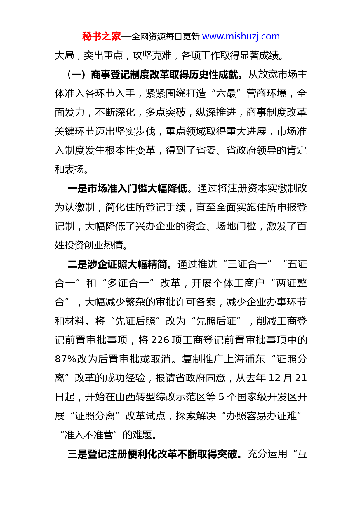 秘书之家—全网资源每日更新www.mishuzj.com聚焦“三大目标”定位打造“六最”营商环境不断开创新时代工商和市场监管工作新局面——在全省工商和市场监管工作会议上的讲话(2018年1月19日)张九萍同志们:这次会议的主要任务是,全面贯彻党的十九大精神,认真落实省委十一届五次全会、省委经济工作会议和全国工商和市场监管工作会议的决策部署,总结过去工作,安排2018年任务,进一步统一思想,凝心聚力,努力开创新时代工商和市场监管工作新局面,为把新时代中国特色社会主义在山西推向前进作出新贡献。下面,我讲几点意见。一、以推进商事制度改革为主线,全省工商和市场监管工作取得显著成绩党的十八大以来,在习近平新时代中国特色社会主义思想指引下,全省工商和市场监管部门认真贯彻落实省委、省政府和国家工商总局决策部署,按照“放管服效”改革要求,坚持以推进商事制度改革为主线,围绕中心,服务秘书之家—全网资源每日更新www.mishuzj.com大局,突出重点,攻坚克难,各项工作取得显著成绩。(一)商事登记制度改革取得历史性成就。从放宽市场主体准入各环节入手,紧紧围绕打造“六最”营商环境,全面发力,不断深化,多点突破,纵深推进,商事制度改革关键环节迈出坚实步伐,重点领域取得重大进展,市场准入制度发生根本性变革,得到了省委、省政府领导的肯定和表扬。一是市场准入门槛大幅降低。通过将注册资本实缴制改为认缴制,简化住所登记手续,直至全面实施住所申报登记制,大幅降低了兴办企业的资金、场地门槛,激发了百姓投资创业热情。二是涉企证照大幅精简。通过推进“三证合一”“五证合一”和“多证合一”改革,开展个体工商户“两证整合”,大幅减少繁杂的审批许可备案,减少企业办事环节和材料。将“先证后照”改为“先照后证”,削减工商登记前置审批事项,将226项工商登记前置审批事项中的87%改为后置审批或取消。复制推广上海浦东“证照分离”改革的成功经验,报请省政府同意,从去年12月21日起,开始在山西转型综改示范区等5个国家级开发区开展“证照分离”改革试点,探索解决“办照容易办证难”“准入不准营”的难题。三是登记注册便利化改革不断取得突破。充分运用“互秘书之家—全网资源每日更新www.mishuzj.com联网+”推进工商登记注册便利化。推出了企业登记全程电子化、电子营业执照、企业名称自主申报、简易注销、建立小微企业名录等一系列让老百姓有更多获得感的改革举措。商事制度改革有力激发了市场活力和社会创造力,在改革发展全局中发挥了重要作用,成为推动大众创业万众创新的重要动力。到2017年末,全省市场主体达到208.7万户,比改革前的2013年末增长55.1%,其中企业数量52.5万户,增长了86.2%,改革4年来新设市场主体124.2万户,新设企业32.3万户。日均新设市场主体从改革前的826户增加到现在的1300户,日均新设企业从改革前的156户提高到现在的339户。(二)事中事后监管开创新局面。与放宽市场准入相适应,坚持“宽进”与“严管”相结合,推动市场监管重心由传统的事前审批向事中事后监管转变,企业信用监管长效机制逐步形成,开创了市场监管新局面。一是年检验照改年报、信息公示制度顺利实施。企业年报率逐步攀升,去年达到92.4%,高于改革前的年检率。企业自主公示和主体责任意识明显增强,工商部门行政处罚信息公示工作稳步推进,基本实现应公示尽公示。二是“双随机、一公开”监管方式顺利推进。开发建设了“双随机”工作平台,制定了“一单两库一细则”,秘书之家—全网资源每日更新www.mishuzj.com2017年实现随机抽查事项全覆盖,全年完成抽查企业1.44万户,占实有企业总数的3.3%,结果公示率达100%。同时,积极探索和推动跨部门双随机联合抽查,监管的规范性、公正性和透明度不断提高。三是全面建成并广泛应用国家企业信用信息公示系统(山西),部门间信息共享和联合惩戒不断强化。报请省政府印发《国家企业信用信息公示系统(山西)管理暂行办法》,省政府办公厅专门就“双告知”认领和涉企信息归集公示工作发出通报,有力推动了公示系统的建设和应用。全省归集政府部门涉企信息数据共计61.4万条,省直应归集信息的52个部门全部参与,实现全覆盖。2017年,系统累计访问量接近3000万人次,累计查询量超过500万人次,正在成为企业、社会和政府部门不可或缺的“一张网”。经营异常名录、严重违法失信企业名单制度效果日益显现,全省列入经营异常名录企业8.8万户,累计移出4.9万户,联合限制“老赖”担任公司各类职务2017人次。(三)市场监管执法工作成效显著。以人民群众反映强烈的热点、难点问题为重点,切实加大重点领域重点行业市场监管力度,市场竞争环境不断改善,市场秩序进一步规范。一是进一步加强竞争执法工作。发挥竞争政策的基础性秘书之家—全网资源每日更新www.mishuzj.com作用,出台公平竞争审查制度。组织开展傍名牌、公用企业限制竞争和垄断行为、侵权仿冒等专项整治行动,认真开展“扫黄打非”、治超、禁毒等经济检查工作,有力维护了公平竞争的市场秩序,查处各类案件5492起。省局经检总队敢于举旗亮剑,执法职能明显加强,办案力度不断加大。二是网络市场等重点市场监管工作取得新成效。加强网络市场监管,建成山西省网络交易诚信系统,
