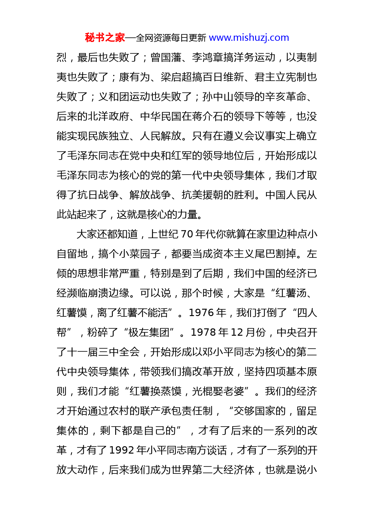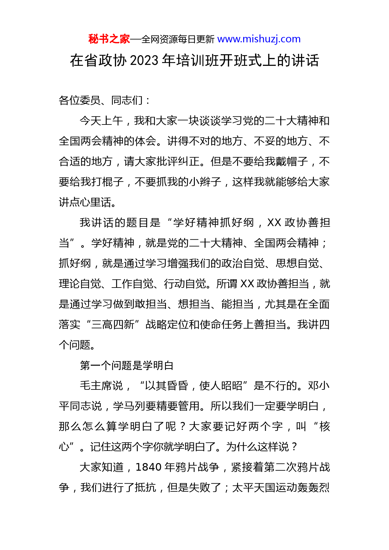 秘书之家—全网资源每日更新www.mishuzj.com在省政协2023年培训班开班式上的讲话各位委员、同志们:今天上午,我和大家一块谈谈学习党的二十大精神和全国两会精神的体会。讲得不对的地方、不妥的地方、不合适的地方,请大家批评纠正。但是不要给我戴帽子,不要给我打棍子,不要抓我的小辫子,这样我就能够给大家讲点心里话。我讲话的题目是“学好精神抓好纲,XX政协善担当”。学好精神,就是党的二十大精神、全国两会精神;抓好纲,就是通过学习增强我们的政治自觉、思想自觉、理论自觉、工作自觉、行动自觉。所谓XX政协善担当,就是通过学习做到敢担当、想担当、能担当,尤其是在全面落实“三高四新”战略定位和使命任务上善担当。我讲四个问题。第一个问题是学明白毛主席说,“以其昏昏,使人昭昭”是不行的。邓小平同志说,学马列要精要管用。所以我们一定要学明白,那么怎么算学明白了呢?大家要记好两个字,叫“核心”。记住这两个字你就学明白了。为什么这样说?大家知道,1840年鸦片战争,紧接着第二次鸦片战争,我们进行了抵抗,但是失败了;太平天国运动轰轰烈秘书之家—全网资源每日更新www.mishuzj.com烈,最后也失败了;曾国藩、李鸿章搞洋务运动,以夷制夷也失败了;康有为、梁启超搞百日维新、君主立宪制也失败了;义和团运动也失败了;孙中山领导的辛亥革命、后来的北洋政府、中华民国在蒋介石的领导下等等,也没能实现民族独立、人民解放。只有在遵义会议事实上确立了毛泽东同志在党中央和红军的领导地位后,开始形成以毛泽东同志为核心的党的第一代中央领导集体,我们才取得了抗日战争、解放战争、抗美援朝的胜利。中国人民从此站起来了,这就是核心的力量。大家还都知道,上世纪70年代你就算在家里边种点小自留地,搞个小菜园子,都要当成资本主义尾巴割掉。左倾的思想非常严重,特别是到了后期,我们中国的经济已经濒临崩溃边缘。可以说,那个时候,大家是“红薯汤、红薯馍,离了红薯不能活”。1976年,我们打倒了“四人帮”,粉碎了“极左集团”。1978年12月份,中央召开了十一届三中全会,开始形成以邓小平同志为核心的第二代中央领导集体,带领我们搞改革开放,坚持四项基本原则,我们才能“红薯换蒸馍,光棍娶老婆”。我们的经济才开始通过农村的联产承包责任制,“交够国家的,留足集体的,剩下都是自己的”,才有了后来的一系列的改革,才有了1992年小平同志南方谈话,才有了一系列的开放大动作,后来我们成为世界第二大经济体,也就是说小秘书之家—全网资源每日更新www.mishuzj.com平同志这个核心领导我们改革开放,让我们富起来了,这就是核心的力量。那么我们再说十八大以来,我们进入了新时代,正是由于有习近平总书记这个核心,确立了习近平总书记在党中央的核心地位、在全党的核心地位,确立了习近平新时代中国特色社会主义思想的指导地位,而且大家坚定不移地维护习近平总书记在中央的权威、在全党的权威,我们才能取得新时代这十多年的辉煌成就。大家知道,苏共在有20万党员的时候,取得了十月革命的胜利;在有200万党员的时候,打败了德国法西斯;到有2000多万党员的时候,结果是自毁长城,苏联解体,东欧剧变。正是有了习近平总书记这个核心的领导,十八大以来,党中央推出八项规定,全面从严治党,通过一系列的组合拳,特别是“打虎拍蝇猎狐”,周永康、薄熙来、令计划、孙政才、郭伯雄、徐才厚、张阳等纷纷落马,我们才取得反腐败斗争压倒性胜利并全面巩固。党风、政风、社会风气越来越清朗,海晏河清的局面越来越明确,老百姓对我们的党、我们的国家、我们的民族越来越充满希望。正是有了习近平总书记这个核心的领导,十八大以来,对于最贫困的近1亿人口,我们通过精准扶贫,使他秘书之家—全网资源每日更新www.mishuzj.com们吃不愁、穿不愁,有医疗、有教育、有房住,全部脱贫,比联合国提出的目标提前了10年,实现了全面小康。正是有了习近平总书记这个核心的领导,十八大以来,我们天更蓝了、水更清了、地更净了、山更绿了,我们的pm2.5大大下降了,我们的负氧离子大大提升了,我们与劣五类水彻底告别了,大家都在这样一个逐渐好起来的环境里边,那是多大的幸福!正是有了习近平总书记这个核心的领导,十八大以来,我们通过扫黑除恶、打伞破网,又使我们的社会风清气正,使老百姓仓廪实而知礼节,衣食足而知荣辱。正是有了习近平总书记这个核心的领导,十八大以来,我们的经济发展取得显著成果。去年我们虽然只有3%的增幅,但是在世界主要经济体中,我们仍然是第一名。以上种种,没有“两个确立”,没有“两个维护”,没有习近平总书记的核心地位,我们能取得这样的成就吗?为此,这就是我说的第一个问题,叫学明白,明白核心最重要,有了以习近平同志为核心的党中央坚强领导,我们就能在百年变局中劈波斩浪、行稳致远。第二个问题是悟明白我们说要学思践悟,你光学了本质上的东西,但是没有领悟,没有觉悟,没有打通,没有消化,就还是白搭。党的二十大精神需要我们悟明白什么呢?悟明白两个字,秘书之家—全网资源每日更新www.mishuzj.com叫“特色”。什么特色?就是2035年基本实现社会主义现代化——中国特色;本世纪中叶实现中华民族伟大复兴——中国特色。那么这个“特”,特在哪?