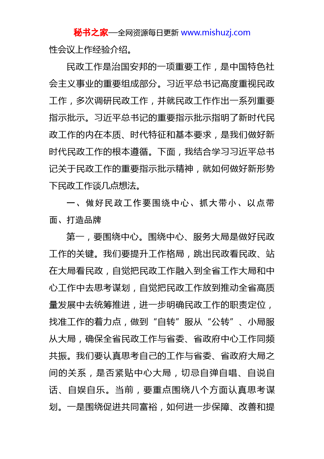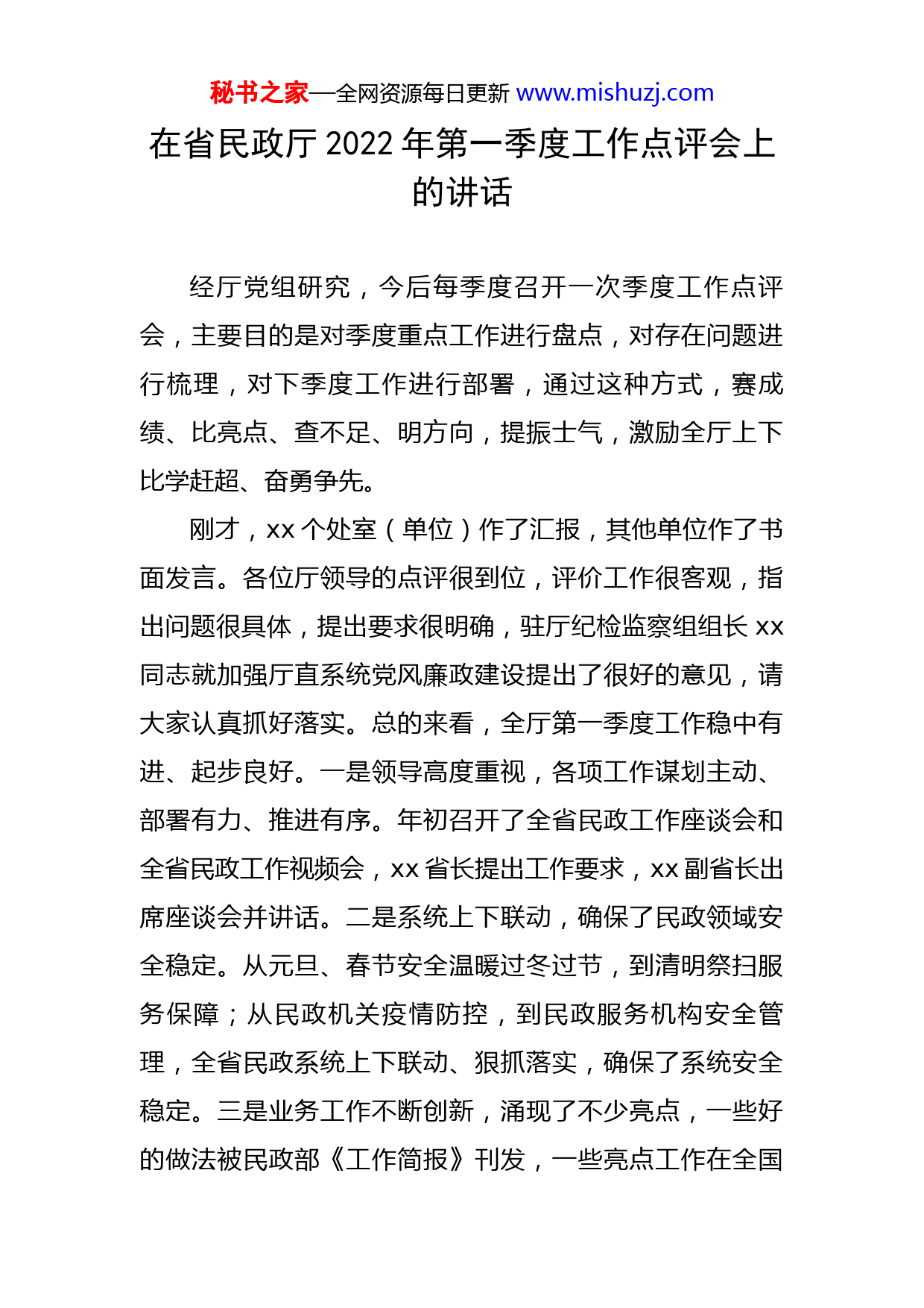 秘书之家—全网资源每日更新www.mishuzj.com在省民政厅2022年第一季度工作点评会上的讲话经厅党组研究,今后每季度召开一次季度工作点评会,主要目的是对季度重点工作进行盘点,对存在问题进行梳理,对下季度工作进行部署,通过这种方式,赛成绩、比亮点、查不足、明方向,提振士气,激励全厅上下比学赶超、奋勇争先。刚才,xx个处室(单位)作了汇报,其他单位作了书面发言。各位厅领导的点评很到位,评价工作很客观,指出问题很具体,提出要求很明确,驻厅纪检监察组组长xx同志就加强厅直系统党风廉政建设提出了很好的意见,请大家认真抓好落实。总的来看,全厅第一季度工作稳中有进、起步良好。一是领导高度重视,各项工作谋划主动、部署有力、推进有序。年初召开了全省民政工作座谈会和全省民政工作视频会,xx省长提出工作要求,xx副省长出席座谈会并讲话。二是系统上下联动,确保了民政领域安全稳定。从元旦、春节安全温暖过冬过节,到清明祭扫服务保障;从民政机关疫情防控,到民政服务机构安全管理,全省民政系统上下联动、狠抓落实,确保了系统安全稳定。三是业务工作不断创新,涌现了不少亮点,一些好的做法被民政部《工作简报》刊发,一些亮点工作在全国秘书之家—全网资源每日更新www.mishuzj.com性会议上作经验介绍。民政工作是治国安邦的一项重要工作,是中国特色社会主义事业的重要组成部分。习近平总书记高度重视民政工作,多次调研民政工作,并就民政工作作出一系列重要指示批示。习近平总书记的重要指示批示指明了新时代民政工作的内在本质、时代特征和基本要求,是我们做好新时代民政工作的根本遵循。下面,我结合学习习近平总书记关于民政工作的重要指示批示精神,就如何做好新形势下民政工作谈几点想法。一、做好民政工作要围绕中心、抓大带小、以点带面、打造品牌第一,要围绕中心。围绕中心、服务大局是做好民政工作的关键。我们要提升工作格局,跳出民政看民政、站在大局看民政,自觉把民政工作融入到全省工作大局和中心工作中去思考谋划,自觉把民政工作放到推动全省高质量发展中去统筹推进,进一步明确民政工作的职责定位,找准工作的着力点,做到“自转”服从“公转”、小局服从大局,确保全省民政工作与省委、省政府中心工作同频共振。我们要认真思考自己的工作与省委、省政府大局之间的关系,是否紧贴中心大局,切忌自弹自唱、自说自话、自娱自乐。当前,要重点围绕八个方面认真思考谋划。一是围绕促进共同富裕,如何进一步保障、改善和提秘书之家—全网资源每日更新www.mishuzj.com升困难群体、低收入群体的生活水平?二是围绕适应老龄化社会发展需要,如何建立具有湖北特色的养老服务体系?三是围绕推进省域治理现代化,如何提升基层社会治理水平?四是围绕促进经济社会高质量发展,如何推动社会组织健康有序发展?五是围绕助力乡村振兴、美丽湖北建设,如何推进殡葬改革和惠民礼葬?六是围绕推进新型城镇化建设,如何做好行政区划和地名管理、地名文化工作?七是围绕倡导社会文明新风,如何推进婚俗改革?八是围绕为省第十二次党代会和党的二十大召开营造安全稳定社会环境,如何进一步排查、防范、消除民政领域风险隐患?第二,要抓大带小。民政部门过去叫“小政府”,管的多、管的杂。改革开放40多年来,在历次机构改革中,多次直接涉及民政部门,民政部门的职能有增有减。在2018年机构改革中,民政部门职能发生重大调整。改革后,民政部门职责仍很重要,任务仍很繁重。民政工作涉及方方面面,不可能平均用力,头发胡子一把抓,要谋大事、议大事、抓大事,把主要精力放到省委、省政府高度关注的要事上来,放到老百姓迫切需要解决的难事上来,抓住重点、兼顾一般,统筹推进民政各领域工作。要聚焦社会救助、养老服务、殡葬改革、社区治理、社会组织管理、未成年人保护、慈善社工、区划地名工作中社会关注秘书之家—全网资源每日更新www.mishuzj.com的热点、难点、焦点发力。第三,要以点带面。要着眼新的时代条件和实践要求,找准工作切入点,以“小切口”撬动“大发展”,打造亮点工作、亮点地区,形成一批可复制、可推广的成功经验,发挥典型的示范引领作用,推动全省面上民政工作整体提升。第四,要打造品牌。有作为才有地位,有品牌才有影响。首先要干,干出成效;同时要善于培育品牌、塑造品牌、推广品牌,及时发现和总结提升工作中的创新做法,切实加大宣传力度,扩大民政为民服务影响力。比如,江苏民政部门打造的“苏适养老”“苏童成长”品牌,浙江民政部门打造的“善行浙江”品牌,值得我们学习借鉴。二、做好民政工作要讲政治、借外力、鼓士气第一,要旗帜鲜明讲政治。我理解,民政之“民”,是民生、民主,要改善民生、保障民主;民政之“政”,是政治、政权,要讲好政治、巩固政权。民政部门首先是政治机关,民政干部要旗帜鲜明讲政治,深刻领悟“两个确立”的决定性意义,增强“四个意识”、坚定“四个自信”、做到“两个维护”,一丝不苟地把党中央决策部署和习近平总书记关于民政工作的重要指示批示精神落实到位,确保不偏向、不变通、不走样。第二,要善于借助各方面力量推动工作。一是要善于秘书之家—全网资源每日更新www.mishuzj.com借