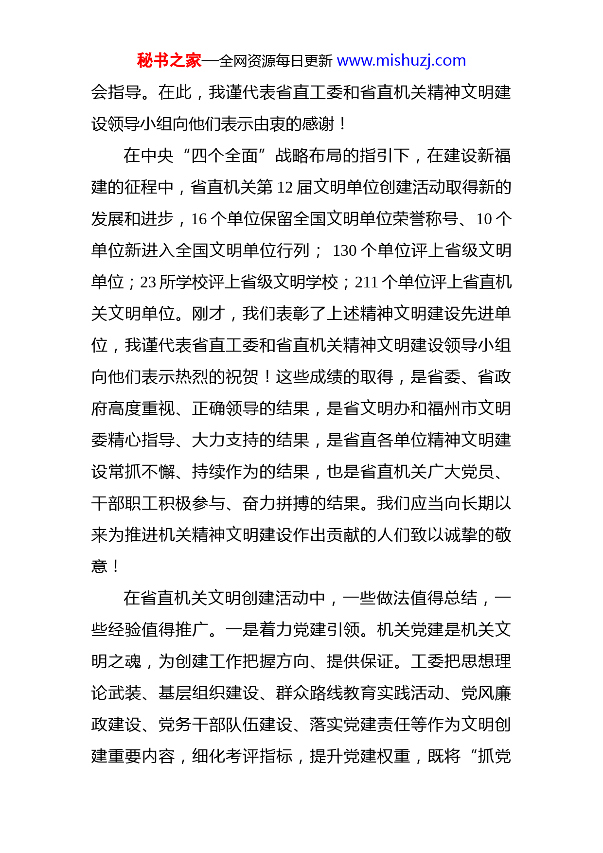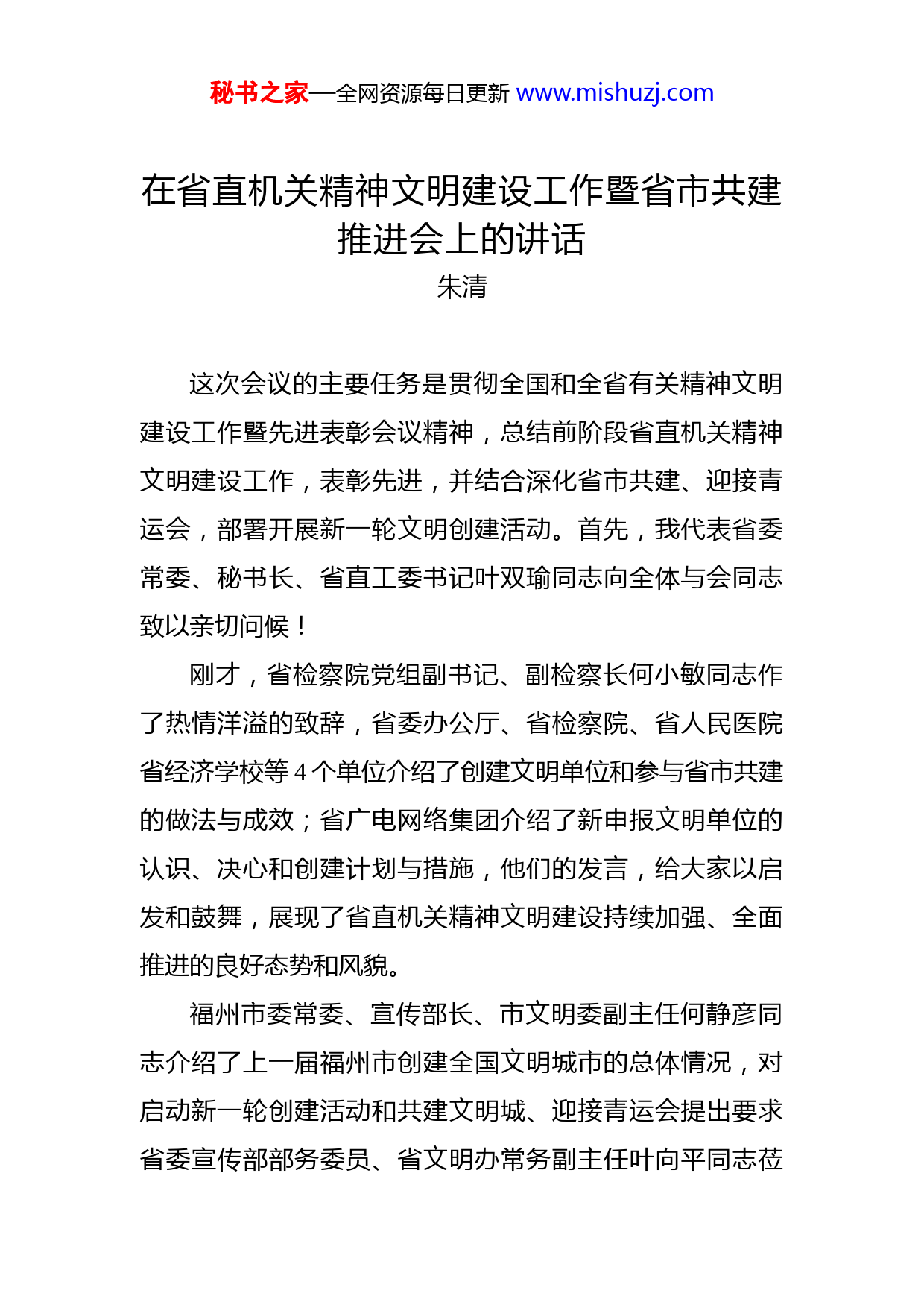 秘书之家—全网资源每日更新www.mishuzj.com在省直机关精神文明建设工作暨省市共建推进会上的讲话朱清这次会议的主要任务是贯彻全国和全省有关精神文明建设工作暨先进表彰会议精神,总结前阶段省直机关精神文明建设工作,表彰先进,并结合深化省市共建、迎接青运会,部署开展新一轮文明创建活动。首先,我代表省委常委、秘书长、省直工委书记叶双瑜同志向全体与会同志致以亲切问候!刚才,省检察院党组副书记、副检察长何小敏同志作了热情洋溢的致辞,省委办公厅、省检察院、省人民医院省经济学校等4个单位介绍了创建文明单位和参与省市共建的做法与成效;省广电网络集团介绍了新申报文明单位的认识、决心和创建计划与措施,他们的发言,给大家以启发和鼓舞,展现了省直机关精神文明建设持续加强、全面推进的良好态势和风貌。福州市委常委、宣传部长、市文明委副主任何静彦同志介绍了上一届福州市创建全国文明城市的总体情况,对启动新一轮创建活动和共建文明城、迎接青运会提出要求省委宣传部部务委员、省文明办常务副主任叶向平同志莅秘书之家—全网资源每日更新www.mishuzj.com会指导。在此,我谨代表省直工委和省直机关精神文明建设领导小组向他们表示由衷的感谢!在中央“四个全面”战略布局的指引下,在建设新福建的征程中,省直机关第12届文明单位创建活动取得新的发展和进步,16个单位保留全国文明单位荣誉称号、10个单位新进入全国文明单位行列;130个单位评上省级文明单位;23所学校评上省级文明学校;211个单位评上省直机关文明单位。刚才,我们表彰了上述精神文明建设先进单位,我谨代表省直工委和省直机关精神文明建设领导小组向他们表示热烈的祝贺!这些成绩的取得,是省委、省政府高度重视、正确领导的结果,是省文明办和福州市文明委精心指导、大力支持的结果,是省直各单位精神文明建设常抓不懈、持续作为的结果,也是省直机关广大党员、干部职工积极参与、奋力拼搏的结果。我们应当向长期以来为推进机关精神文明建设作出贡献的人们致以诚挚的敬意!在省直机关文明创建活动中,一些做法值得总结,一些经验值得推广。一是着力党建引领。机关党建是机关文明之魂,为创建工作把握方向、提供保证。工委把思想理论武装、基层组织建设、群众路线教育实践活动、党风廉政建设、党务干部队伍建设、落实党建责任等作为文明创建重要内容,细化考评指标,提升党建权重,既将“抓党秘书之家—全网资源每日更新www.mishuzj.com建作为最大政绩”贯穿于文明创建全过程,又使文明创建成为加强机关党建的有力抓手。这几年,省直机关党建工作不断提升,促进了机关精神文明建设蓬勃发展。二是着力服务大局。文明创建与促发展、促改革是一体化的关系起着相辅相成作用。各单位将建设机制活、产业优、百姓富、生态美的新福建作为文明创建根本目标,围绕实施全省深化改革行动计划和加快发展、赶超战略,深入开展“学雷锋”、“学厦航”、“学长汀”活动,引导广大党员、干部职工干事创业、敬业奉献,转变职能、提高效能在打造优质软环境,服务企业发展、服务项目落地、服务民生福利、服务生态省建设上下功夫,促进了文明创建服务大局效益最大化。三是着力道德建设。以社会公德、职业道德、家庭美德和个人品德为主要内容的道德建设是培育弘扬社会主义核心价值观的基础工作。各单位组织开展道德讲坛、推荐评选道德模范和“身边好人”等活动,普遍加强关心下一代工作,将社会主义核心价值观潜移默化到党员、干部职工的学习、工作和生活之中,涌现出陈黎华、楚玉春、林建和省立医院宁养院等一大批道德建设楷模。四是着力繁荣文化。健康、丰富的文体活动是文明创建普惠性、群众性的重要体现。各单位以“学习十八大”“共筑中国梦”、“建设新福建”为主题,举办和参加各种形式的读书征文、音乐舞蹈戏曲、书画摄影集邮、诗歌秘书之家—全网资源每日更新www.mishuzj.com园艺等创作与展演活动及业务知识与技能比赛等,既充实生活,又陶冶情操;连年开展省直机关全民健身系列竞赛活动,增强了干部职工体魄,提振了机关精气神。爱闽合唱团多次参与闽台文化交流活动和参加国际音乐赛事,屡获优异成绩,展示福建文明。五是着力传播新风。倡导文明新风尚是中华民族美好品格的传承,也是文明创建的时代内涵。各单位积极开展“我们的节日”主题活动,缅怀先祖先贤先烈历史功绩,增强爱国主义意识,领悟中华优秀传统真谛;广泛开展各种以奉献社会为主要内容的志愿服务活动,包括义务植树、无偿献血、环境整治、净化网络、交通劝导、扶贫济困等等,立德行善,助人为乐;推行工作场所禁止吸烟、“低碳办公”,开展机关食堂“文明餐桌”行动,引导干部职工从自己做起、从身边小事做起,营造处处讲文明、见文明的“清新机关”。六是着力省市共建。文明共建是群众性精神文明创建活动的本质特征。各单位围绕文明社区、文明交通、文明窗口、优美环境、志愿服务、道德教育等“六大共建”,深入推进省市共建省会文明城市,落实“文明福州、持续文明”。三年来,410个省直单位与福州社区共建,办民生实事项目4500多个,结对帮扶困难群众3000多人,帮扶资金近千万元,受到社
