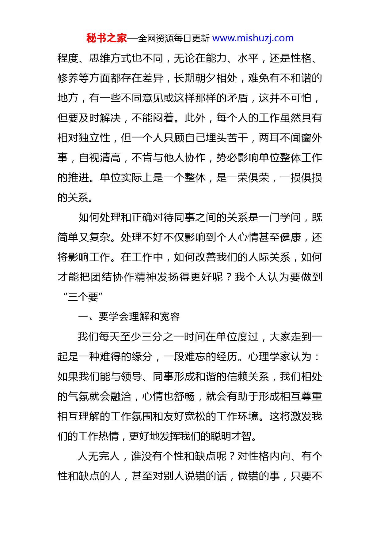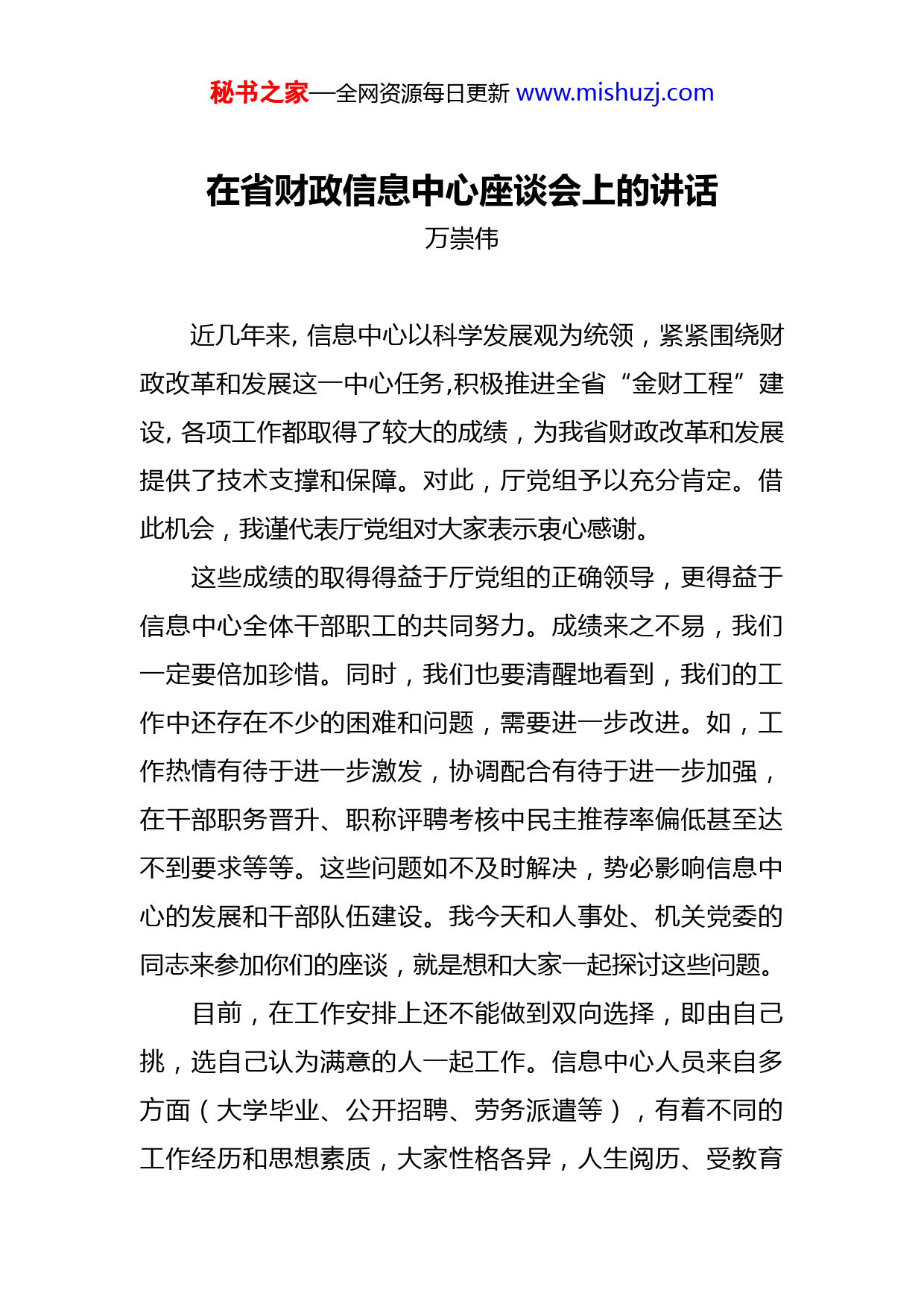 秘书之家—全网资源每日更新www.mishuzj.com在省财政信息中心座谈会上的讲话万崇伟近几年来,信息中心以科学发展观为统领,紧紧围绕财政改革和发展这一中心任务,积极推进全省“金财工程”建设,各项工作都取得了较大的成绩,为我省财政改革和发展提供了技术支撑和保障。对此,厅党组予以充分肯定。借此机会,我谨代表厅党组对大家表示衷心感谢。这些成绩的取得得益于厅党组的正确领导,更得益于信息中心全体干部职工的共同努力。成绩来之不易,我们一定要倍加珍惜。同时,我们也要清醒地看到,我们的工作中还存在不少的困难和问题,需要进一步改进。如,工作热情有待于进一步激发,协调配合有待于进一步加强,在干部职务晋升、职称评聘考核中民主推荐率偏低甚至达不到要求等等。这些问题如不及时解决,势必影响信息中心的发展和干部队伍建设。我今天和人事处、机关党委的同志来参加你们的座谈,就是想和大家一起探讨这些问题。目前,在工作安排上还不能做到双向选择,即由自己挑,选自己认为满意的人一起工作。信息中心人员来自多方面(大学毕业、公开招聘、劳务派遣等),有着不同的工作经历和思想素质,大家性格各异,人生阅历、受教育秘书之家—全网资源每日更新www.mishuzj.com程度、思维方式也不同,无论在能力、水平,还是性格、修养等方面都存在差异,长期朝夕相处,难免有不和谐的地方,有一些不同意见或这样那样的矛盾,这并不可怕,但要及时解决,不能闷着。此外,每个人的工作虽然具有相对独立性,但一个人只顾自己埋头苦干,两耳不闻窗外事,自视清高,不肯与他人协作,势必影响单位整体工作的推进。单位实际上是一个整体,是一荣俱荣,一损俱损的关系。如何处理和正确对待同事之间的关系是一门学问,既简单又复杂。处理不好不仅影响到个人心情甚至健康,还将影响工作。在工作中,如何改善我们的人际关系,如何才能把团结协作精神发扬得更好呢?我个人认为要做到“三个要”一、要学会理解和宽容我们每天至少三分之一时间在单位度过,大家走到一起是一种难得的缘分,一段难忘的经历。心理学家认为:如果我们能与领导、同事形成和谐的信赖关系,我们相处的气氛就会融洽,心情也舒畅,就会有助于形成相互尊重相互理解的工作氛围和友好宽松的工作环境。这将激发我们的工作热情,更好地发挥我们的聪明才智。人无完人,谁没有个性和缺点呢?对性格内向、有个性和缺点的人,甚至对别人说错的话,做错的事,只要不秘书之家—全网资源每日更新www.mishuzj.com是原则性问题,我们就要给予更多的理解和宽容,要给予更多的鼓励和帮助。对待同志既要严格要求,但又不能过于苛刻。俗话说,“水至清则无鱼,人至察则无徒”。海尔集团总裁张瑞敏有一句至理名言“把每一件简单的事做好就是不简单,把每一件平凡的事做好就是不平凡”。要多看别人的优点,切勿拿自己的长处与别人的短处比。做到理解和宽容,首先需要我们在提升自身修养的同时,待人要真诚,彼此有一种宽容的胸怀,并在观念上形成共识,在利益上彼此相让,在看待问题时克服偏见。同时,要充分信任同事和周围的人。信任别人本身就是一种美德,也是建立良好人际关系最重要的基石。在与同事相处的时候,一定要给予充分的信任。俗话说“大事讲原则小事讲风格”就是这个道理。当然,我希望大家彼此之间是真正的信任,而不是毫无原则的信任和迁就。对待下属同事或是领导,对就是对,不对就是不对,要及时提醒,当面提出。不要平时不说,关键时候否定人家,如果再苛刻一点,就有可能对人家评价不公正,甚至还影响人家进步。二、要善于沟通和交流沟通:指有不同看法、不同意见方之间,偏重个人内在的认识,见解,思维,情感等方面互相通气,更强调情感、情绪的认同。交流:多指工作上的,技术层面的,可秘书之家—全网资源每日更新www.mishuzj.com以是在没有任何不同看法、不同意见方之间进行。“这个人很难沟通”,那就应该是说兴趣爱好不同,没有共同语言。我们可以不是好朋友,但必须是好同事。一个班子内部能否团结共事,关键在于沟通和交流;一个集体中同事之间能否和谐相处,也在于沟通和交流。我们有很多的矛盾和误解,其实就是因为缺少沟通和交流造成的。上下之间要沟通,同事之间也要沟通,加强交流因此,交心和谈心非常重要。“话不说不明,木不钻不透”,最怕的是冷漠和沉默。所以,有了人与人之间的心灵的对接,有了沟通和交流,就会化解矛盾,消除误解,人和人之间的关系也随之豁然开朗,同志们之间的关系就会更加融洽,机关氛围就会更加和谐。中心要为大家沟通和交流创造条件、搭建平台。要建立谈心制度,及时了解和掌握干部职工思想动态;要进一步关心干部职工,帮助解决实际困难,为他们解除后顾之忧,调动他们工作积极性;支部和工会要多组织形式多样的集体活动,增强凝聚力和集体荣誉感,增进彼此之间了解和互动。减少不必要的误会,达到坦诚相见的目的。总之,通过以上措施,可以使大家充分展示自我,可以使大家感受到团队的巨大力量。三、要提倡协作和竞争俗话说“同心山成玉,协力土变金”。成功,需要克秘书之家—全网资源每日更新www.mishuzj.com难攻坚的精神,更需要团结协作的合力。一个单位,如果人心浮动、自行其是、一盘散沙,何来生
