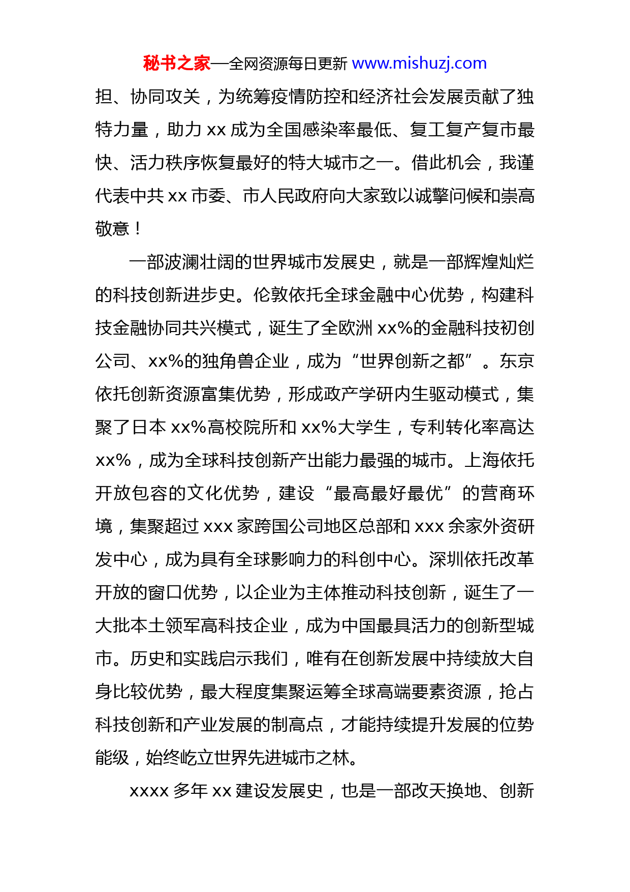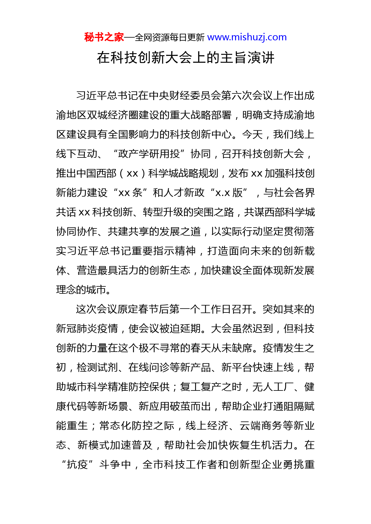 秘书之家—全网资源每日更新www.mishuzj.com在科技创新大会上的主旨演讲习近平总书记在中央财经委员会第六次会议上作出成渝地区双城经济圈建设的重大战略部署,明确支持成渝地区建设具有全国影响力的科技创新中心。今天,我们线上线下互动、“政产学研用投”协同,召开科技创新大会,推出中国西部(xx)科学城战略规划,发布xx加强科技创新能力建设“xx条”和人才新政“x.x版”,与社会各界共话xx科技创新、转型升级的突围之路,共谋西部科学城协同协作、共建共享的发展之道,以实际行动坚定贯彻落实习近平总书记重要指示精神,打造面向未来的创新载体、营造最具活力的创新生态,加快建设全面体现新发展理念的城市。这次会议原定春节后第一个工作日召开。突如其来的新冠肺炎疫情,使会议被迫延期。大会虽然迟到,但科技创新的力量在这个极不寻常的春天从未缺席。疫情发生之初,检测试剂、在线问诊等新产品、新平台快速上线,帮助城市科学精准防控保供;复工复产之时,无人工厂、健康代码等新场景、新应用破茧而出,帮助企业打通阻隔赋能重生;常态化防控之际,线上经济、云端商务等新业态、新模式加速普及,帮助社会加快恢复生机活力。在“抗疫”斗争中,全市科技工作者和创新型企业勇挑重秘书之家—全网资源每日更新www.mishuzj.com担、协同攻关,为统筹疫情防控和经济社会发展贡献了独特力量,助力xx成为全国感染率最低、复工复产复市最快、活力秩序恢复最好的特大城市之一。借此机会,我谨代表中共xx市委、市人民政府向大家致以诚擎问候和崇高敬意!一部波澜壮阔的世界城市发展史,就是一部辉煌灿烂的科技创新进步史。伦敦依托全球金融中心优势,构建科技金融协同共兴模式,诞生了全欧洲xx%的金融科技初创公司、xx%的独角兽企业,成为“世界创新之都”。东京依托创新资源富集优势,形成政产学研内生驱动模式,集聚了日本xx%高校院所和xx%大学生,专利转化率高达xx%,成为全球科技创新产出能力最强的城市。上海依托开放包容的文化优势,建设“最高最好最优”的营商环境,集聚超过xxx家跨国公司地区总部和xxx余家外资研发中心,成为具有全球影响力的科创中心。深圳依托改革开放的窗口优势,以企业为主体推动科技创新,诞生了一大批本土领军高科技企业,成为中国最具活力的创新型城市。历史和实践启示我们,唯有在创新发展中持续放大自身比较优势,最大程度集聚运筹全球高端要素资源,抢占科技创新和产业发展的制高点,才能持续提升发展的位势能级,始终屹立世界先进城市之林。xxxx多年xx建设发展史,也是一部改天换地、创新秘书之家—全网资源每日更新www.mishuzj.com创造的奋斗史。都江堰无坝引水工程的修建,造就了“水旱从人、不知饥馑”的xx之国;x锦织机的发明,铺展了“互通有无、文明交融”的丝绸之路;纸币交子的诞生,成就了“优雅时尚、商业繁荣”的世界都会。今天的xx,传承创新创造的xx文化,在全国率先提出加快建设全面体现新发展理念的城市。我们优化城市空间布局,跨越龙泉山向东与xx相向发展,IT,高水平规划建设东部新区,开辟城市永续发展空间,开创大都市发展新格局。我们重塑产业经济地理,以xx个产业生态圈引领xx个产业功能区建设,加速先进生产要素集聚和产业同城化配套,构建形成以先进制造业、现代服务业和新经济为支撑的开放型现代化产业体系。我们建设国际门户枢纽城市,加快构建以xx为枢纽的泛欧泛亚国际战略大通道和覆盖世界经济中心城市的国际供应链体系,努力成为国内大循环的关键节点和国内国际双循环的战略链接。我们创造公园城市形态,转变发展方式,培育公园场景,推动价值转化,塑造人城境业高度和谐统一的大美城市。我们创建世界文化名城,推动xx文化创新性发展、创造性转化,向全球传播城市的理念和气质,凝聚城市走向世界的深厚力量。新时代西部大开发形成新格局为xx带来了时代机遇。xx地区双城经济圈建设、践行新发展理念的公园城市示范区、国家城乡融合发展试验区、中日(xx)城市建设秘书之家—全网资源每日更新www.mishuzj.com和现代服务业开放合作示范项目、xx同城化发展、东部新区、xx国际铁路港经开区等一系列重大战略上升为国家战略。构筑增长极、形成动力源是党中央交给xx的光荣使命,我们深刻认识到:构筑增长极和动力源,必须依靠科技这一“第一生产力”。我们将顺应科技革命深刻改写全球竞争规则、重塑世界创新版图的时代大势,以增强创新策源能力为引领,高标准规划建设中国西部(xx)科学城,推动科技功能布局与城市战略方向相契合、科技攻关重点与主导产业需求相匹配、科技应用场景与美好生活向往相适应,实现从被动跟跑到主动领跑的历史性转变。构筑增长极和动力源,必须依靠创新这一“第一驱动力”。我们将坚持需求导向和产业化方向,坚持企业在创新中的主体地位,以战略性新兴产业为主导,以科技型企业为主角,以高品质科创空间为载体,构建“科学发现-技术发明-成果转化-产业创新-未来城市”一体贯通的全周期创新体系,实现城市发展动能从要素驱动向创新驱动的根本性转变。构筑增长极和动力源,必须依靠人才这一“第一资源”。我们将大力实施人才优先战略,把人力资源协同深度嵌入创新链场景,着力构建以创新创业环境优势