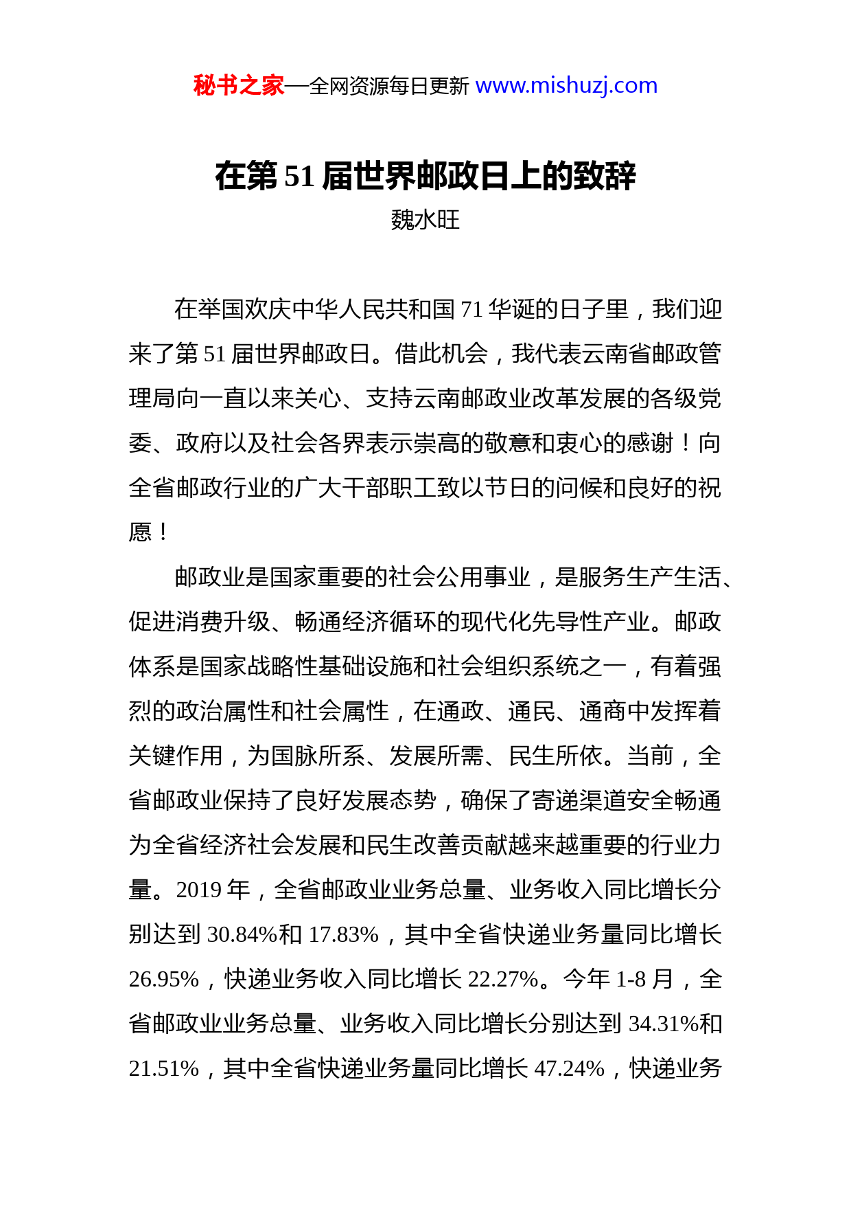 秘书之家—全网资源每日更新www.mishuzj.com在第51届世界邮政日上的致辞魏水旺在举国欢庆中华人民共和国71华诞的日子里,我们迎来了第51届世界邮政日。借此机会,我代表云南省邮政管理局向一直以来关心、支持云南邮政业改革发展的各级党委、政府以及社会各界表示崇高的敬意和衷心的感谢!向全省邮政行业的广大干部职工致以节日的问候和良好的祝愿!邮政业是国家重要的社会公用事业,是服务生产生活、促进消费升级、畅通经济循环的现代化先导性产业。邮政体系是国家战略性基础设施和社会组织系统之一,有着强烈的政治属性和社会属性,在通政、通民、通商中发挥着关键作用,为国脉所系、发展所需、民生所依。当前,全省邮政业保持了良好发展态势,确保了寄递渠道安全畅通为全省经济社会发展和民生改善贡献越来越重要的行业力量。2019年,全省邮政业业务总量、业务收入同比增长分别达到30.84%和17.83%,其中全省快递业务量同比增长26.95%,快递业务收入同比增长22.27%。今年1-8月,全省邮政业业务总量、业务收入同比增长分别达到34.31%和21.51%,其中全省快递业务量同比增长47.24%,快递业务秘书之家—全网资源每日更新www.mishuzj.com收入同比增长28.71%。主要发展指标增速在全国各省区市排名靠前。今年新冠肺炎疫情发生以来,全省行业坚决贯彻落实习近平总书记重要讲话精神和中央决策部署,在国家邮政局党组和省委省政府的坚强领导下,立足特殊渠道,发挥特殊优势,全力做好疫情防控服务保障和复工复产支撑,有效做好行业自身疫情防控,全力保障防疫物资和居民基本生活物资运递,得到了各级党委政府的肯定和社会各界的赞誉。在肯定成效的同时,我们也必须清醒认识到,行业治理体系和治理能力与现代化的要求差距还不小,管理队伍自身能力和党的建设还需要不断加强,邮政快递业发展仍然存在不平衡不充分的问题,大而不强、大而不优、快而不稳、快而不精的基本业情没有改变,完善发展理念、转变发展方式、提高发展质效的任务依然繁重,特别是末端网点风险日益凸显、寄递安全形势严峻复杂、国际寄递能力薄弱难以适应变化和新业态监管服务跟不上等等,这些都需要我们下更大力气解决。相比东部发达省份,我省邮政基础设施上还存在着短板,“两进一出”工程需要进一步加快推进,在政策落地见效上需要进一步加强,在支撑体系建设上需要加速推进。全省系统全省行业必须深入领会习近平总书记对邮政业重要指示精神,增强“四个意秘书之家—全网资源每日更新www.mishuzj.com识”,坚定“四个自信”,做到“两个维护”,以“两进一出”工程为抓手精准发力,更好地助力构建以国内大循环为主体、国内国际双循环相互促进的新发展格局,更好地满足人民美好生活需要,更好地服务经济社会发展大局。第一,坚持完善高质量的邮政业服务民生体系。创新拓展邮政公共服务内涵,准确把握邮政业公益性、基础性商业性的多重属性,推动以区域和功能为依据界定邮政业公共服务,将代理政务、农村快递服务、末端服务等纳入公共服务范畴。配合做好邮政公共服务机制改革,推动健全邮政普遍服务保障机制,形成支持农村和边远地区发展的长效机制,创新邮政公共服务提供方式。强化邮政快递网络基础设施的布局统筹,推动园区建设和129个县级集散中心建设,全面提升邮政业服务能力,全力巩固建制村直接通邮成果,提高邮政普遍服务水平。健全快递进村制度安排,结合全省县乡村三级物流体系建设,加快推进快递下乡、快递进村,推动快递服务末端下沉到农村,有效提升寄递服务水平,帮助拓宽农产品销售渠道。聚焦末端网络,加速资源整合力度,有效破解“最后一公里”难题。落实行业就业政策,鼓励围绕邮政快递返乡创业就业,更好服务乡村振兴战略。第二,坚持完善高标准的邮政业现代市场体系。发挥市场在资源配置中的决定性作用,引导企业在转型升级上秘书之家—全网资源每日更新www.mishuzj.com有新成效,丰富服务品质,提供更弹性更精准更多样的服务,着力提升效率和竞争力。更好发挥政府作用,在政策支撑上下功夫,利用财权事权划分改革的契机,营造更优发展环境,完善包容创新机制,继续深化“放管服”改革按照包容审慎原则放宽市场准入,加强对新业态新模式政策和技术储备,联合多方共治。强化公平竞争机制,营造各种所有制主体依法平等使用资源要素、公开公平公正参与竞争、同等接受法律保护的市场环境。加强要素市场建设,促进规范发展。坚持以供给侧结构性改革为主线,更加广泛深入联动融合,加强与综合交通、电子商务、高原农业、旅游文化、现代制造业的协同发展,向专业化和价值链高端延伸,实现动力变革。第三,坚持完善高效能的邮政业国际寄递体系。努力推进“快递出海”工作,积极参与云南自贸区建设,服务面向南亚东南亚辐射中心建设,推动建设符合跨境电子商务发展需要的寄递服务网络,构建便捷高效的跨境电子商务通关渠道,实现更高水平开放。更好发挥昆明、磨憨两个国际快件监管中心作用,推进瑞丽、河口新建两个国际快件监管中心。按照国家局部署,推动国际邮件互换局(交换站)的升级改造。加大政策争取力度,分布完善境外网络,引导支持我省邮政、快递企业重点面向南亚东南亚布局境外快递网络体系,发展国
