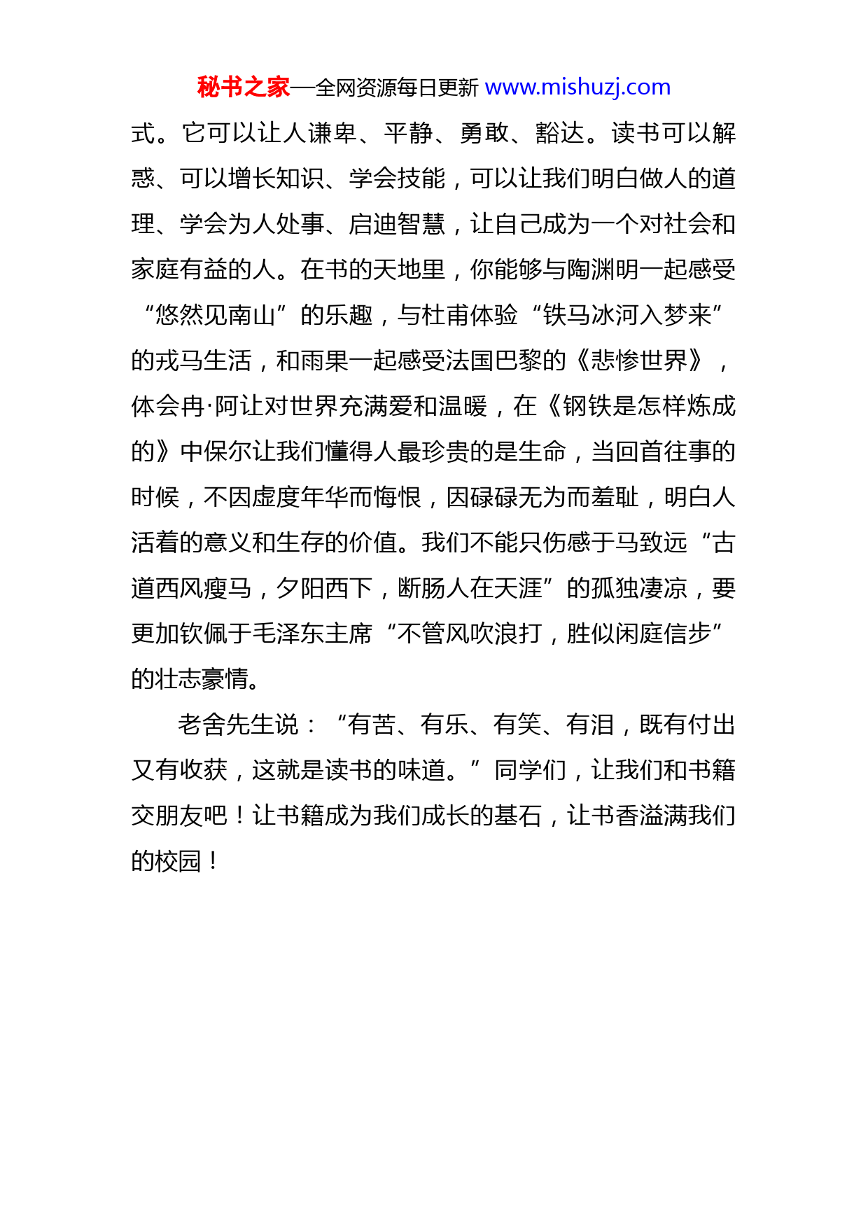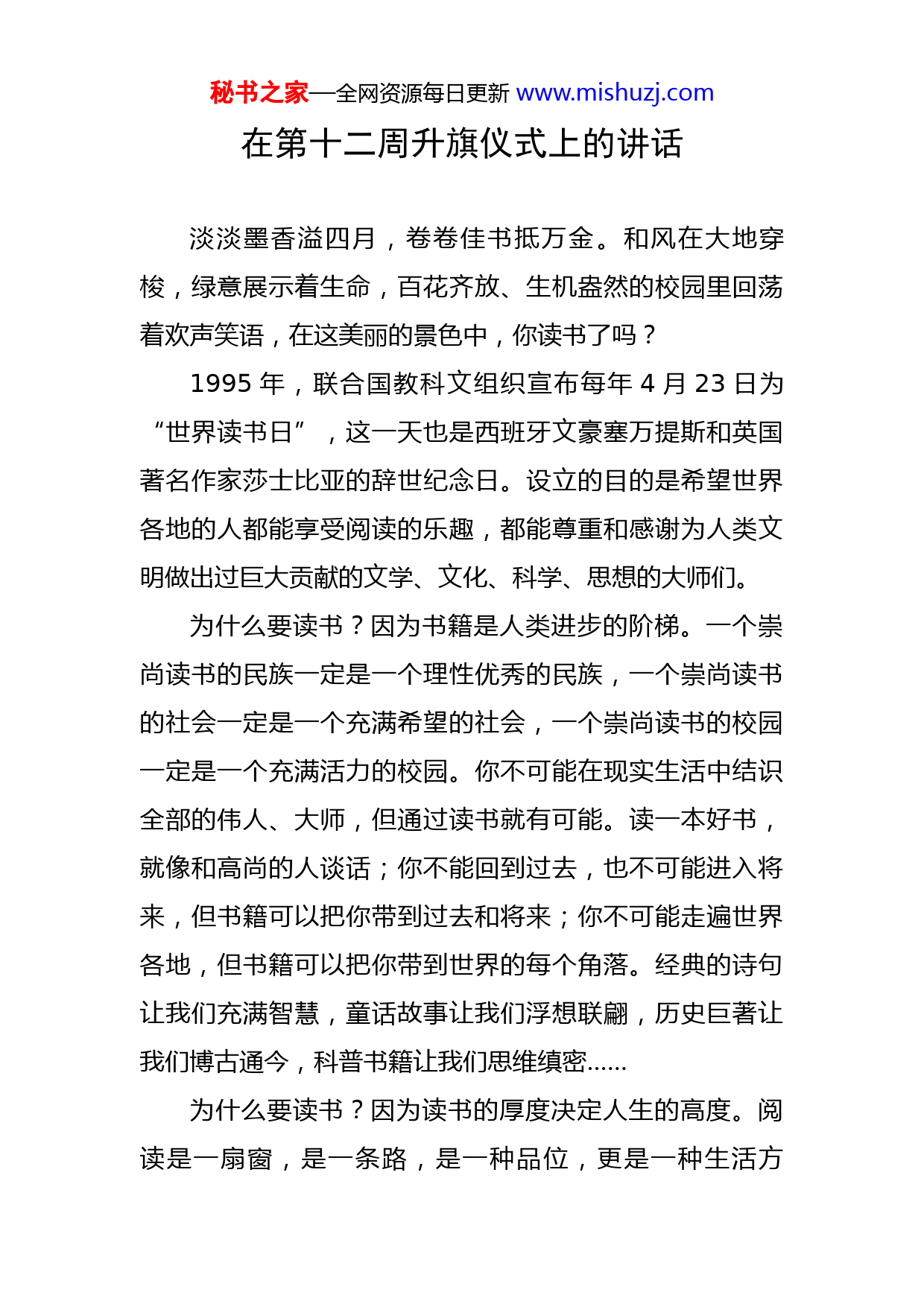 秘书之家—全网资源每日更新www.mishuzj.com在第十二周升旗仪式上的讲话淡淡墨香溢四月,卷卷佳书抵万金。和风在大地穿梭,绿意展示着生命,百花齐放、生机盎然的校园里回荡着欢声笑语,在这美丽的景色中,你读书了吗?1995年,联合国教科文组织宣布每年4月23日为“世界读书日”,这一天也是西班牙文豪塞万提斯和英国著名作家莎士比亚的辞世纪念日。设立的目的是希望世界各地的人都能享受阅读的乐趣,都能尊重和感谢为人类文明做出过巨大贡献的文学、文化、科学、思想的大师们。为什么要读书?因为书籍是人类进步的阶梯。一个崇尚读书的民族一定是一个理性优秀的民族,一个崇尚读书的社会一定是一个充满希望的社会,一个崇尚读书的校园一定是一个充满活力的校园。你不可能在现实生活中结识全部的伟人、大师,但通过读书就有可能。读一本好书,就像和高尚的人谈话;你不能回到过去,也不可能进入将来,但书籍可以把你带到过去和将来;你不可能走遍世界各地,但书籍可以把你带到世界的每个角落。经典的诗句让我们充满智慧,童话故事让我们浮想联翩,历史巨著让我们博古通今,科普书籍让我们思维缜密……为什么要读书?因为读书的厚度决定人生的高度。阅读是一扇窗,是一条路,是一种品位,更是一种生活方秘书之家—全网资源每日更新www.mishuzj.com式。它可以让人谦卑、平静、勇敢、豁达。读书可以解惑、可以增长知识、学会技能,可以让我们明白做人的道理、学会为人处事、启迪智慧,让自己成为一个对社会和家庭有益的人。在书的天地里,你能够与陶渊明一起感受“悠然见南山”的乐趣,与杜甫体验“铁马冰河入梦来”的戎马生活,和雨果一起感受法国巴黎的《悲惨世界》,体会冉·阿让对世界充满爱和温暖,在《钢铁是怎样炼成的》中保尔让我们懂得人最珍贵的是生命,当回首往事的时候,不因虚度年华而悔恨,因碌碌无为而羞耻,明白人活着的意义和生存的价值。我们不能只伤感于马致远“古道西风瘦马,夕阳西下,断肠人在天涯”的孤独凄凉,要更加钦佩于毛泽东主席“不管风吹浪打,胜似闲庭信步”的壮志豪情。老舍先生说:“有苦、有乐、有笑、有泪,既有付出又有收获,这就是读书的味道。”同学们,让我们和书籍交朋友吧!让书籍成为我们成长的基石,让书香溢满我们的校园!