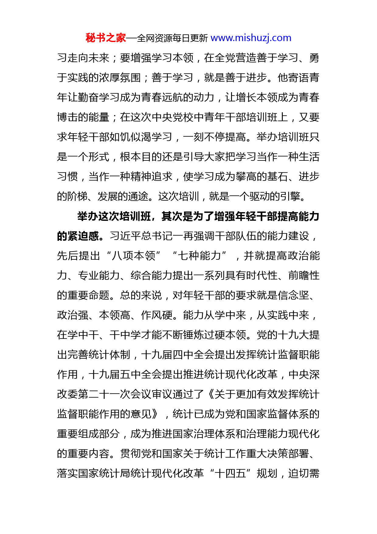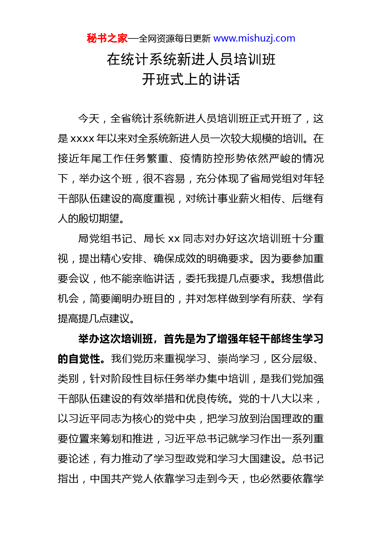 秘书之家—全网资源每日更新www.mishuzj.com在统计系统新进人员培训班开班式上的讲话今天,全省统计系统新进人员培训班正式开班了,这是xxxx年以来对全系统新进人员一次较大规模的培训。在接近年尾工作任务繁重、疫情防控形势依然严峻的情况下,举办这个班,很不容易,充分体现了省局党组对年轻干部队伍建设的高度重视,对统计事业薪火相传、后继有人的殷切期望。局党组书记、局长xx同志对办好这次培训班十分重视,提出精心安排、确保成效的明确要求。因为要参加重要会议,他不能亲临讲话,委托我提几点要求。我想借此机会,简要阐明办班目的,并对怎样做到学有所获、学有提高提几点建议。举办这次培训班,首先是为了增强年轻干部终生学习的自觉性。我们党历来重视学习、崇尚学习,区分层级、类别,针对阶段性目标任务举办集中培训,是我们党加强干部队伍建设的有效举措和优良传统。党的十八大以来,以习近平同志为核心的党中央,把学习放到治国理政的重要位置来筹划和推进,习近平总书记就学习作出一系列重要论述,有力推动了学习型政党和学习大国建设。总书记指出,中国共产党人依靠学习走到今天,也必然要依靠学秘书之家—全网资源每日更新www.mishuzj.com习走向未来;要增强学习本领,在全党营造善于学习、勇于实践的浓厚氛围;善于学习,就是善于进步。他寄语青年让勤奋学习成为青春远航的动力,让增长本领成为青春博击的能量;在这次中央党校中青年干部培训班上,又要求年轻干部如饥似渴学习,一刻不停提高。举办培训班只是一个形式,根本目的还是引导大家把学习当作一种生活习惯,当作一种精神追求,使学习成为攀高的基石、进步的阶梯、发展的通途。这次培训,就是一个驱动的引擎。举办这次培训班,其次是为了增强年轻干部提高能力的紧迫感。习近平总书记一再强调干部队伍的能力建设,先后提出“八项本领”“七种能力”,并就提高政治能力、专业能力、综合能力提出一系列具有时代性、前瞻性的重要命题。总的来说,对年轻干部的要求就是信念坚、政治强、本领高、作风硬。能力从学中来,从实践中来,在学中干、干中学才能不断锤炼过硬本领。党的十九大提出完善统计体制,十九届四中全会提出发挥统计监督职能作用,十九届五中全会提出推进统计现代化改革,中央深改委第二十一次会议审议通过了《关于更加有效发挥统计监督职能作用的意见》,统计已成为党和国家监督体系的重要组成部分,成为推进国家治理体系和治理能力现代化的重要内容。贯彻党和国家关于统计工作重大决策部署、落实国家统计局统计现代化改革“十四五”规划,迫切需秘书之家—全网资源每日更新www.mishuzj.com要我们提高本领、充电蓄能。未来的统计是我们的,更是你们的;未来的统计一定是与“国之大者”更加息息相通的统计,一定是与时代潮流更加紧密契合的统计,一定是与现代信息技术更加水乳交融的统计。没有足够的能力作支撑,当你们从年轻人变成中年人,变成孔子所说的“年四十而见恶焉”,“四十、五十而无闻焉”,就只能在发展的大潮面前望洋兴叹,甚至被淘汰出局。君子可不惧乎?这次培训,就是一个加油的驿站。举办这次培训班,最后是为了增加年轻干部创先争优的上进心。为了办好这个班,省局教育中心认真筹划,精心准备师资,请来给大家授课的,有的是全省这一领域的专家,有的是本专业的佼佼者,他们都有着较高的理论素养、专业功底和实践经验。我希望大家在学到理论和知识的同时,可以从他们的身上,或把握干部成长的规律和轨迹,或领悟业务水平提高的方法和路径,或感受敬业精业勤业的精神,从而自觉对标找差、比学赶超,调动起履职尽责、创先争优的积极性。我相信,他们的成功经验一定可学可做,他们的劳动精神一定可追可及。在座的各位都要立志向他们学,增强底蕴、干出特色,有朝一日自己也成为本专业的行家里手,也能上台讲课。这次培训,就是一个激励的平台。怎样使培训达到预期效果?除了组织者和授课老师付秘书之家—全网资源每日更新www.mishuzj.com出努力外,我们学员作为学习的主体发挥主观能动性最为重要。为此,我提出四点想法与大家共勉。一是潜心学。我相信大家都是主动要求来学习的,不少同志还克服了工作和家庭上的困难,这种端正、积极的学习态度是搞好学习的良好开端。希望大家既来之,则安之,聚精会神学习。如果只是换个地方来打牌,换一个场所来玩手机,这样的所谓学习必然徒而无功。潜心学,理论必有得。二是静心思。孔子说:“学而不思则罔,思而不学则殆。”学习和思考是鸟之双翼、车之双轮,不可偏废。要静下心来“踱方步”、想问题,把每一个知识点学深悟透,结合自己平时所学所做有所领会、有所总结、有所提高,提炼出规律性的东西。静心思,心智必有得。三是虚心问。大约x年才办一次新进人员培训班,学习机会难得,大家要非常珍惜。遇有不懂的问题不绕道、不轻放,虚心向老师求教,努力弄懂。利用这个机会,还可以和老师们建立起经常性联系,平时在工作中有难题的继续请教,有心得不妨分享。虚心问,术业必有得。四是会心研。全系统的新进人员会聚一堂、朝夕相处,是增进了解、增进感情、增进共识的好机会。希望大家加强交流、碰撞火花,互相启发、共同提高