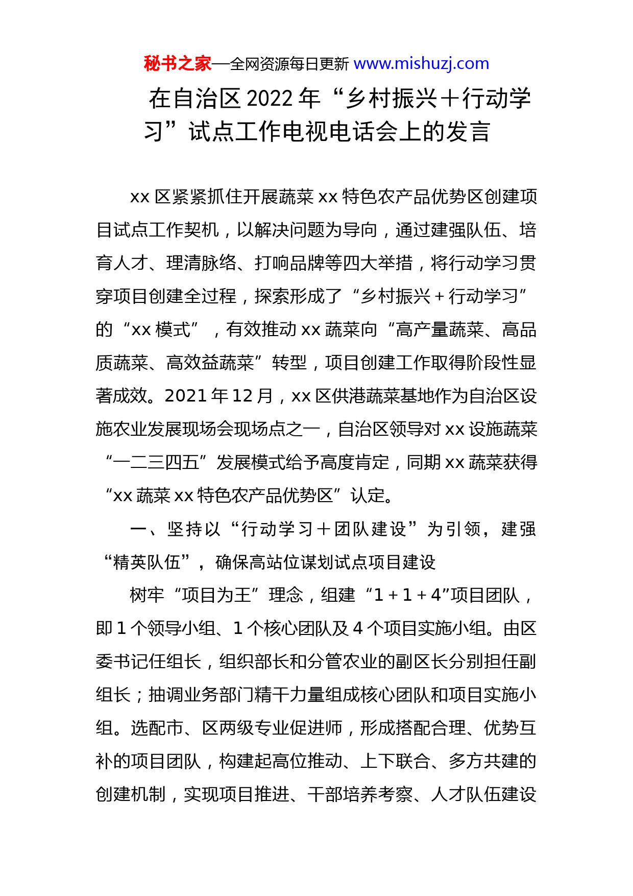 秘书之家—全网资源每日更新www.mishuzj.com在自治区2022年“乡村振兴+行动学习”试点工作电视电话会上的发言xx区紧紧抓住开展蔬菜xx特色农产品优势区创建项目试点工作契机,以解决问题为导向,通过建强队伍、培育人才、理清脉络、打响品牌等四大举措,将行动学习贯穿项目创建全过程,探索形成了“乡村振兴+行动学习”的“xx模式”,有效推动xx蔬菜向“高产量蔬菜、高品质蔬菜、高效益蔬菜”转型,项目创建工作取得阶段性显著成效。2021年12月,xx区供港蔬菜基地作为自治区设施农业发展现场会现场点之一,自治区领导对xx设施蔬菜“一二三四五”发展模式给予高度肯定,同期xx蔬菜获得“xx蔬菜xx特色农产品优势区”认定。一、坚持以“行动学习+团队建设”为引领,建强“精英队伍”,确保高站位谋划试点项目建设树牢“项目为王”理念,组建“1+1+4”项目团队,即1个领导小组、1个核心团队及4个项目实施小组。由区委书记任组长,组织部长和分管农业的副区长分别担任副组长;抽调业务部门精干力量组成核心团队和项目实施小组。选配市、区两级专业促进师,形成搭配合理、优势互补的项目团队,构建起高位推动、上下联合、多方共建的创建机制,实现项目推进、干部培养考察、人才队伍建设秘书之家—全网资源每日更新www.mishuzj.com同促并进。自项目启动以来,成员中共有x人获县(区)级以上“两优一先”表彰,xx人年度考核评定优秀等次,x人获提拔、重用或晋升职级,进一步激发了干部干事创业热情。二、坚持以“行动学习+多元培训”为载体,培育“双专人才”,确保高效率推进试点项目建设高度重视“行动学习”培训,将其列入全区干部教育要点,积极探索“专业培训+行动学习+交流观摩”教育模式,不断增强干部学融于事、知行合一的实践能力。截至目前,开展“乡村振兴+行动学习”重点培训班次x期,培训xxx余人次,引导干部灵活运用“问题、团队、学习、行动”的核心理念,边学边干、边干边学,全区行动学习促乡村振兴蔚然成风。充分发挥xx名项目认证初级促进师作用,将行动学习方法推广应用于各类农业经营主体、镇村等生产一线,有效增强各类农业主体解决实际问题的能力,培养一支既懂农业、爱农村、爱农民,又熟悉行动学习科学工作方法的“双专人才”。三、坚持以“调查研究+深度汇谈”为抓手,理清“发展脉络”,确保高质量落实试点项目建设注重一线调研工作法,实时组织项目团队深入一线实地调研30余次,并灵活运用SWOT分析法对调研情况进行梳理,为大力发展蔬菜产业链精准把脉、问诊开方。结秘书之家—全网资源每日更新www.mishuzj.com合调研发现项目在建设过程中遇到的难点、堵点问题,适时开展集体研讨,及时复盘总结。项目创建以来,项目团队运用行动学习方法开展专题研讨xx次,复盘x次。x个实施小组就绿色生产、品牌建设、主体培育和新业态推广等内容,按照回顾目标、亮点与不足、原因分析、经验与规律四个模块,对项目实施以来存在的不足进行深刻的反思,形成x个子项目任务完成工期倒排表,把“工期表”变为干部“履职表”,确保各项建设任务有力有序推进。四、坚持以“群策群力+克难攻坚”为输出,扫除“疑难杂症”,确保高标准推进试点项目建设项目团队运用行动学习工具方法深挖制约xx区蔬菜发展的x个方面xx个具体问题,把关键问题由品牌不强、规模不大进一步明确到主导产品不突出问题上,并通过调研最终确定香芋、淮山和菜心三个主导产业,聚焦产加销三个环节,实现三大促进。一是聚焦生产环节,促进蔬菜产业转型升级。围绕扩大蔬菜生产规模问题,项目团队借助头脑风暴法、SWOT分析法及鱼骨图等方法发挥群智,提出发展香芋全产业链和设施蔬菜“百千万”工程的思路,推动三年行动方案的出台及配套相关扶持政策,并以成立xx区蔬菜高质量发展工作专班的方法路径,推动建成铺门镇万亩供港蔬菜基地、莲塘镇万亩香芋种植基地、贺街镇万亩淮山种植基秘书之家—全网资源每日更新www.mishuzj.com地。2021年,xx区蔬菜播种面积达xx.x万亩,产量xx万吨,产值xx.x亿元。二是聚焦加工环节,促进仓储冷链物流体系建设。围绕蔬菜精深加工能力弱的问题,运用团体列名法、“六顶思考帽”等方法,充分吸纳企业主体各方建议,提出打造莲塘镇香芋加工集聚区和冷库项目建设的思路,推动实现香芋年加工能力从原来的x家x.x万吨扩大到当前的x家xx万吨,增幅达xxx%;进一步推动冷藏保鲜设施从原来的xxx座、年冷藏量x万吨扩大到当前的xxx座x万吨,延伸了农产品加工产业链,加快香芋全产业链发展步伐。三是聚焦销售环节,促进蔬菜产业高质量发展。充分发挥行动学习“流程+研讨方法+促进技术”优势,精心设计研讨环节,分别就“二次以上利益分配机制”“品牌影响力不强”等问题深入研讨,查摆具体问题xx余个,提出对策建议xx条,加快完善“联农带农”机制,探索创建农业现代示范区、优势特色产业集群、全产业链联合体、农业产业强镇、村集体经济、土地入股等“六大模式”,带动全区x.x万户农户,占从事蔬菜产业农户的xx%,推动项目实施区域全年人均可支配收入达xxxxx元,比xx区平均水平高xx.xx%。通过加强与第三方合作、帮扶企业创建自主品牌,全方位宣传推介xx蔬菜,打造“贺街淮山”“xx香芋”农产品地理标志,推进xx生态蔬菜区