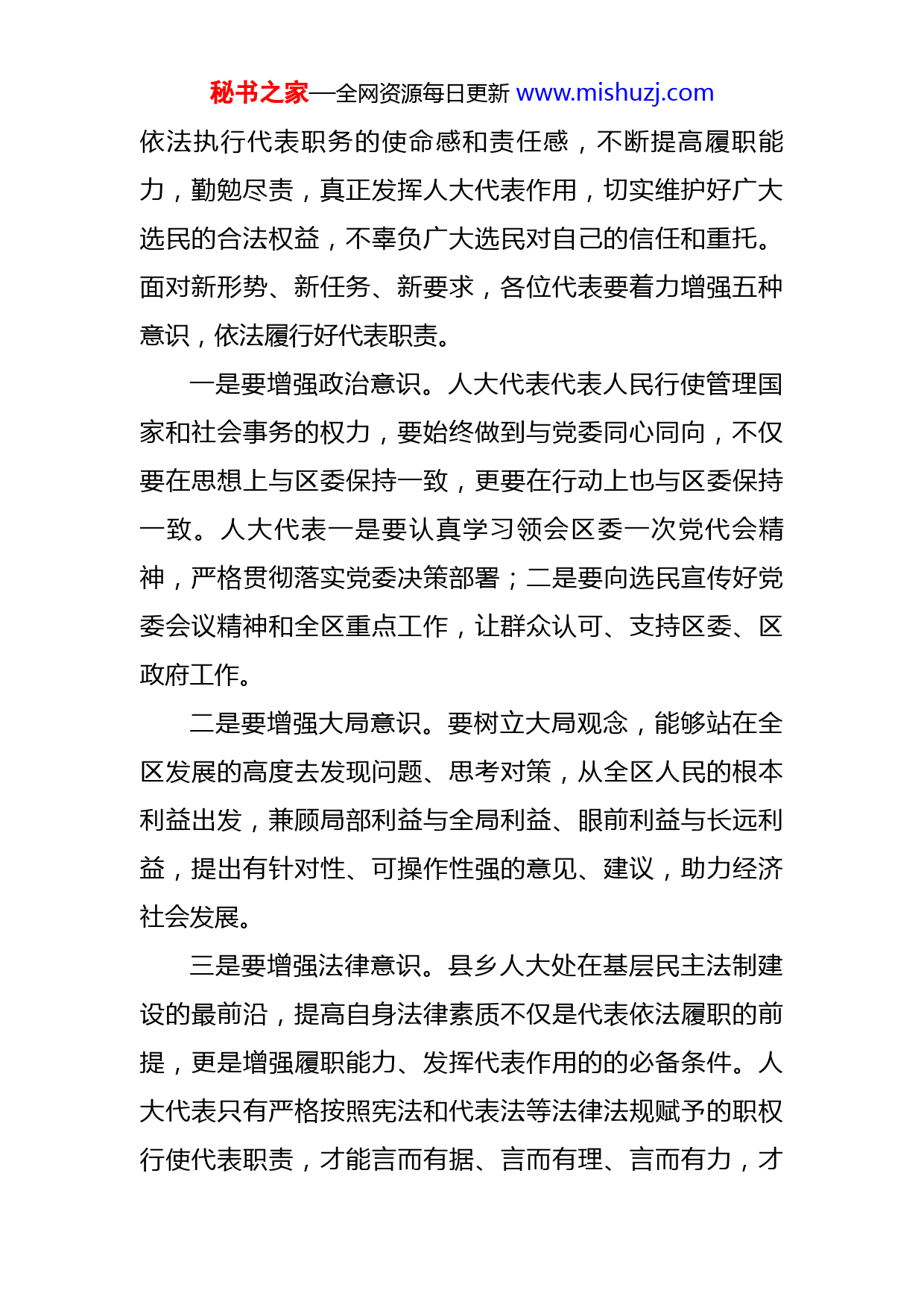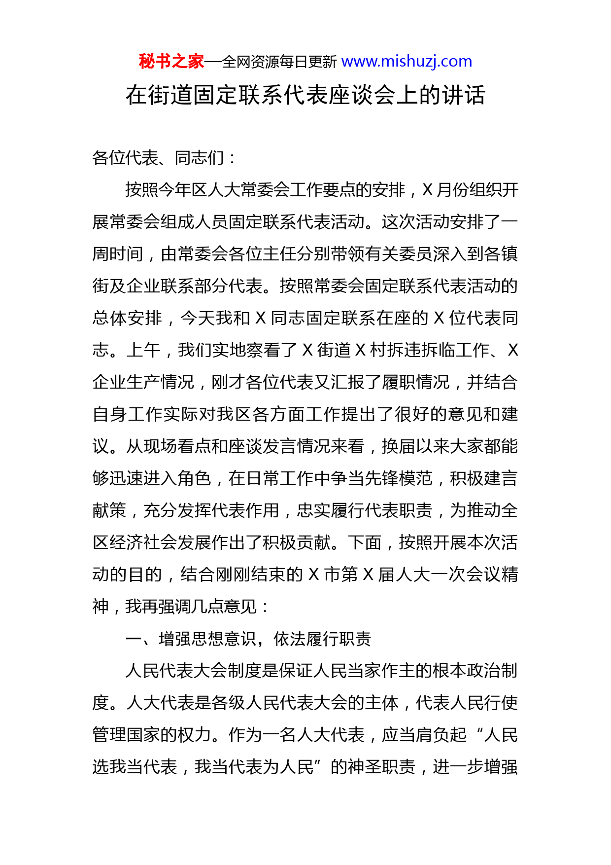 秘书之家—全网资源每日更新www.mishuzj.com在街道固定联系代表座谈会上的讲话各位代表、同志们:按照今年区人大常委会工作要点的安排,X月份组织开展常委会组成人员固定联系代表活动。这次活动安排了一周时间,由常委会各位主任分别带领有关委员深入到各镇街及企业联系部分代表。按照常委会固定联系代表活动的总体安排,今天我和X同志固定联系在座的X位代表同志。上午,我们实地察看了X街道X村拆违拆临工作、X企业生产情况,刚才各位代表又汇报了履职情况,并结合自身工作实际对我区各方面工作提出了很好的意见和建议。从现场看点和座谈发言情况来看,换届以来大家都能够迅速进入角色,在日常工作中争当先锋模范,积极建言献策,充分发挥代表作用,忠实履行代表职责,为推动全区经济社会发展作出了积极贡献。下面,按照开展本次活动的目的,结合刚刚结束的X市第X届人大一次会议精神,我再强调几点意见:一、增强思想意识,依法履行职责人民代表大会制度是保证人民当家作主的根本政治制度。人大代表是各级人民代表大会的主体,代表人民行使管理国家的权力。作为一名人大代表,应当肩负起“人民选我当代表,我当代表为人民”的神圣职责,进一步增强秘书之家—全网资源每日更新www.mishuzj.com依法执行代表职务的使命感和责任感,不断提高履职能力,勤勉尽责,真正发挥人大代表作用,切实维护好广大选民的合法权益,不辜负广大选民对自己的信任和重托。面对新形势、新任务、新要求,各位代表要着力增强五种意识,依法履行好代表职责。一是要增强政治意识。人大代表代表人民行使管理国家和社会事务的权力,要始终做到与党委同心同向,不仅要在思想上与区委保持一致,更要在行动上也与区委保持一致。人大代表一是要认真学习领会区委一次党代会精神,严格贯彻落实党委决策部署;二是要向选民宣传好党委会议精神和全区重点工作,让群众认可、支持区委、区政府工作。二是要增强大局意识。要树立大局观念,能够站在全区发展的高度去发现问题、思考对策,从全区人民的根本利益出发,兼顾局部利益与全局利益、眼前利益与长远利益,提出有针对性、可操作性强的意见、建议,助力经济社会发展。三是要增强法律意识。县乡人大处在基层民主法制建设的最前沿,提高自身法律素质不仅是代表依法履职的前提,更是增强履职能力、发挥代表作用的的必备条件。人大代表只有严格按照宪法和代表法等法律法规赋予的职权行使代表职责,才能言而有据、言而有理、言而有力,才秘书之家—全网资源每日更新www.mishuzj.com能更好地代表人民行使管理国家事务的权利。四是要增强履职意识。要通过不断的学习,明晰人大代表的职责,熟练掌握和运用各种监督方式和手段,不仅在人代会期间履职尽责,更要在闭会期间及时察民情、言民声、达民意、行民权,积极参与常委会组织的各类视察、调研、执法检查等活动,切实把握人大工作及代表工作的特点和规律,加强对“一府两院”工作的监督,时刻不忘自己的法定责任,不负选民重托。五是要增强群众意识。要牢固树立民本思想,把代表和维护人民群众根本利益作为履行职责的出发点和落脚点,加强与选民的联系,多下基层、深入选民了解情况,真正将选民的所思所想、所忧所虑掌握起来,传达上去,为区委决策的制定提供参谋意见,努力维护和发展人民群众的根本利益。二、做好“双联”工作,发挥纽带作用常委会组成人员联系代表、代表联系选民的“双联”工作是我区人大长期坚持的一项好的制度,它密切了常委会与代表、代表与选民的联系沟通,顺畅了人民呼声表达的渠道。开展“双联”活动不是简单地走走看看,关键是要听取民声、汇集民意,解决群众反映突出的问题,而作为中间环节的人大代表,就需要处理好两个关系,发挥桥梁纽带的重要作用。秘书之家—全网资源每日更新www.mishuzj.com一是要处理好与选民的关系。各位代表是由选民依法选举出来的,联系群众最广泛、最直接,最有发言权,要拿出充足的时间,进村入户与选民座谈交流,认真做好接待选民工作,倾心听取选民群众反映的意见和要求,向选民汇报工作。同时要对选民负责、受选民监督,定期向选民和选举单位进行述职,对于群众提出的批评意见要深刻反思、及时改正。时刻牢记为民代言、为民发声的光荣使命和重要责任,要多为选民解难题,多为群众办实事,真正成为选民的知心人。二是要处理好与人大常委会的关系。区人大常委会是区人代会闭会期间代替区人大行使决定权和监督权的国家权利机关,同时也是接待人大代表、接受代表意见、组织代表活动的区人大常设机关。为了更加密切与代表的联系,常委会制定了固定联系代表意见,明确了常委会组成人员所固定联系的代表;设立了代表接待室,明确了常委会各位主任接待代表的时间。各位代表应利用上述途径将选民和自己的意见建议提报给常委会,由常委会在合适的时机呈送区委领导,为区委决策的制定提供参考。三、争当先进典型,发挥“三带(代)”作用今年X市人代会政府工作报告在回顾全市过去五年工作和安排下步工作中多次提到了X,X市长也在X代表团审议政府工作报告时指出,希望X继续当好省会发展排头秘书之家—全网资源每日更新www.mishuzj.com兵。当前我区发展机遇与挑战