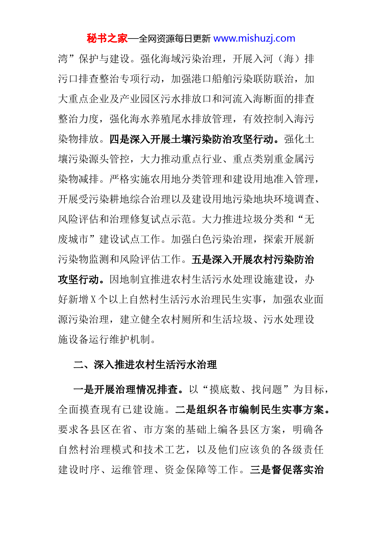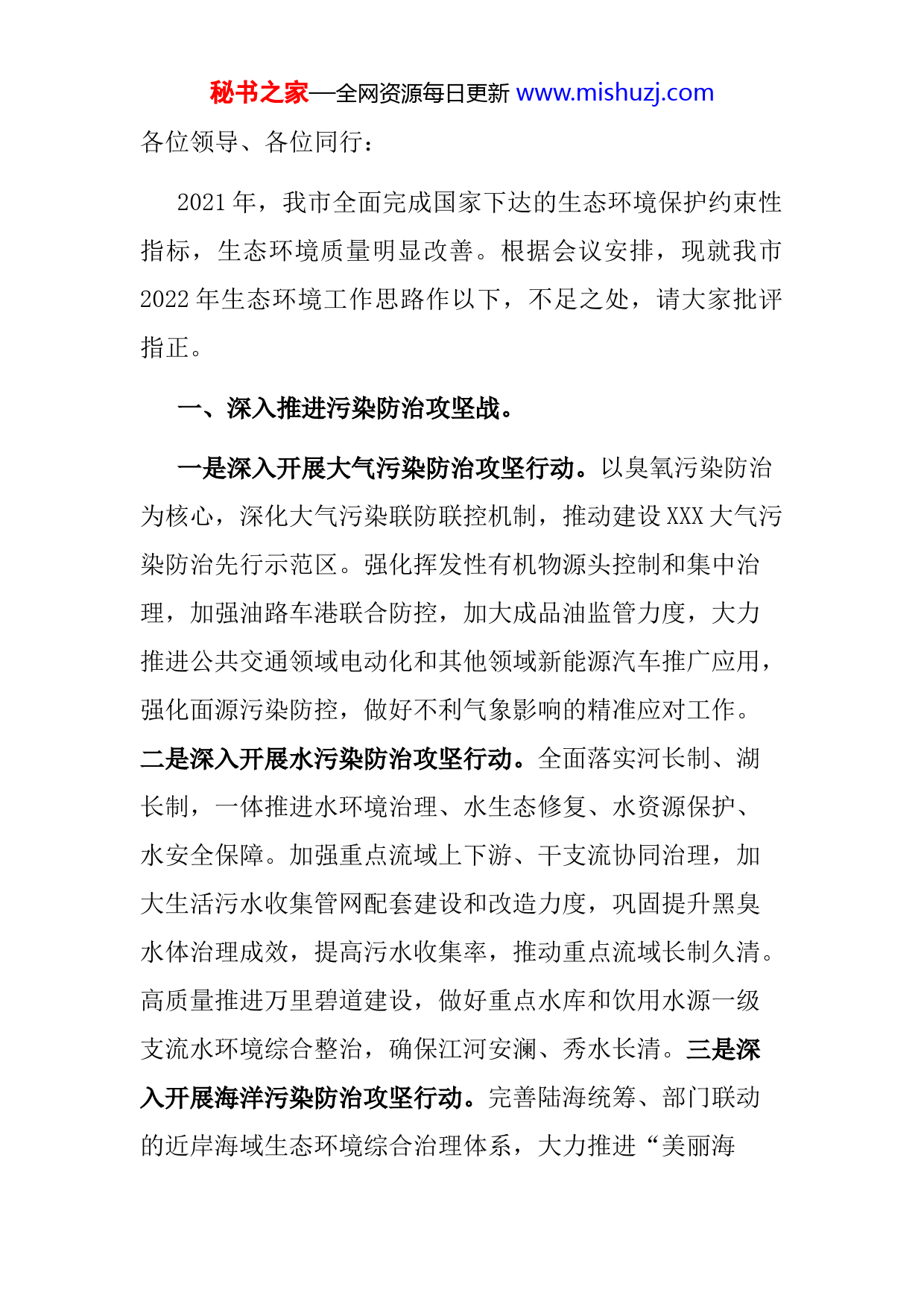 秘书之家—全网资源每日更新www.mishuzj.com各位领导、各位同行:2021年,我市全面完成国家下达的生态环境保护约束性指标,生态环境质量明显改善。根据会议安排,现就我市2022年生态环境工作思路作以下,不足之处,请大家批评指正。一、深入推进污染防治攻坚战。一是深入开展大气污染防治攻坚行动。以臭氧污染防治为核心,深化大气污染联防联控机制,推动建设XXX大气污染防治先行示范区。强化挥发性有机物源头控制和集中治理,加强油路车港联合防控,加大成品油监管力度,大力推进公共交通领域电动化和其他领域新能源汽车推广应用,强化面源污染防控,做好不利气象影响的精准应对工作。二是深入开展水污染防治攻坚行动。全面落实河长制、湖长制,一体推进水环境治理、水生态修复、水资源保护、水安全保障。加强重点流域上下游、干支流协同治理,加大生活污水收集管网配套建设和改造力度,巩固提升黑臭水体治理成效,提高污水收集率,推动重点流域长制久清。高质量推进万里碧道建设,做好重点水库和饮用水源一级支流水环境综合整治,确保江河安澜、秀水长清。三是深入开展海洋污染防治攻坚行动。完善陆海统筹、部门联动的近岸海域生态环境综合治理体系,大力推进“美丽海秘书之家—全网资源每日更新www.mishuzj.com湾”保护与建设。强化海域污染治理,开展入河(海)排污口排查整治专项行动,加强港口船舶污染联防联治,加大重点企业及产业园区污水排放口和河流入海断面的排查整治力度,强化海水养殖尾水排放管理,有效控制入海污染物排放。四是深入开展土壤污染防治攻坚行动。强化土壤污染源头管控,大力推动重点行业、重点类别重金属污染物减排。严格实施农用地分类管理和建设用地准入管理,开展受污染耕地综合治理以及建设用地污染地块环境调查、风险评估和治理修复试点示范。大力推进垃圾分类和“无废城市”建设试点工作。加强白色污染治理,探索开展新污染物监测和风险评估工作。五是深入开展农村污染防治攻坚行动。因地制宜推进农村生活污水处理设施建设,办好新增X个以上自然村生活污水治理民生实事,加强农业面源污染治理,建立健全农村厕所和生活垃圾、污水处理设施设备运行维护机制。二、深入推进农村生活污水治理一是开展治理情况排查。以“摸底数、找问题”为目标,全面摸查现有已建设施。二是组织各市编制民生实事方案。要求各县区在省、市方案的基础上编各县区方案,明确各自然村治理模式和技术工艺,以及他们应该负的各级责任建设时序、运维管理、资金保障等工作。三是督促落实治秘书之家—全网资源每日更新www.mishuzj.com理工程建设。我们已经有一个评估标准、技术标准,督促各县区参照相关技术标准开展治理,完成相关工作。四是加强对各市指导运维管理措施。要求各县区明确纳入民生实事的村庄污水治理设施的产权归属、运维管理责任单位等,接下来是进一步落实资金安排及监测要求,建立设施运行的台账。五是开展治理成效评估。现在我市各有关部门已经启动对各县区报送已完成治理的自然村的评估工作确保打造X个以上模式适用、成效突出、可推广的样板,并组织专家团队对优秀治理案例进行筛选推广,及时向社会公开。三、深入推进水污染防治。一是健全水环境空间管理体系。目前我们正在开展水功能区和水环境功能区整合优化,确定水体环境功能和水环境质量目标,构建全市统一的水功能区划体系。统筹国控断面、流域边界、行政边界的框架,构建“流域-控制单元-汇水单位-行政区域”这么一个覆盖全市的流域空间管控体系。做到有序的空间管理工作。二是持续推进水环境质量改善。第一季度全市水环境质量也是持续改善、稳中有进的,我们计划继续加强饮用水源和优良水体保护。特别是XX水库重要水库的水质保护,继续优化调整供排水格局,“十三五”全市饮用水源保护区已基本完成调整,秘书之家—全网资源每日更新www.mishuzj.com“十四五”就要依法加强对饮用水源保护区的监管力度,推进实施XXX湾等水资源配置工程,保障全市供水安全。推进重点流域的整治,比如X河流域、X江流域,进一步加强污水处理设施和管网建设,补足处理能力、管网的各个短板,加强农业农村畜禽养殖的整治。同时按照省政府的部署,加强X年X个劣Ⅴ类断面的劣Ⅴ类一级支流整治,力争今年把劣Ⅴ类一级支流基本消除。通过统筹干支流、上下游、左右岸的整治,加强入海排污口规范化整治,持续推进全市水环境质量的改善。三是探索推进水资源保护和水生态的修复利用,结合万里碧道建设,推进水生态系统的保护和修复,探索如何加强利用水资源节约利用和生态流量的保障,为重点流域治水、保护好水提供水生态环境重要支撑作用,同时开展重点流域水生态环境的调查评估,加强河湖开发整治过程中水生态环境、水环境质量保护工作的推进。四、深入推进近岸海海域污染防治。一是深入开展污染防治攻坚。深入推进入海河流污染治理,过去入海河流主要是对氨氮进行削减,现在则要推动入海河流总氮削减,才能有效改善河口海域水环境质量。二是加强入海排污口监管。近年来我市组织开展了入海排污口的全面排查工作,下来还要加强入海排污口的监测,秘书之家—全网资源每日更新www.mishuzj.