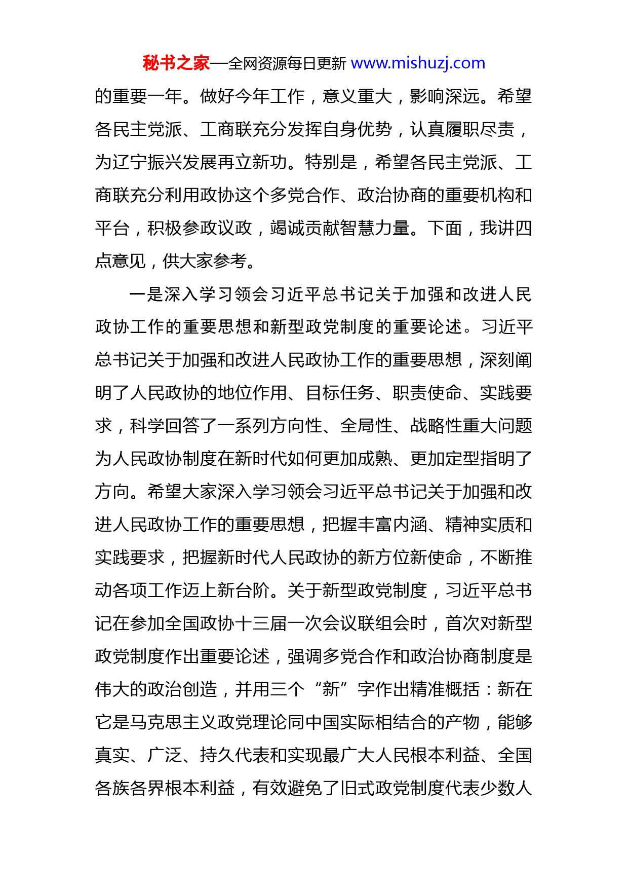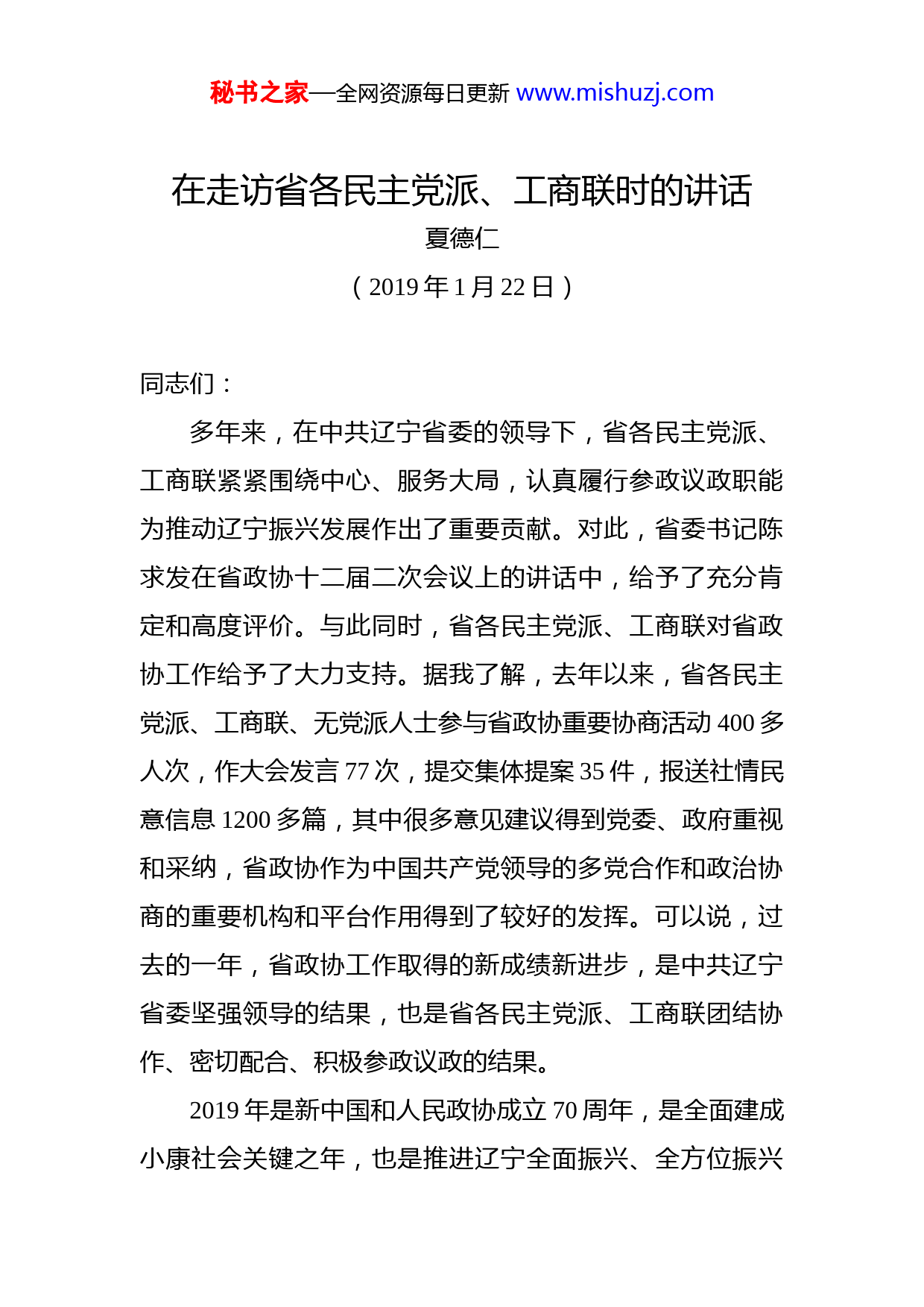 秘书之家—全网资源每日更新www.mishuzj.com在走访省各民主党派、工商联时的讲话夏德仁(2019年1月22日)同志们:多年来,在中共辽宁省委的领导下,省各民主党派、工商联紧紧围绕中心、服务大局,认真履行参政议政职能为推动辽宁振兴发展作出了重要贡献。对此,省委书记陈求发在省政协十二届二次会议上的讲话中,给予了充分肯定和高度评价。与此同时,省各民主党派、工商联对省政协工作给予了大力支持。据我了解,去年以来,省各民主党派、工商联、无党派人士参与省政协重要协商活动400多人次,作大会发言77次,提交集体提案35件,报送社情民意信息1200多篇,其中很多意见建议得到党委、政府重视和采纳,省政协作为中国共产党领导的多党合作和政治协商的重要机构和平台作用得到了较好的发挥。可以说,过去的一年,省政协工作取得的新成绩新进步,是中共辽宁省委坚强领导的结果,也是省各民主党派、工商联团结协作、密切配合、积极参政议政的结果。2019年是新中国和人民政协成立70周年,是全面建成小康社会关键之年,也是推进辽宁全面振兴、全方位振兴秘书之家—全网资源每日更新www.mishuzj.com的重要一年。做好今年工作,意义重大,影响深远。希望各民主党派、工商联充分发挥自身优势,认真履职尽责,为辽宁振兴发展再立新功。特别是,希望各民主党派、工商联充分利用政协这个多党合作、政治协商的重要机构和平台,积极参政议政,竭诚贡献智慧力量。下面,我讲四点意见,供大家参考。一是深入学习领会习近平总书记关于加强和改进人民政协工作的重要思想和新型政党制度的重要论述。习近平总书记关于加强和改进人民政协工作的重要思想,深刻阐明了人民政协的地位作用、目标任务、职责使命、实践要求,科学回答了一系列方向性、全局性、战略性重大问题为人民政协制度在新时代如何更加成熟、更加定型指明了方向。希望大家深入学习领会习近平总书记关于加强和改进人民政协工作的重要思想,把握丰富内涵、精神实质和实践要求,把握新时代人民政协的新方位新使命,不断推动各项工作迈上新台阶。关于新型政党制度,习近平总书记在参加全国政协十三届一次会议联组会时,首次对新型政党制度作出重要论述,强调多党合作和政治协商制度是伟大的政治创造,并用三个“新”字作出精准概括:新在它是马克思主义政党理论同中国实际相结合的产物,能够真实、广泛、持久代表和实现最广大人民根本利益、全国各族各界根本利益,有效避免了旧式政党制度代表少数人秘书之家—全网资源每日更新www.mishuzj.com少数利益集团的弊端;新在它把各个政党和无党派人士紧密团结起来、为着共同目标而奋斗,有效避免了一党缺乏监督或者多党轮流坐庄、恶性竞争的弊端;新在它通过制度化、程序化、规范化的安排集中各种意见和建议、推动决策科学化民主化,有效避免了旧式政党制度囿于党派利益、阶级利益、区域和集团利益决策施政导致社会撕裂的弊端。这一重要思想,立足国情,将中国政党制度置于世界政党政治发展的广阔背景,用三个“新”和三个“有效避免”,精辟阐述了新型政党制度的鲜明特色和独特优势深刻揭示了我国政党制度与西方多党制、两党制的本质区别,彰显了宽广的世界眼光、恢弘的中国气派,为新时代多党合作制度建设开辟了新的理论境界,为多党合作事业发展奠定了新的理论根基,具有重要的指导意义。希望大家深入学习领会习近平总书记参加全国政协十三届一次会议联组会时的重要讲话精神,进一步增强“四个意识”,坚定“四个自信”,不断巩固团结奋斗的共同思想政治基础。要从实践层面提升多党合作制度效能,加强中国特色社会主义参政党建设,为把我国新型政党制度坚持好、完善好、发展好贡献智慧和力量,为推动人民政协这一具有中国特色的制度安排更加成熟更加定型担负起参与者、实践者、推动者的政治责任。二是紧紧围绕中心、服务大局发挥参政议政作用。参秘书之家—全网资源每日更新www.mishuzj.com政议政是中国特色社会主义参政党最重要的基本职能,贯穿了民主党派履行职责的始终。今年1月5日,省委常委会会议审议通过了省政协2019年重点协商和重点监督性视察计划,陈求发书记亲自点了2个议题,唐一军省长也点了3个议题。这既是省委、省政府对政协工作的重视肯定,也是对省政协的信任支持。省政协相关部门已对重点协商和重点监督性视察计划进行了任务分解,并根据各民主党派工商联的特点和优势做了相应安排,希望各民主党派、工商联紧紧围绕全省中心工作,继续发挥在政协履行职能中的重要作用,高度关注并积极参加各项调研活动,始终坚持讲真话、讲新话、讲实话,高水平高质量完成调研任务不辜负省委、省政府的信任和期望,为辽宁振兴发展贡献自己的智慧和才干。希望各民主党派结合自身特点和各自优势,在如何更有效地发挥民主监督作用、拓展参政议政形式、提升建言献策能力和水平等方面作积极探索;就住房、就业、社保等群众最关心的切身利益问题和教育、医疗、环保等群众反映强烈的热点难点问题,深入调查研究力争有所突破。希望省工商联继续发挥好桥梁平台作用,坚持问题导向,找准我省非公有制经济发展不充分、发展潜力没有得到充分释放的深层次原因,引导和协调